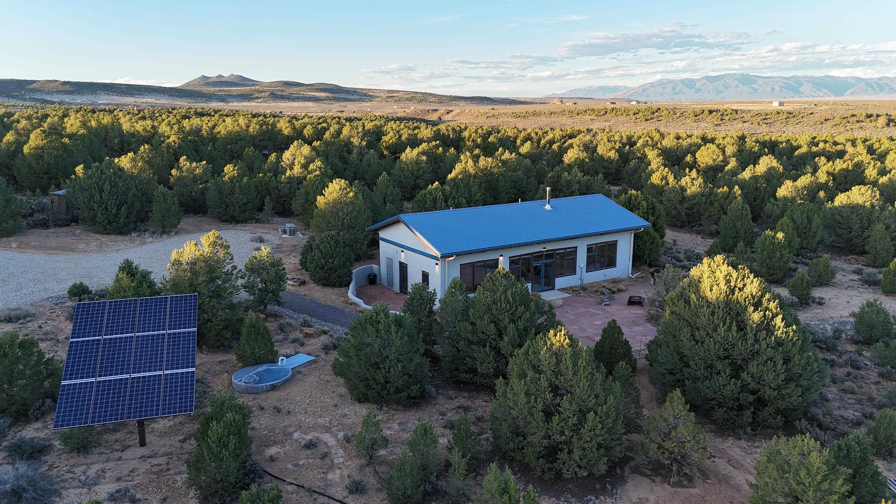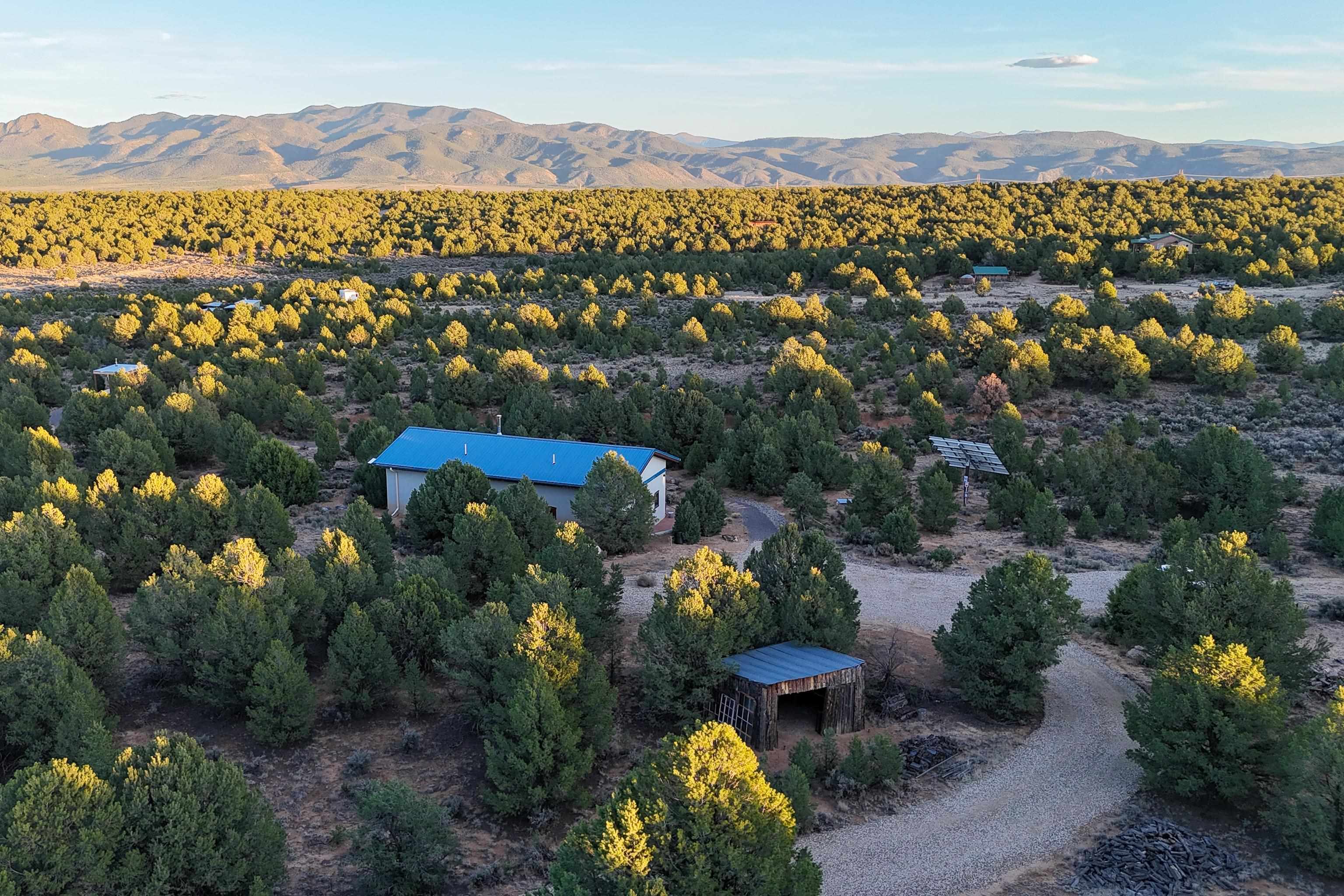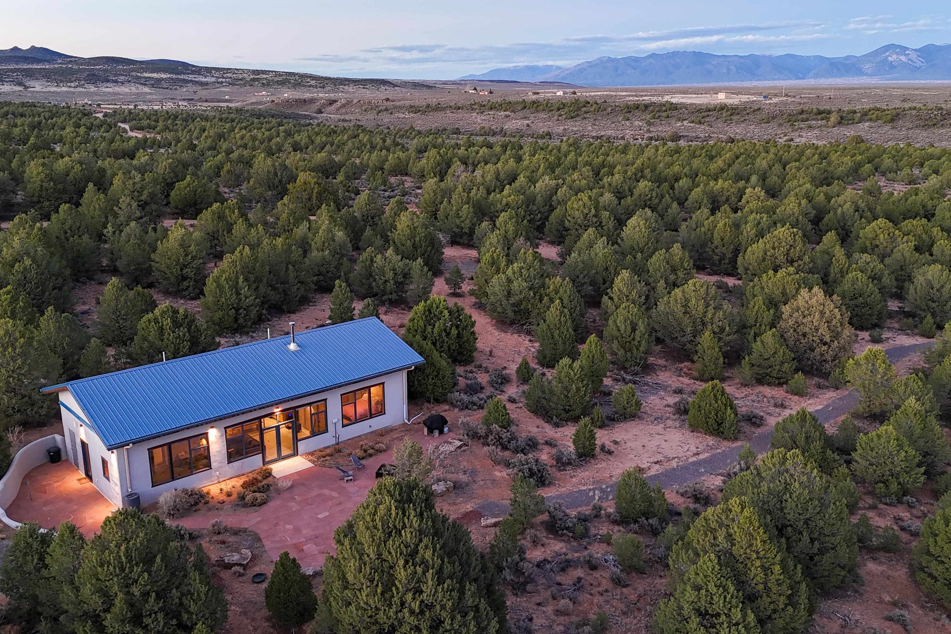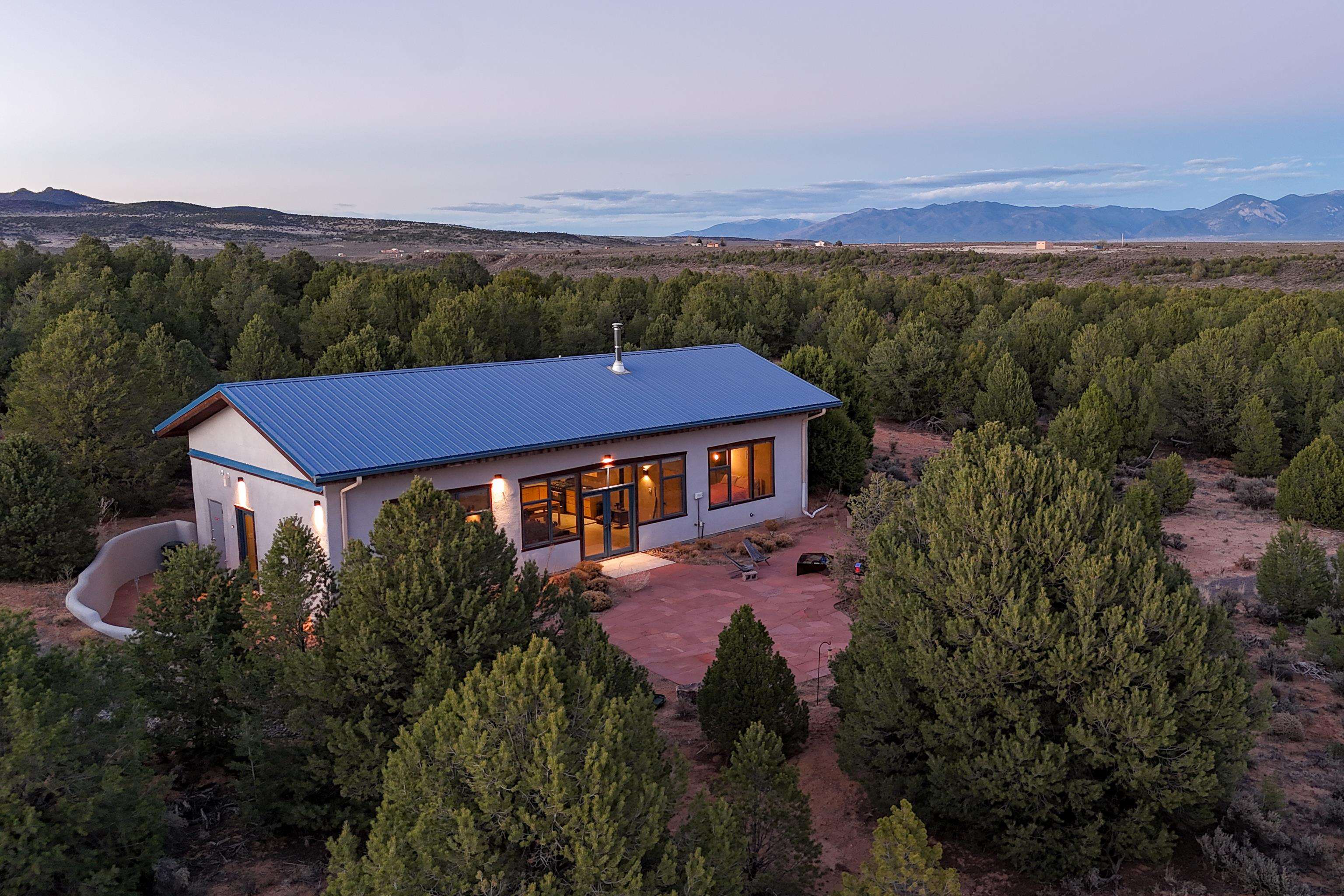 Set on 9 private acres just outside Carson, this thoughtfully crafted 2-bedroom, 2-bath home offers a rare balance of independence, comfort, and enduring quality—just 35 minutes from Taos. Built in 2013 with an emphasis on efficiency and longevity, the home pairs rammed earth and straw bale construction along the north wall with expansive south-facing windows that invite in natural light and passive solar warmth. The result is a space that feels grounded, quiet, and consistently comfortable year-round. The 1,500-square-foot interior is open and sun-filled, with a seamless flow between living, dining, and kitchen. Scandinavian-inspired solid wood cabinetry brings a clean, understated warmth, while French doors open to a beautifully crafted flagstone patio—an easy extension of daily living. Fully off-grid, the property is powered by a well-designed photovoltaic solar system with battery storage housed in a dedicated insulated room, offering reliable, modern functionality without compromise. A short walk along a gravel path leads to a separate sauna pavilion, where a wood-burning barrel sauna frames mountain views through a round picture window—an experience as much as an amenity. Gated access, wide-open skies, and a true sense of quiet define the setting. This is a home built with intention—where craftsmanship, efficiency, and a connection to the landscape come together in a way that’s increasingly hard to find.