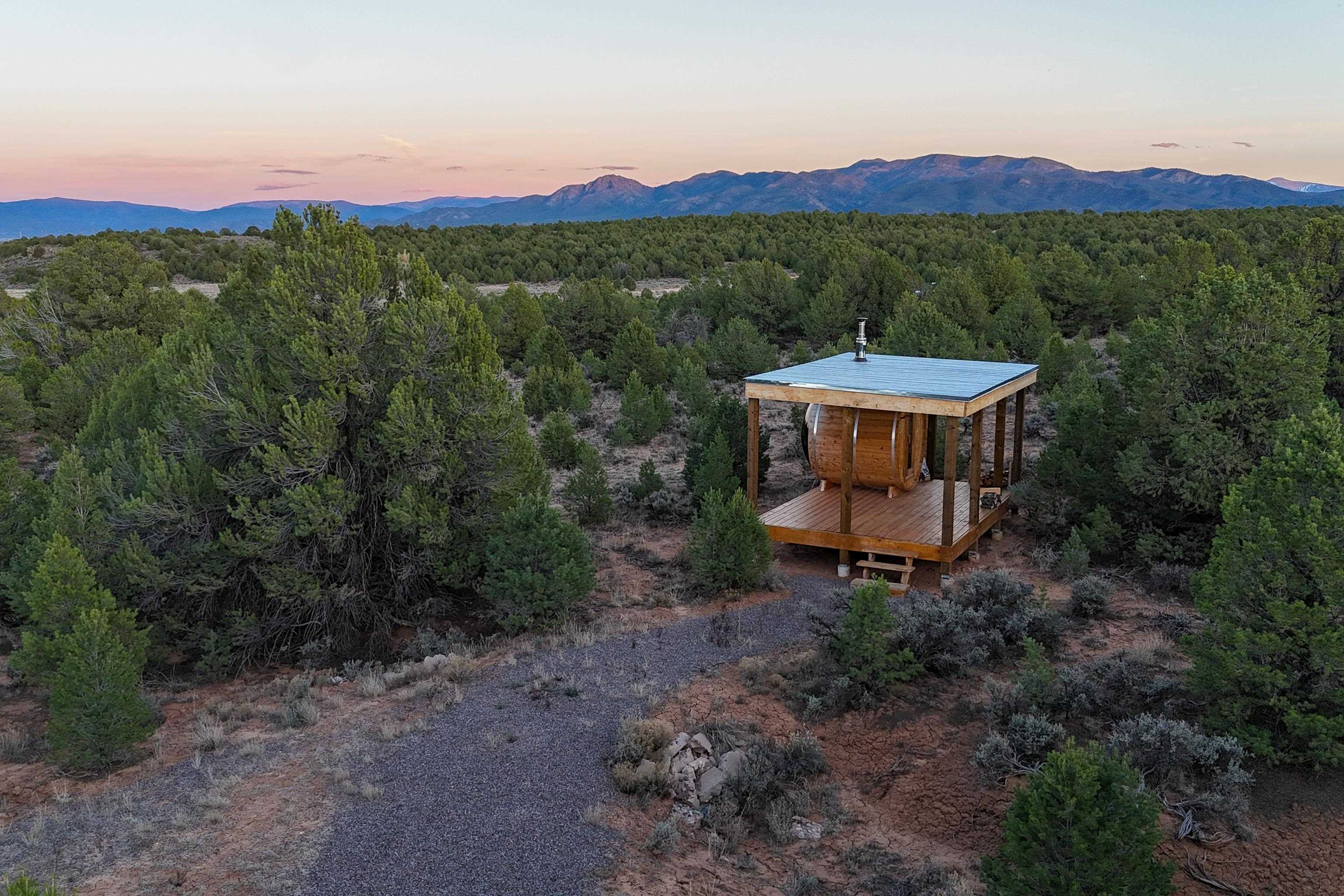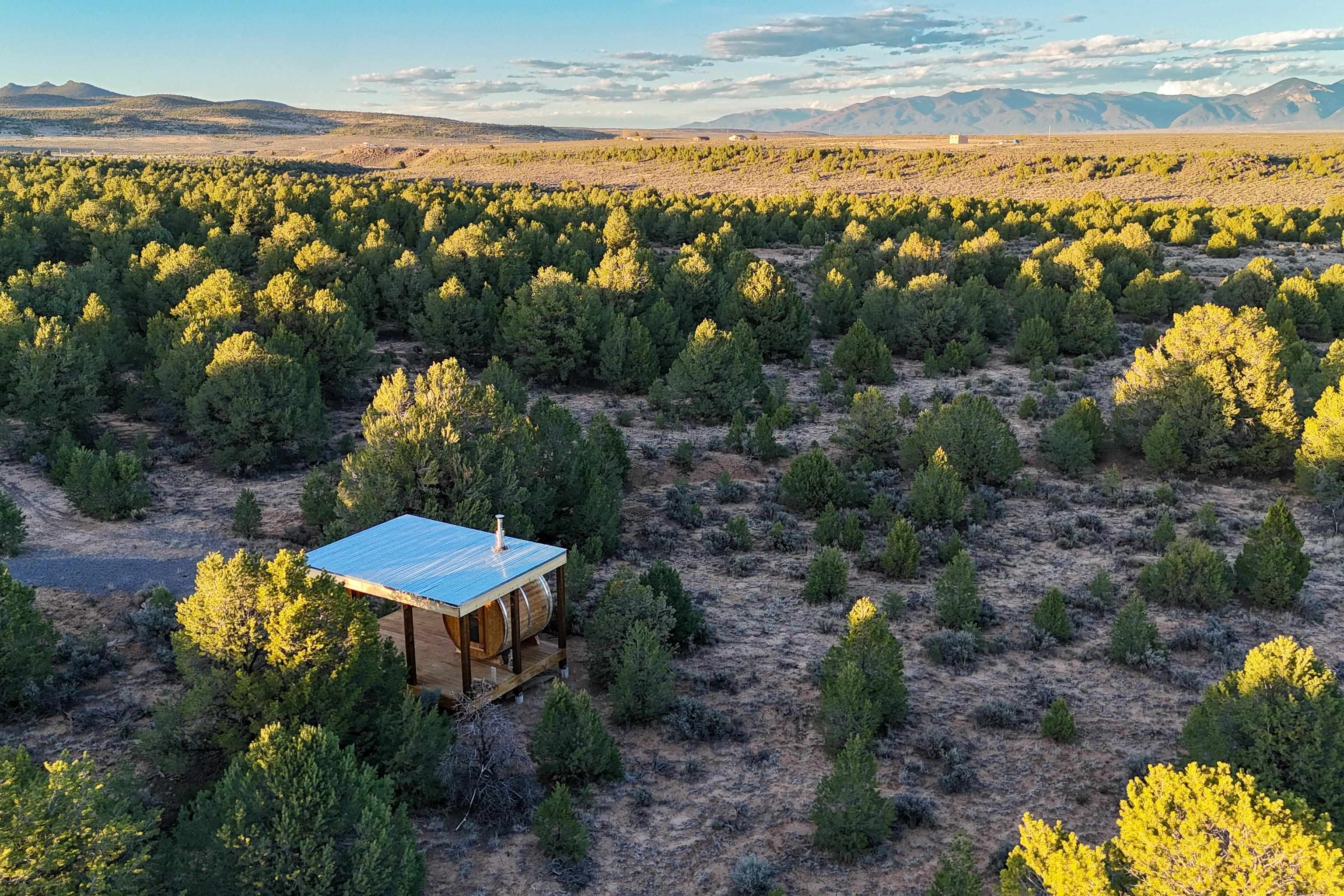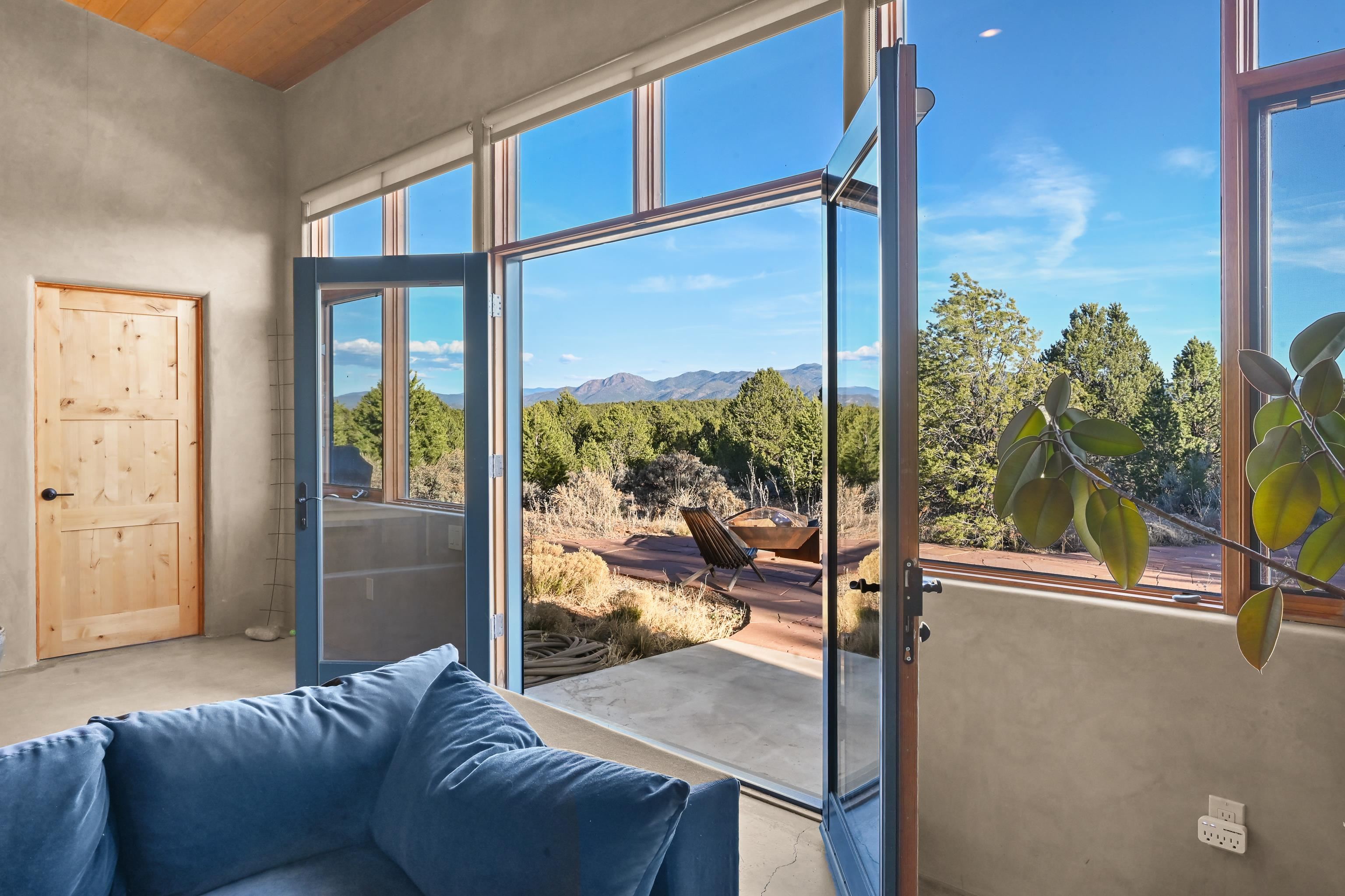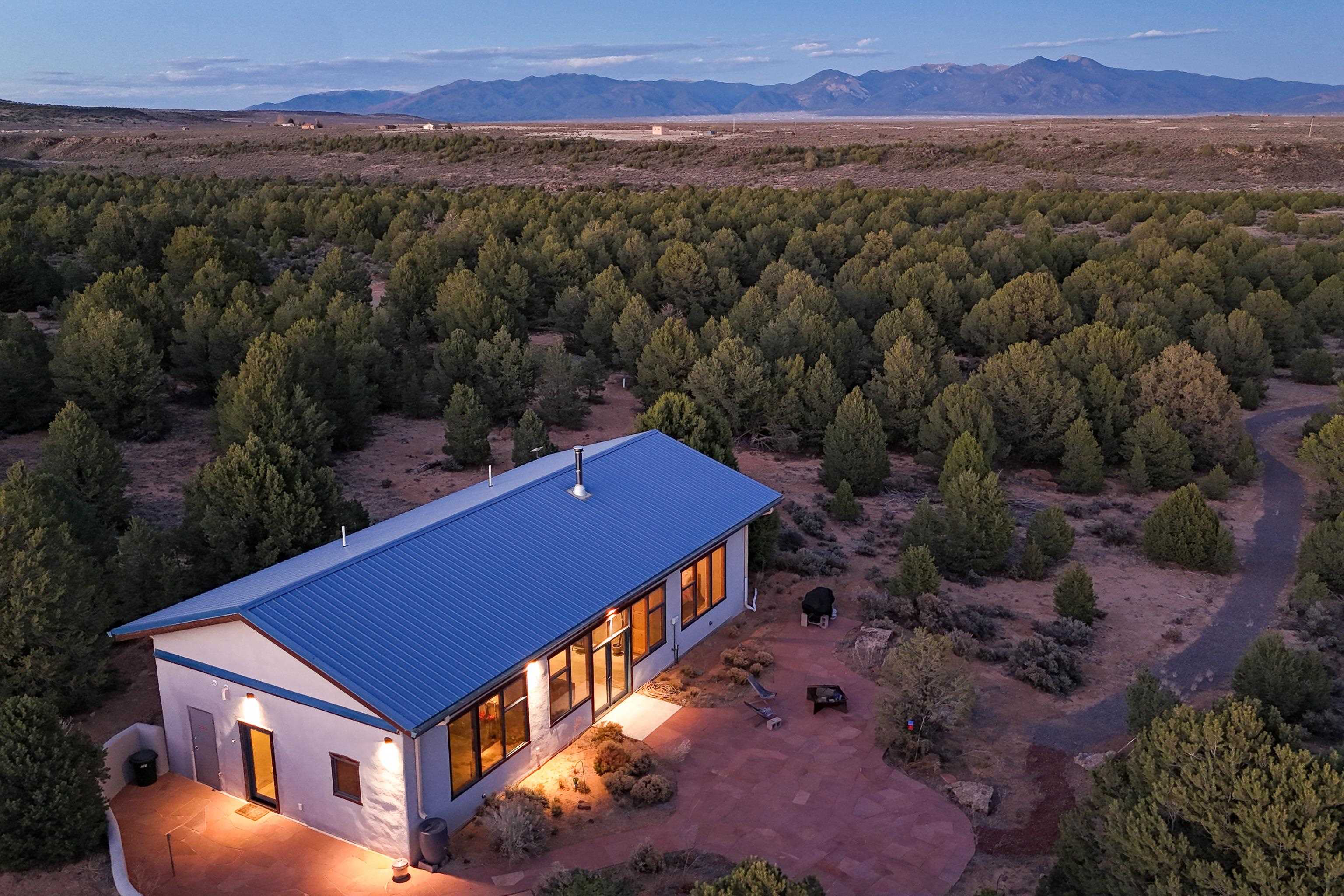Set on 9 private acres just outside Carson, this thoughtfully crafted 2-bedroom, 2-bath home offers a rare balance of independence, comfort, and enduring quality—just 35 minutes from Taos. Built in 2013 with an emphasis on efficiency and longevity, the home pairs rammed earth and straw bale construction along the north wall with expansive south-facing windows that invite in natural light and passive solar warmth. The result is a space that feels grounded, quiet, and consistently comfortable year-round. The 1,500-square-foot interior is open and sun-filled, with a seamless flow between living, dining, and kitchen. Scandinavian-inspired solid wood cabinetry brings a clean, understated warmth, while French doors open to a beautifully crafted flagstone patio—an easy extension of daily living. Fully off-grid, the property is powered by a well-designed photovoltaic solar system with battery storage housed in a dedicated insulated room, offering reliable, modern functionality without compromise. A short walk along a gravel path leads to a separate sauna pavilion, where a wood-burning barrel sauna frames mountain views through a round picture window—an experience as much as an amenity. Gated access, wide-open skies, and a true sense of quiet define the setting. This is a home built with intention—where craftsmanship, efficiency, and a connection to the landscape come together in a way that’s increasingly hard to find.
