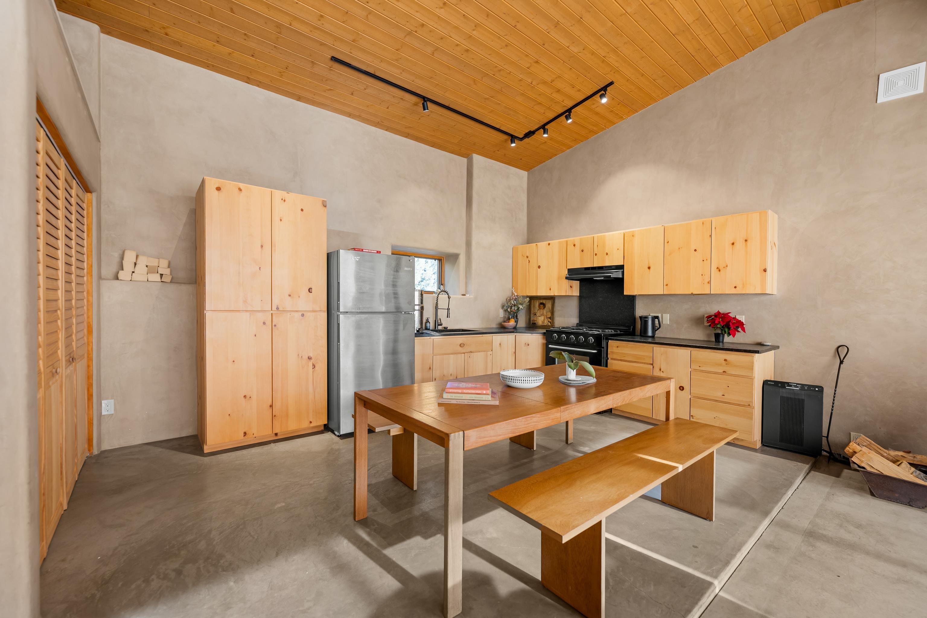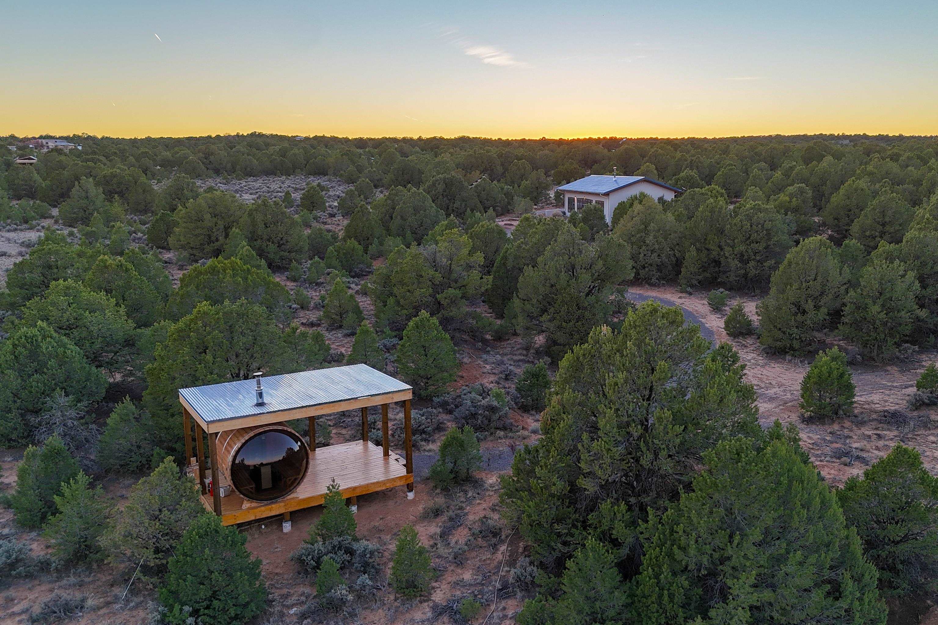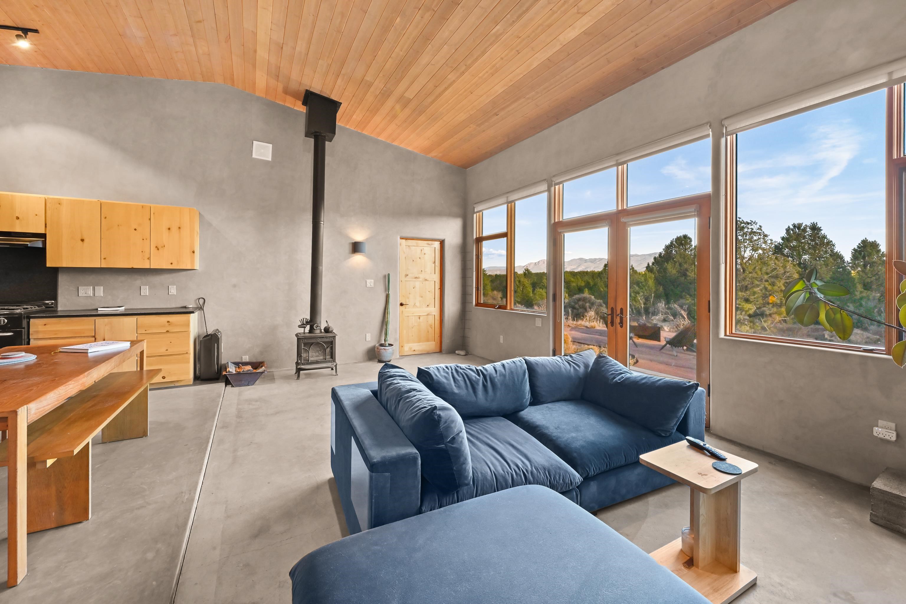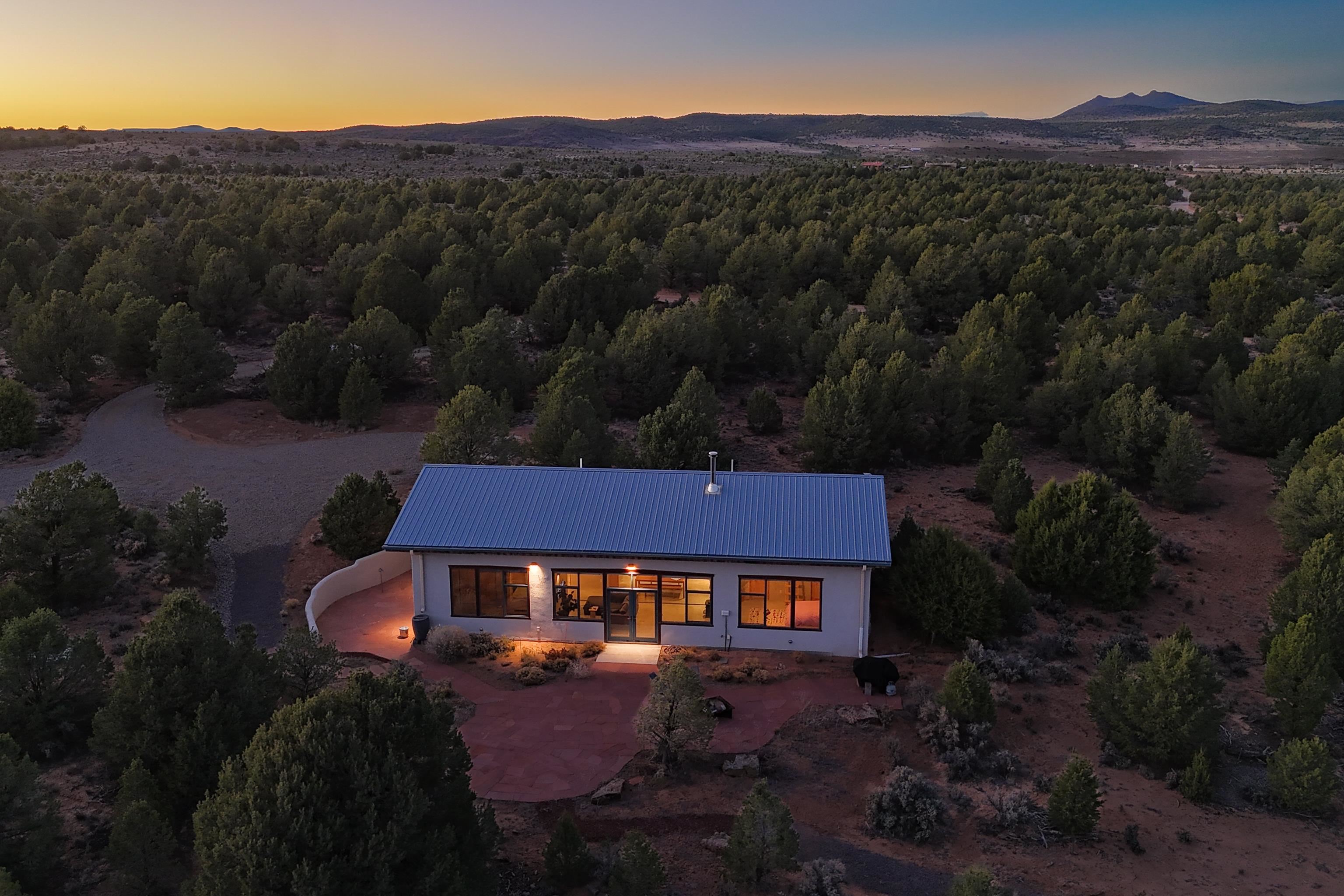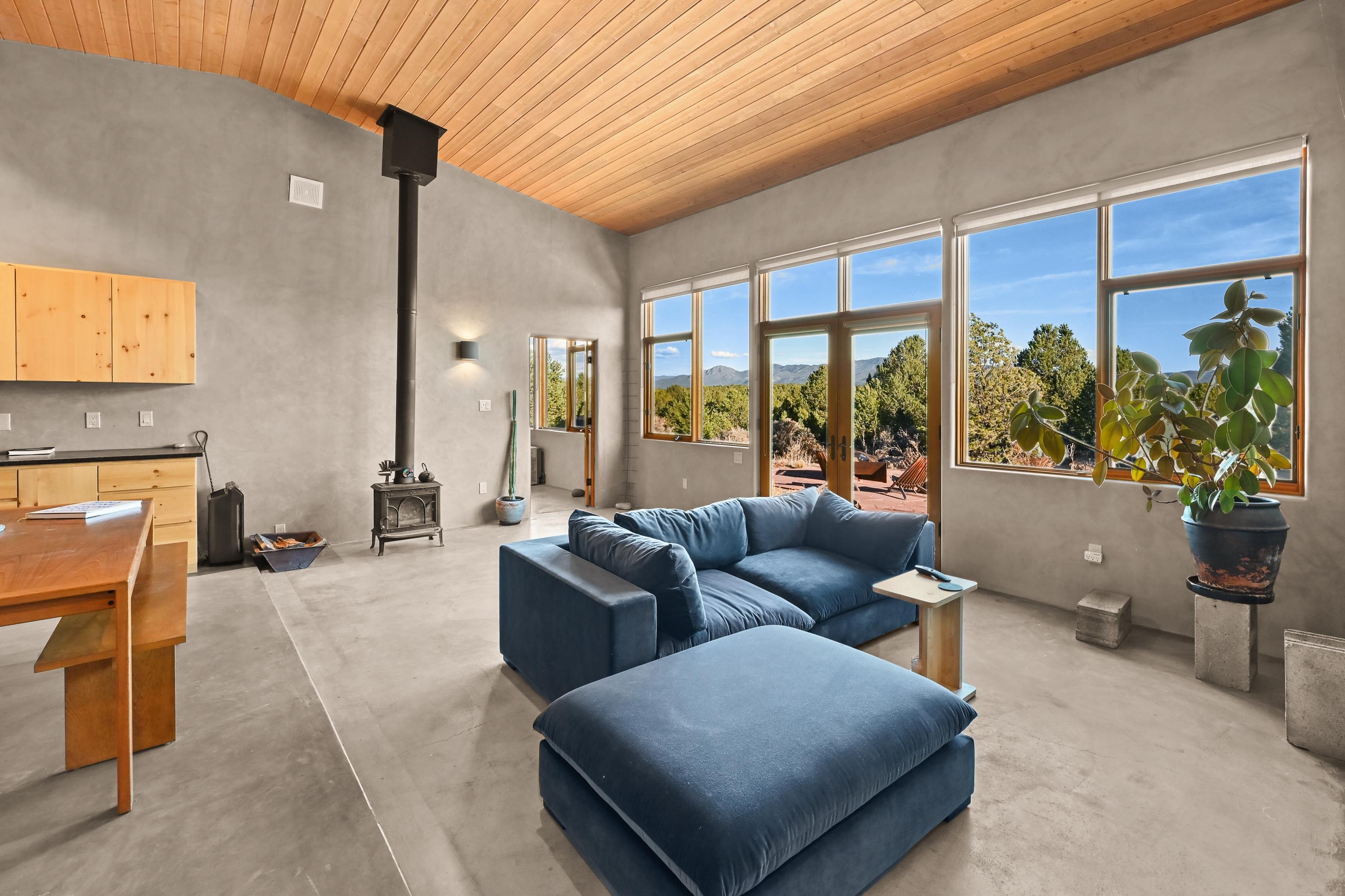 Set on 9 private acres just outside Carson, this thoughtfully crafted 2-bedroom, 2-bath home offers a rare balance of independence, comfort, and enduring quality—just 35 minutes from Taos. Built in 2013 with an emphasis on efficiency and longevity, the home pairs rammed earth and straw bale construction along the north wall with expansive south-facing windows that invite in natural light and passive solar warmth. The result is a space that feels grounded, quiet, and consistently comfortable year-round. The 1,500-square-foot interior is open and sun-filled, with a seamless flow between living, dining, and kitchen. Scandinavian-inspired solid wood cabinetry brings a clean, understated warmth, while French doors open to a beautifully crafted flagstone patio—an easy extension of daily living. Fully off-grid, the property is powered by a well-designed photovoltaic solar system with battery storage housed in a dedicated insulated room, offering reliable, modern functionality without compromise. A short walk along a gravel path leads to a separate sauna pavilion, where a wood-burning barrel sauna frames mountain views through a round picture window—an experience as much as an amenity. Gated access, wide-open skies, and a true sense of quiet define the setting. This is a home built with intention—where craftsmanship, efficiency, and a connection to the landscape come together in a way that’s increasingly hard to find.