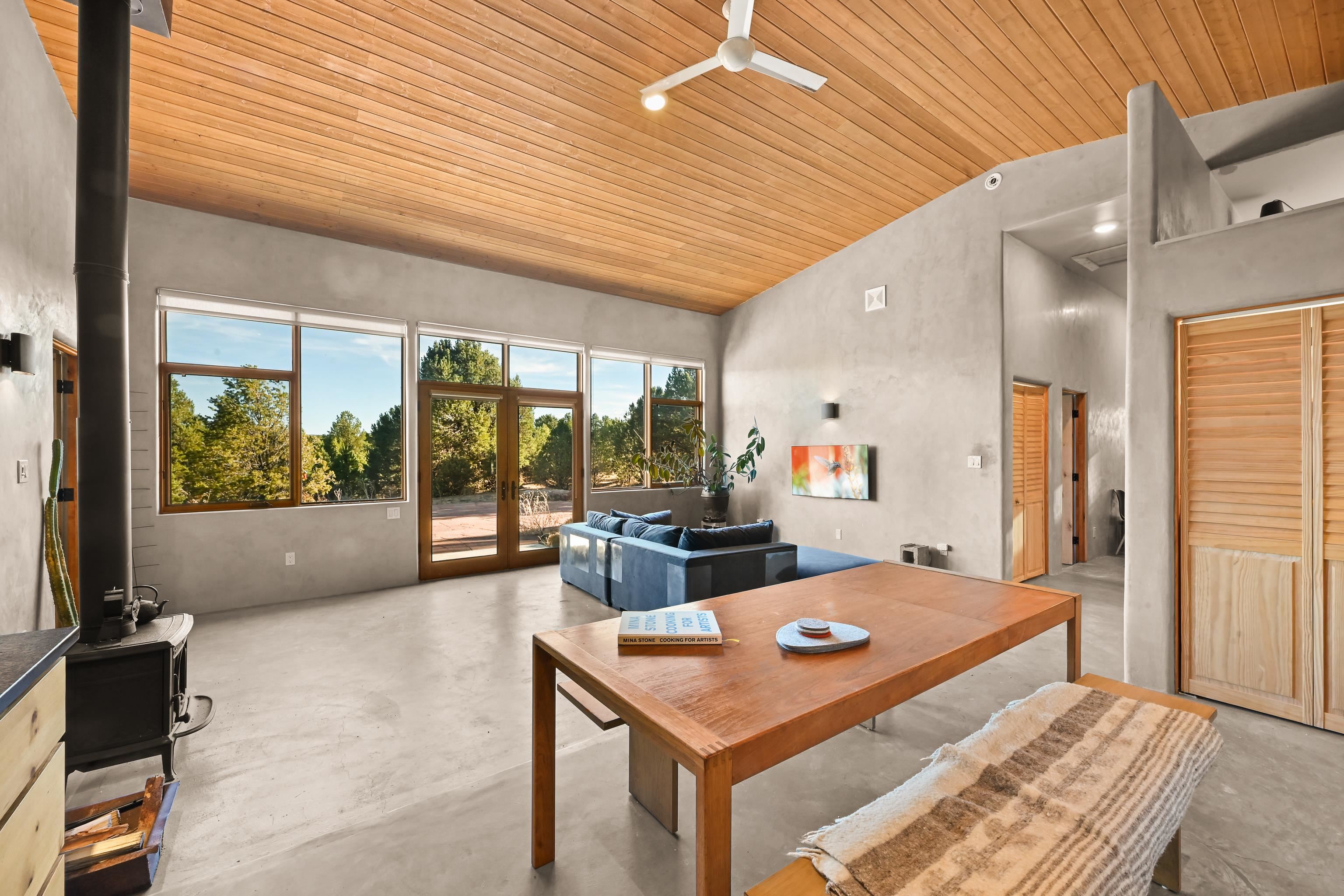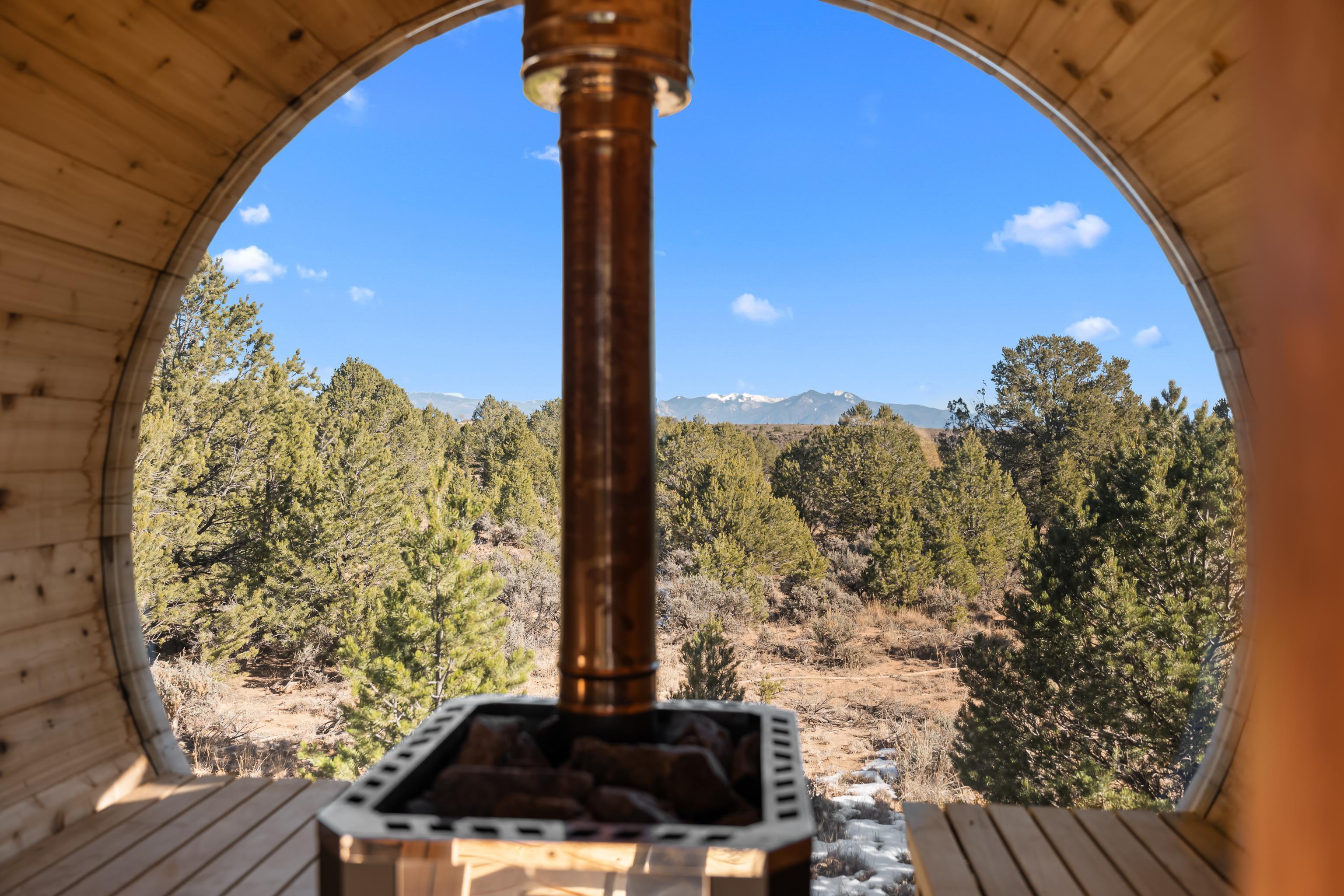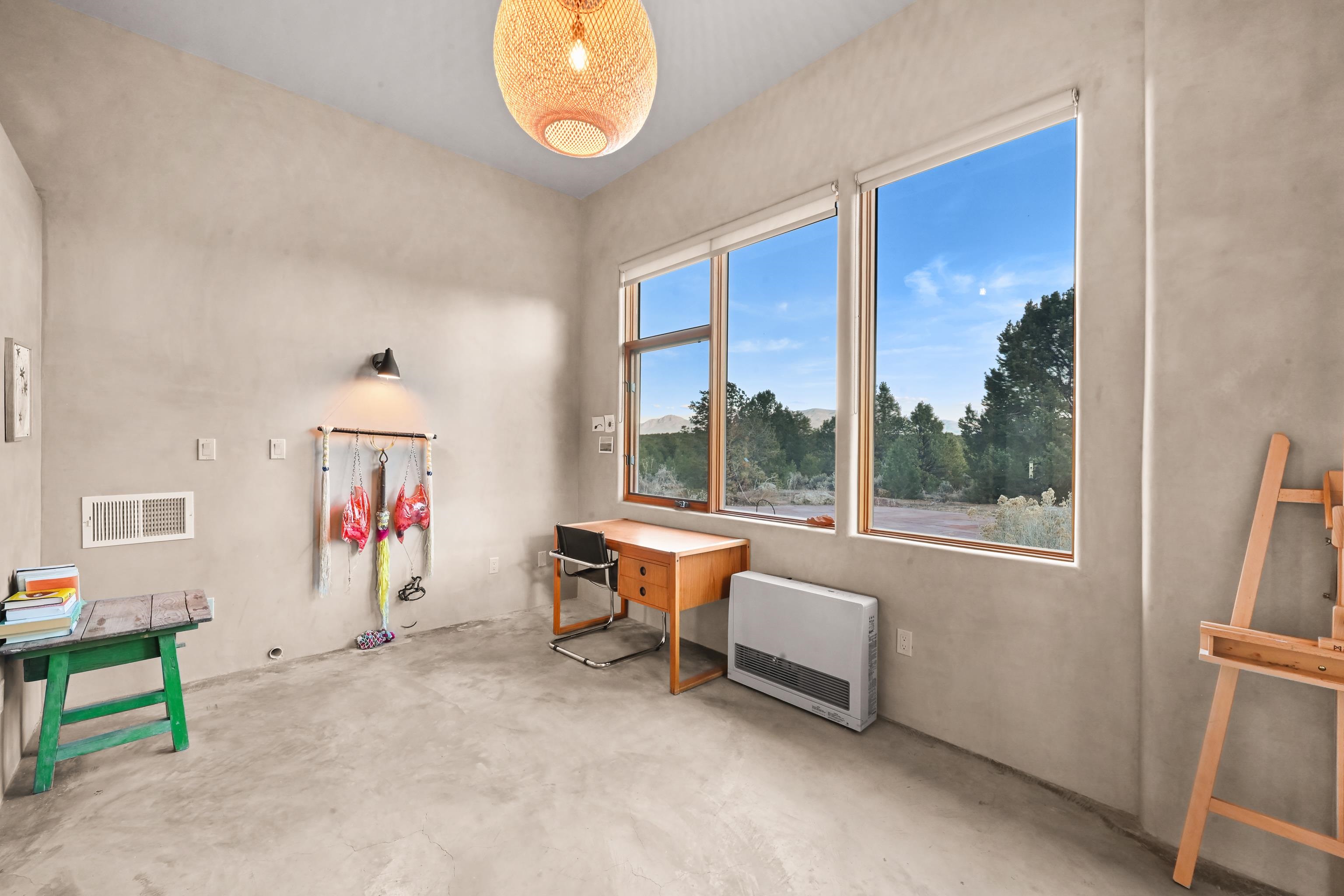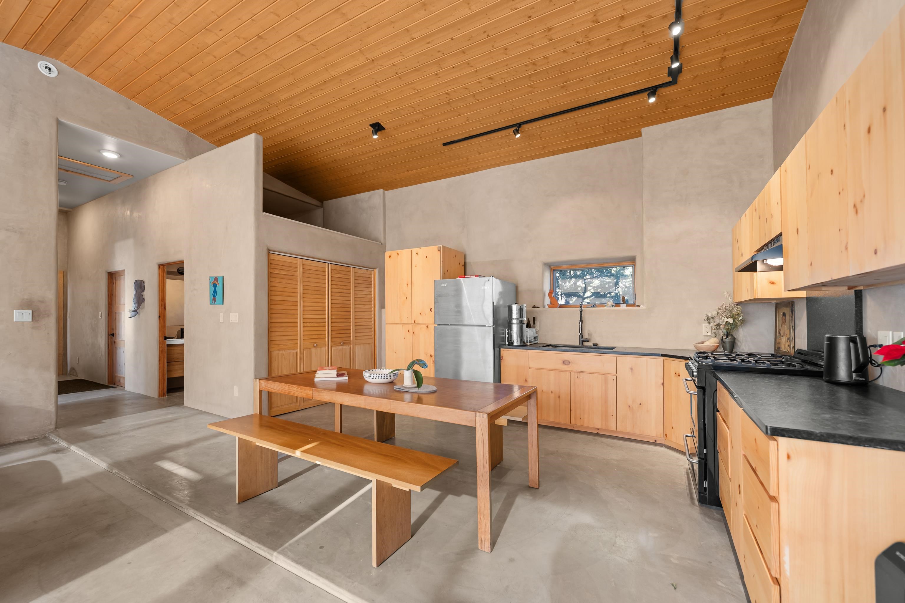 Set on 9 private acres just outside Carson, this thoughtfully crafted 2-bedroom, 2-bath home offers a rare balance of independence, comfort, and enduring quality—just 35 minutes from Taos. Built in 2013 with an emphasis on efficiency and longevity, the home pairs rammed earth and straw bale construction along the north wall with expansive south-facing windows that invite in natural light and passive solar warmth. The result is a space that feels grounded, quiet, and consistently comfortable year-round. The 1,500-square-foot interior is open and sun-filled, with a seamless flow between living, dining, and kitchen. Scandinavian-inspired solid wood cabinetry brings a clean, understated warmth, while French doors open to a beautifully crafted flagstone patio—an easy extension of daily living. Fully off-grid, the property is powered by a well-designed photovoltaic solar system with battery storage housed in a dedicated insulated room, offering reliable, modern functionality without compromise. A short walk along a gravel path leads to a separate sauna pavilion, where a wood-burning barrel sauna frames mountain views through a round picture window—an experience as much as an amenity. Gated access, wide-open skies, and a true sense of quiet define the setting. This is a home built with intention—where craftsmanship, efficiency, and a connection to the landscape come together in a way that’s increasingly hard to find.