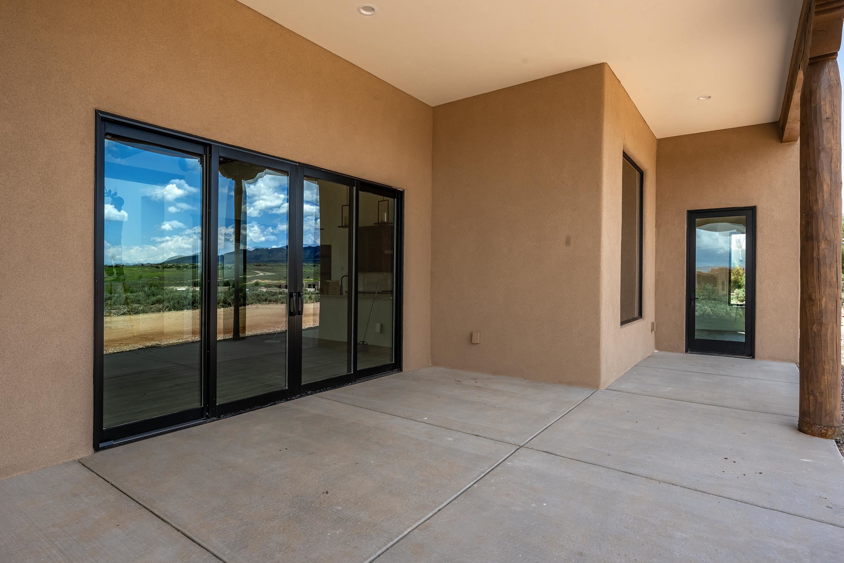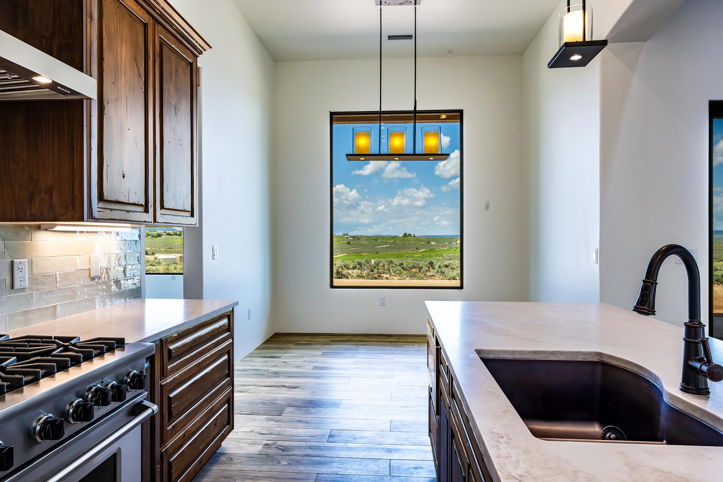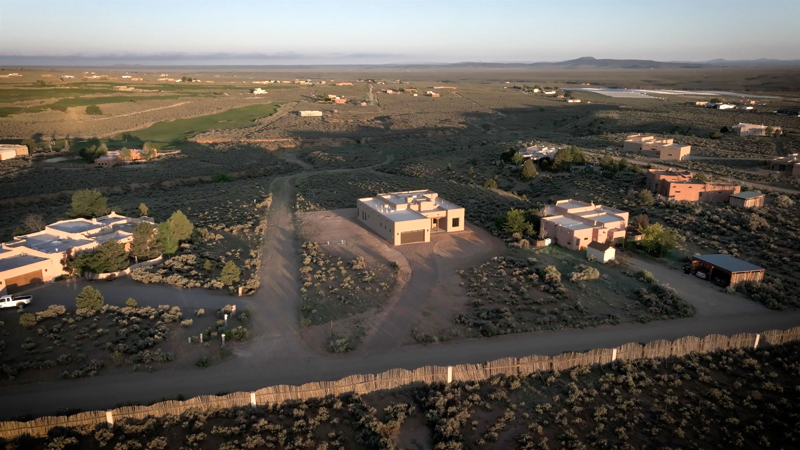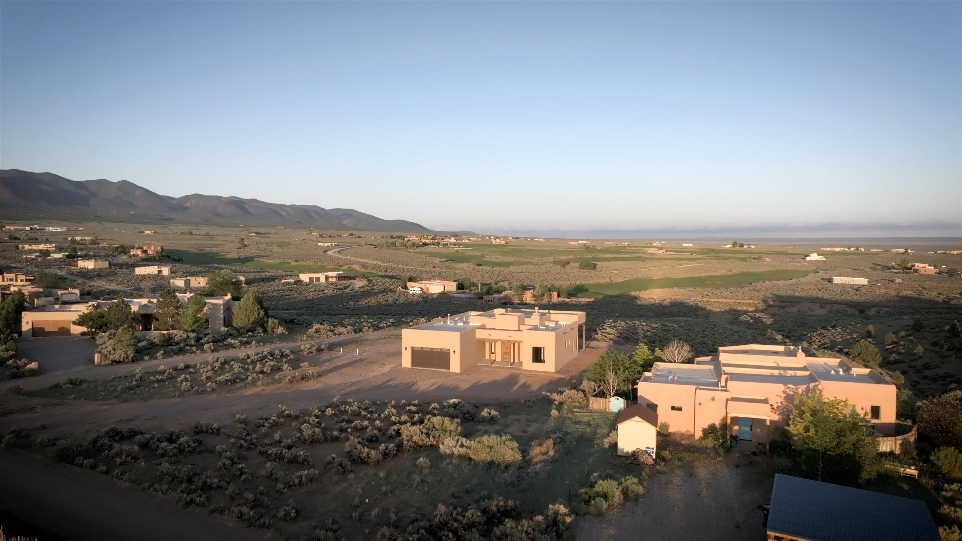We call it Taos modern, the builder says. “It’s neither Pueblo nor strictly modern— it’s simply elegant.” It’s a seamless, stunning blend of contemporary sophistication with the enduring charm of Northern New Mexican traditional design. Upon entering through the custom front door, visitors are immediately greeted by an expansive view through large glass doors that lead to the patio. The open concept living area centers around a striking fireplace that embodies the home’s style. Hints of traditional detail with sophisticated clean lines. The room’s high ceilings and thoughtfully chosen light fixtures add drama without overpowering the space. The kitchen, a centerpiece of the home, was designed with both function and flair and includes Viking appliances plus highly desired Taj Mahal granite countertops. Because of the open concept and interconnected spaces, there’s a captivating view in nearly every direction. A neutral color palette creates a serene, timeless atmosphere throughout the home. The elegant soaking tub is the perfect spot to wind down and enjoy the views looking towards the golf course. The alluring accent tile conjures a connection to nature with its multitude of green hues and organic, handmade style, but the stacked design is decidedly modern sleek. The linear modern tiles on the floor and shower walls, create a calm, spa-like space. The countertops that embody the entire palette and sleek plumbing fixtures complete the master suite. What we call standard features; the other guys call upgrades. Because our custom homes have so many amenities, they require very few upgrades. A uniquely crafted Taos modern custom home with dramatic clerestory natural light, proportion, and scale, to accentuate the sleek elegance of Taos modern architecture.