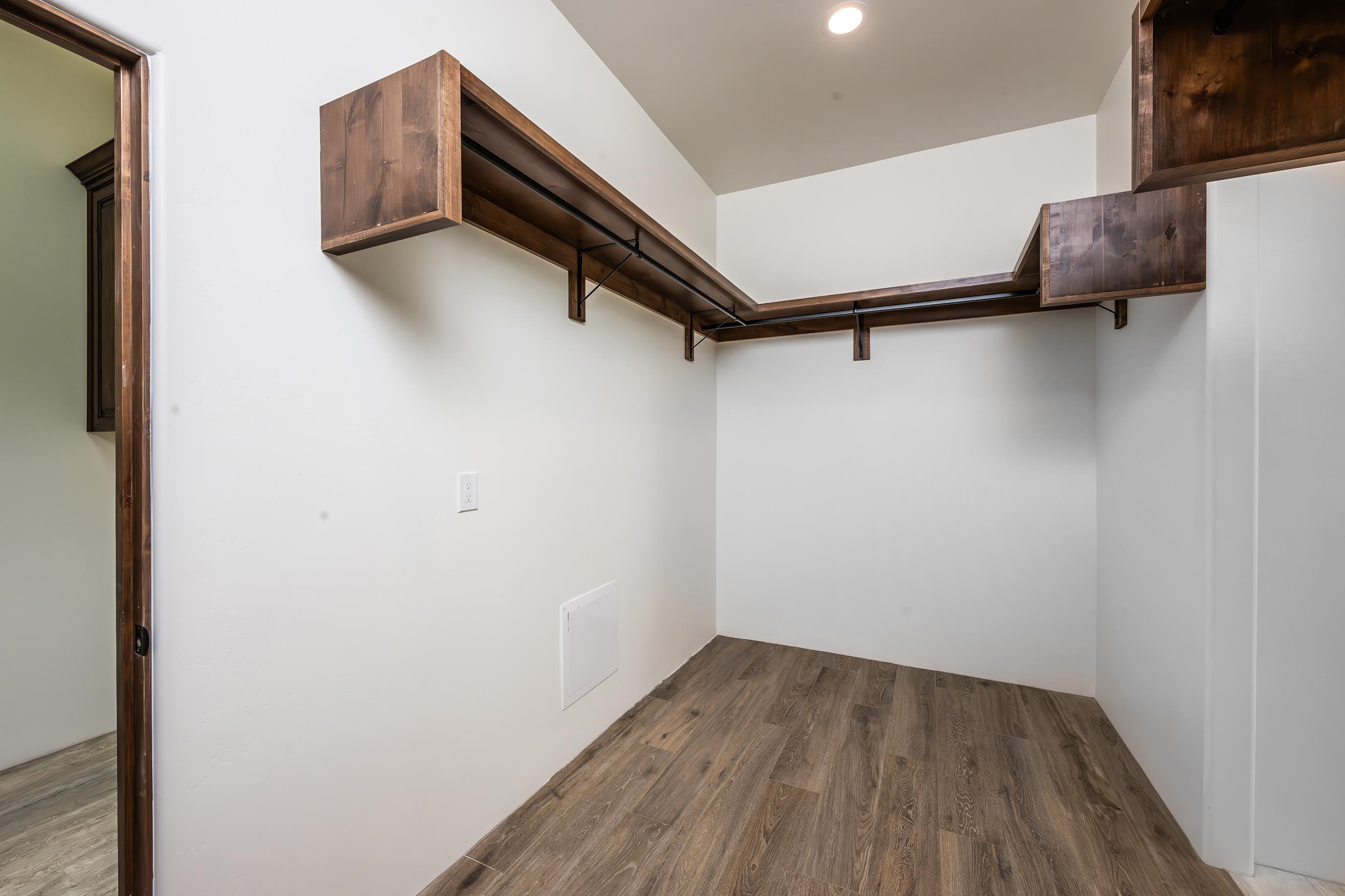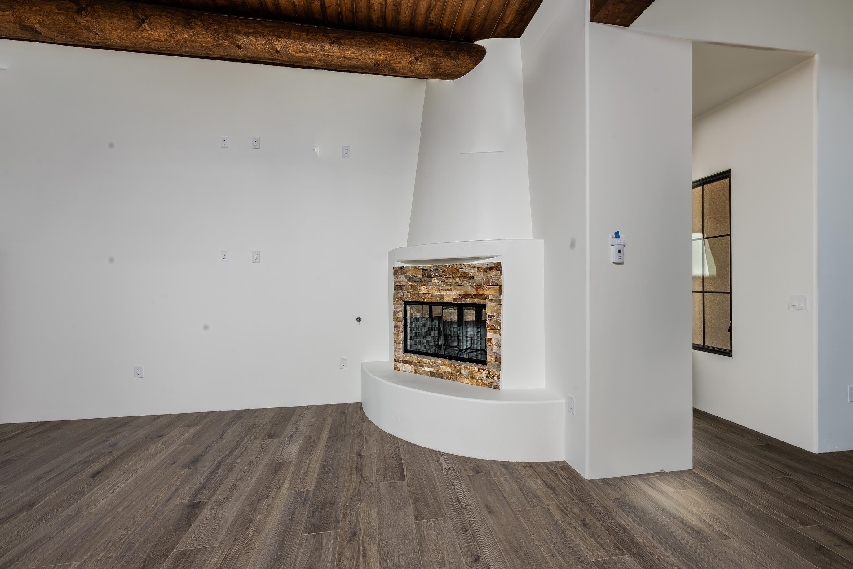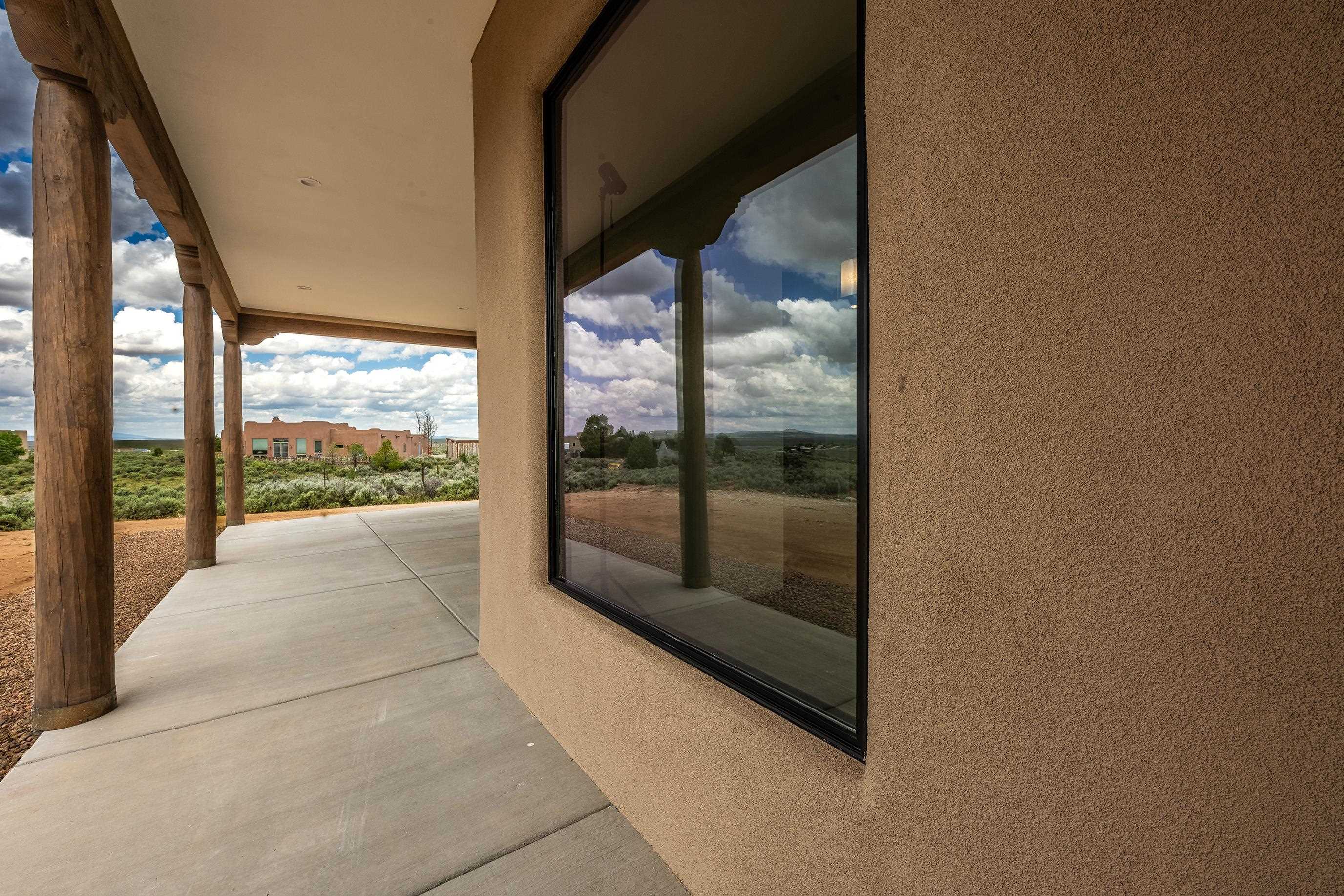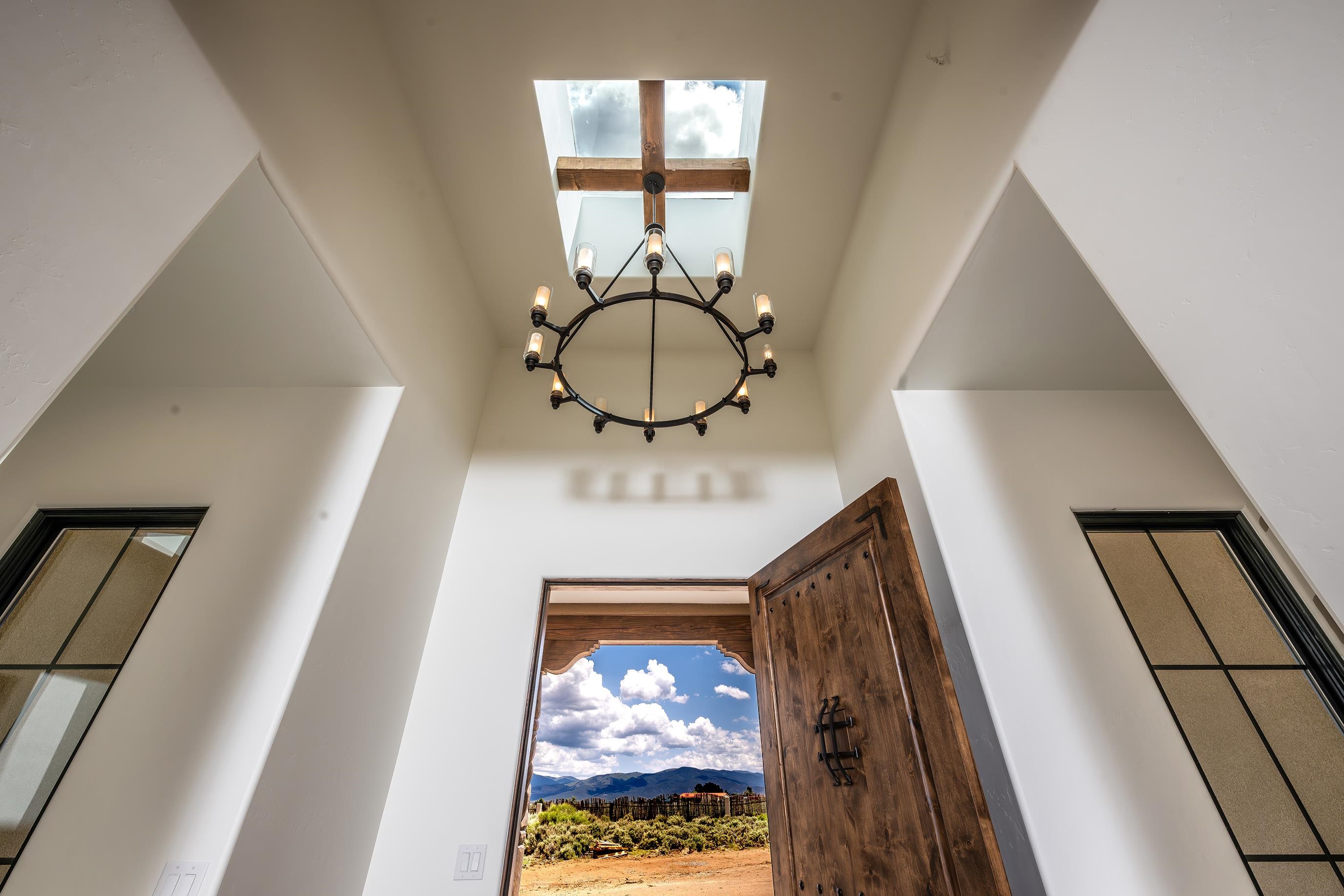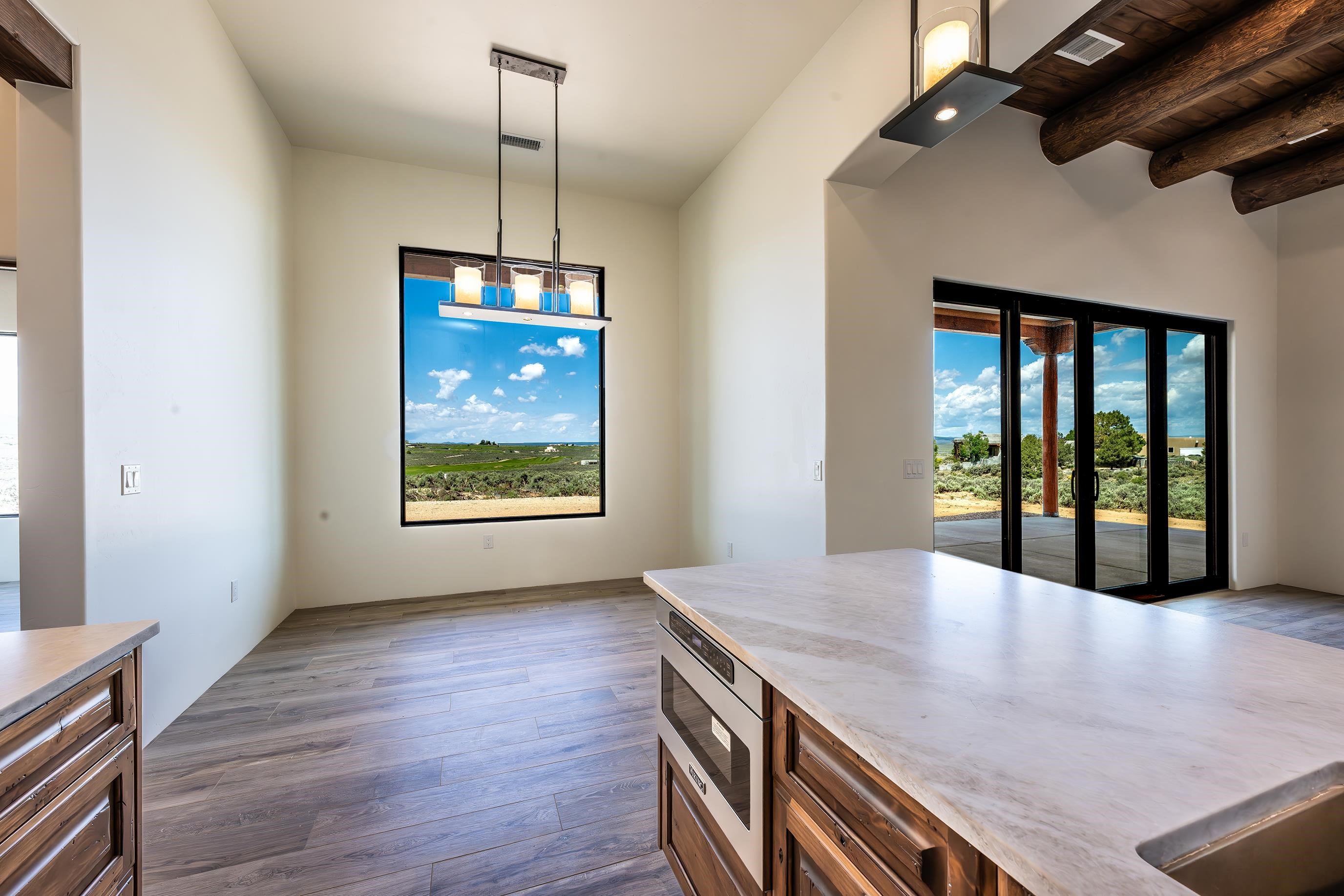 We call it Taos modern, the builder says. “It’s neither Pueblo nor strictly modern— it’s simply elegant.” It’s a seamless, stunning blend of contemporary sophistication with the enduring charm of Northern New Mexican traditional design. Upon entering through the custom front door, visitors are immediately greeted by an expansive view through large glass doors that lead to the patio. The open concept living area centers around a striking fireplace that embodies the home’s style. Hints of traditional detail with sophisticated clean lines. The room’s high ceilings and thoughtfully chosen light fixtures add drama without overpowering the space. The kitchen, a centerpiece of the home, was designed with both function and flair and includes Viking appliances plus highly desired Taj Mahal granite countertops. Because of the open concept and interconnected spaces, there’s a captivating view in nearly every direction. A neutral color palette creates a serene, timeless atmosphere throughout the home. The elegant soaking tub is the perfect spot to wind down and enjoy the views looking towards the golf course. The alluring accent tile conjures a connection to nature with its multitude of green hues and organic, handmade style, but the stacked design is decidedly modern sleek. The linear modern tiles on the floor and shower walls, create a calm, spa-like space. The countertops that embody the entire palette and sleek plumbing fixtures complete the master suite. What we call standard features; the other guys call upgrades. Because our custom homes have so many amenities, they require very few upgrades. A uniquely crafted Taos modern custom home with dramatic clerestory natural light, proportion, and scale, to accentuate the sleek elegance of Taos modern architecture.