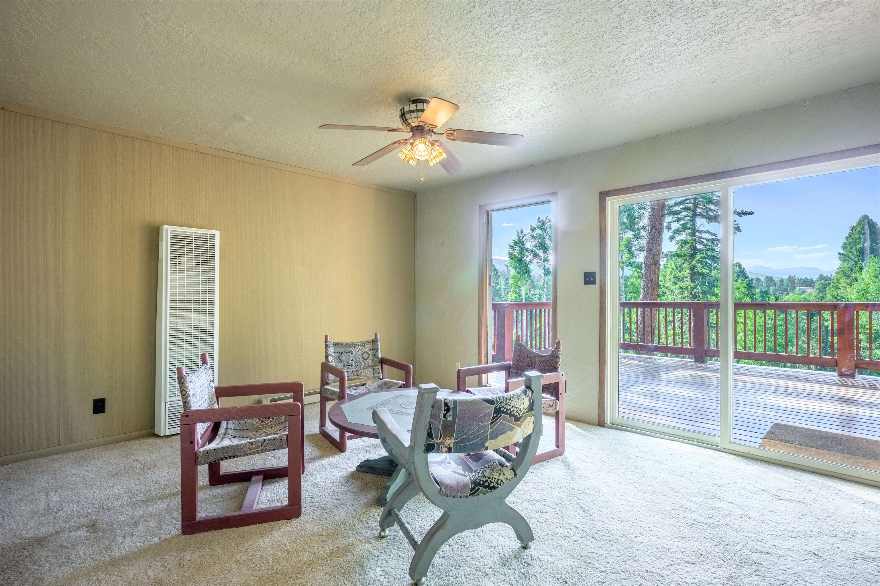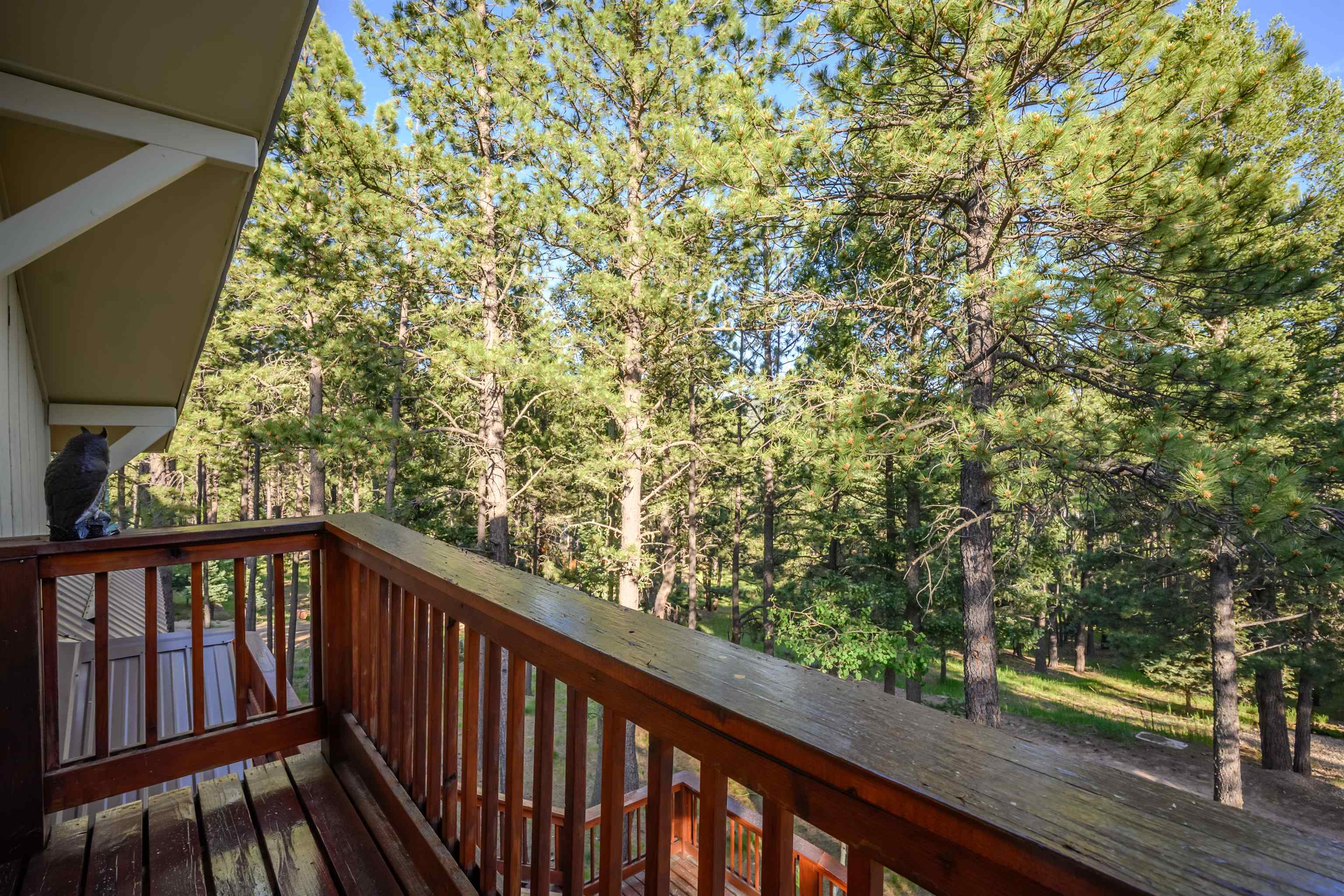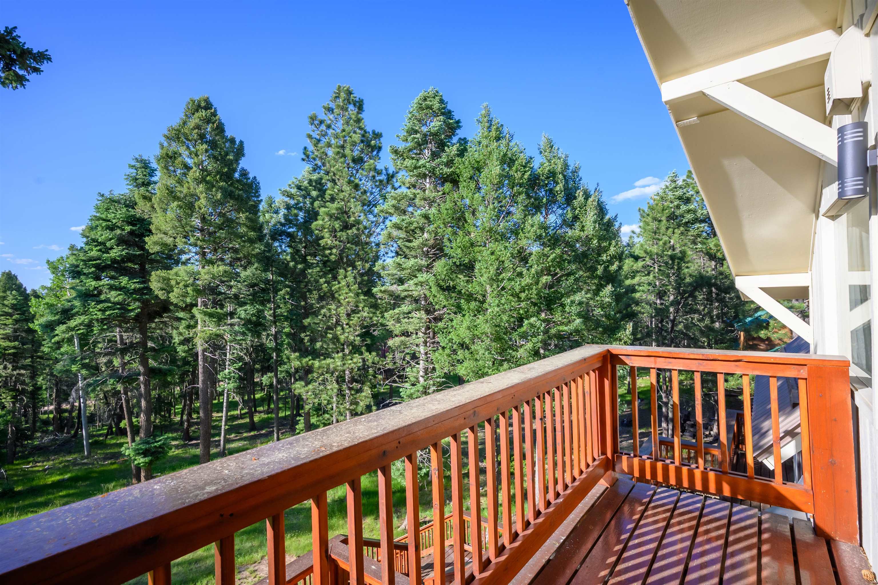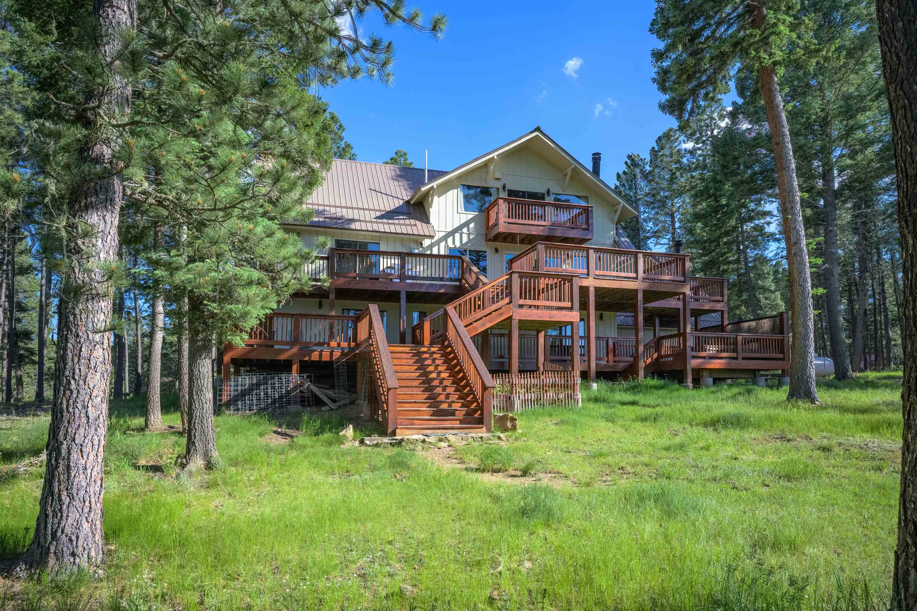 Magic in the Angel Fire Forest ~ This extraordinary Angel Fire home, originally designed and built for the renowned Western artist Gary Niblett, offers a rare chance to own a piece of local history, blending artistic vision with true mountain living. From its warm, south-facing exposure, the home captures beautiful views of Wheeler Peak inviting the majesty of the outdoors inside through massive walls of glass and vibrant stained glass windows. The interior boasts features like red willow ceilings and wall coverings, adding a rustic elegance to its four distinct living areas, three of which feature natural rock fireplaces perfect for cozy evenings. The seamless flow to the outdoors is achieved through nine doors leading to an elaborate, three-level redwood deck, ideal for entertaining or simply soaking in the serene mountain air. The lower deck even includes a private hot tub with peaceful forest views. Situated on a quiet street, this historic gem is just a stone's throw from the Angel Fire Country Club, golf course, and Monte Verde Lake, and slopes are all around the corner, making this home a perfect base for year-round adventures. This isn't just a house; it's a piece of history that awaits it's next lucky owner.