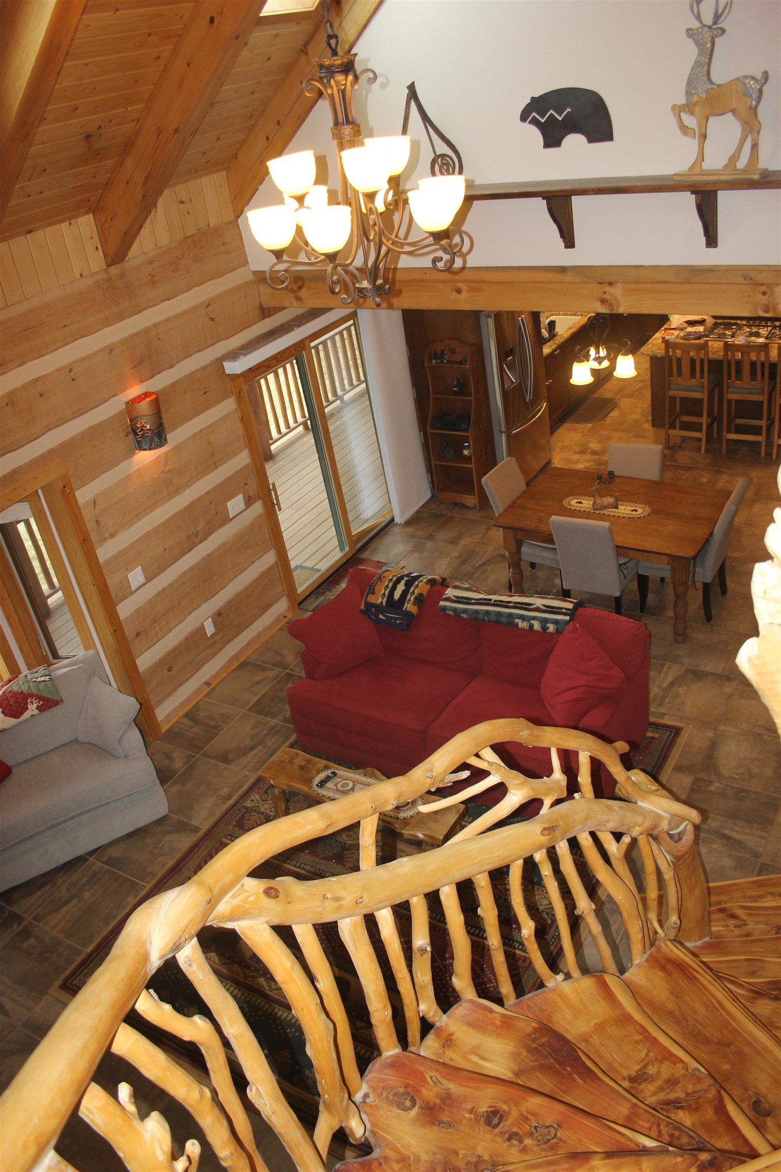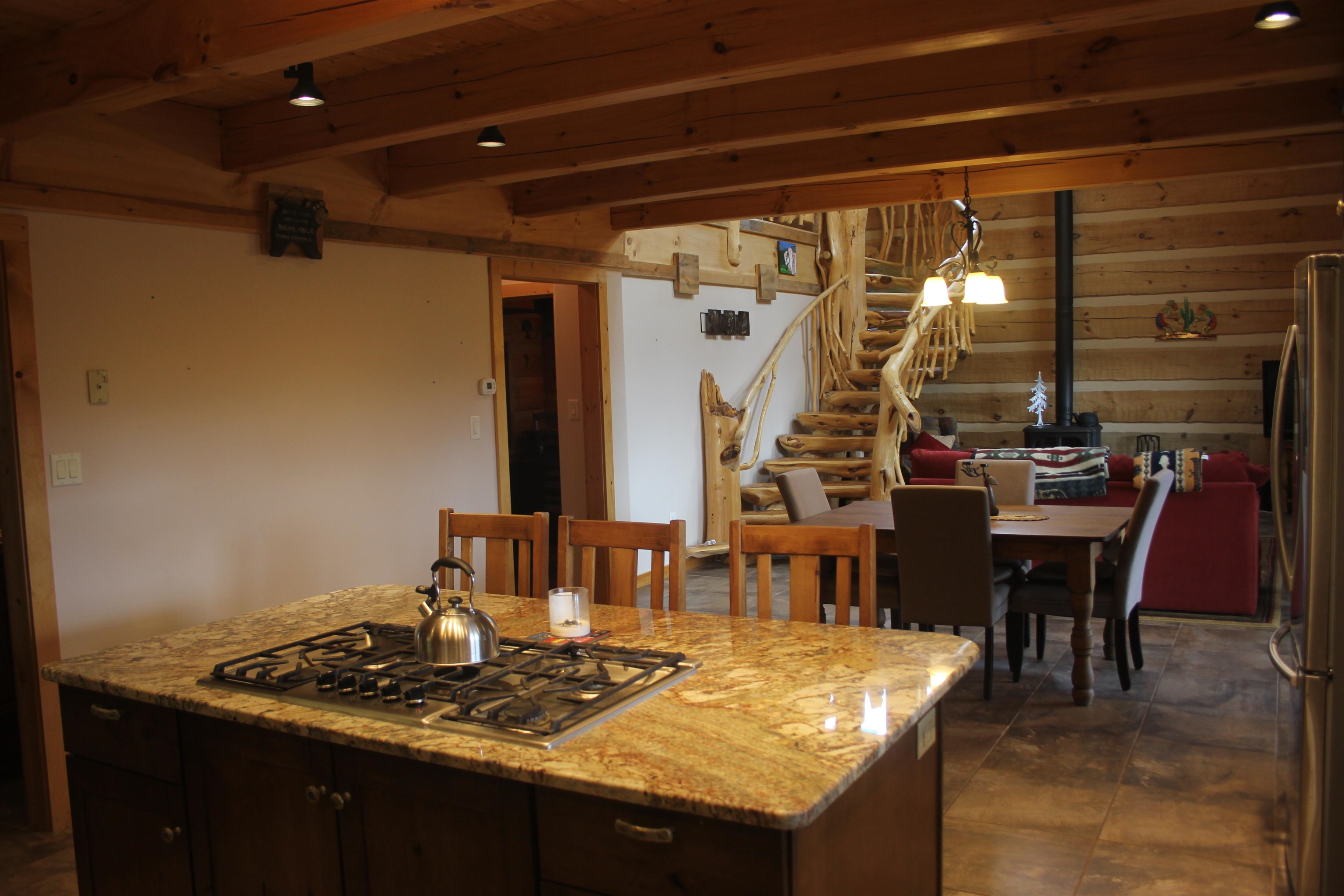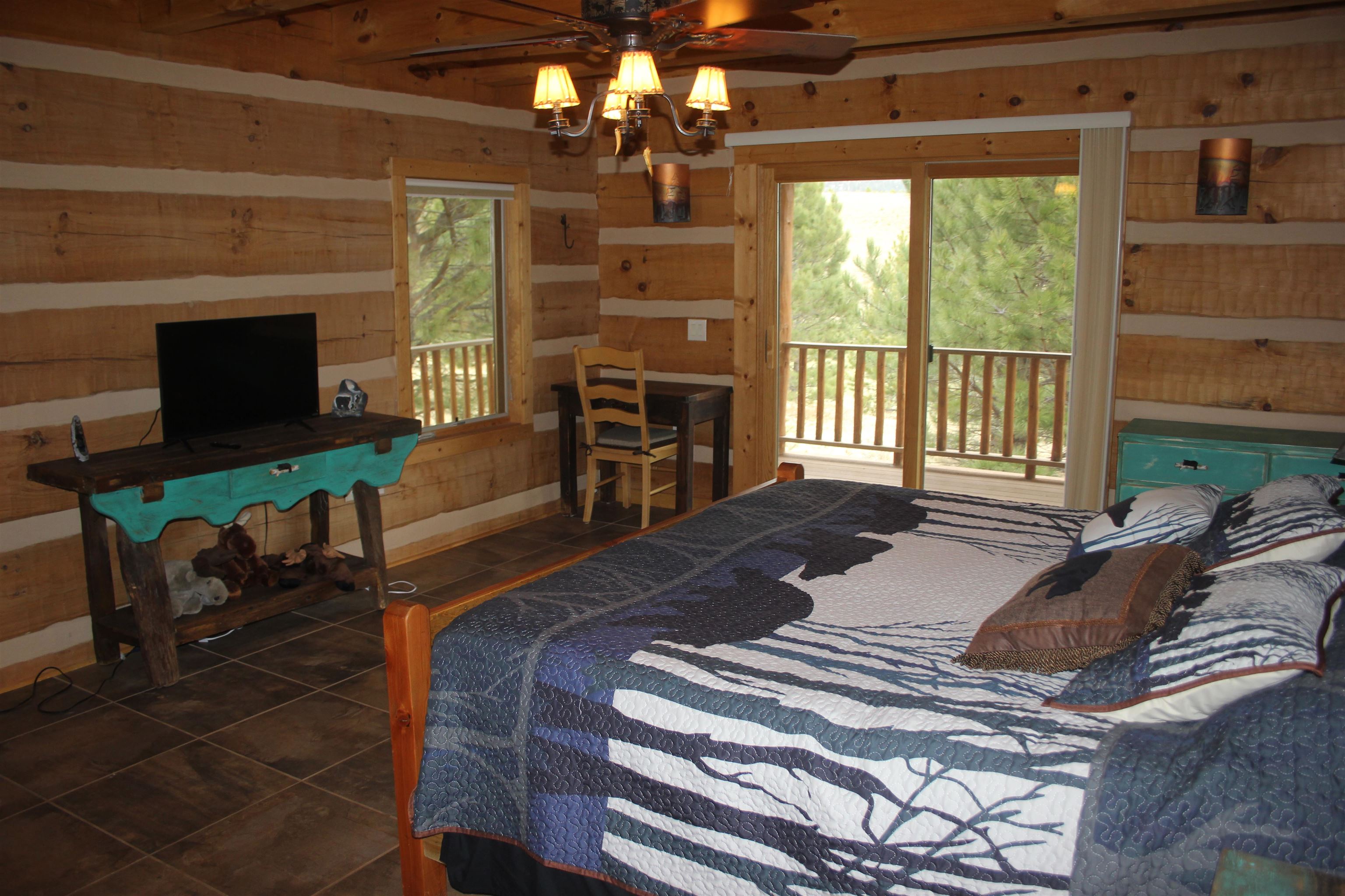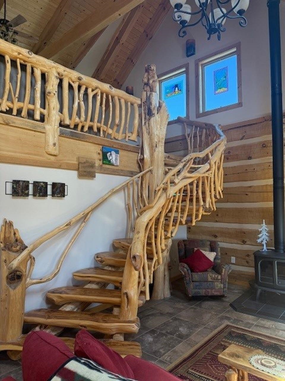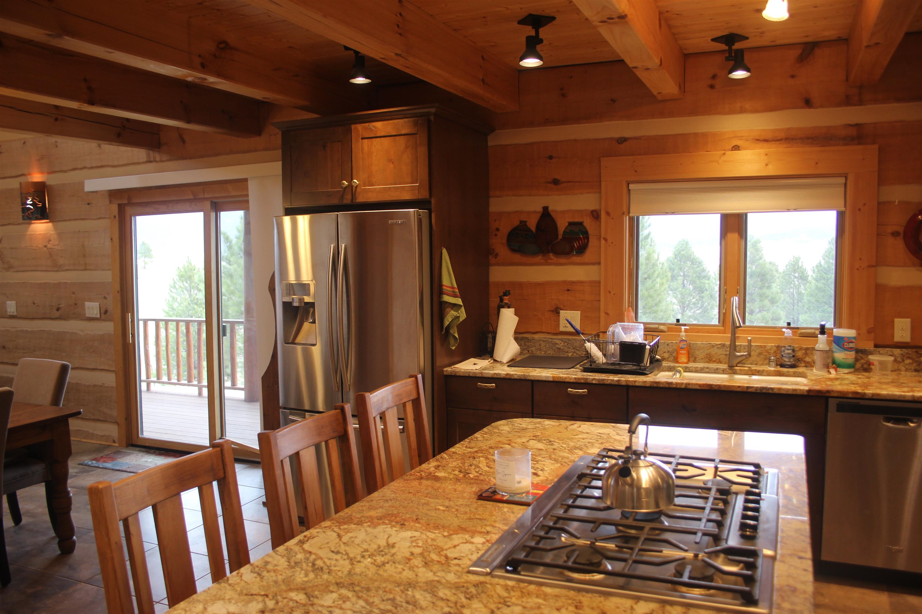 This is truly a private escape that feels miles away from the busy pace of everyday life — yet is conveniently located just a few miles from Angel Fire. Nestled on 2.4 acres, this stunning custom log home blends perfectly with its natural mountain setting and is filled with charming, one-of-a-kind details throughout. As you enter, you’re welcomed by a spacious kitchen featuring beautiful granite countertops, custom drawer and cabinet hardware, exposed beams that add character and warmth, and under-cabinet lighting that creates a cozy glow while cooking. The adjoining living room showcases a breathtaking hand-carved log and branch staircase complete with carved bear details — a true conversation piece. A wood-burning stove adds ambiance and keeps the home warm and inviting on chilly mountain days. Enjoy fantastic views from both the living room and kitchen, bringing the outdoors in at every turn. The main-level master bedroom is generously sized and offers private access to the wraparound deck, creating the perfect retreat. The master bath and upstairs guest bath feature custom tile work that highlights the home’s exceptional craftsmanship. Upstairs, you’ll find a massive bedroom with plenty of space for family and guests, along with a large loft-style living area ideal for games, relaxation, and entertaining. Step outside onto the wraparound deck and take in the breathtaking views — every angle offers pure mountain beauty. The home is being sold fully furnished, making it move-in ready so you can immediately begin enjoying your mountain getaway.