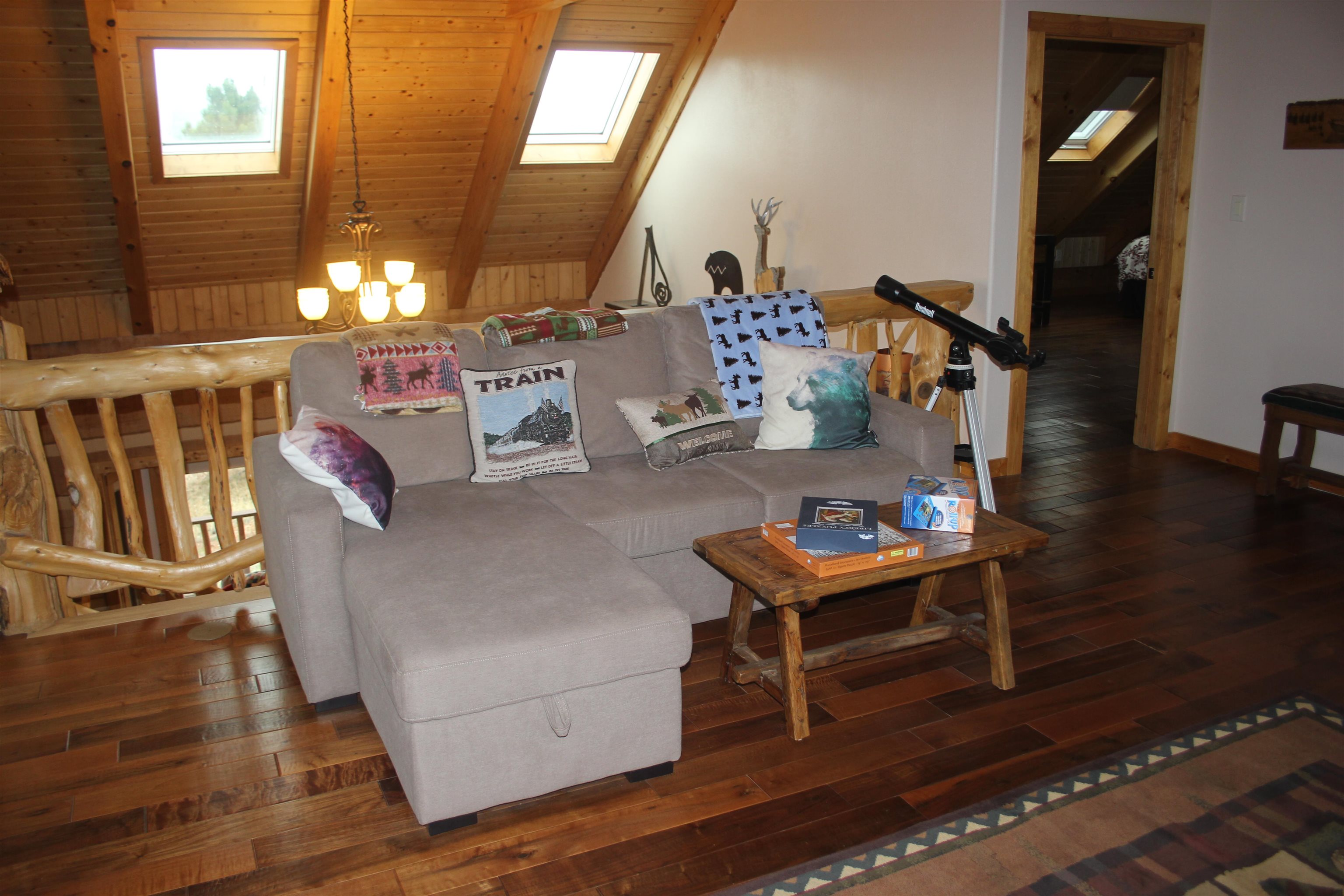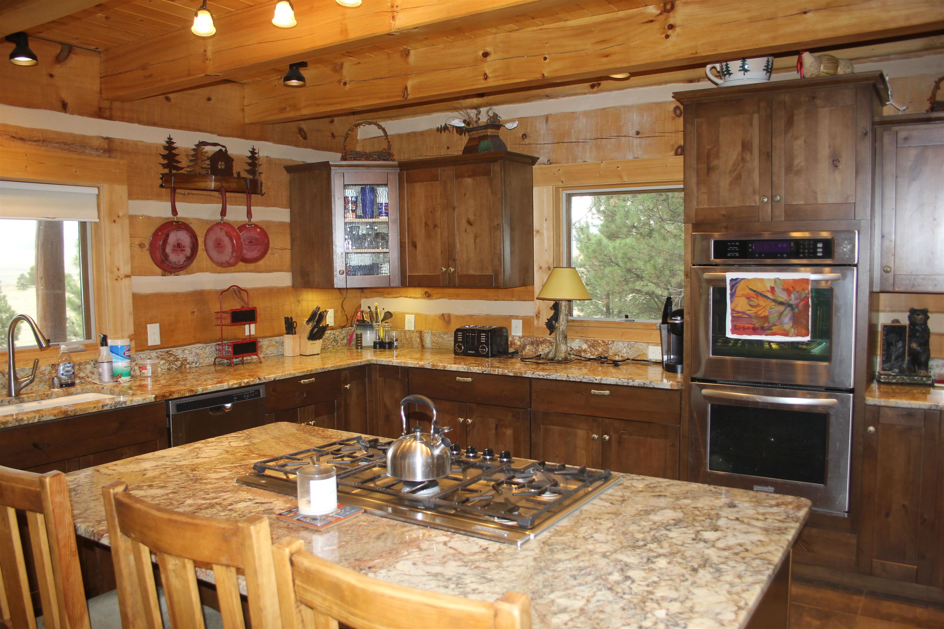 This is truly a private escape that makes you feel like you are miles and miles from the busy life. Secluded and yet just a few miles from Angel Fire. This custom home has so many wonderful details that just make you smile. The Log construction fits the 2.4 acre setting perfectly. You walk in and the kitchen is large and spacious with beautiful granite counter tops and custom drawer and cabinet handles. The exposed beams add a substantial look to the room. Under cabinet lighting adds to the warm glow of cooking. The living room has a stunning hand carved log & branch staircase with carved bear details that are truly one of a kind. The wood burning stove adds nice ambiance and will keep the chills away. There is a fantastic view from the living room and the kitchen. The Master bedroom is downstairs and is very large and comfortable with its very own doors to the wrap around deck. Custom tile work in the master bath and the upper guest bath are testament to the custom details throughout the home. The upstairs bedroom is huge with lots of room for guests and family with a large living area upstairs for games and fun. The views from the wrap around deck are pure eye candy, just pick a view you want to enjoy and relax! The home will come with all furnishings and ready to move in and make it your own.
