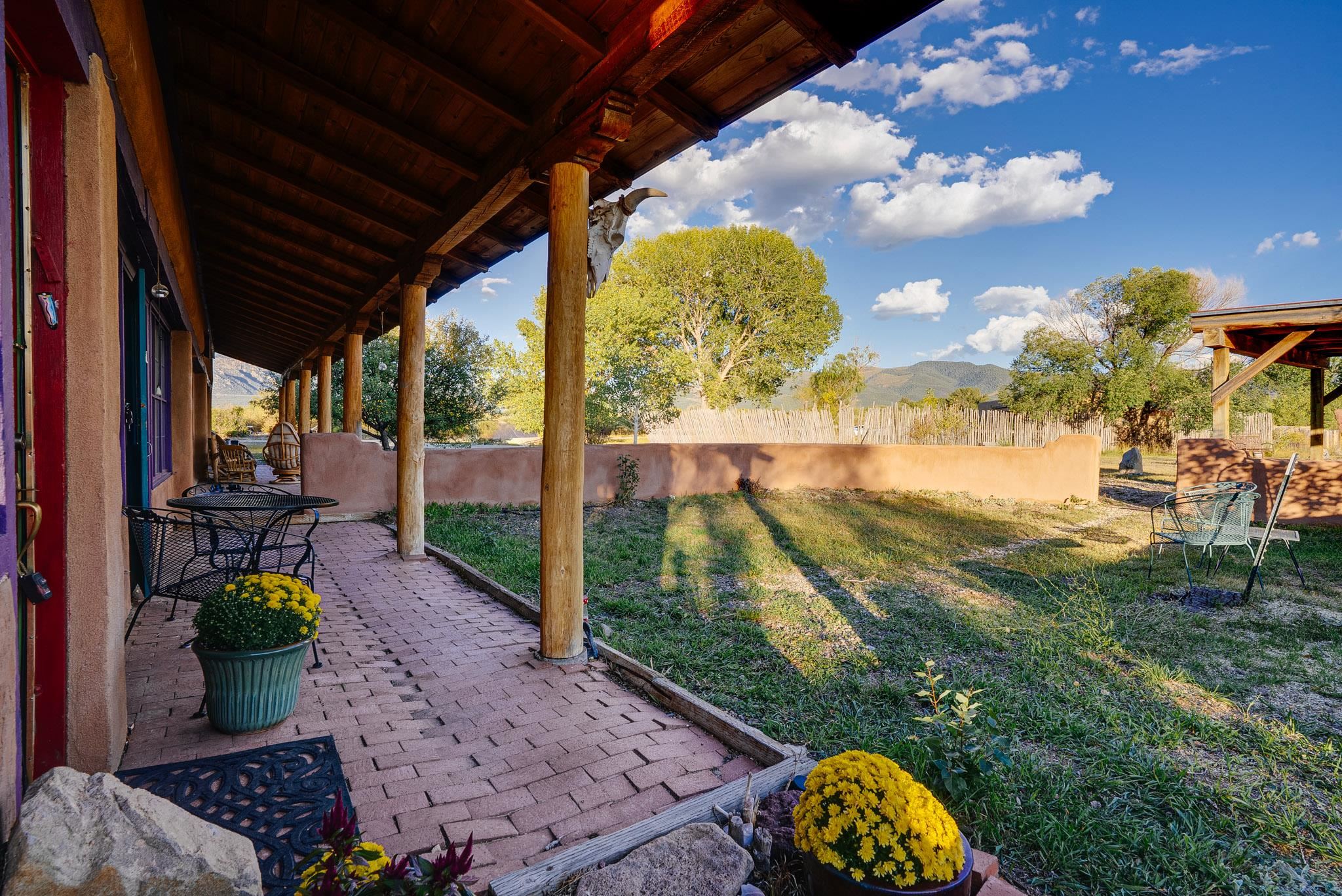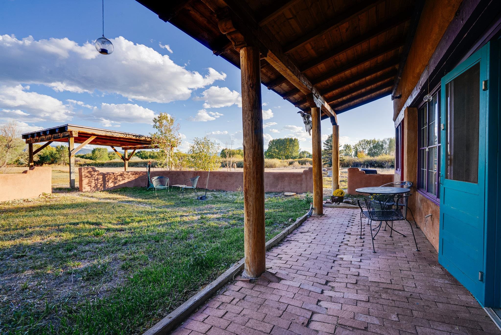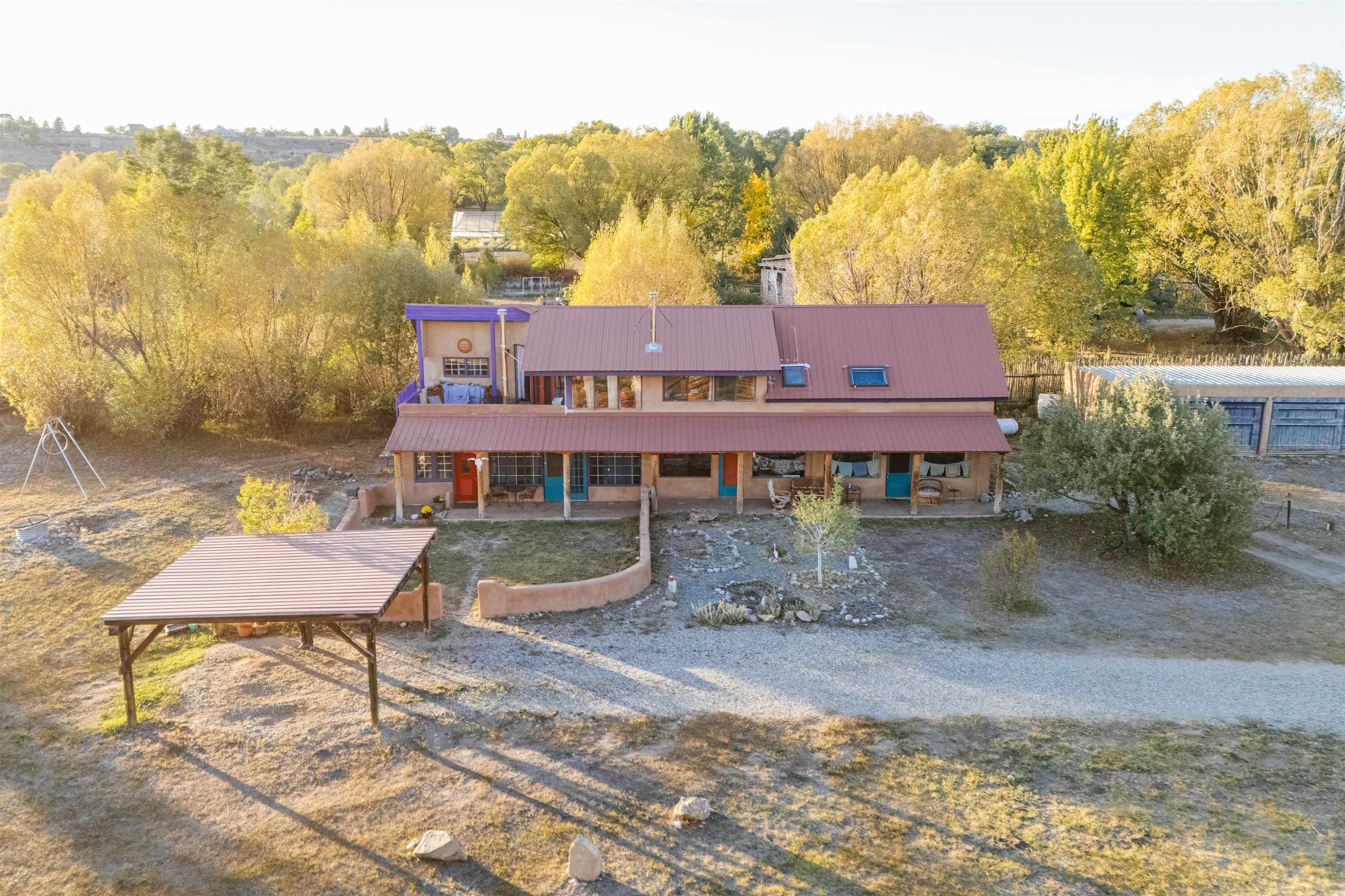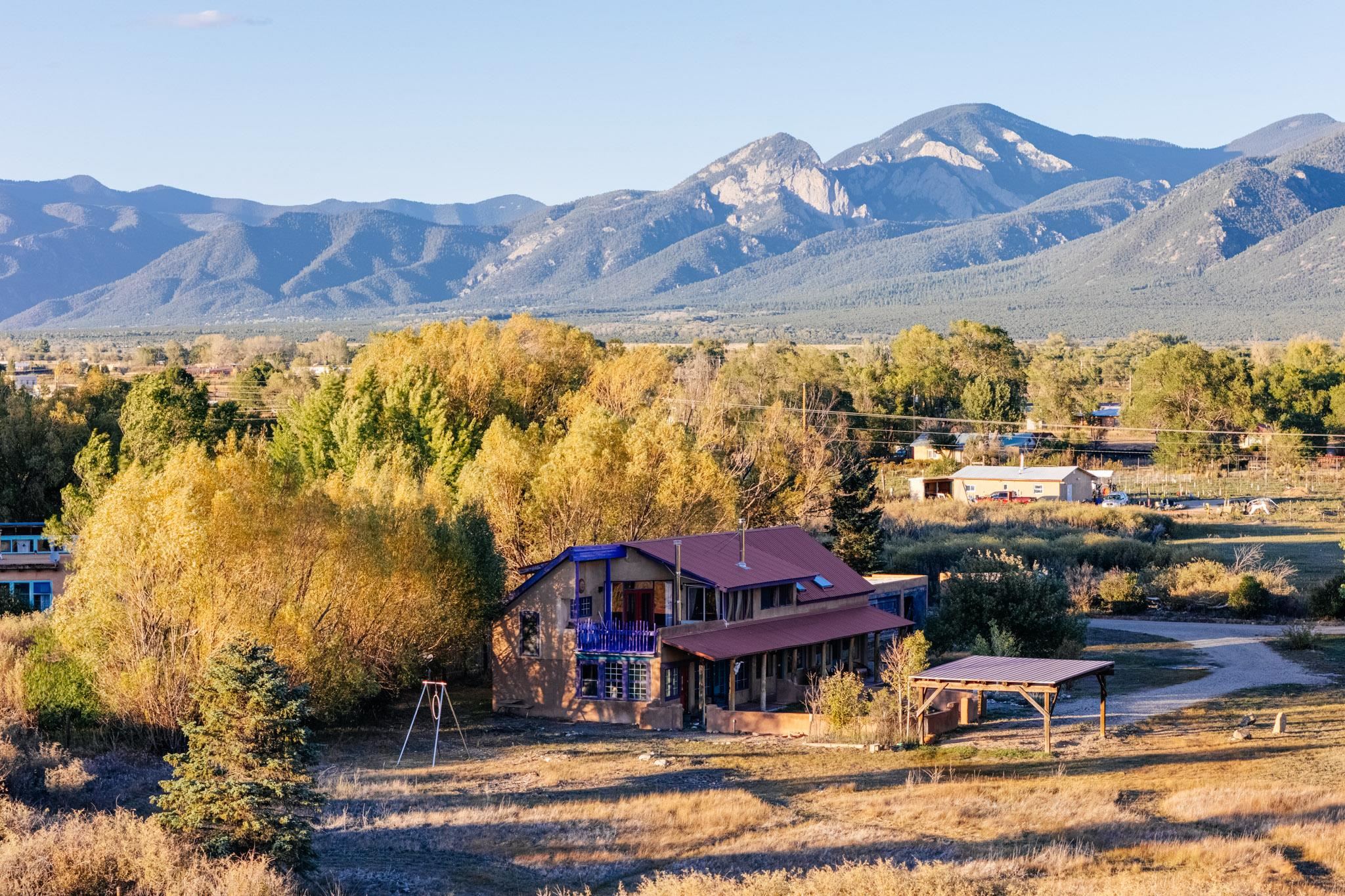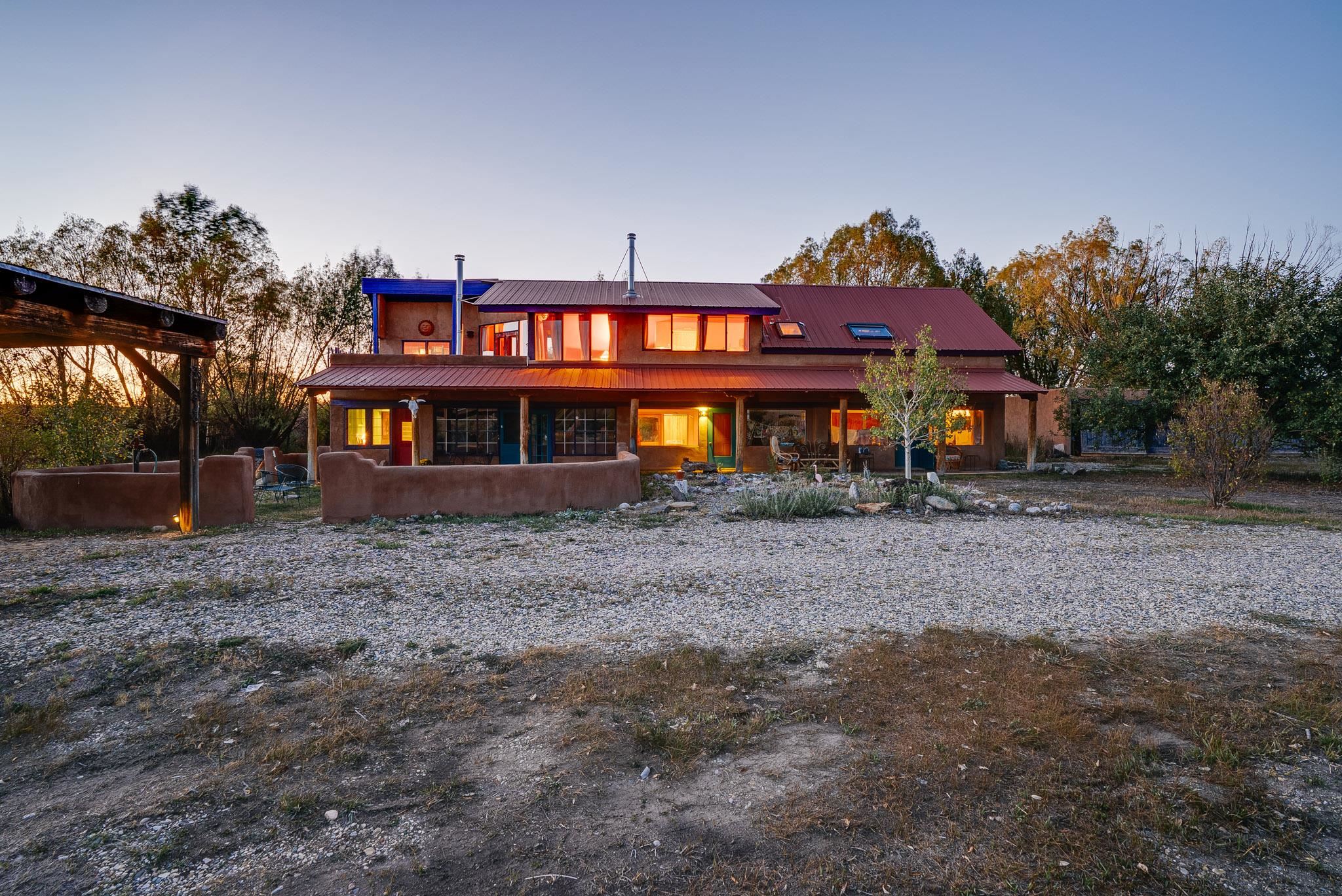 Drenched in vibrant color and situated on two acres of irrigated land in an enormously desirable location, this property, with wonderful views of both Taos Mountain and the Sangre de Cristos, invites you to bring along your imagination because 1016 La Cienega has a lot to offer its next owner. Four bedrooms/3 baths, a 4 car garage/studio space, storage, mini split, carport and more! La Cienega is one of those roads that is close to town and yet feels like it's a world away. This is a neighborhood in the true sense of the word. People watch out for one another here and yet it is quiet, private and rural with Pueblo Land on two sides. The main living space is a celebration of festive color that echos the artistic spirit of Taos. An open living room and kitchen feature vividly colored tile and very high ceilings- feeling warm and alive. In the main space there are two bedrooms and one full bath and there is also a double door that connects to an additional bedroom and bathroom on the ground level. This design offers perfect flow for entertaining- leading out to a fabulous deck to watch sunset. Then, there is an adorable one bedroom/one bath space. With convenient interior and exterior doors throughout, there are many opportunities for flex use for these spaces. Another door leads to a laundry room that could also be an office/studio/gym/yoga. In addition to all these interesting living spaces, there is a 4 car garage with electricity, additional storage area and a shed. Bring your vision, artistry and originality to this wonderful property. Call today for your private showing.