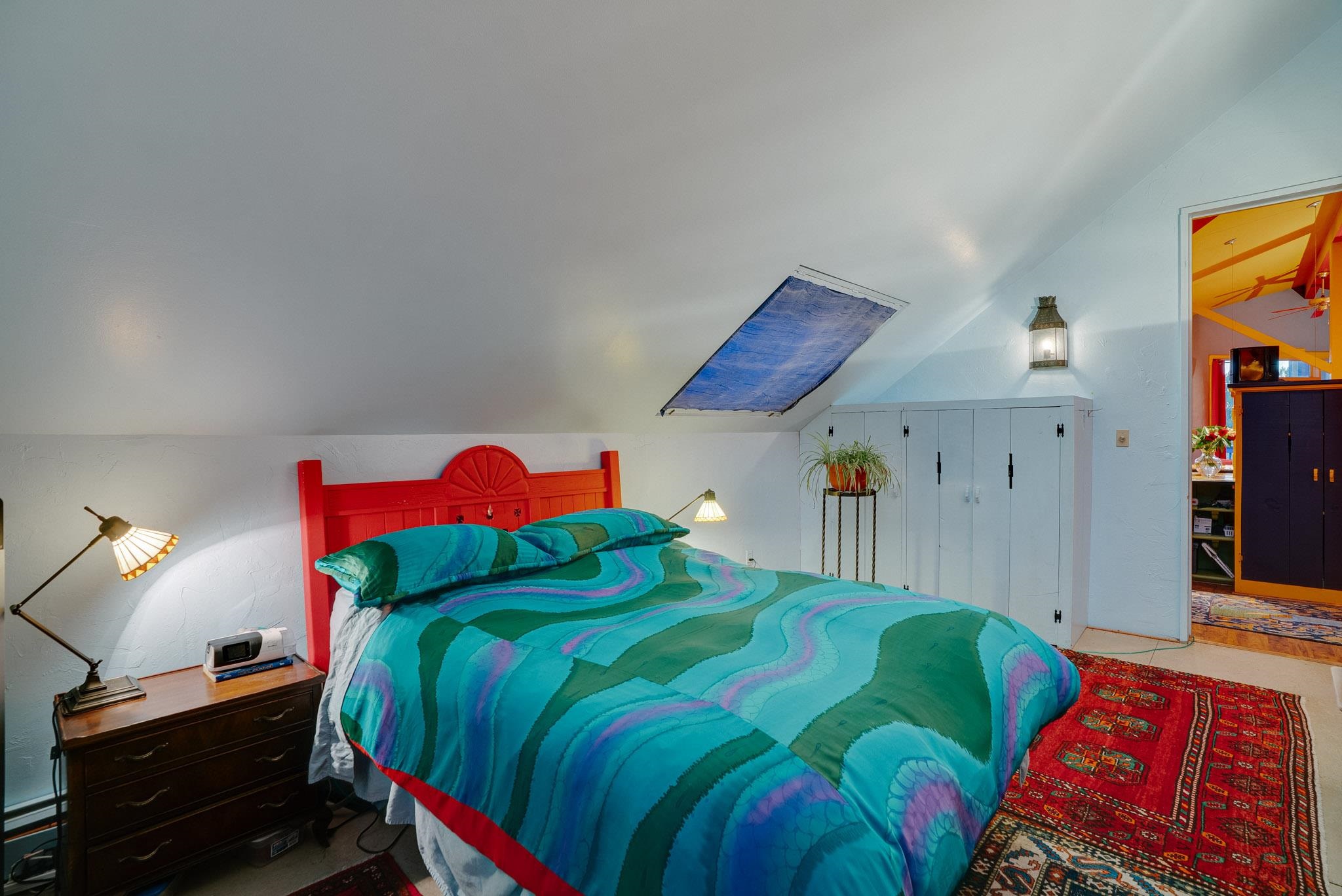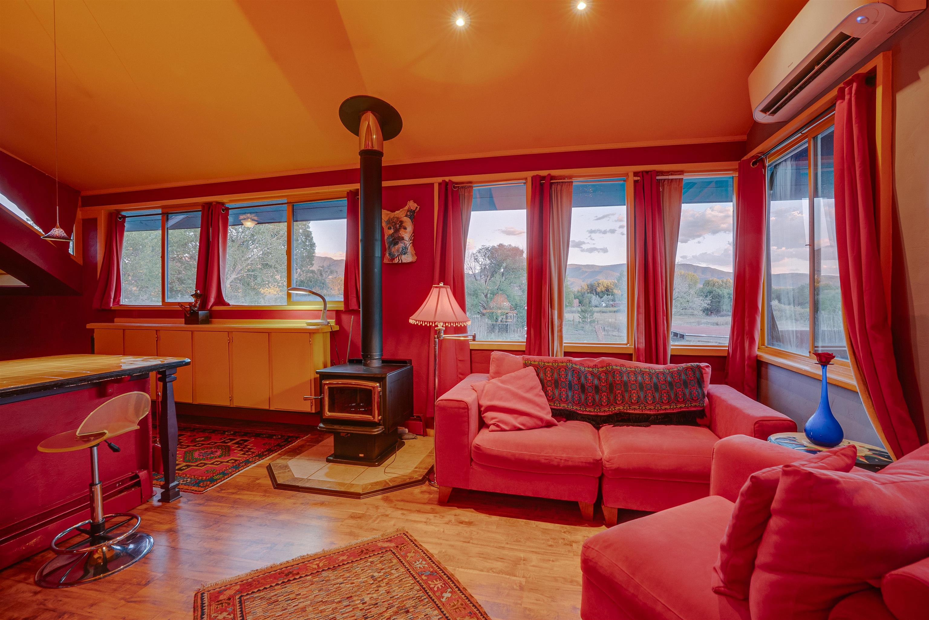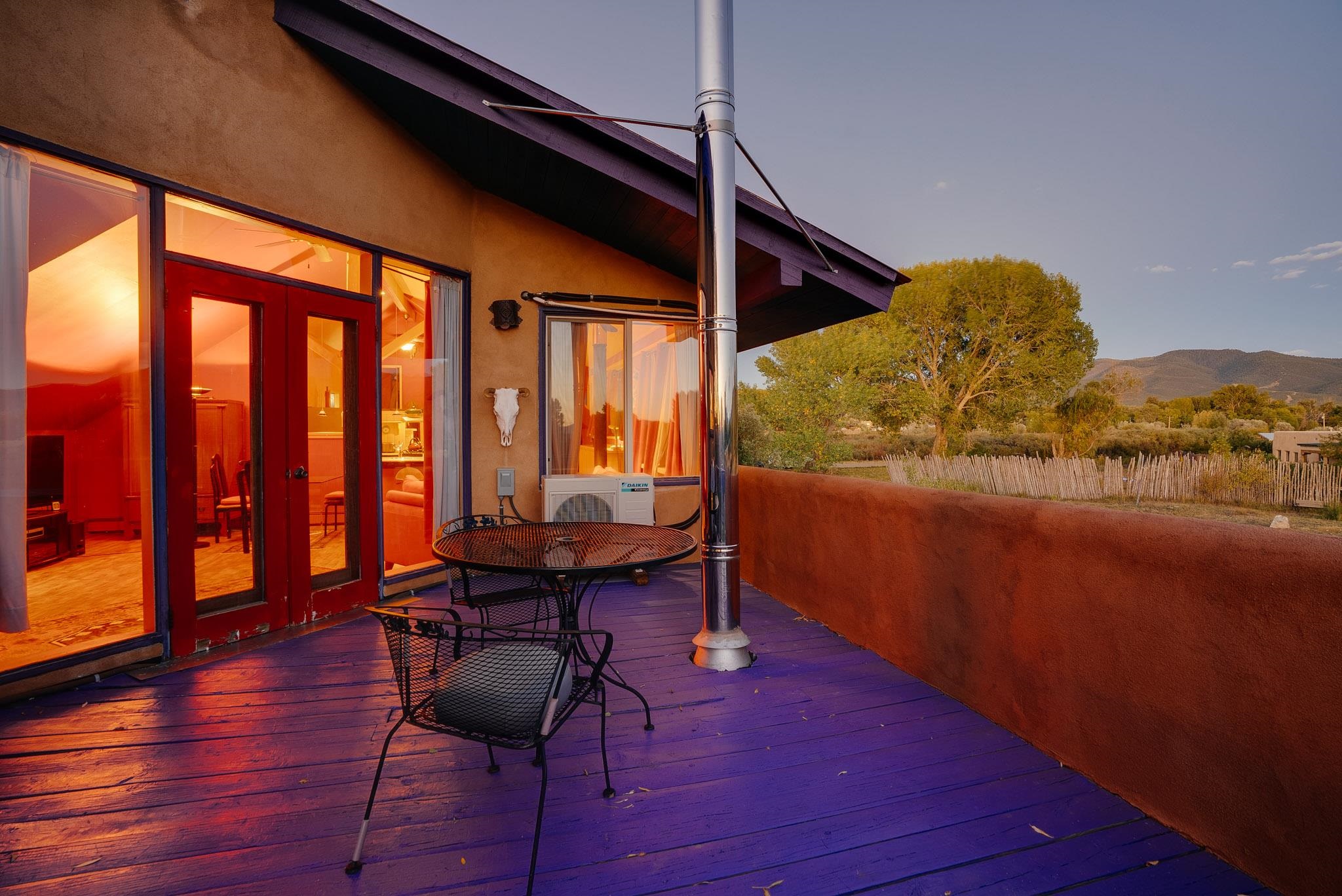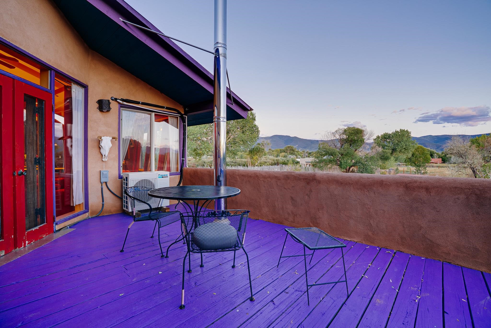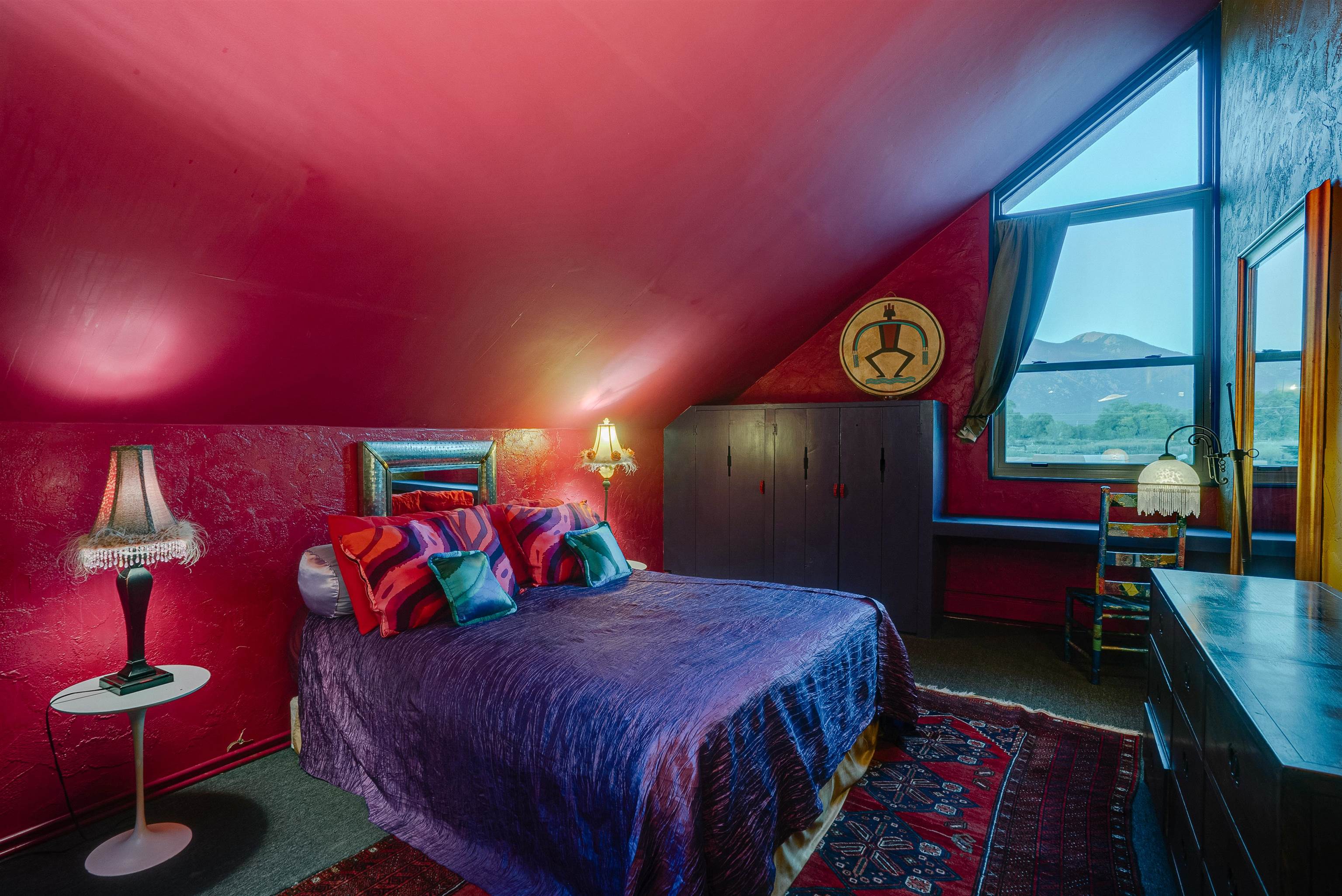 Drenched in vibrant color and situated on two acres of irrigated land in an enormously desirable location, this property, with wonderful views of both Taos Mountain and the Sangre de Cristos, invites you to bring along your imagination because 1016 La Cienega has a lot to offer its next owner. Four bedrooms/3 baths, a 4 car garage/studio space, storage, mini split, carport and more! La Cienega is one of those roads that is close to town and yet feels like it's a world away. This is a neighborhood in the true sense of the word. People watch out for one another here and yet it is quiet, private and rural with Pueblo Land on two sides. The main living space is a celebration of festive color that echos the artistic spirit of Taos. An open living room and kitchen feature vividly colored tile and very high ceilings- feeling warm and alive. In the main space there are two bedrooms and one full bath and there is also a double door that connects to an additional bedroom and bathroom on the ground level. This design offers perfect flow for entertaining- leading out to a fabulous deck to watch sunset. Then, there is an adorable one bedroom/one bath space. With convenient interior and exterior doors throughout, there are many opportunities for flex use for these spaces. Another door leads to a laundry room that could also be an office/studio/gym/yoga. In addition to all these interesting living spaces, there is a 4 car garage with electricity, additional storage area and a shed. Bring your vision, artistry and originality to this wonderful property. Call today for your private showing.