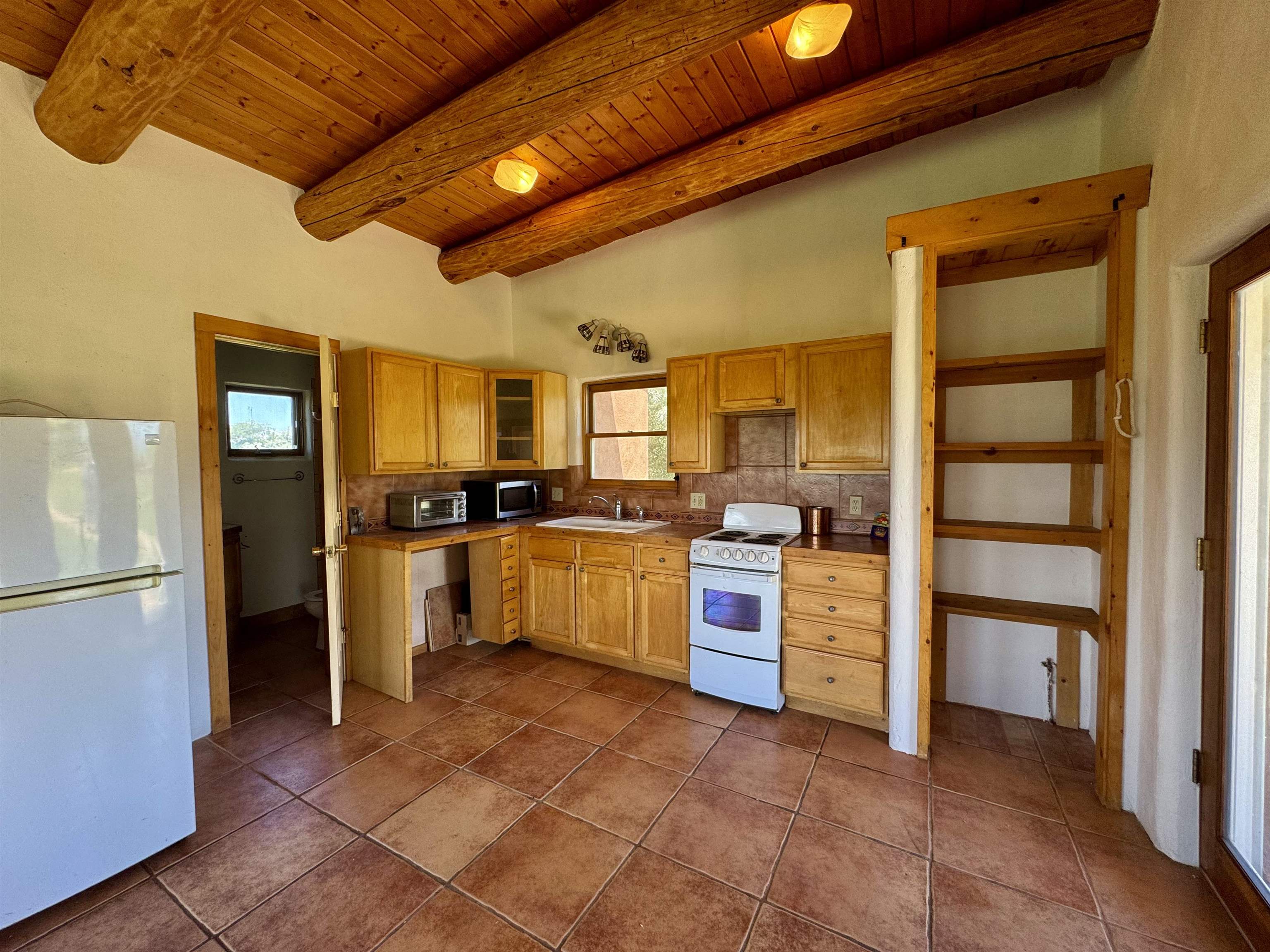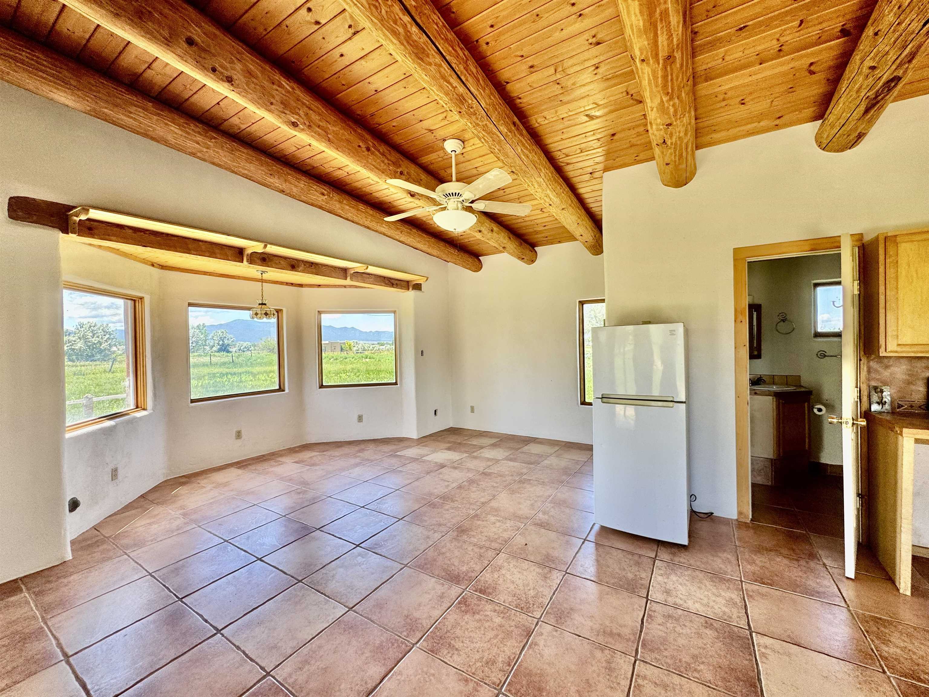 Lush Living in the Heart of the Ranchitos Valley: Welcome to your own private oasis just five minutes from Taos Plaza. Nestled on a full acre of verdant valley land, this charming casita offers a rare blend of serenity, beauty, and convenience with breathtaking views of Taos Mountain as your daily backdrop. This 522 square foot home is full of Southwestern character, featuring classic vigas, tongue and groove ceilings, and radiant in floor heating for cozy winter comfort. A bonus sunroom, filled with natural light, offers a peaceful space for reading, creativity, or relaxation. Recent upgrades include fresh interior paint, newly stained woodwork, and a complete exterior re-stucco ensuring the home feels fresh, solid, and well cared for. The property is served by a private well, and a seasonal acequia flows through part of the land, adding to the rural charm. Mature shade trees surround the property, creating a lush and shaded outdoor sanctuary. At the edge of the property, a rustic wood gazebo offers potential as a studio, meditation space, or outdoor entertaining area. Whether you're looking for a personal retreat, a full time residence, or an income generating investment, this casita has endless potential. The current owner has successfully rented the home to long term tenants, making it a smart and flexible option for a variety of lifestyles. Let the peaceful rhythm of the Ranchitos Valley and the inspiring natural landscape welcome you home.