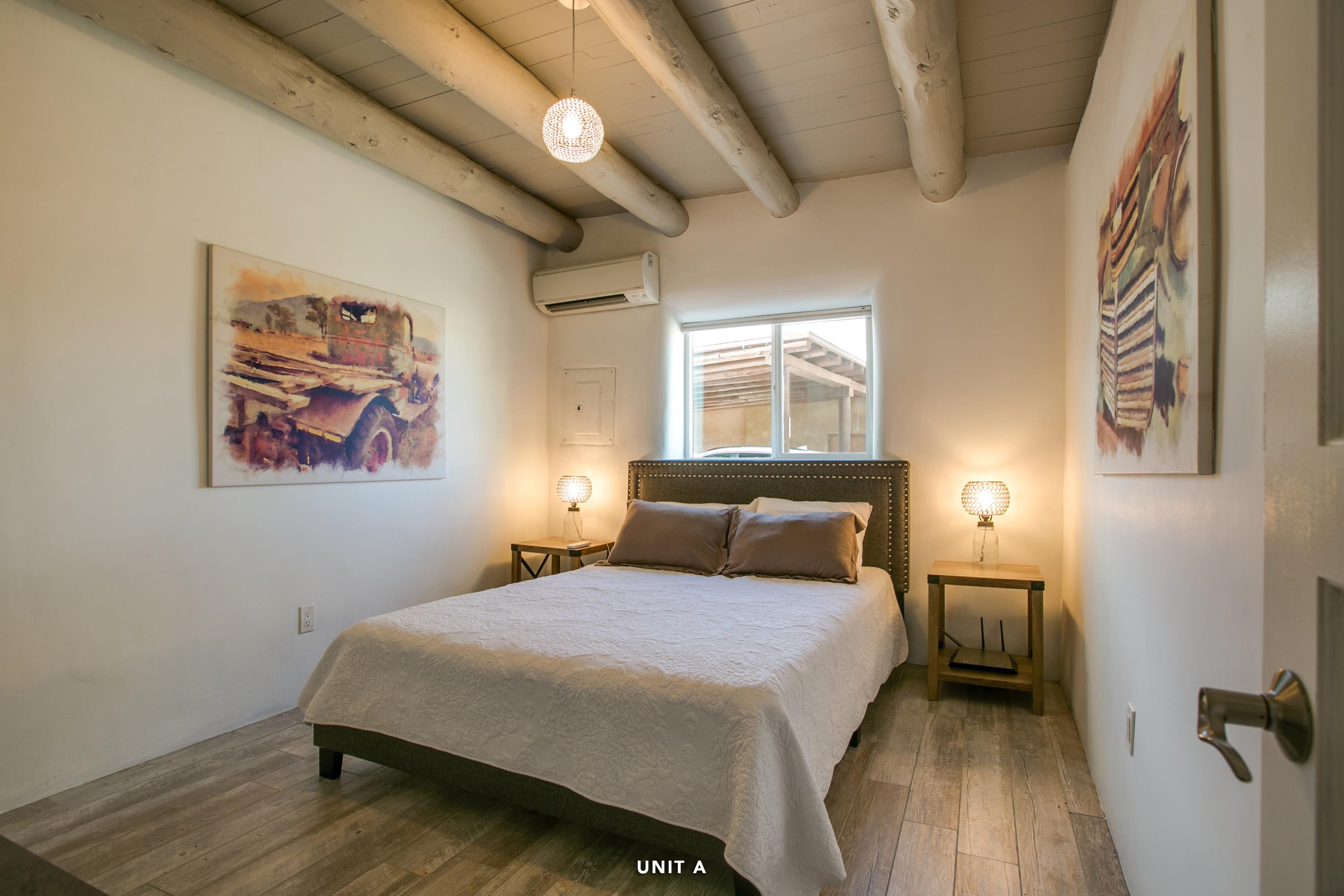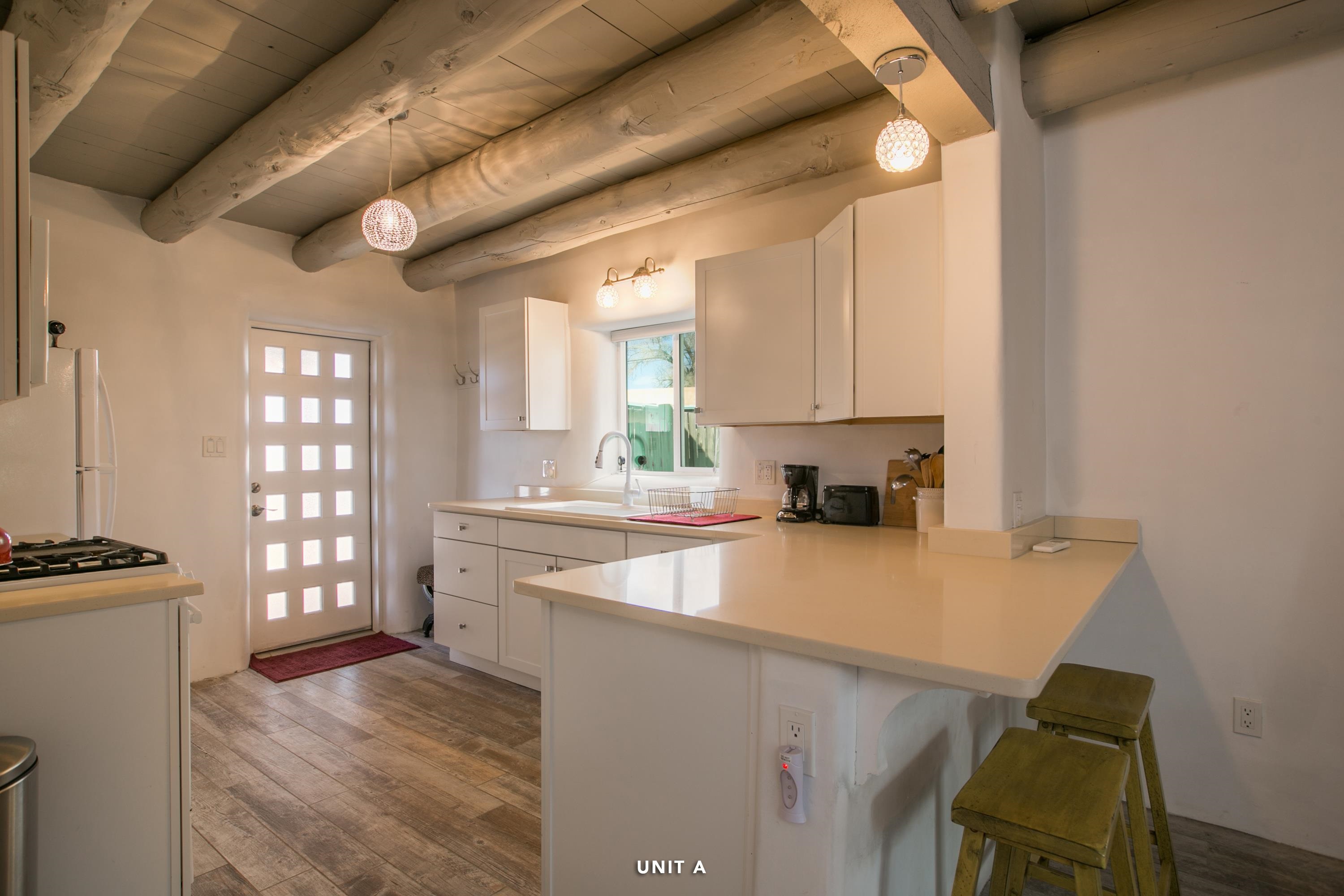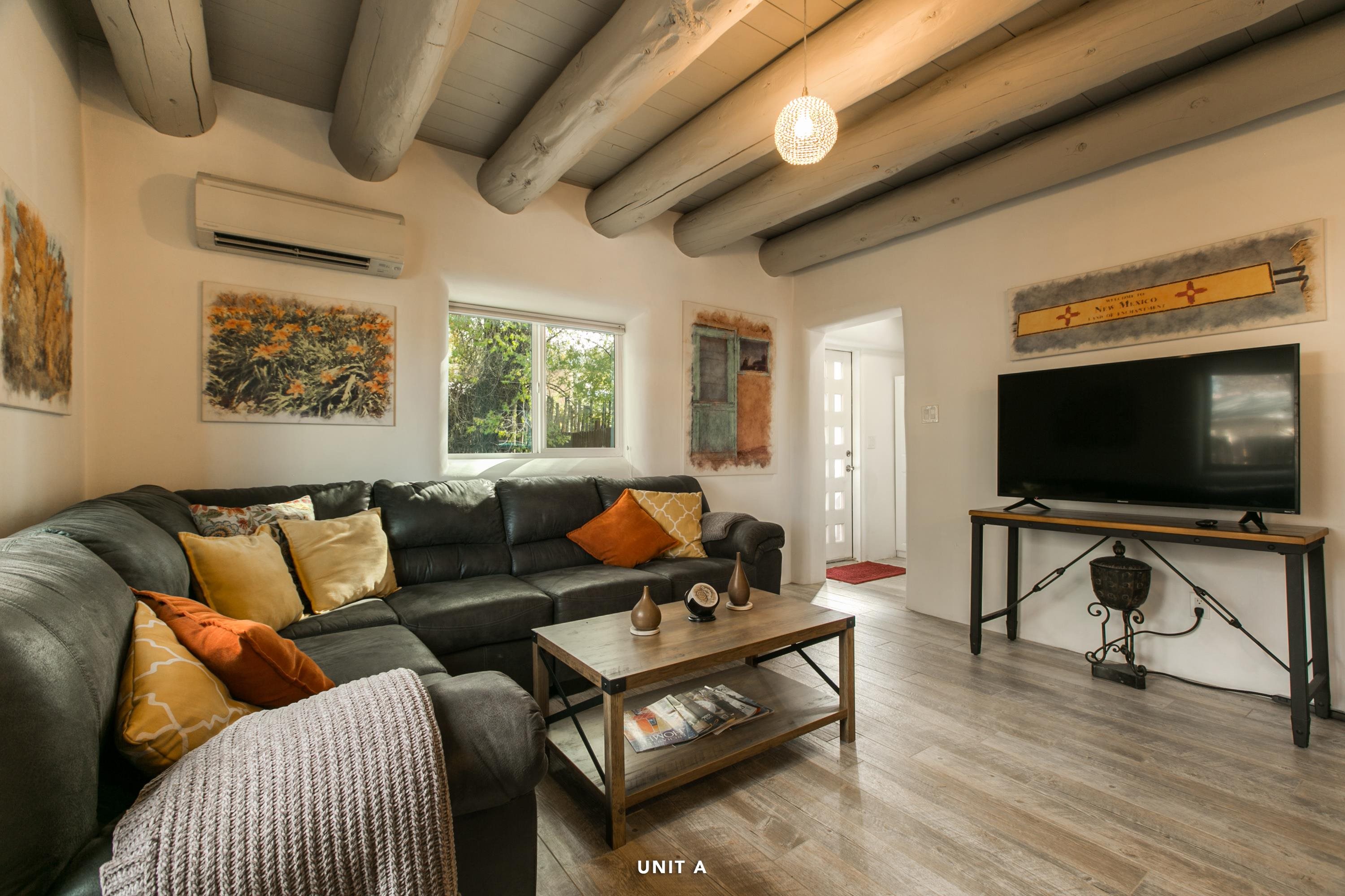 In-town, fully remodeled, fully furnished adobe duplex. Just a few short blocks from Kit Carson Park, Taos Plaza and the many galleries and restaurants that Taos is known for. This duplex has two separate 1 bedroom/1bath units, both with their own washer/dryer, and mini split units to keep you cool in the summer and warm in the winter. Live in one and rent out the other. The two units are on separate meters. Town water, town sewer, natural gas and fiber optic. Enjoy lounging and cooking out in the separately fenced-in yards for both units. Dedicated car port provides parking for each unit. Recent total remodel includes kitchen cabinets, counters, appliances, new roof, stucco, windows, doors, flooring, and updated electric and plumbing. Don't miss this great opportunity!