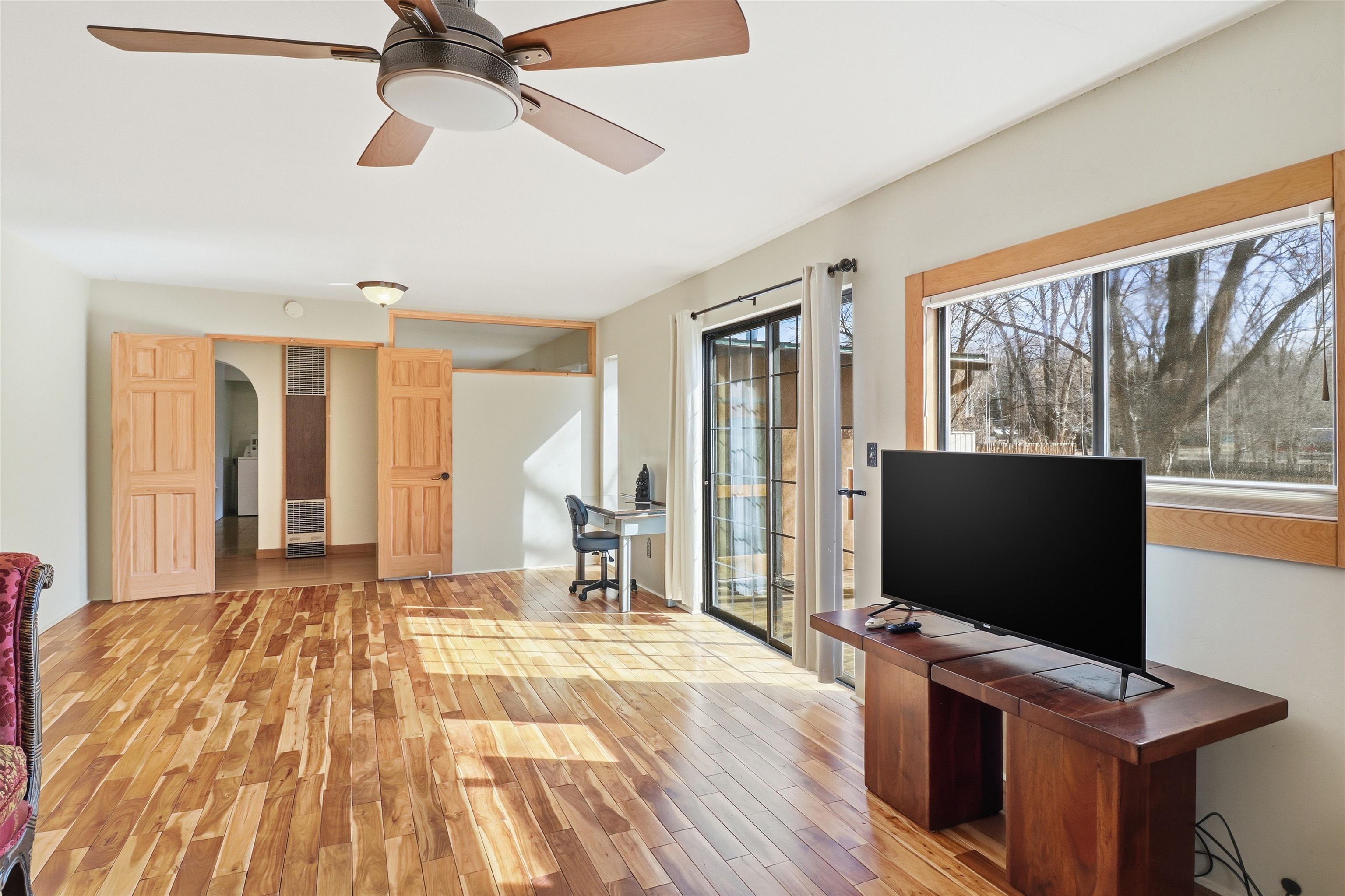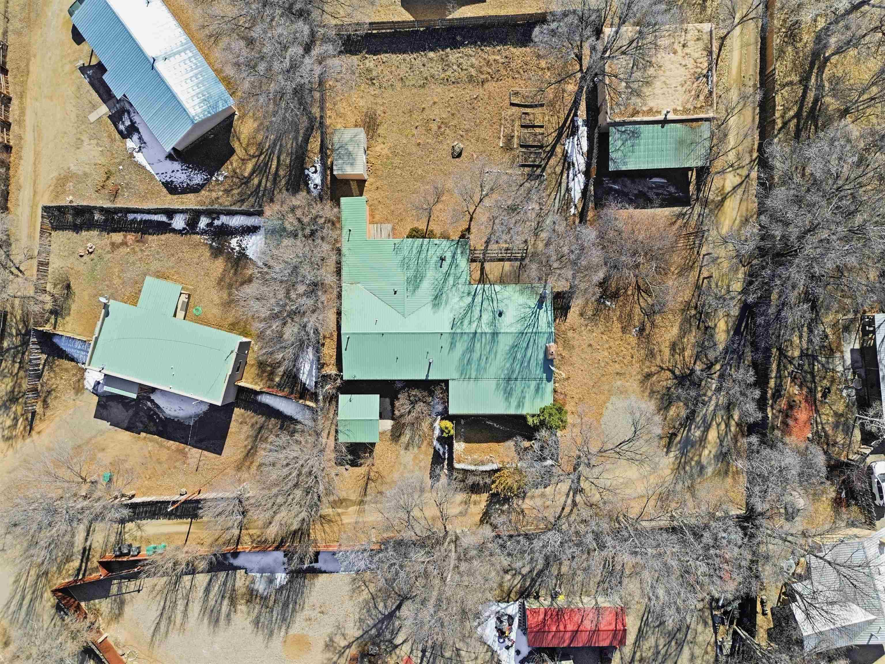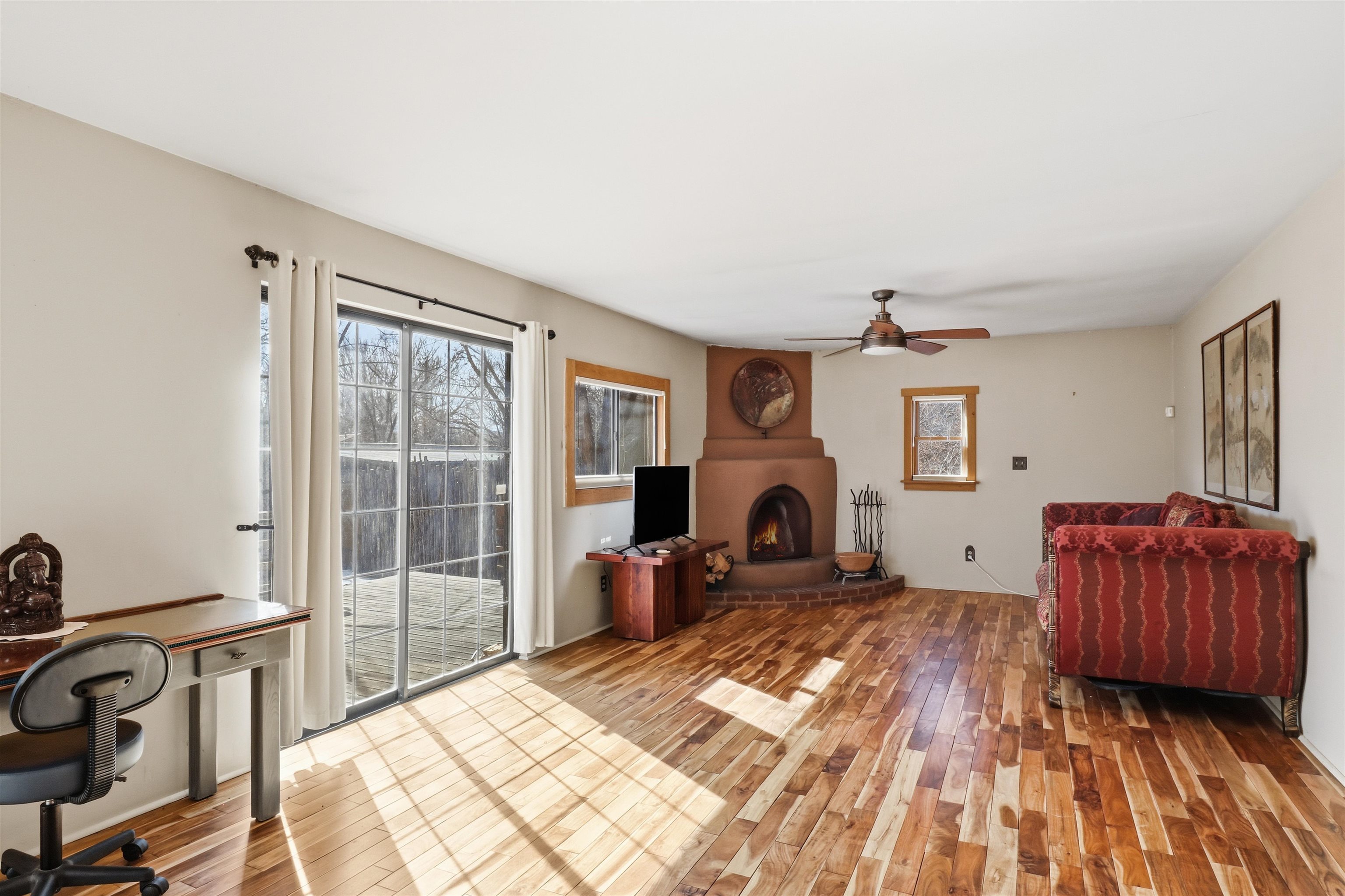 This charming DUPLEX at 104 Guthrie Lane #A & B, Taos, NM 87571 offers an exceptional opportunity for comfortable living with strong income-producing potential in a prime location just minutes from the center of Taos. The main house (#B) features a spacious eat-in kitchen with a separate pantry, lovely tile countertops, and serene garden views. The primary bedroom features cork flooring and an ensuite bathroom with beautiful tile accents. A second bedroom provides easy backyard access via a sliding glass door, a generous closet, and shares a full hall bath. The expansive living room showcases gorgeous wood floors and a cozy kiva fireplace, opening directly onto a large back deck perfect for relaxing or entertaining. An additional flexible living/multi-purpose room includes the washer/dryer and abundant space for a home office or studio. The attached guest house (#A) has proven itself as a reliable rental unit for years, delivering steady income. It features beautiful natural light, tile flooring, a fireplace, 2 bedrooms, a delightful 4-season sunroom, a fenced private courtyard, and its own storage shed—ideal for guests, long-term tenants, or vacation rentals. Outside, enjoy a large, fully fenced backyard—a gardener's dream with ample space for planting, outdoor activities, or pets. A large detached oversized 2-car garage provides plenty of room for vehicles, workshops, projects, or extra storage. Sited on a generous corner lot (approximately half a acre) in a peaceful cul-de-sac, this property offers tranquility while being conveniently close to Taos' shops, restaurants, galleries, and cultural attractions. Whether you're seeking a primary residence with guest/income suite, a multi-generational setup, or an investment property with built-in rental history, this property has it covered. Don't miss this rare combination of space, charm, and location!