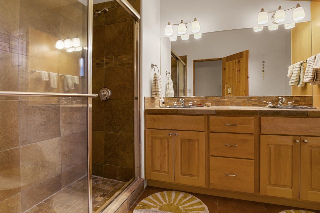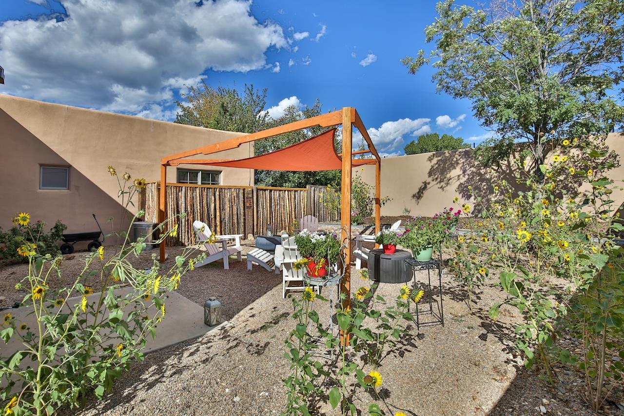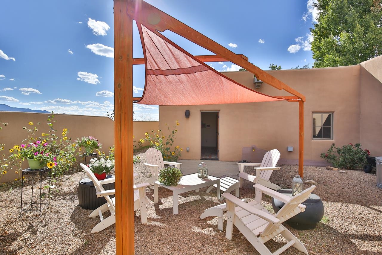 This 3 bed 2 bath ~1300 sq ft light and bright condo comes with a spacious and secluded private back yard. Stained concrete floors, T&G pine ceilings with vigas , and festive talavera style tiles add character while the big windows in very direction bring in lots of light and views that include sunsets over El Pedernal. Conveniently located off the Canon bypass - you can quickly get to Angel Fire, or to Espanola, and points south. The active well-kept community garden and green space are a joy to return to when you come home. Find home in the friendly community of Suenos del Canon. This rare 3 bed condo is one of the larger ones in the project and being on located at the southern edge - affords both privacy and views like non other.