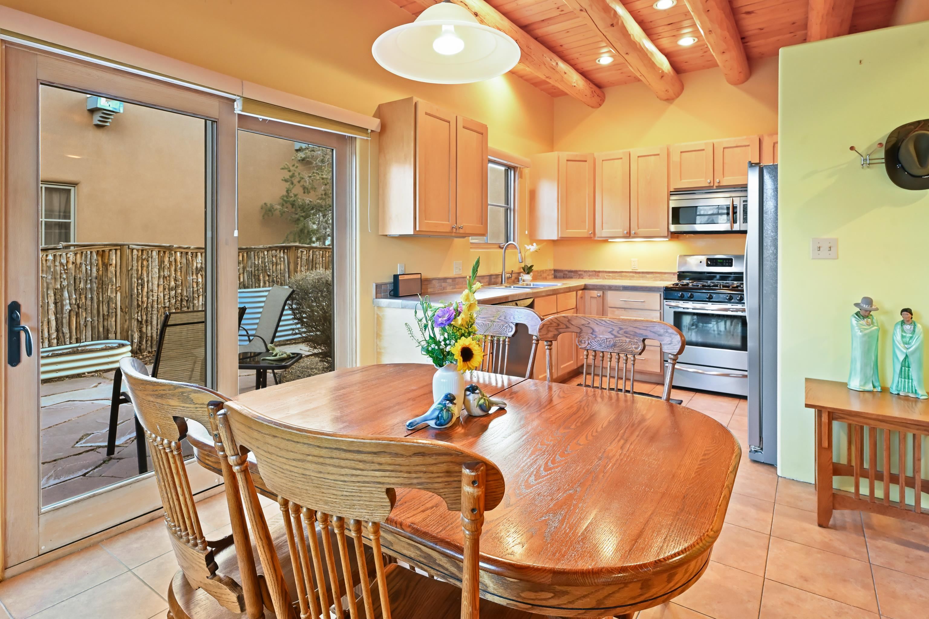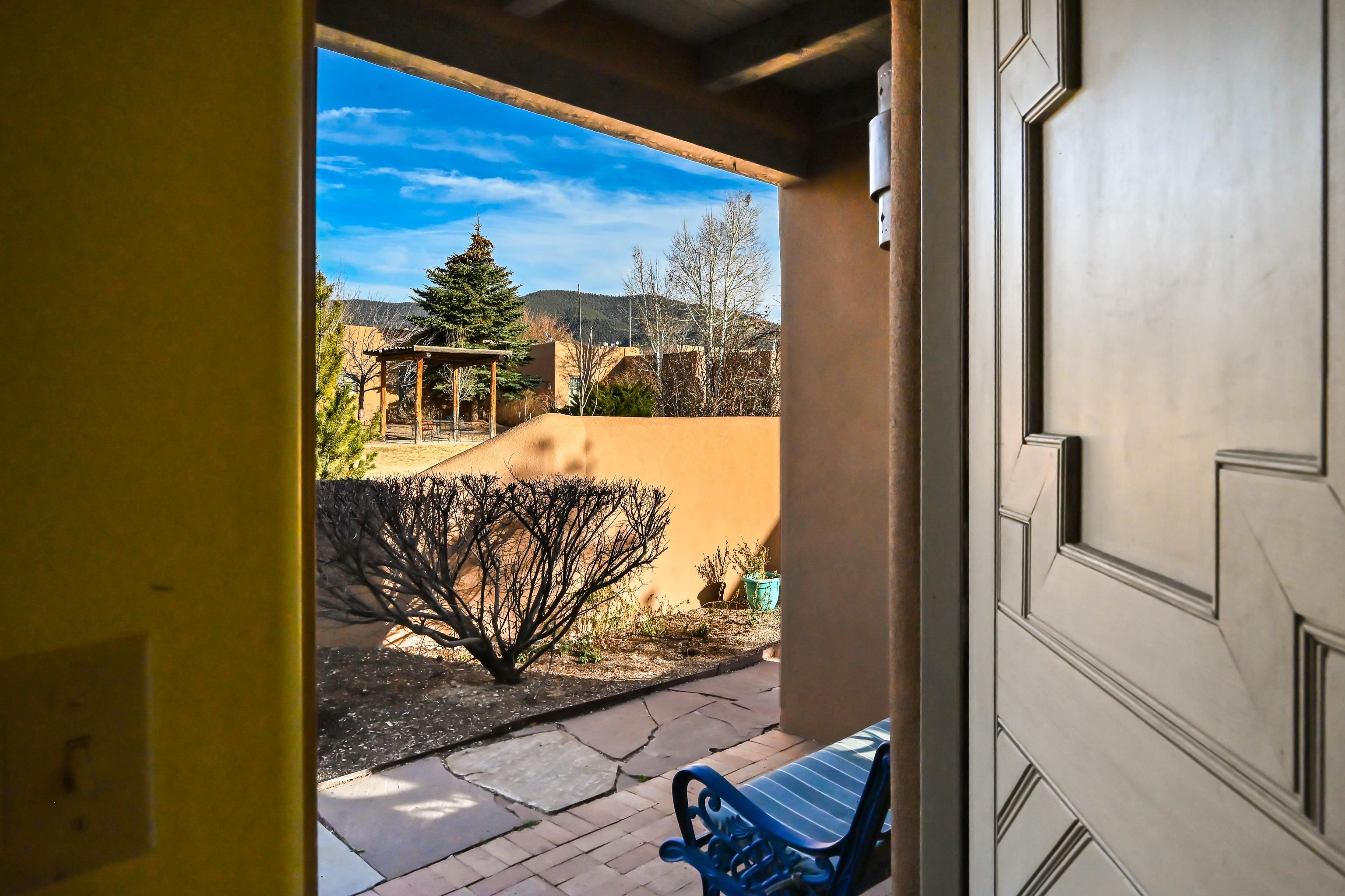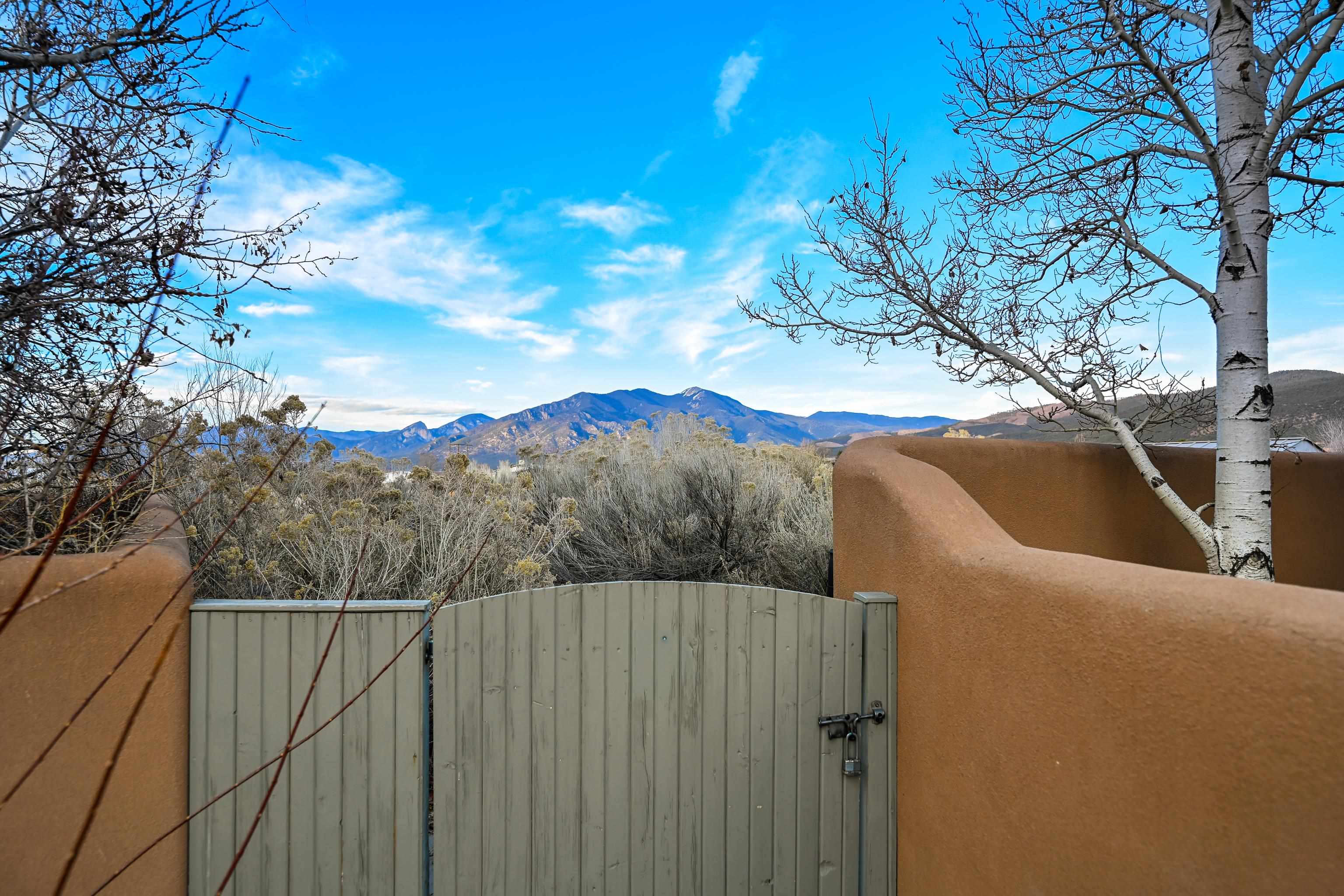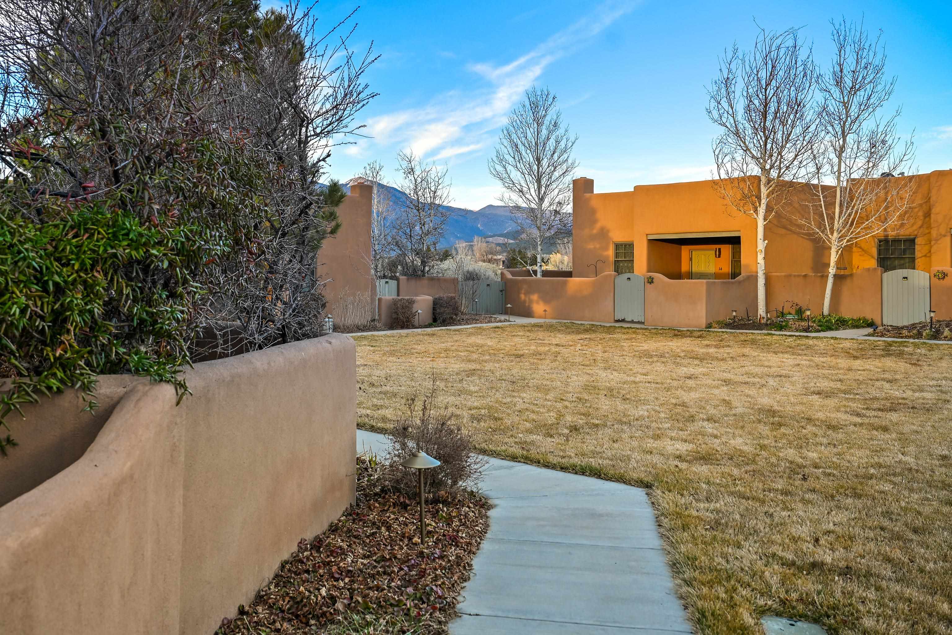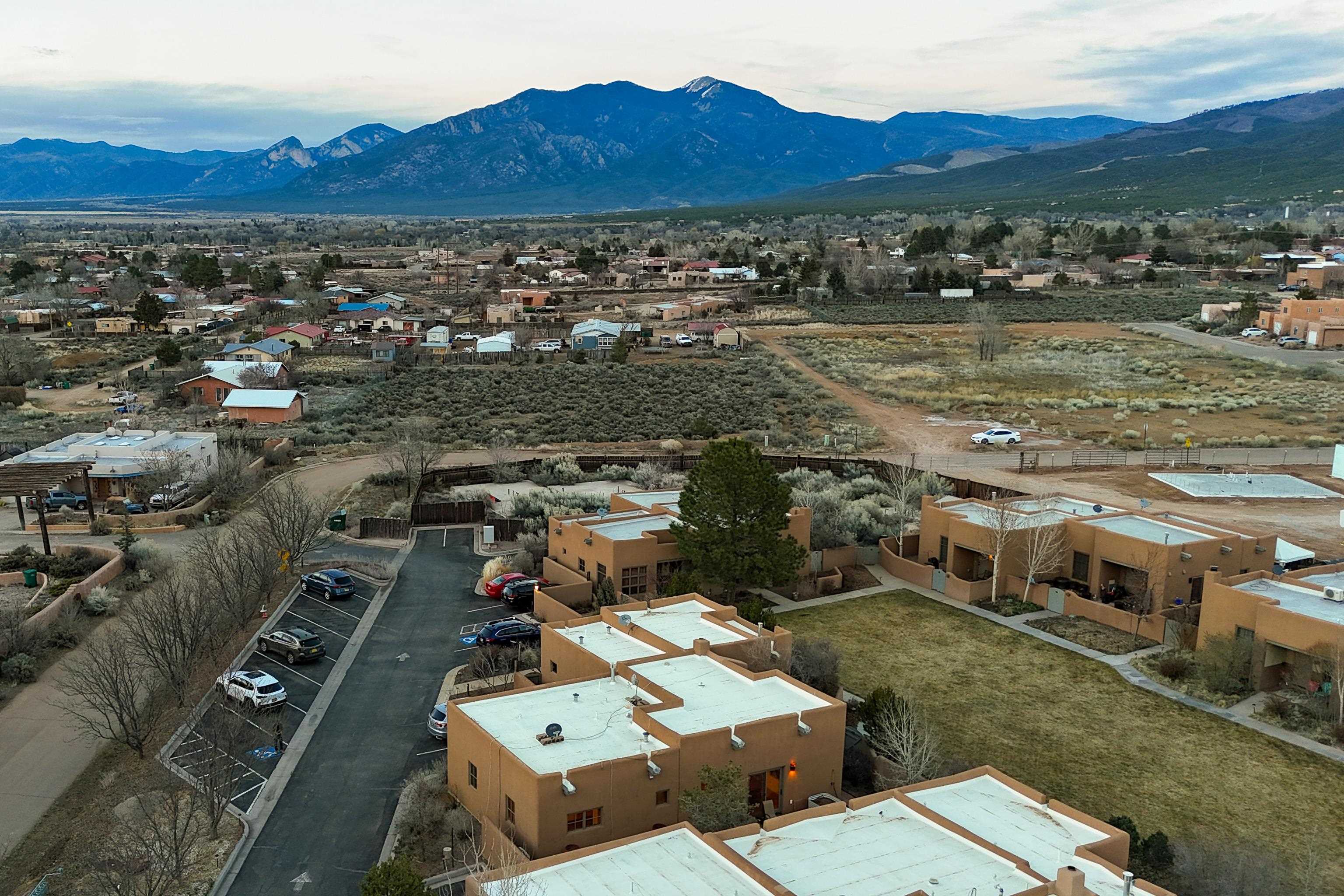 This immaculate 2-bedroom, 2-bath condominium is set in a peaceful Taos community just minutes from the Plaza, hospital, and nearby hiking trails. Filled with natural light and thoughtfully maintained, the home features classic Southwestern character with vigas overhead and a welcoming kiva fireplace in the living room. The spacious kitchen includes a breakfast nook and a sliding door that opens directly to the patio, while the well-designed floor plan creates an easy flow between living spaces, making the home feel both open and inviting. A south-facing patio garden with multiple raised planters and drip irrigation creates a sunny, private garden setting for outdoor living and gardening. The lush community grounds include open green space with clear north-facing views of Taos Mountain. Radiant floor heating keeps the home comfortable through the winter months. The community is arranged around a generous shared green space with seating areas and raised garden beds available to residents. The low monthly HOA fee covers water, sewer, trash, snow removal, landscaping, exterior maintenance, and reserve funding, making ownership simple and low-maintenance. Paved parking is available for residents and guests. The Taos Youth & Family Center is located next door, offering a variety of community recreation programs and facilities. The hospital is approximately one mile away, and the location provides easy access to the historic Plaza, the south side of town, and nearby outdoor recreation. Whether you are seeking a full-time residence or a low-maintenance Taos retreat, this beautifully maintained condo combines classic Southwestern character with a sunny garden patio and a peaceful community setting.