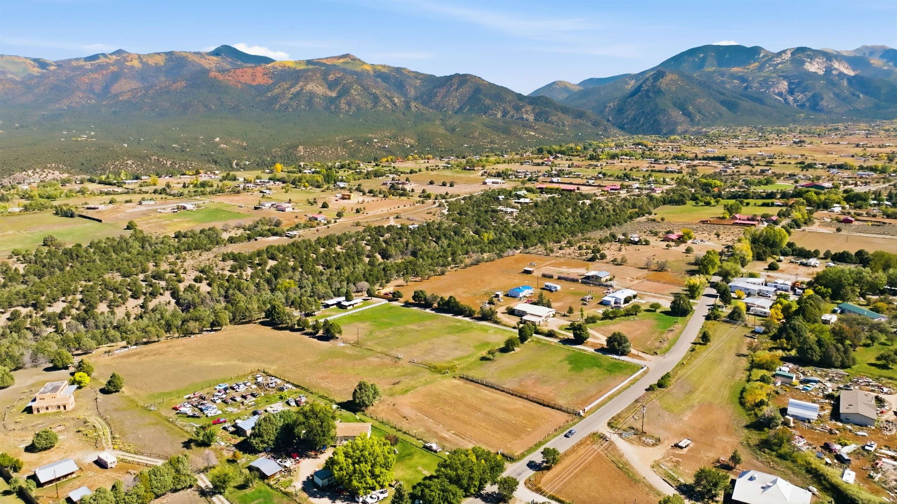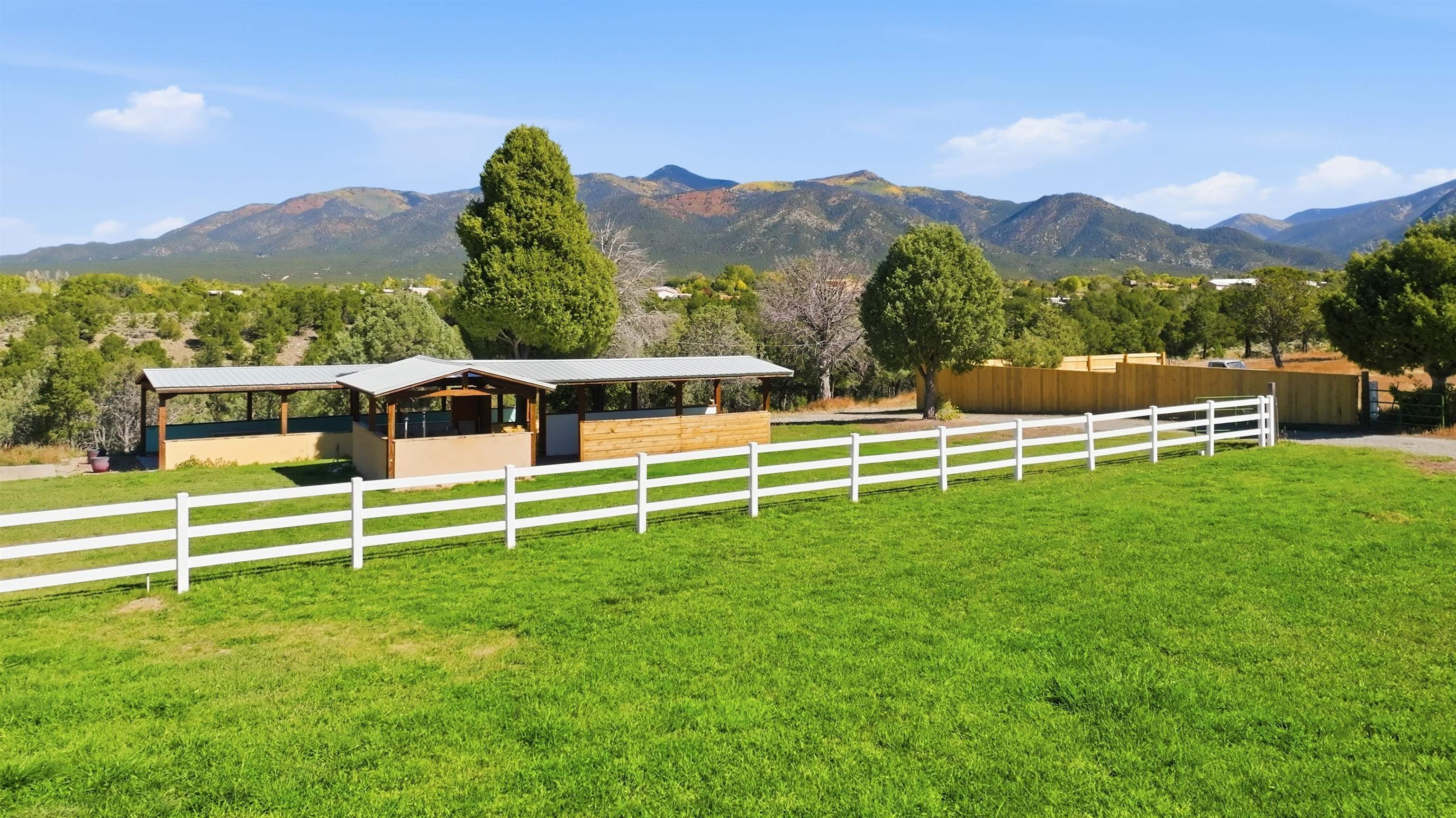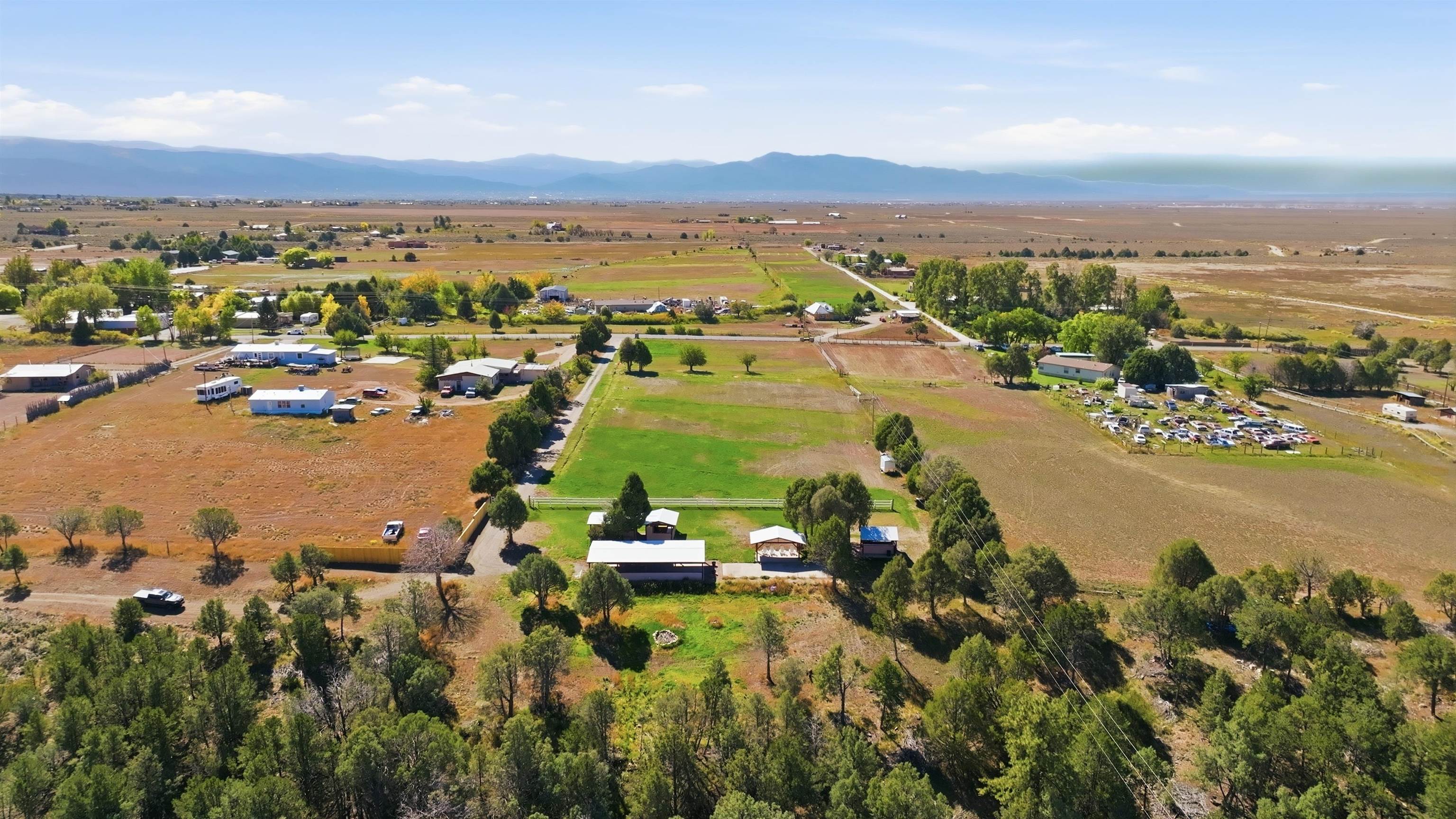 Magic Exists at Los Pino’s Park in Northern New Mexico ~ If you're from Northern New Mexico, you likely know ALL about this remarkable, and truly one-of-a-kind property. If you don't know about the magic of Los Pino's, you certainly will when you lay first eyes and step foot on the Land. Nestled in the shadow of Taos Mountains in Northern New Mexico near Taos Ski Valley, minutes from iconic Downtown Taos, near the Rio Grande river, you will discover this lush irrigated 9.4 acre parcel with a Water Well, acequia Surface Water Rights, a run-off pond, and an impeccable outdoor event space infrastructure. Comes with it, an astounding reputation, and lots of potential. Los Pino’s Park is special, and for decades has served as a natural, lively, and vibrant event space for guests to celebrate all of life's important moments under bright stars and well lit gazebos, around the custom bar, that sit atop solid concrete pads all powered by buried electric and water lines surrounded by five (5) hydrants. All of this may be left as is while continuing to host Special Events, such as, weddings, family reunions, anniversaries, graduations, birthdays, and so on... Perhaps you take it up a notch to entertain clients and host corporate functions with plenty of space for parking, or building multiple units for retreats. Better yet, you make this your own private sanctuary in the NM High desert, design your dream home to incorporate the already developed infrastructure in place, with a giant yard for pet’s to roam freely, and the children to play on nearly 10 acres. Los Pino's is adjacent to, and complimented by a lush Cedar, Pinon and Juniper canyon flooded with mule deer who hang around a seasonal filled pond in the canyon where you will also find clear flat areas suitable for the construction of single dwelling units or cabins, with ample wood supply and privacy in your own little forest. Virtual homes are in the photos to spark your creativity. This land evokes everything about our High Desert amongst majestic mountains. Also being sold as a 4 Acre +- (MLS#114021) and 5 Acre +- parcel (MLS#114022).