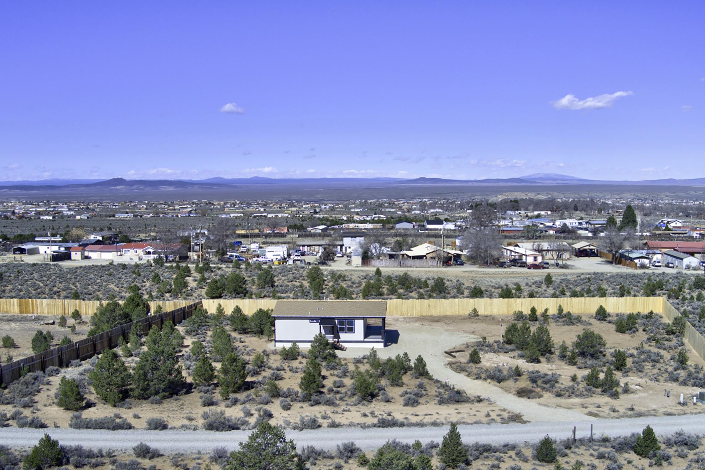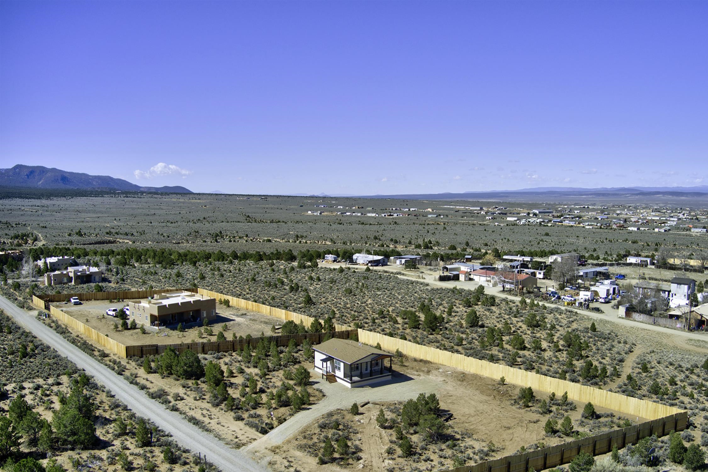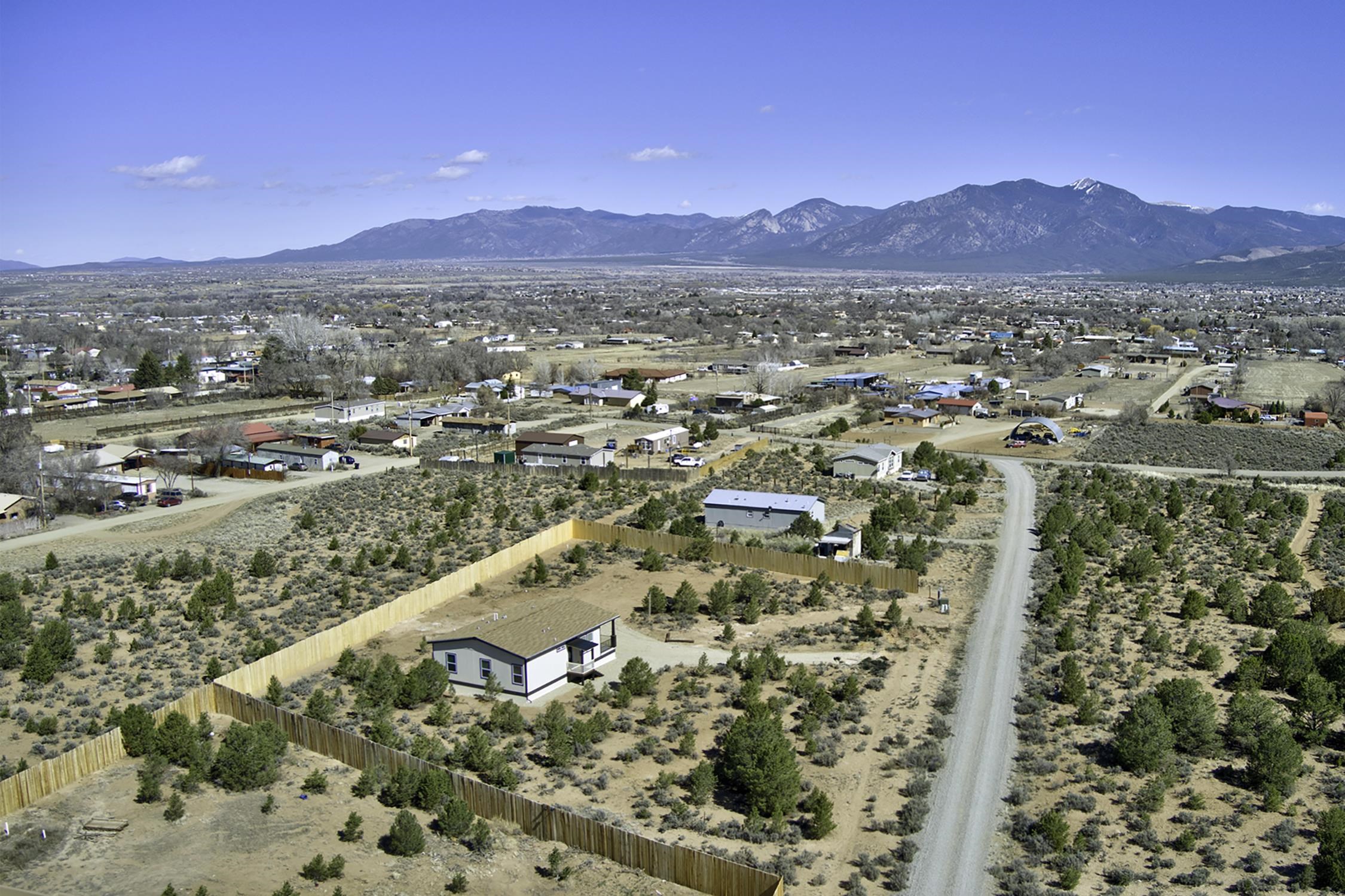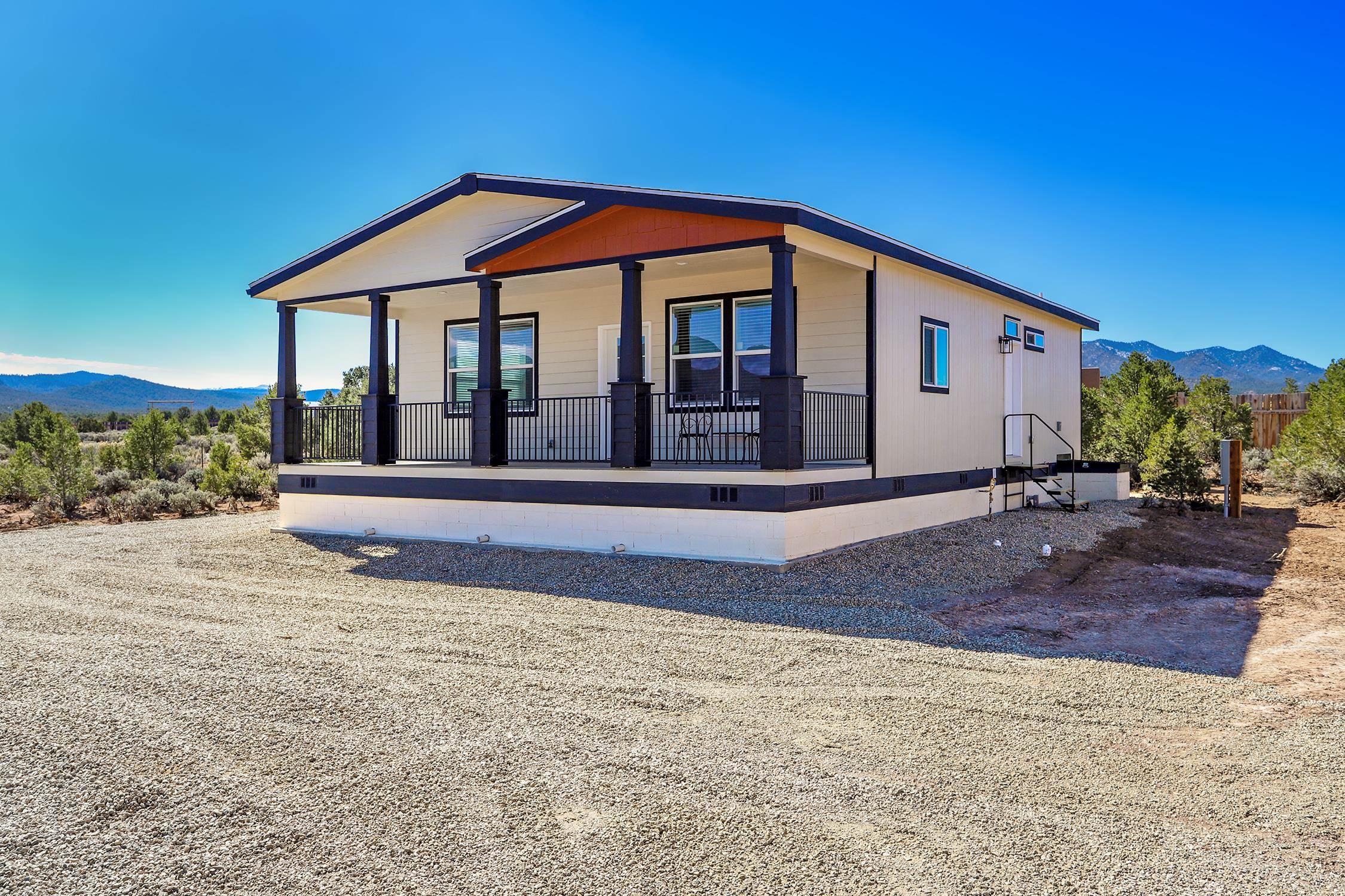 Brand new Karsten home in Ranchos de Taos with beautiful Taos Mountain views! This 1,110 sq ft, 2-bedroom, 2-bath home sits on 1.17 acres and features 9-foot ceilings throughout, taller upgraded cabinets, solid surface countertops, stainless steel appliances, and a walk-in pantry. Both bedrooms include walk-in closets, and 2-inch blinds are installed throughout. Enjoy the covered front porch, perfect for taking in the mountain views and big New Mexico skies. The home sits on an engineered foundation with block skirting and offers forced air heat with central A/C, plus an Energy Star furnace and hot water heater. The property includes two water meters and two water memberships, and the septic is permitted for three bedrooms, offering potential for a studio, casita, or additional mobile home. Three sides of the lot are fenced, and the location provides easy access to hiking and biking while still being a short drive to Taos amenities.