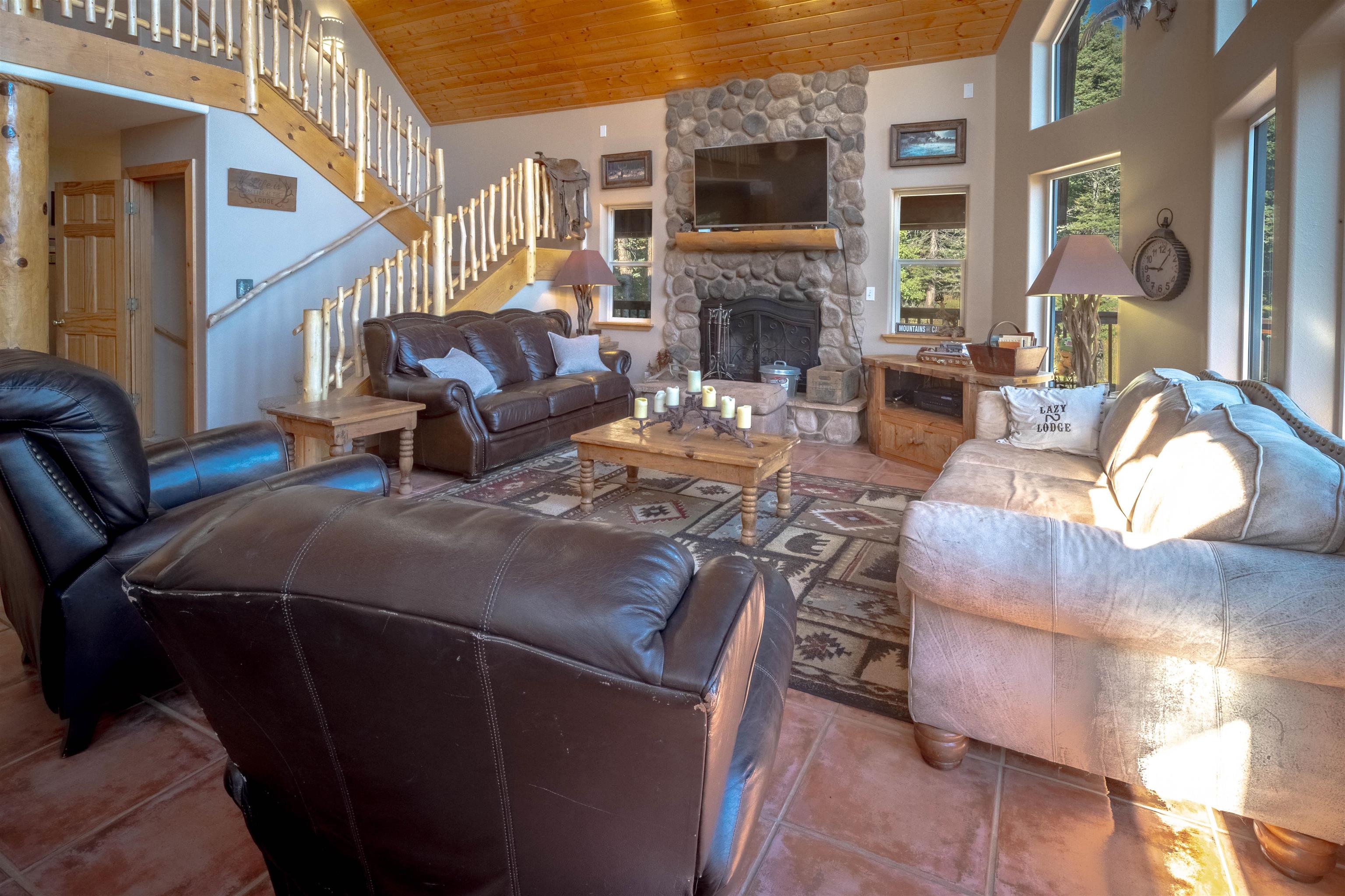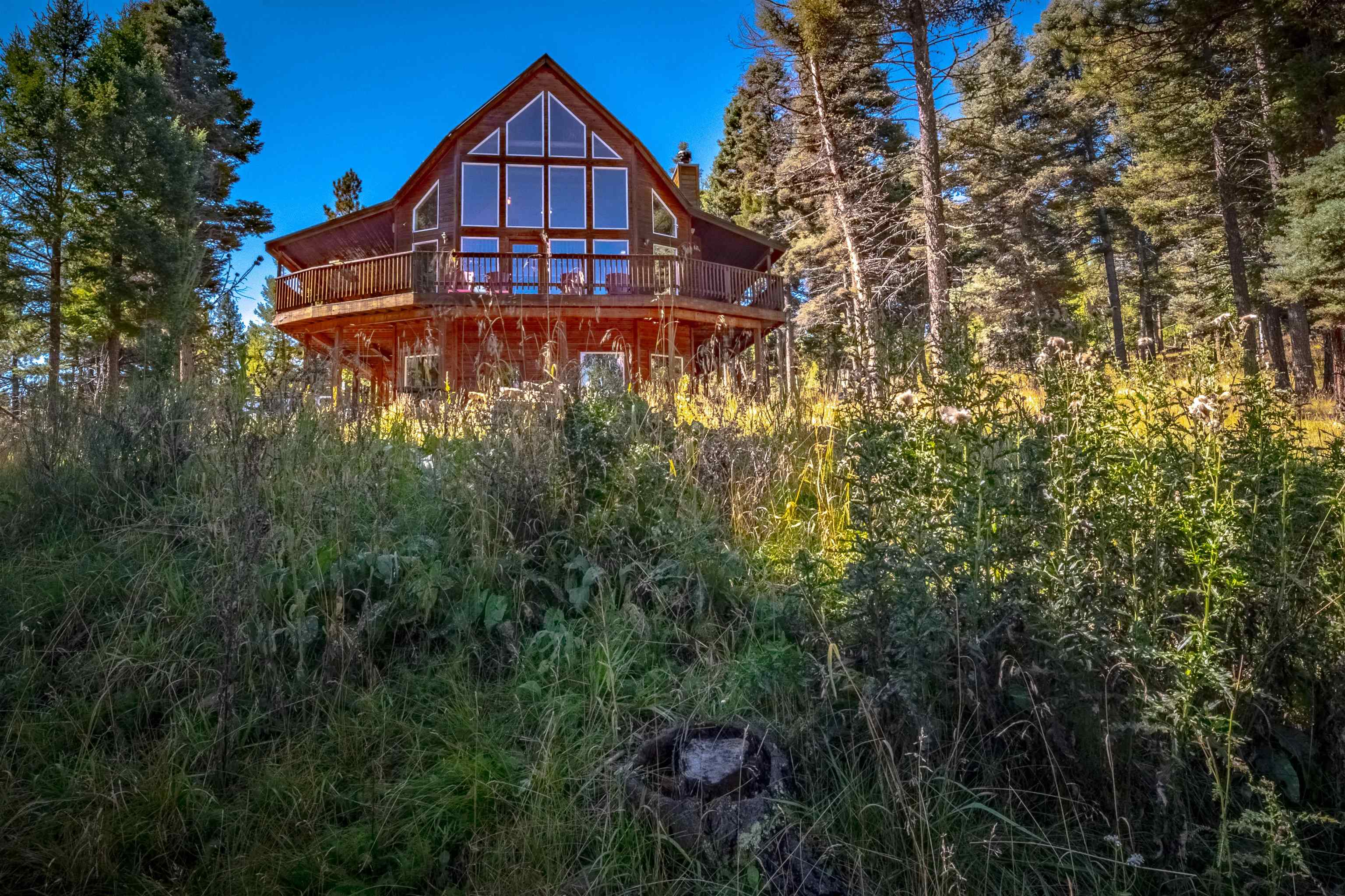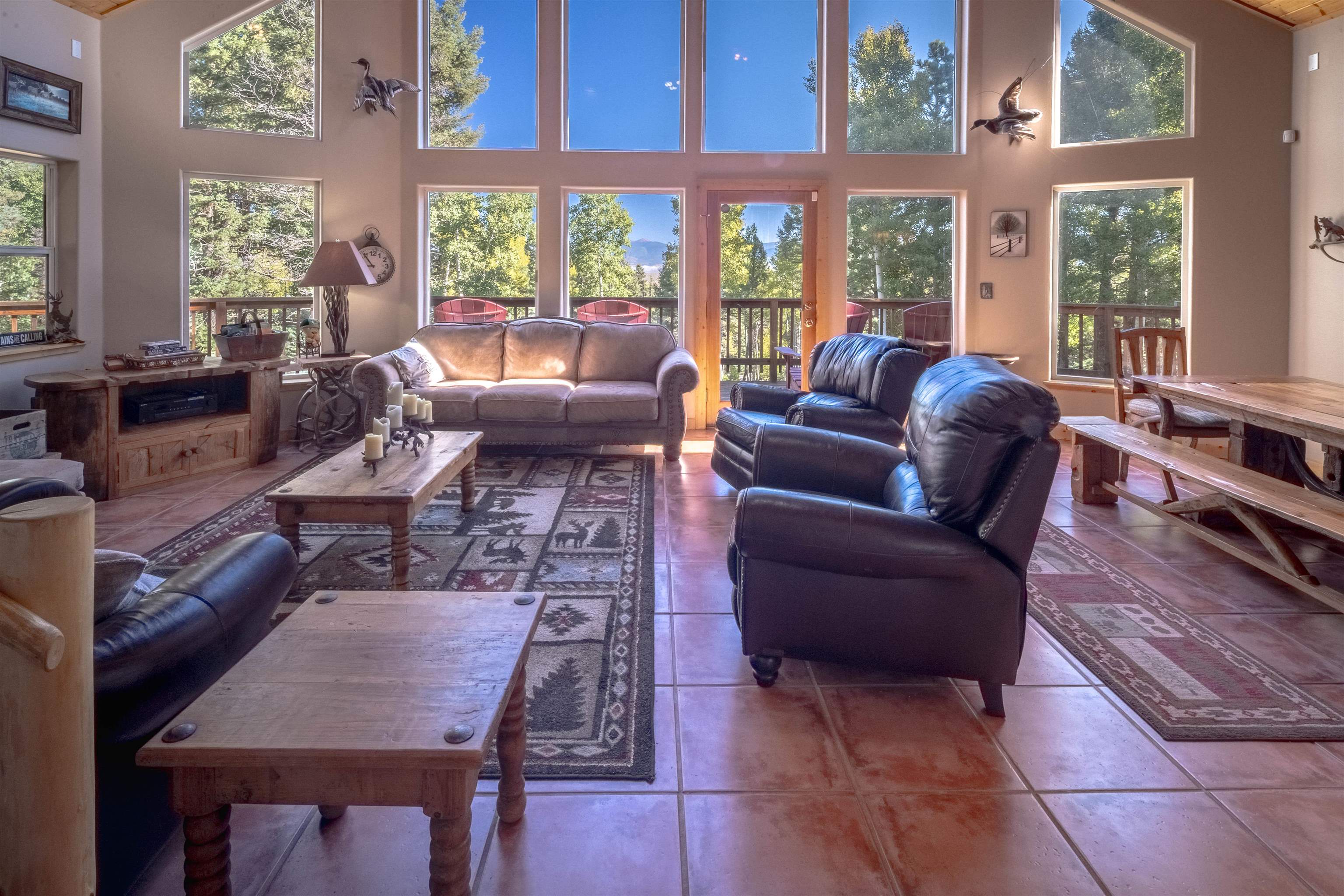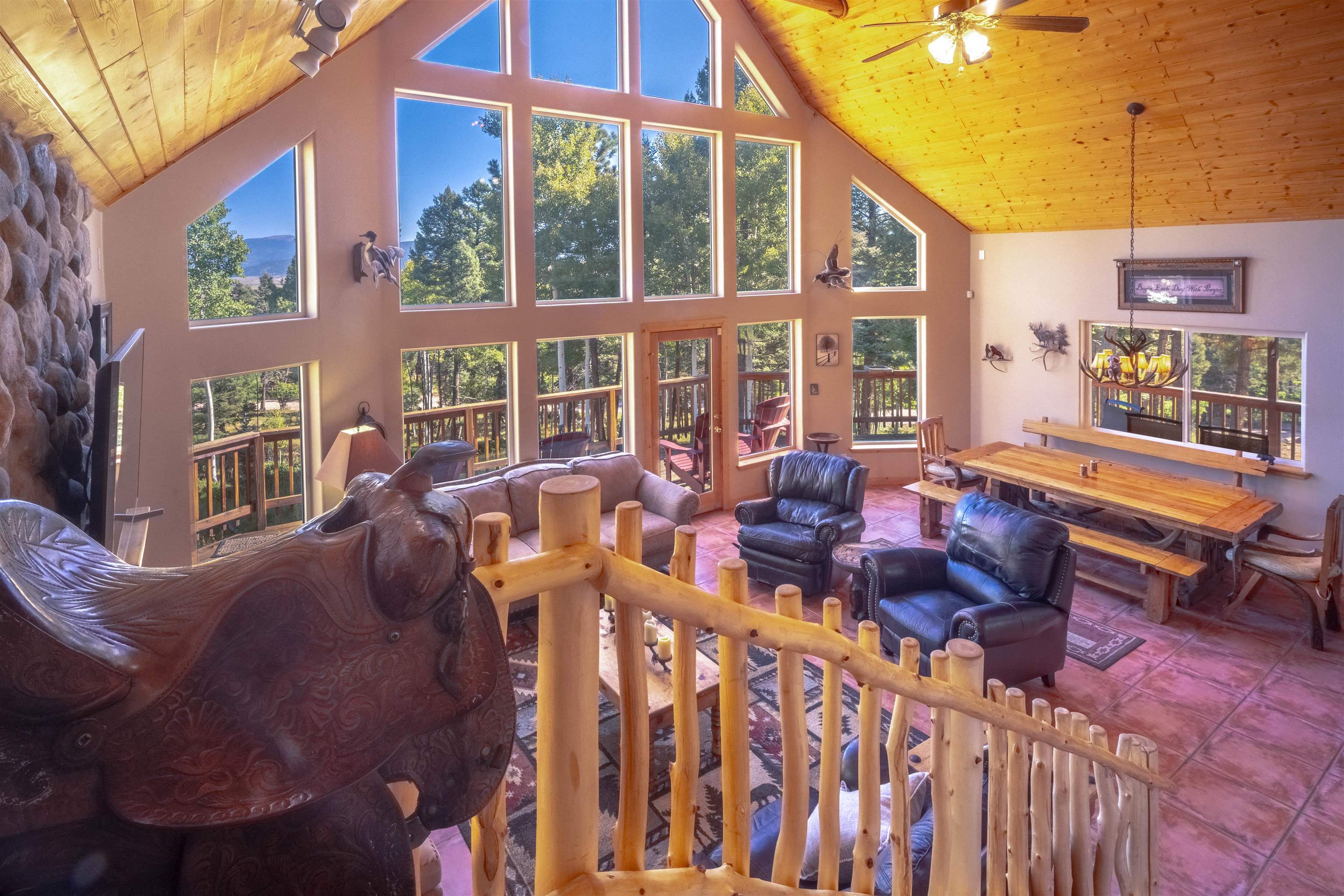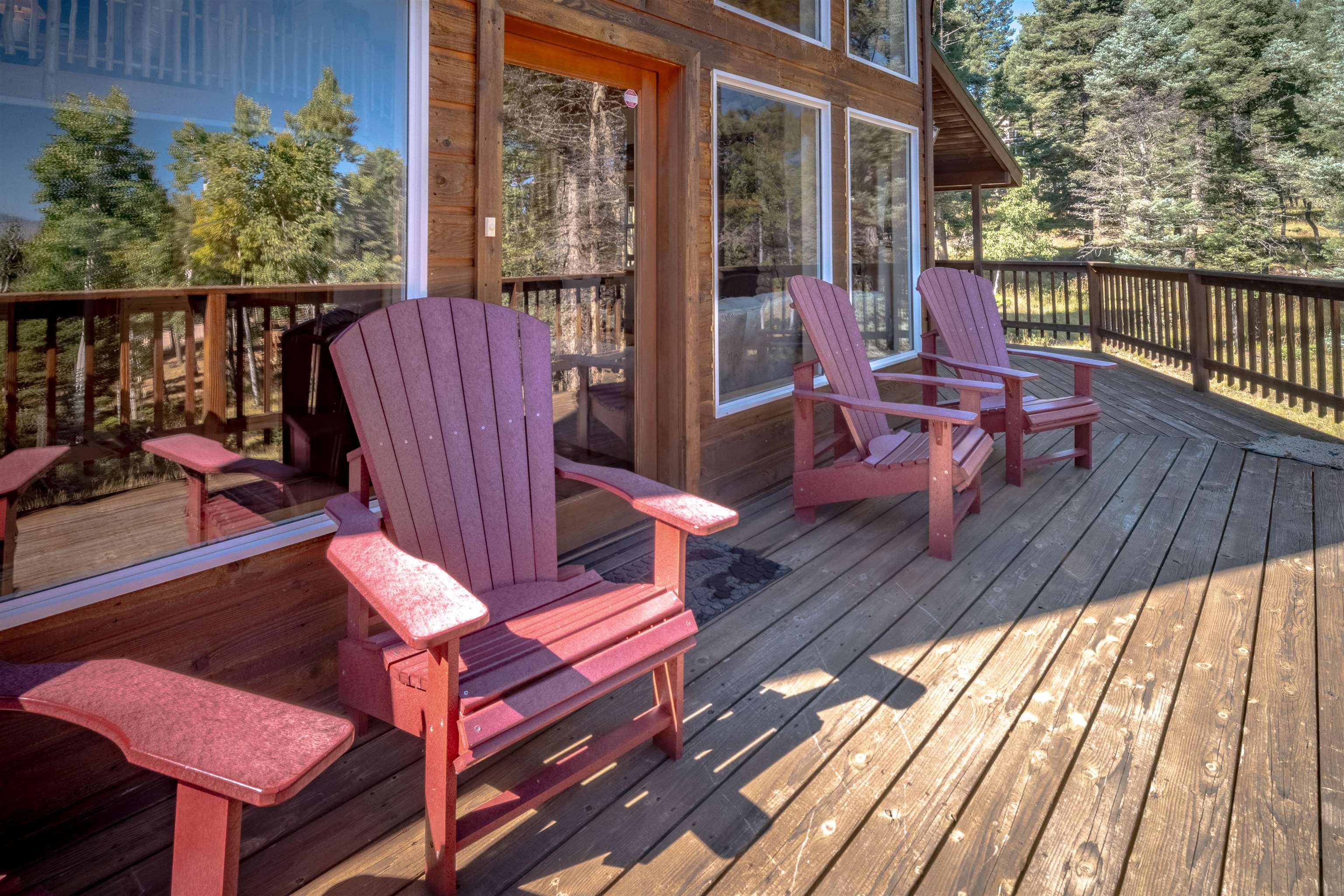 Welcome to your dream mountain getaway! Nestled on 2 private acres with breathtaking mountain views, this 5 bed 4 bath, 3-level chalet is the epitome of Rocky Mountain charm, comfort, and functionality. Featuring an open-concept kitchen, a living & dining area with soaring tongue & groove ceilings, massive logs and a striking rock fireplace. Also a chalet-style wall of windows that floods the interior with natural light and mountain vistas. The upper level contains 2 master suites, a private deck with panoramic views and a loft area ideal for a home office or cozy reading nook. The main-level includes an expansive kitchen with commercial-grade range and ample counter space, a guest bedroom and full bath, a utility room & mudroom for convenience after outdoor adventures. The lower level offers 2 bedrooms, a full bath, and a large family room with a wet bar plus walk-out access to a flagstone patio with fire pit and mountain views. There is a finished oversized 2-car garage with a second-story storage area that could be converted into an additional bonus room. Quiet and easily accessible year-round location. About 5 minutes to Angel Fire Village, Championship Golf Course, Country Club, Fitness Center, and Ski-Resort.