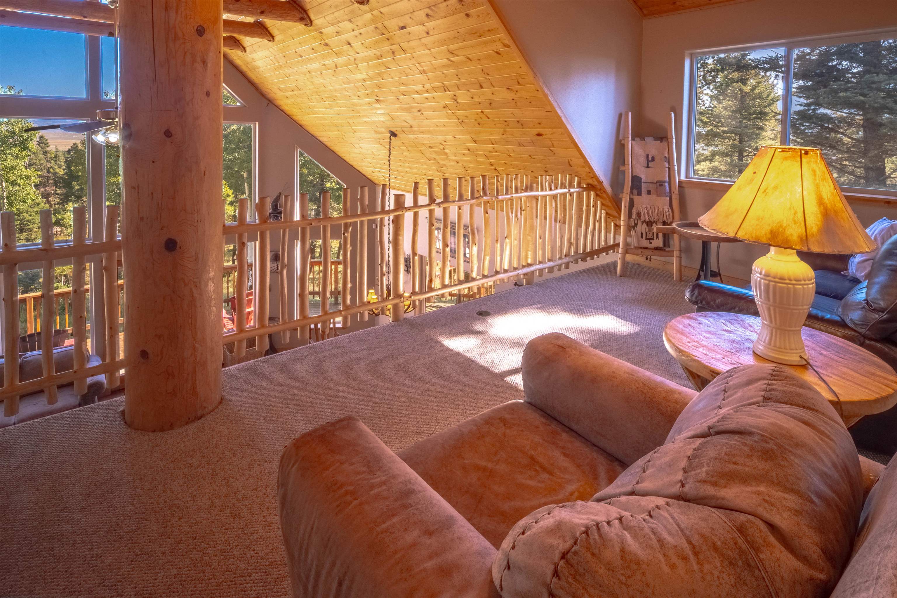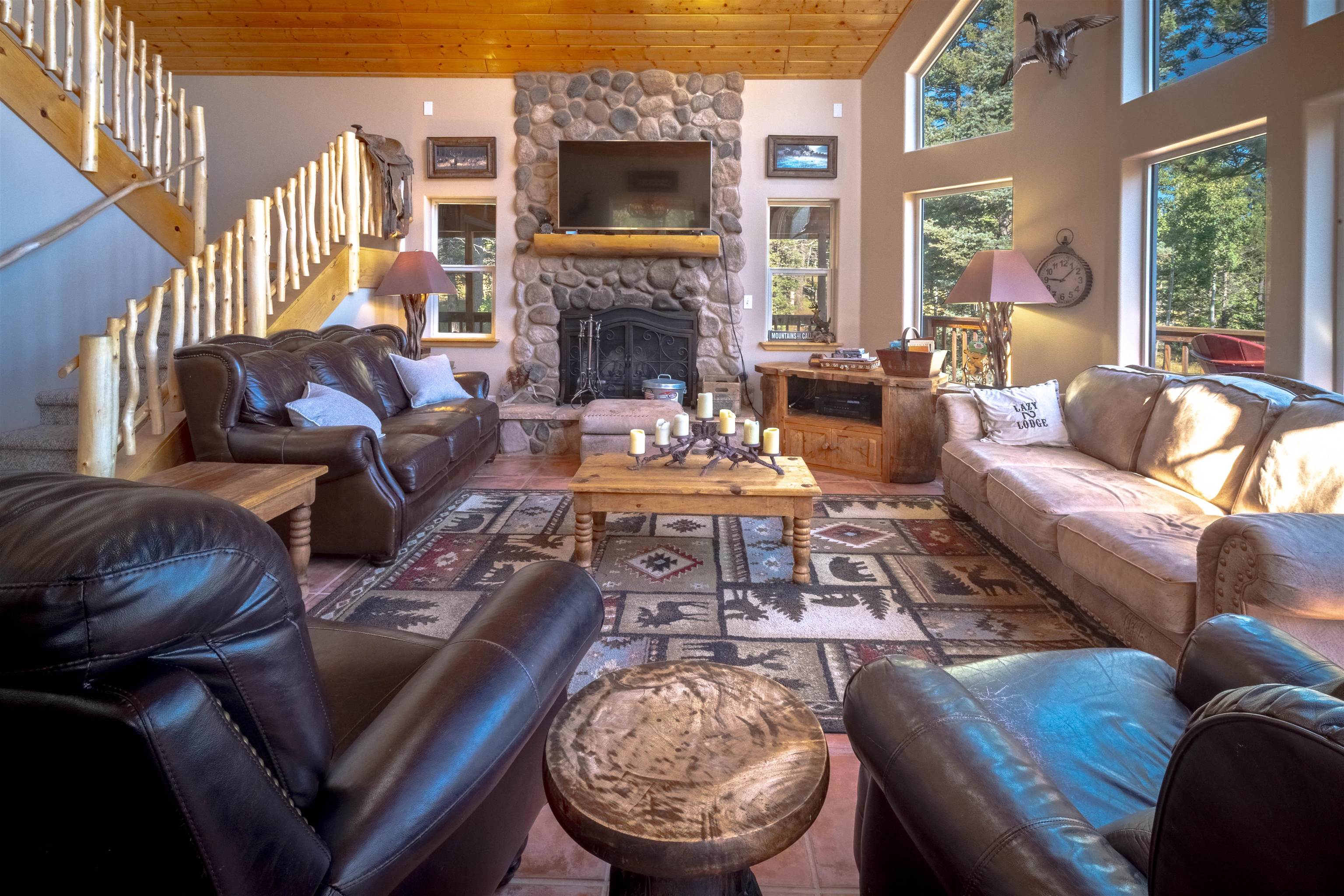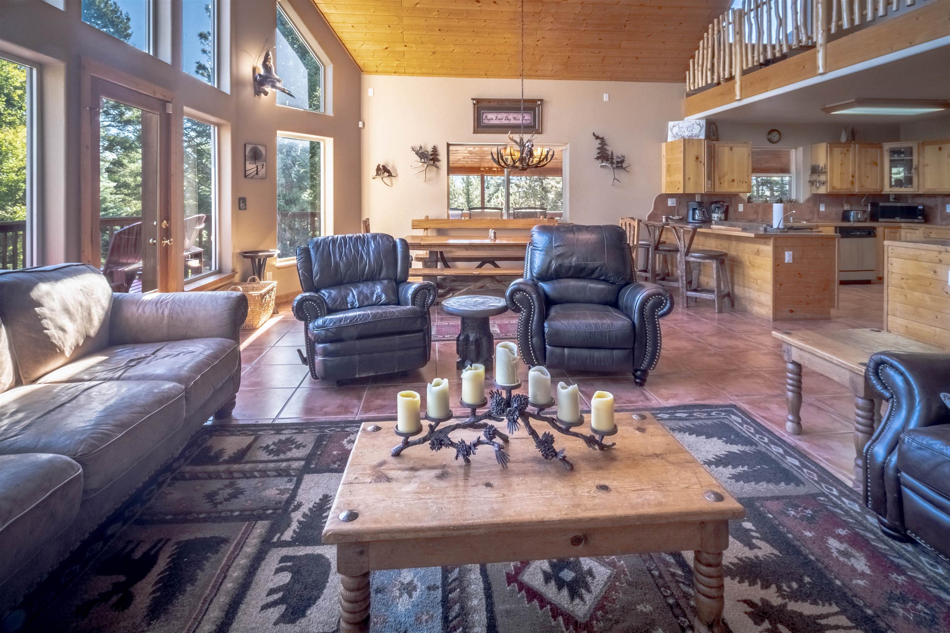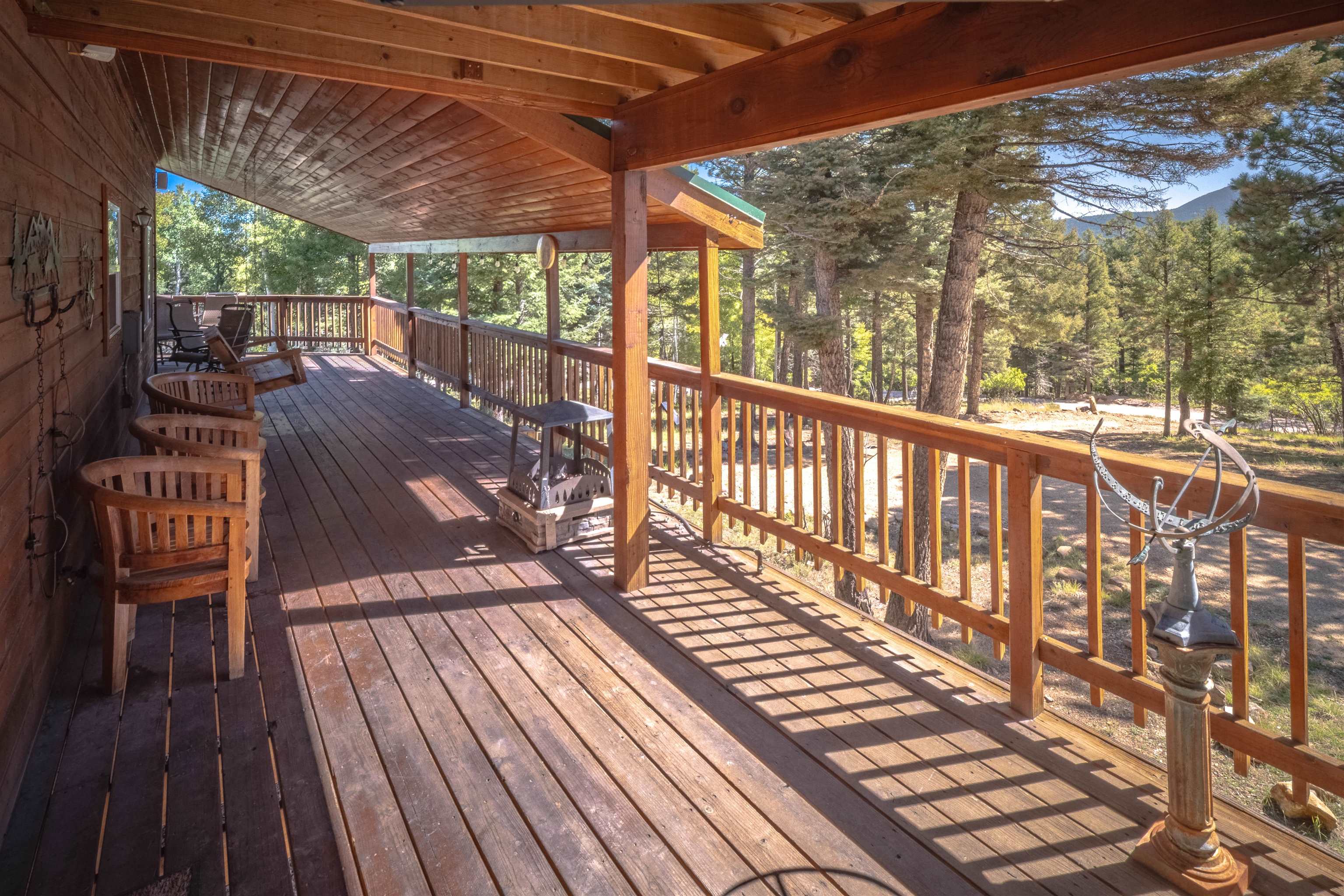 Welcome to your dream mountain getaway! Nestled on 2 private acres with breathtaking mountain views, this 5 bed 4 bath, 3-level chalet is the epitome of Rocky Mountain charm, comfort, and functionality. Featuring an open-concept kitchen, a living & dining area with soaring tongue & groove ceilings, massive logs and a striking rock fireplace. Also a chalet-style wall of windows that floods the interior with natural light and mountain vistas. The upper level contains 2 master suites, a private deck with panoramic views and a loft area ideal for a home office or cozy reading nook. The main-level includes an expansive kitchen with commercial-grade range and ample counter space, a guest bedroom and full bath, a utility room & mudroom for convenience after outdoor adventures. The lower level offers 2 bedrooms, a full bath, and a large family room with a wet bar plus walk-out access to a flagstone patio with fire pit and mountain views. There is a finished oversized 2-car garage with a second-story storage area that could be converted into an additional bonus room. Quiet and easily accessible year-round location. About 5 minutes to Angel Fire Village, Championship Golf Course, Country Club, Fitness Center, and Ski-Resort.