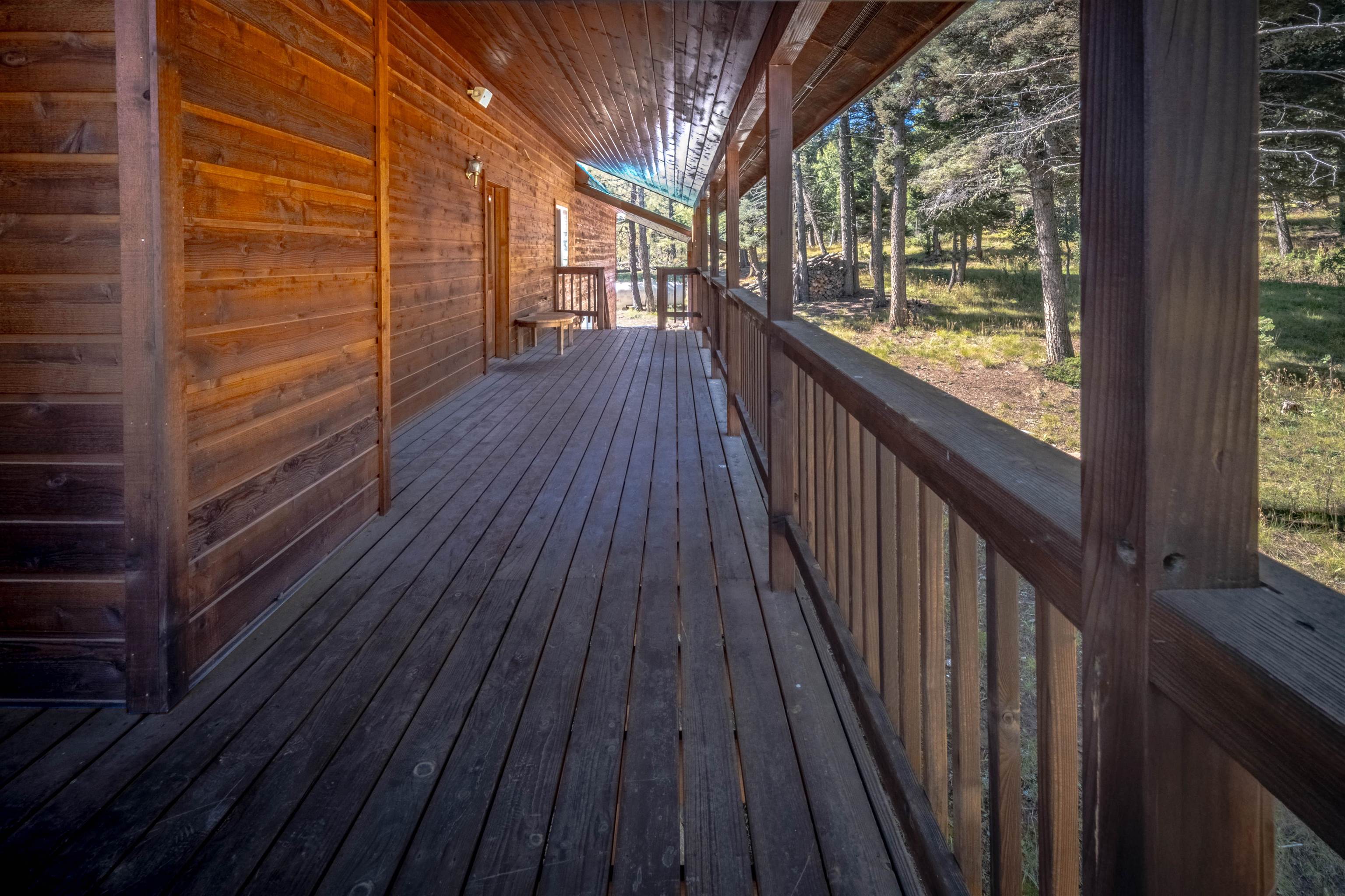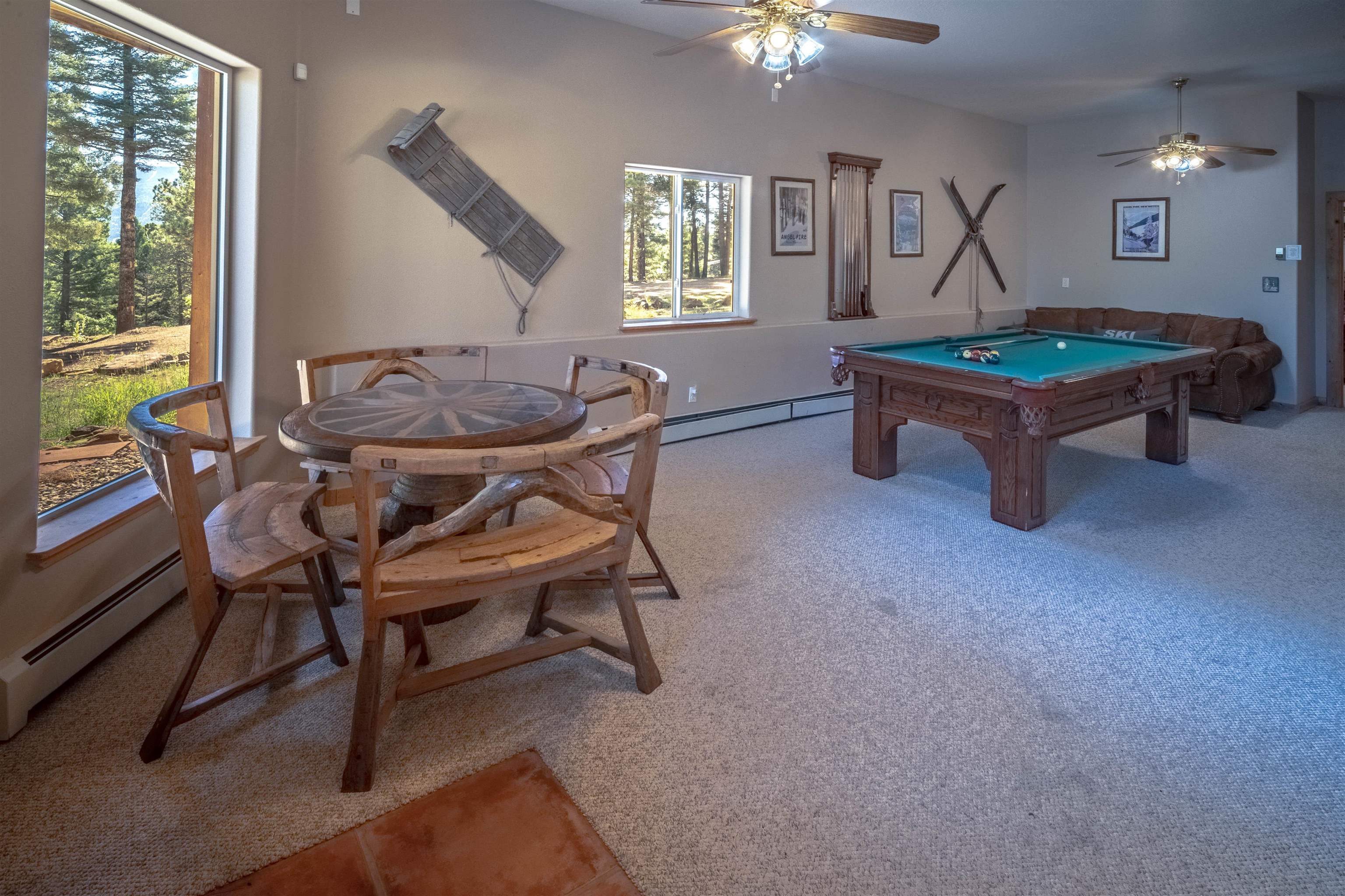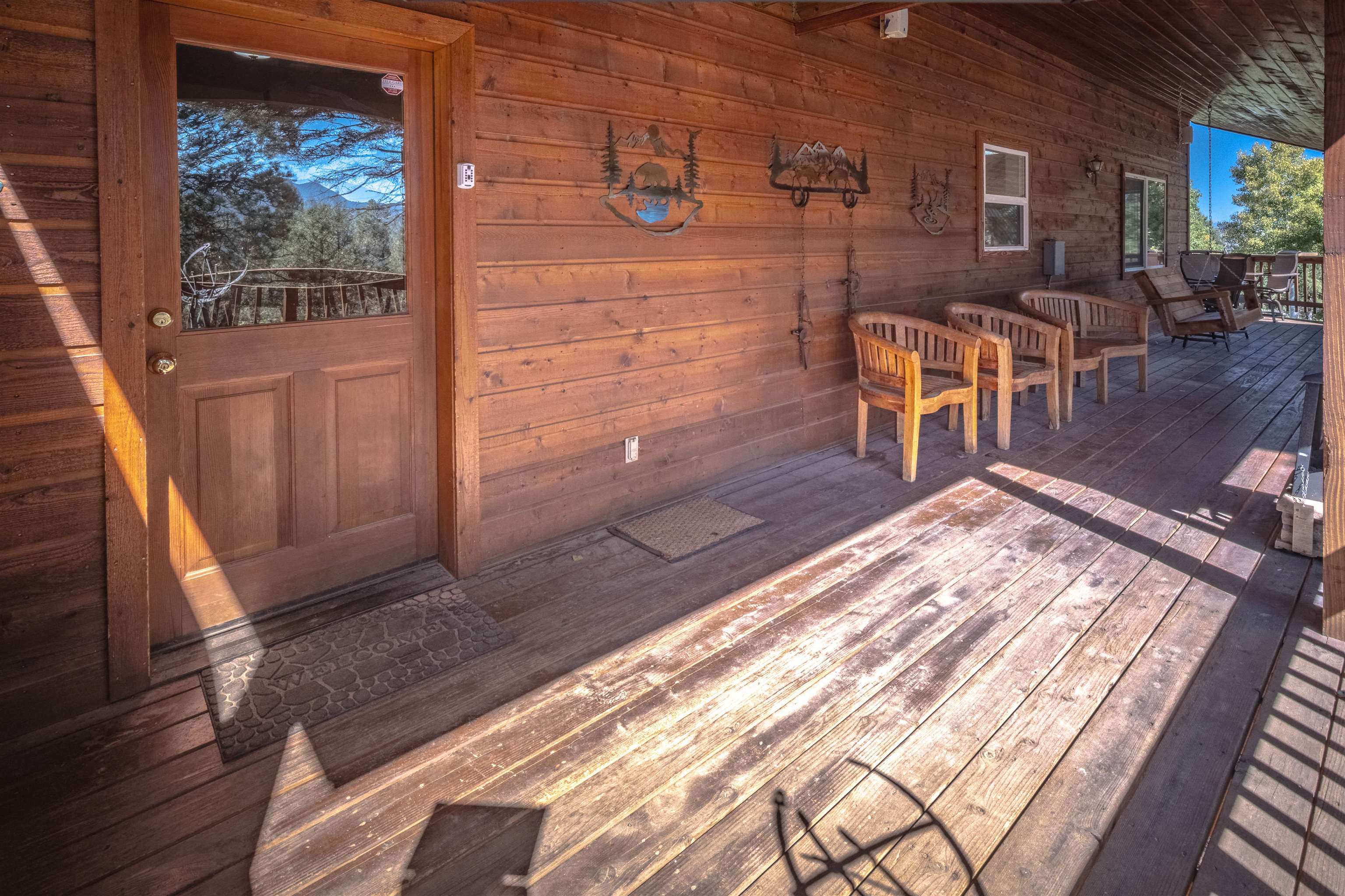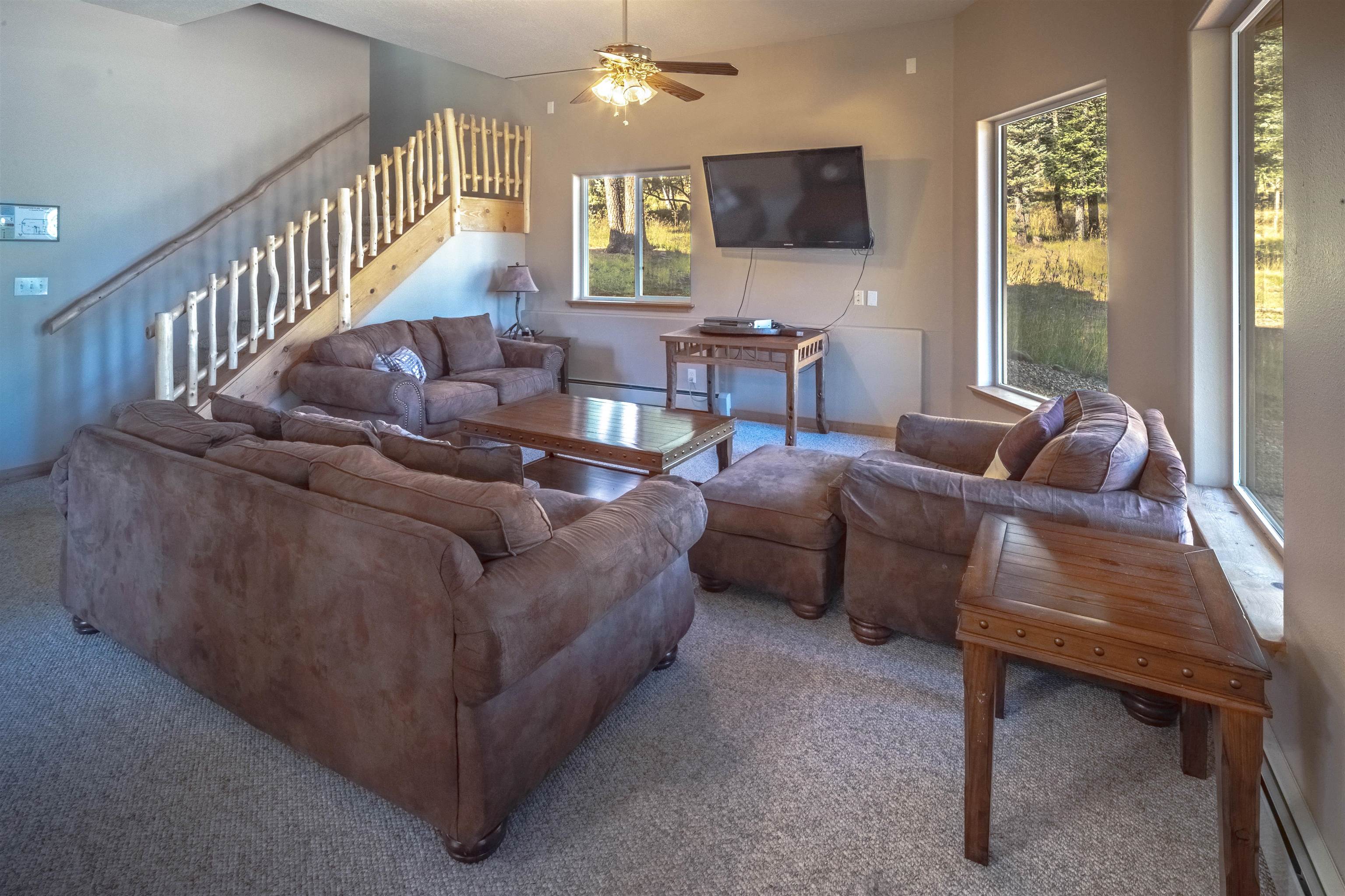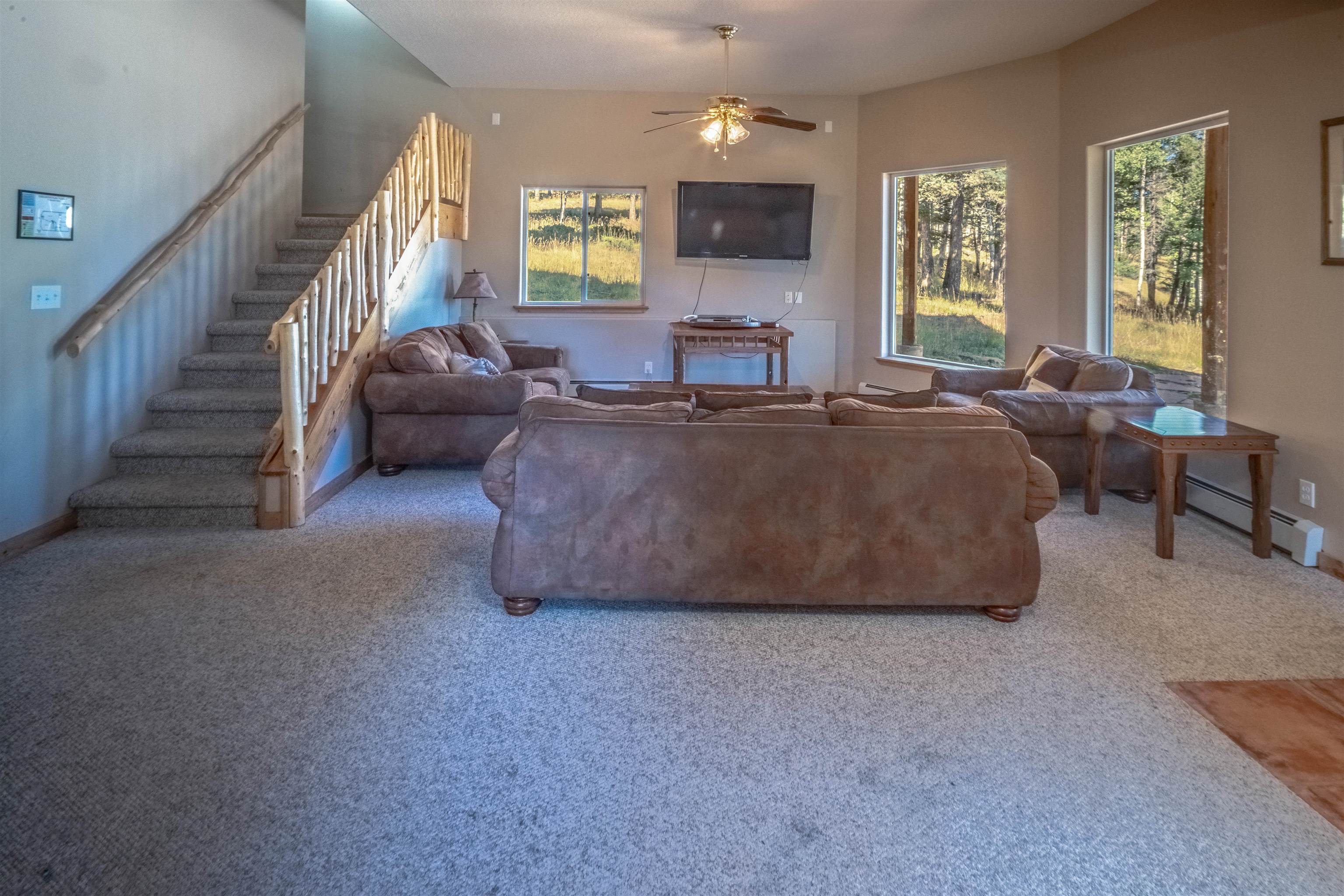 Welcome to your dream mountain getaway! Nestled on 2 private acres with breathtaking mountain views, this 5 bed 4 bath, 3-level chalet is the epitome of Rocky Mountain charm, comfort, and functionality. Featuring an open-concept kitchen, a living & dining area with soaring tongue & groove ceilings, massive logs and a striking rock fireplace. Also a chalet-style wall of windows that floods the interior with natural light and mountain vistas. The upper level contains 2 master suites, a private deck with panoramic views and a loft area ideal for a home office or cozy reading nook. The main-level includes an expansive kitchen with commercial-grade range and ample counter space, a guest bedroom and full bath, a utility room & mudroom for convenience after outdoor adventures. The lower level offers 2 bedrooms, a full bath, and a large family room with a wet bar plus walk-out access to a flagstone patio with fire pit and mountain views. There is a finished oversized 2-car garage with a second-story storage area that could be converted into an additional bonus room. Quiet and easily accessible year-round location. About 5 minutes to Angel Fire Village, Championship Golf Course, Country Club, Fitness Center, and Ski-Resort.