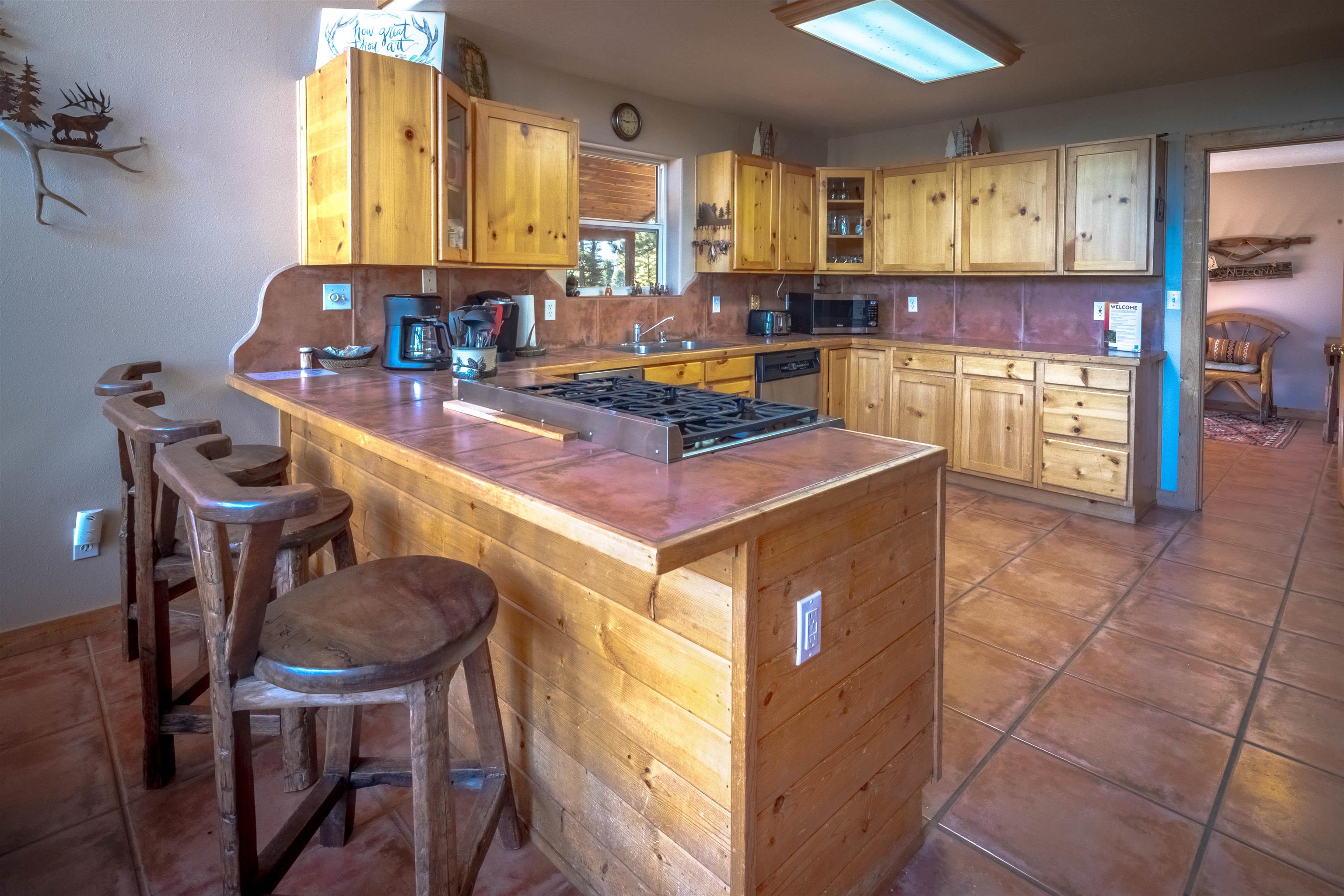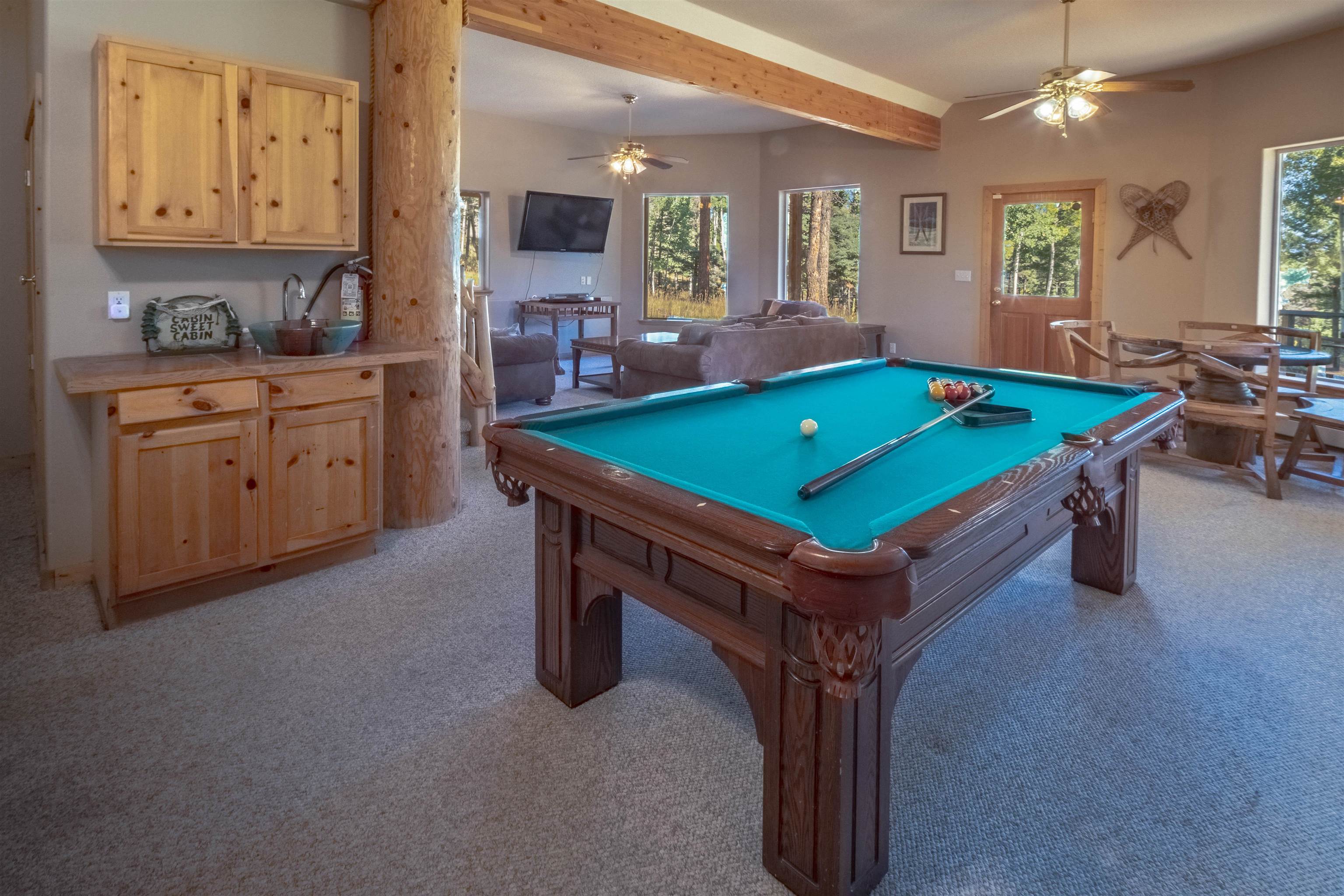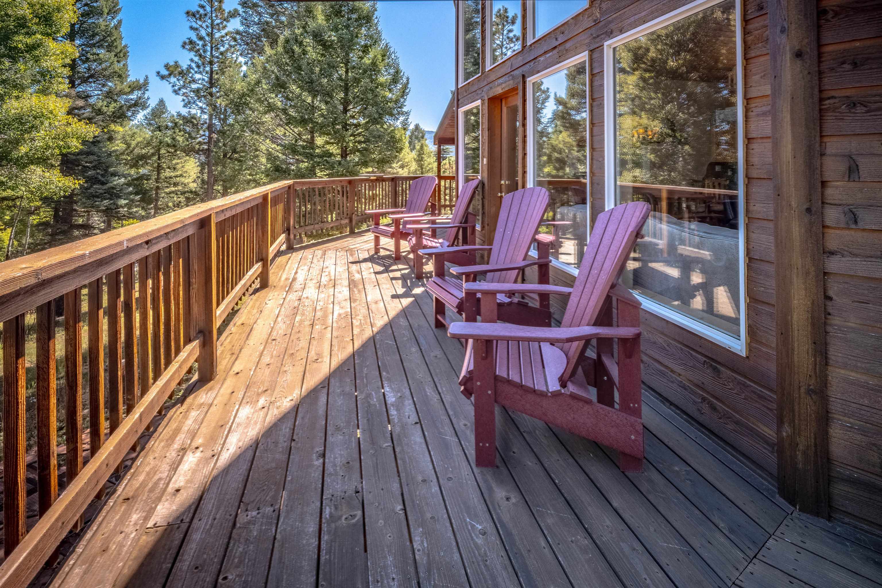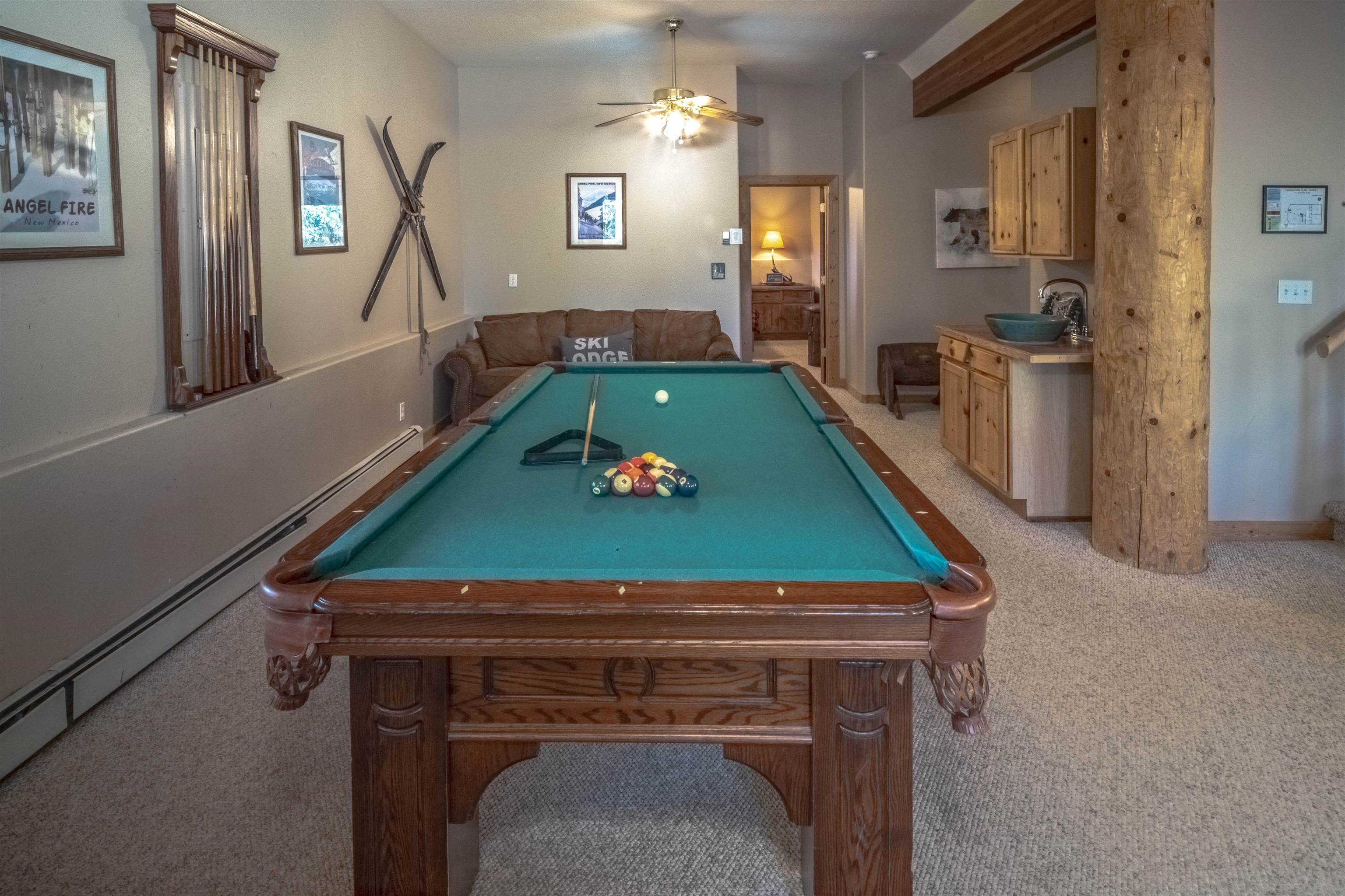 Welcome to your dream mountain getaway! Nestled on 2 private acres with breathtaking mountain views, this 5 bed 4 bath, 3-level chalet is the epitome of Rocky Mountain charm, comfort, and functionality. Featuring an open-concept kitchen, a living & dining area with soaring tongue & groove ceilings, massive logs and a striking rock fireplace. Also a chalet-style wall of windows that floods the interior with natural light and mountain vistas. The upper level contains 2 master suites, a private deck with panoramic views and a loft area ideal for a home office or cozy reading nook. The main-level includes an expansive kitchen with commercial-grade range and ample counter space, a guest bedroom and full bath, a utility room & mudroom for convenience after outdoor adventures. The lower level offers 2 bedrooms, a full bath, and a large family room with a wet bar plus walk-out access to a flagstone patio with fire pit and mountain views. There is a finished oversized 2-car garage with a second-story storage area that could be converted into an additional bonus room. Quiet and easily accessible year-round location. About 5 minutes to Angel Fire Village, Championship Golf Course, Country Club, Fitness Center, and Ski-Resort.