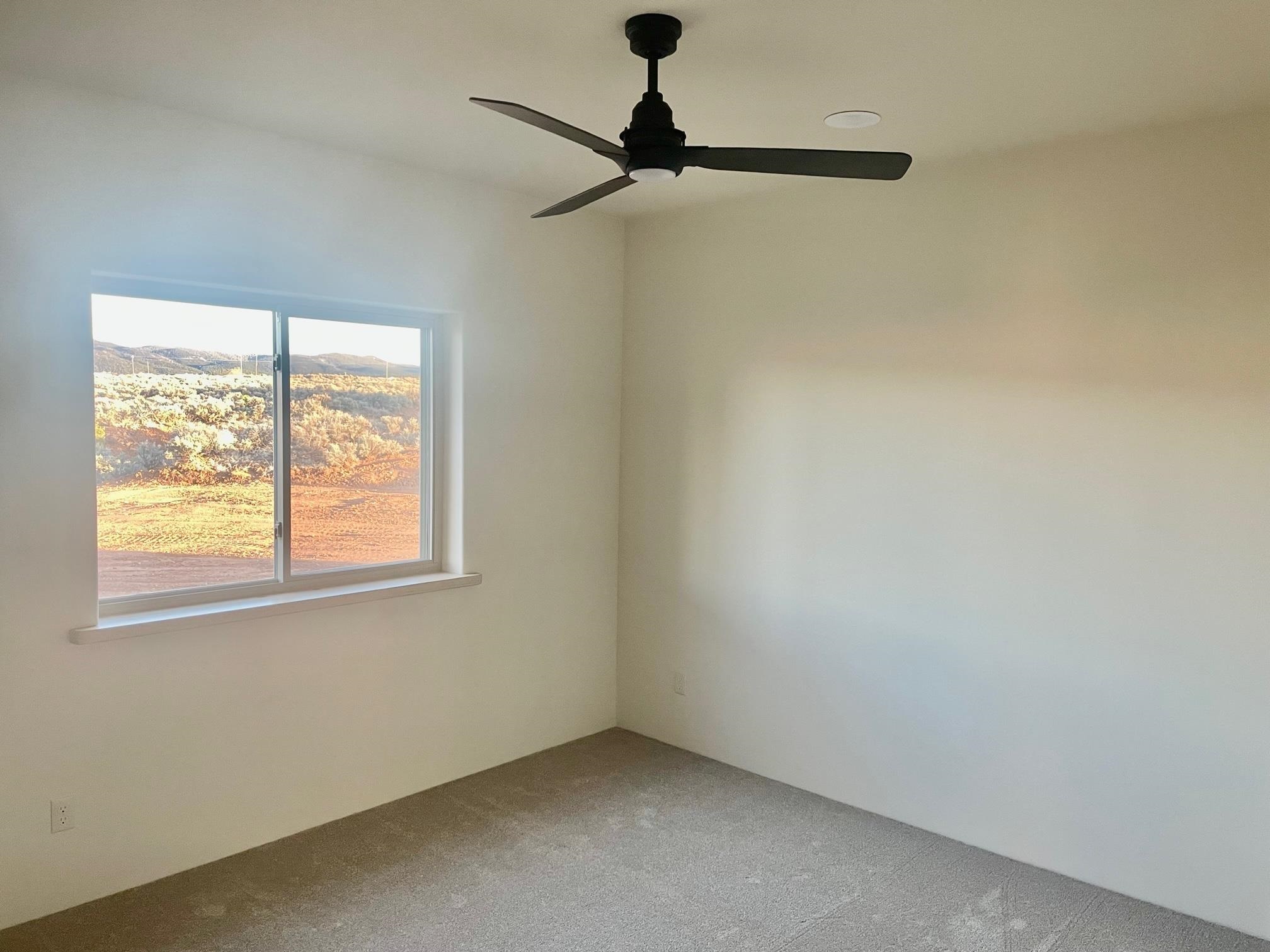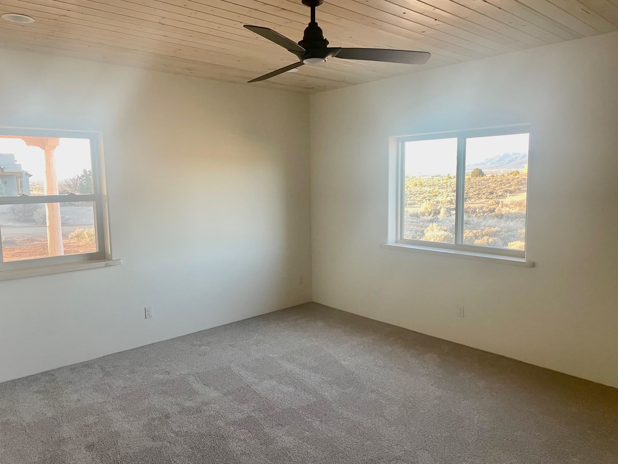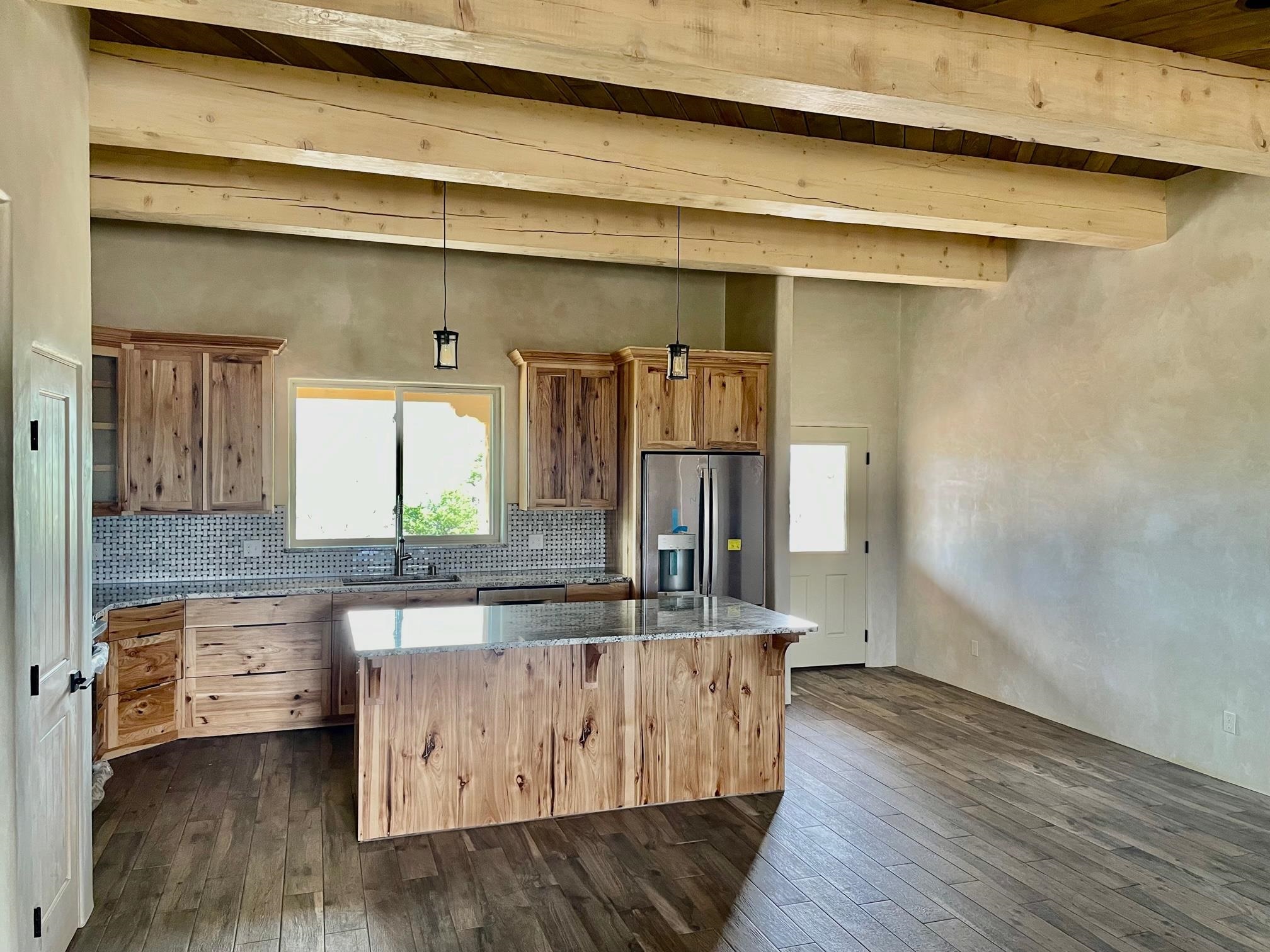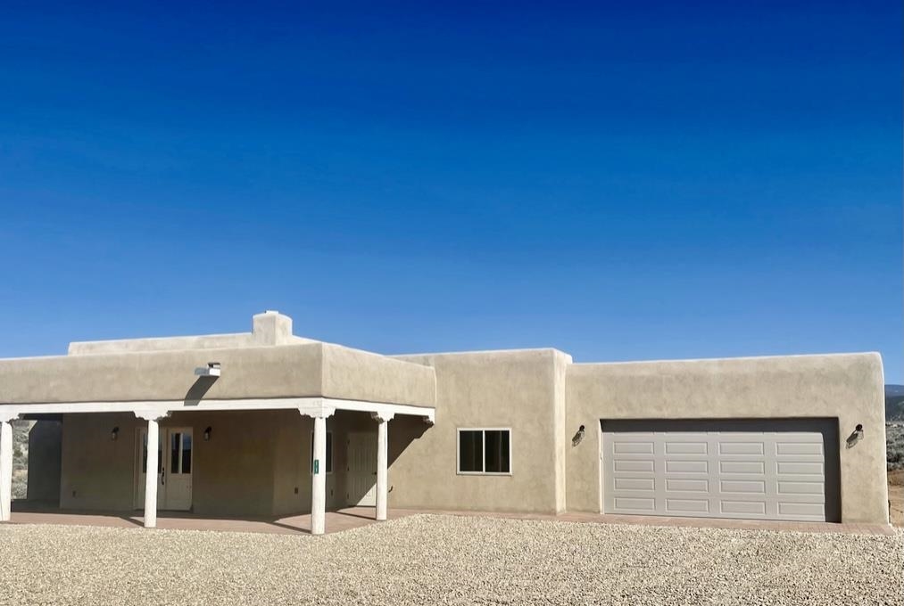 This is a custom house built in 2023 by one of Taos' finest, Martin Builders. House is on Laguardia Rd adjacent to Vista Linda. Located close to Golf Course and UNM Taos. House has tile in common areas, carpet in bedrooms, and tile in both bathrooms. Kitchen has custom made birch wood cabinets with granite tops. The Great Room has wood beams and tongue and grove along with a wood burning kiva fireplace that includes a gas log lighter. The common area interior walls have diamond finish. The bedrooms walls have smooth finish. Interior walls are insulated for sound proofing. Roof has brai. House is 2" by 6" construction with 1" thick rigid insulation on exterior walls (R-28). Ceilings have R-51. House has stainless steel appliances (stove, dishwasher, microwave, and refrigerator). House has an over-sized front porch with brick inlay. Back porch also has brick inlay. Garage has in-slab radiant heating with an epoxy finish. Indeed, this is a top-notch custom house!!!