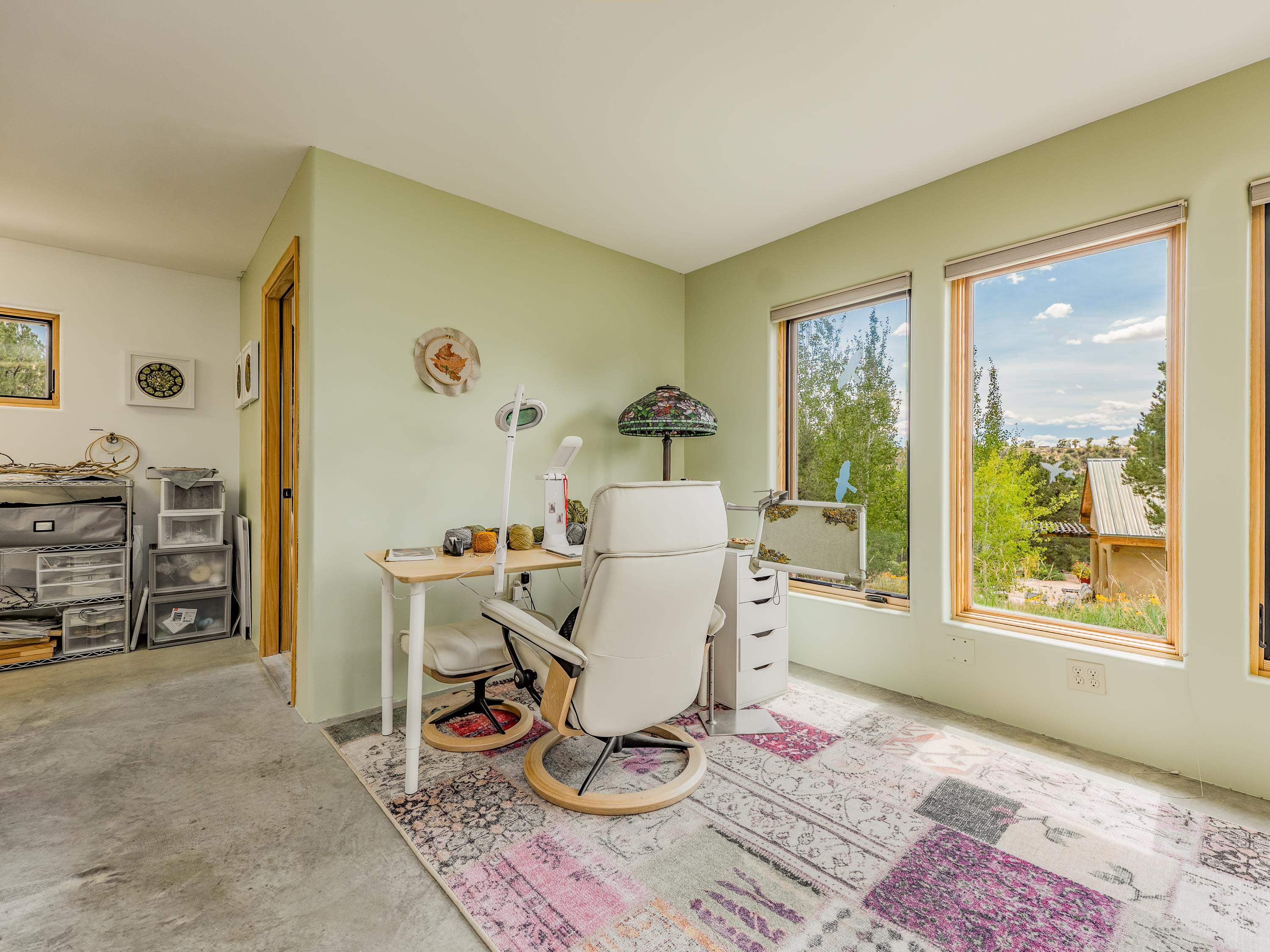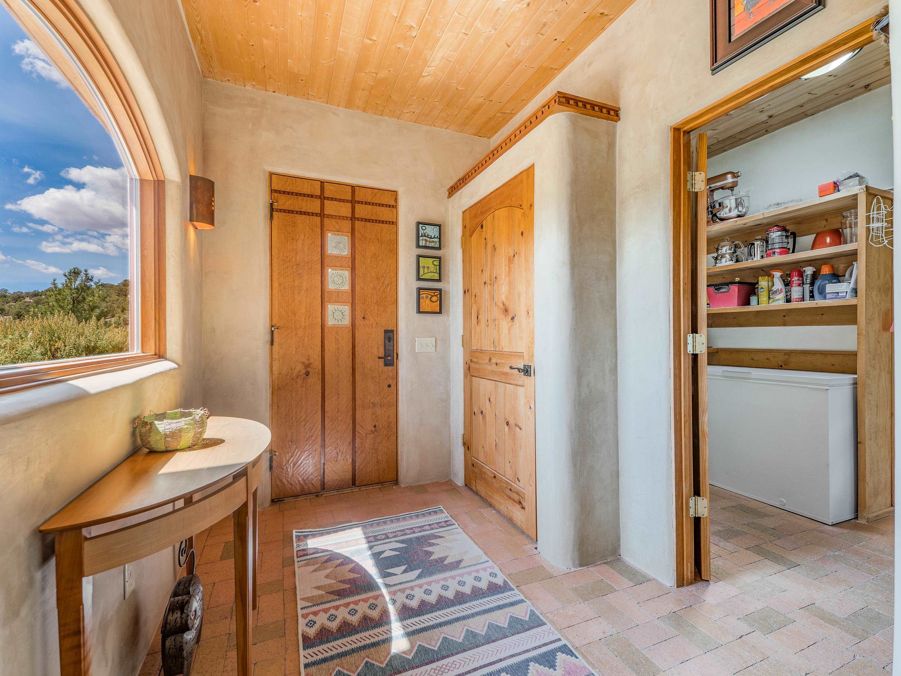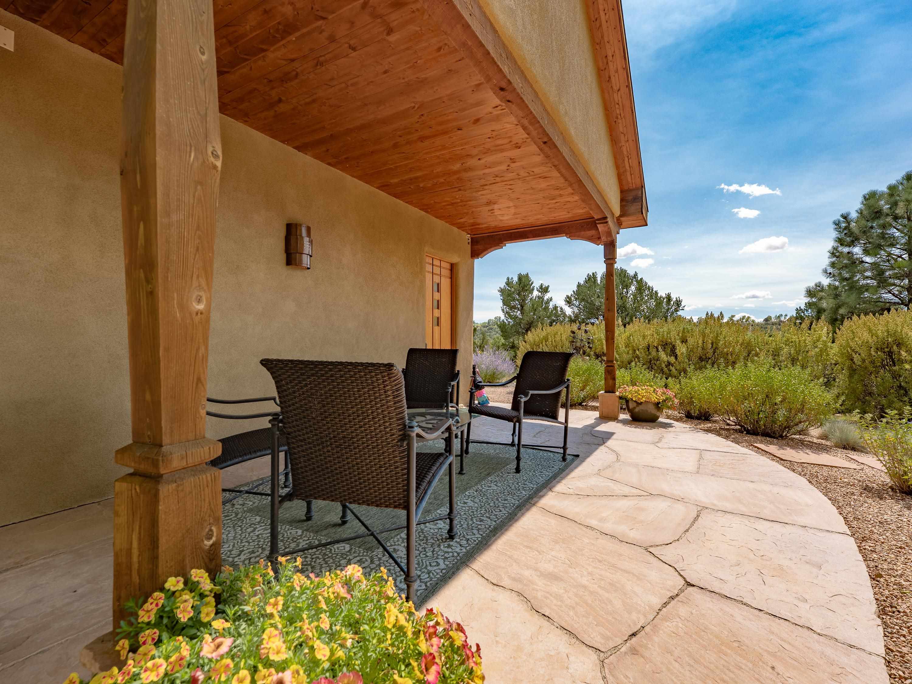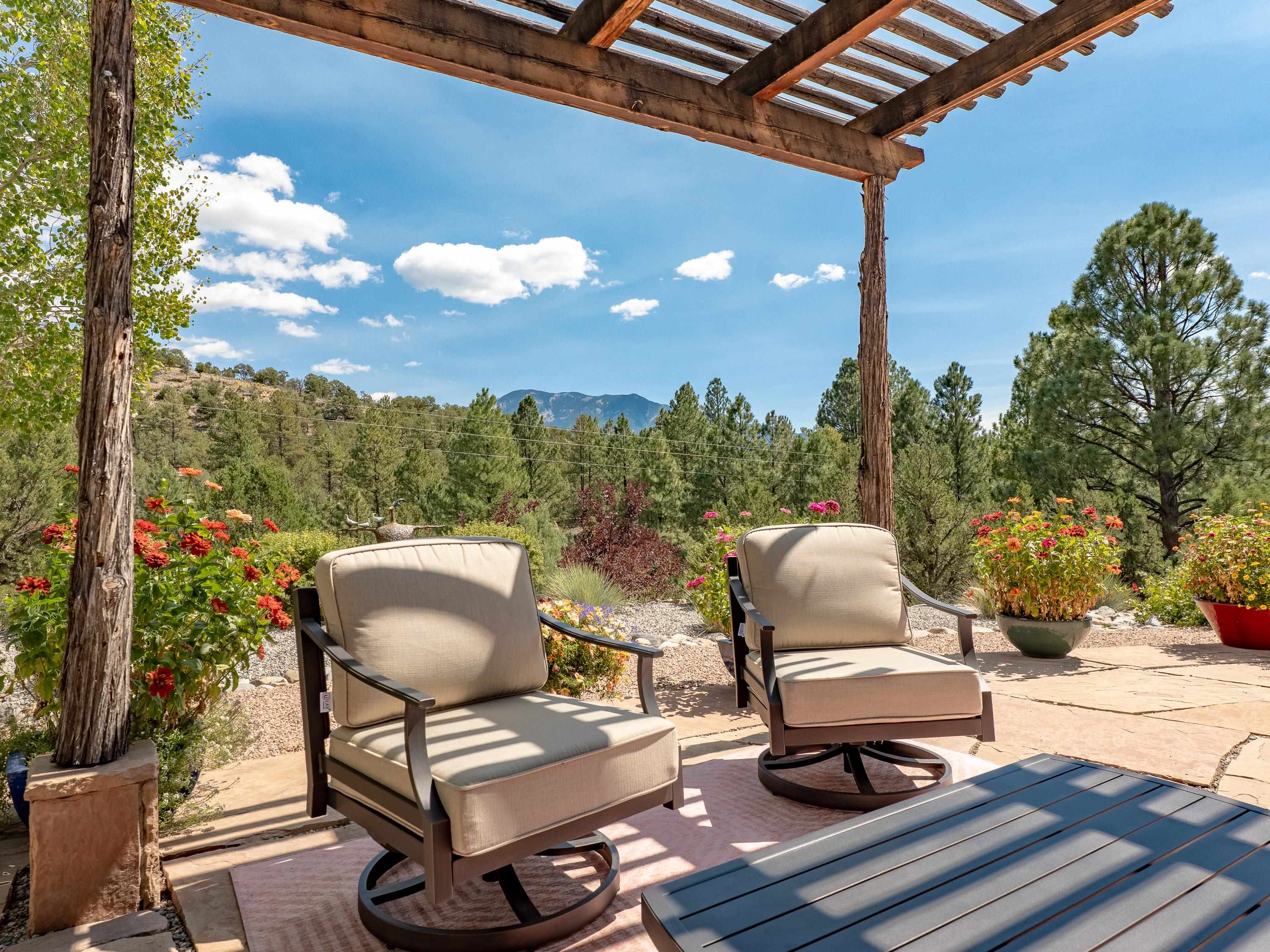 With sweeping views, landscaping, and incredible architectural detail, 11 Mountain View Trail is a home where everyday living feels inspired. Designed and lovingly maintained by its original owner, this residence and detached studio showcase true pride of ownership. The straw bale home was built with a passive solar design and an interior adobe wall that naturally regulates temperature year-round. A solar hydronic system supplements the radiant heat and hot water systems. A grid-tied photovoltaic solar array generates enough power to offset nearly all electricity costs. Light-filled living spaces flow with ease, while cozy details—like the fireplace in the great room—make the home as comfortable as it is efficient. The kitchen features stunning custom cabinetry and pristine concrete countertops, opening to a cheerful dining area perfect for gathering. A private primary suite with a walk-in closet and spa-like bath offers a quiet retreat, while two additional rooms share a full bath and provide flexibility for guests and an office. You must see it in person to appreciate the custom features and attention to detail. The 806sf art studio is fully equipped with 220 power, plumbing, and heat, and includes an office, gallery space, and tool room. Outdoors, the impeccably landscaped gardens, featuring a drip irrigation system, create a serene backdrop, refreshed in 2025 for beauty and low maintenance. With Arroyo Seco, Taos Ski Valley, and national forest trails just a short drive away, this property beautifully combines privacy with an unbeatable location.