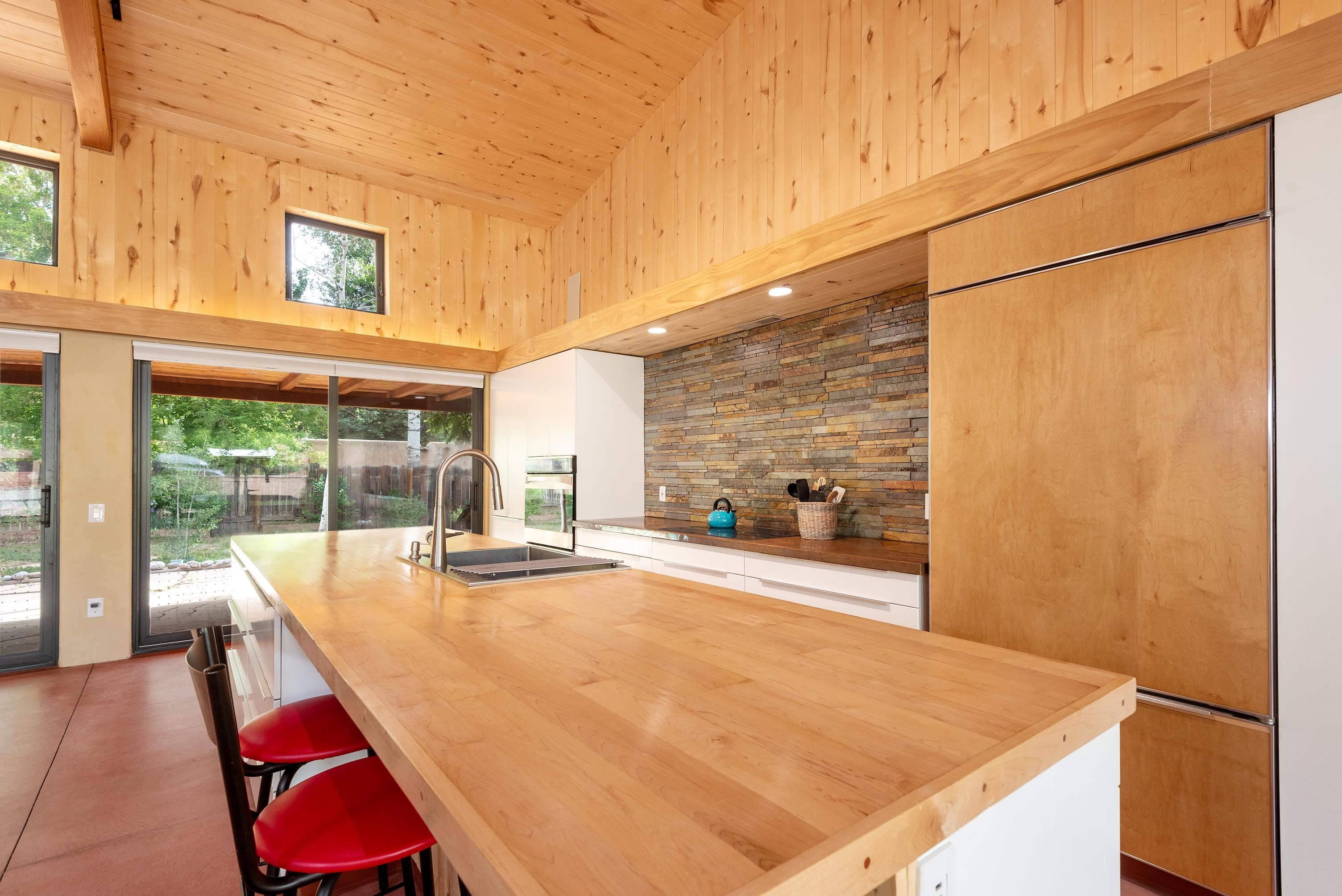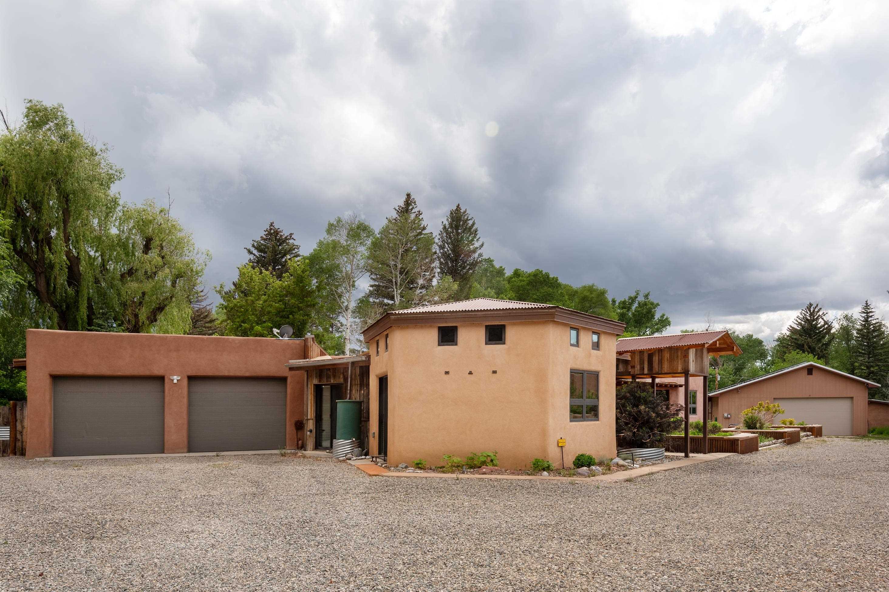 This Beautiful and unique home has great views, and a great location with many wonderful custom features. No monthly gas bills and very low electric bills. Everything needed to make for a wonderful home on an approximate ½ acre fee simple lot in the heart of Taos. This architecturally designed home is exceptionally well built, highly energy efficient and is in a perfect location in the heart of Taos. Its quiet location is at the back of a secluded neighborhood cul-de-sac within easy walking distance to Taos Plaza, numerous restaurants, museums, shopping and Kit Carson Park. The home features a magnificent view of Pueblo Peak from all the major rooms. The open floor plan and generous portals provide plenty of opportunities for comfortable living. Located near the historic district, the property is not encumbered by architectural restrictions or any homeowner association. The architect/owner designed the home to exceed LEED Platinum energy efficiency standards. With no connection to the gas line, the all electric house and separate workshop has an array of solar panels that generate enough electricity to balance out all electrical usage annually. With Kit Carson Electric's net metering policy, there is a minimum monthly charge of $ 28 which is basically the price for providing back up power. The air source heat pump provides hot water for both domestic use and for the zoned radiant floor heating. In summer the system can be switched to provide cold water to cool the home while still providing hot water for domestic use. The exterior walls and roof structure were built with Ray-Core insulated panels plus 2" of exterior rigid foam insulation for a total R value of 55. The roof has an R-value of over 66. The tinted concrete floors (R-10 value with underfloor insulation) are integrally colored, making the surface very durable. The very high quality Alpen windows and patio doors are quad glazed - (yes, you read that correctly, 4 layers of glazing) and have fiberglass frames to minimize heat loss. Windows and patio doors have honeycomb insulating blinds, some are motorized. Special care was taken to seal all seams and joints during construction to minimize air intrusion and associated heat loss. A heat recovery ventilator assures high air quality and is timed to operate 2 hours each day. Interior walls are finished with an earthen plaster product from NM based American Clay which gives the house a certain warm, organic feel. All interior wood doors were custom made on site. There is a propane fueled gas fireplace that is see through and can be enjoyed from the den or living room sides of the wall. This is the only nonelectric appliance, depending upon usage, it uses 1 or 2 four gallon tanks of propane per year. While primarily for aesthetic enjoyment it can serve as a heating source during an extended power outage. The open plan KITCHEN features a built-in Sub Zero refrigerator/freezer, induction cooktop, wall oven, dishwasher and oversized stainless steel sink, The large island invites guests to join in with meal preparation and has storage on both sides. The microwave and coffee station are inside cabinets and are hidden from view. Counter tops are copper and hardwood, and a pantry closet is just off to the side. The whole house air ventilation system with intake above the range can be used to remove cooking odors if needed. THE GREAT ROOM with high ceilings has portals on both north and south sides, clerestory windows and Aspen tongue and groove high walls and ceiling for woodsy warmth above the earthen plastered walls. The stereo system will stay with 9 built-in speakers, including 2 subwoofers. The large recessed TV will also remain. Outdoor living is premium with large porches on both north and south sides of the home which are perfect for entertaining and enjoying the unobstructed view of Pueblo Peak. In addition to the oversized 2 car garage, there is a 720 sf heated shop with a small attached greenhouse.