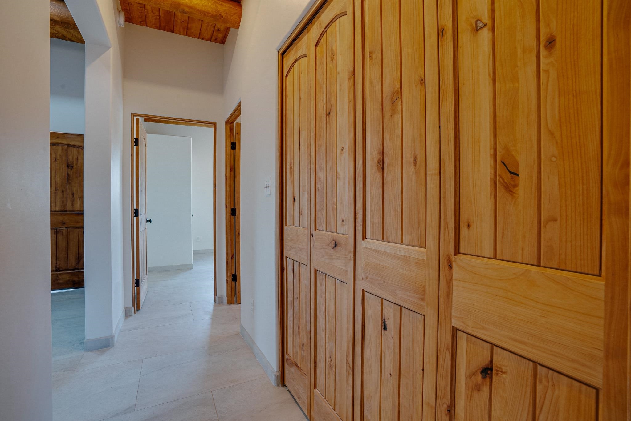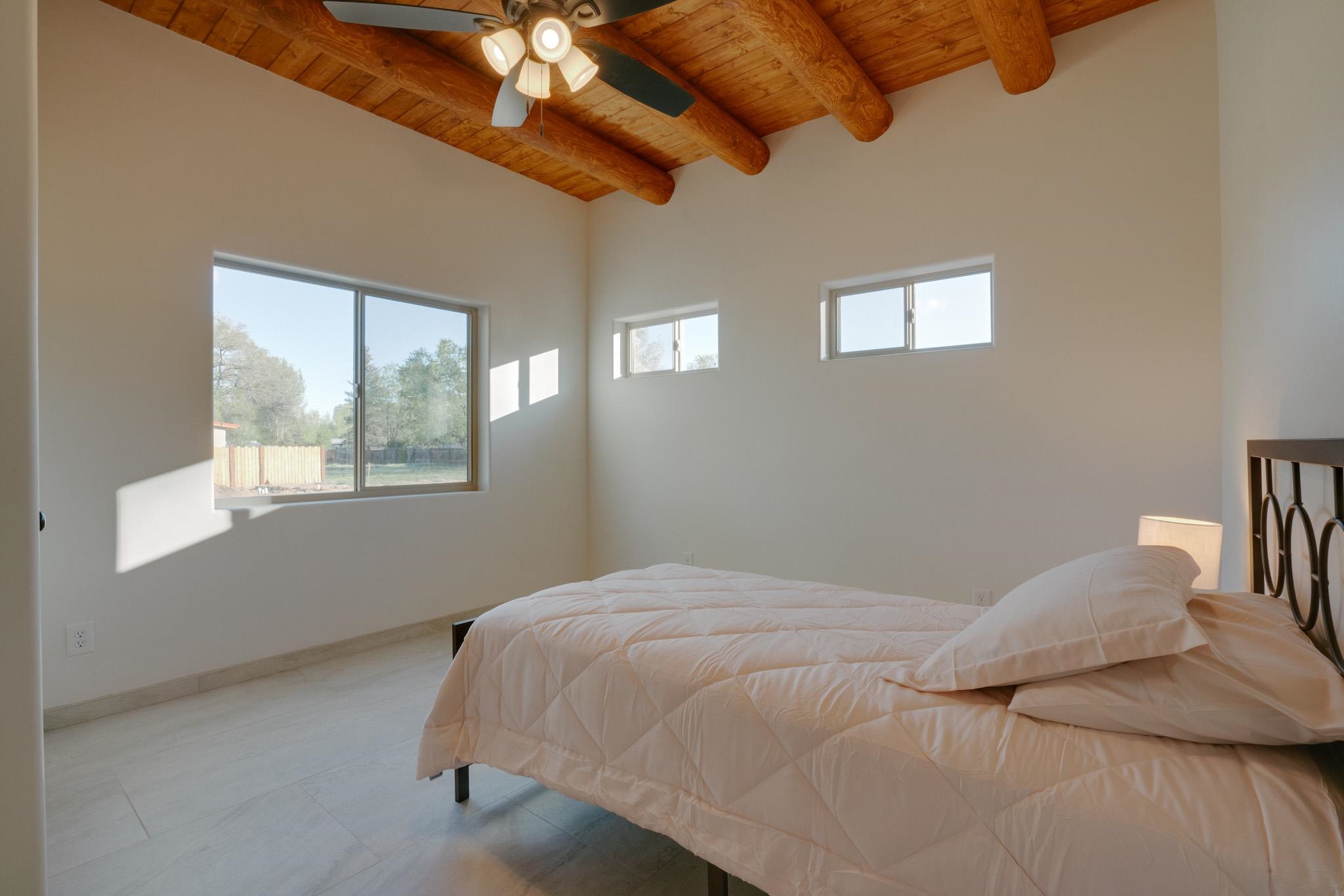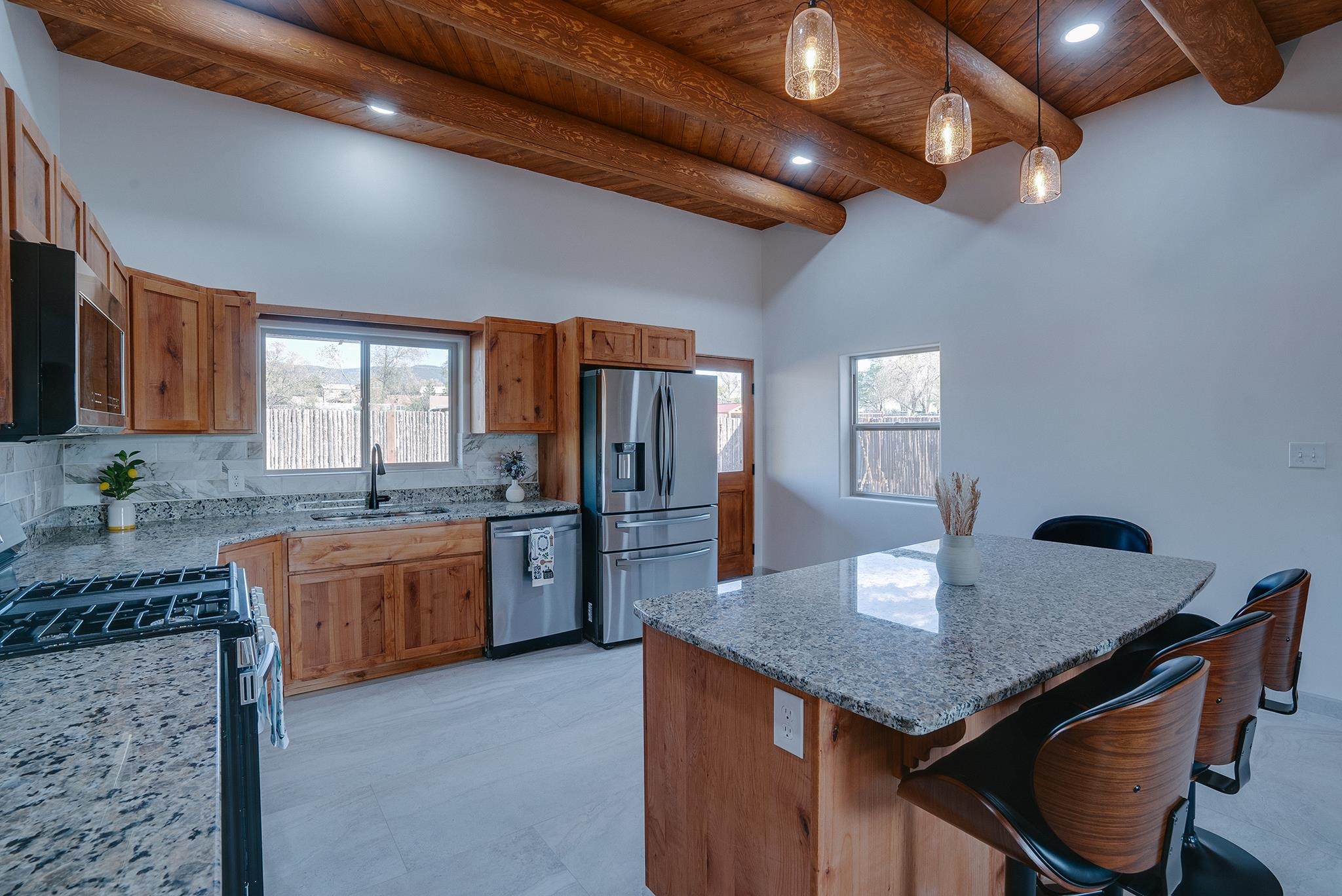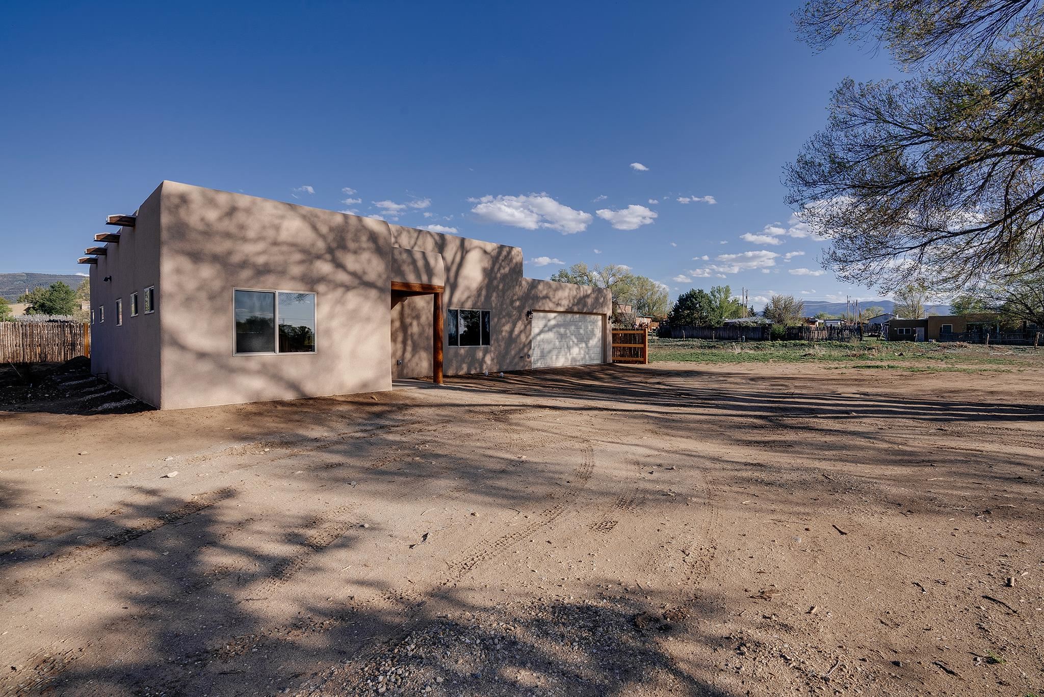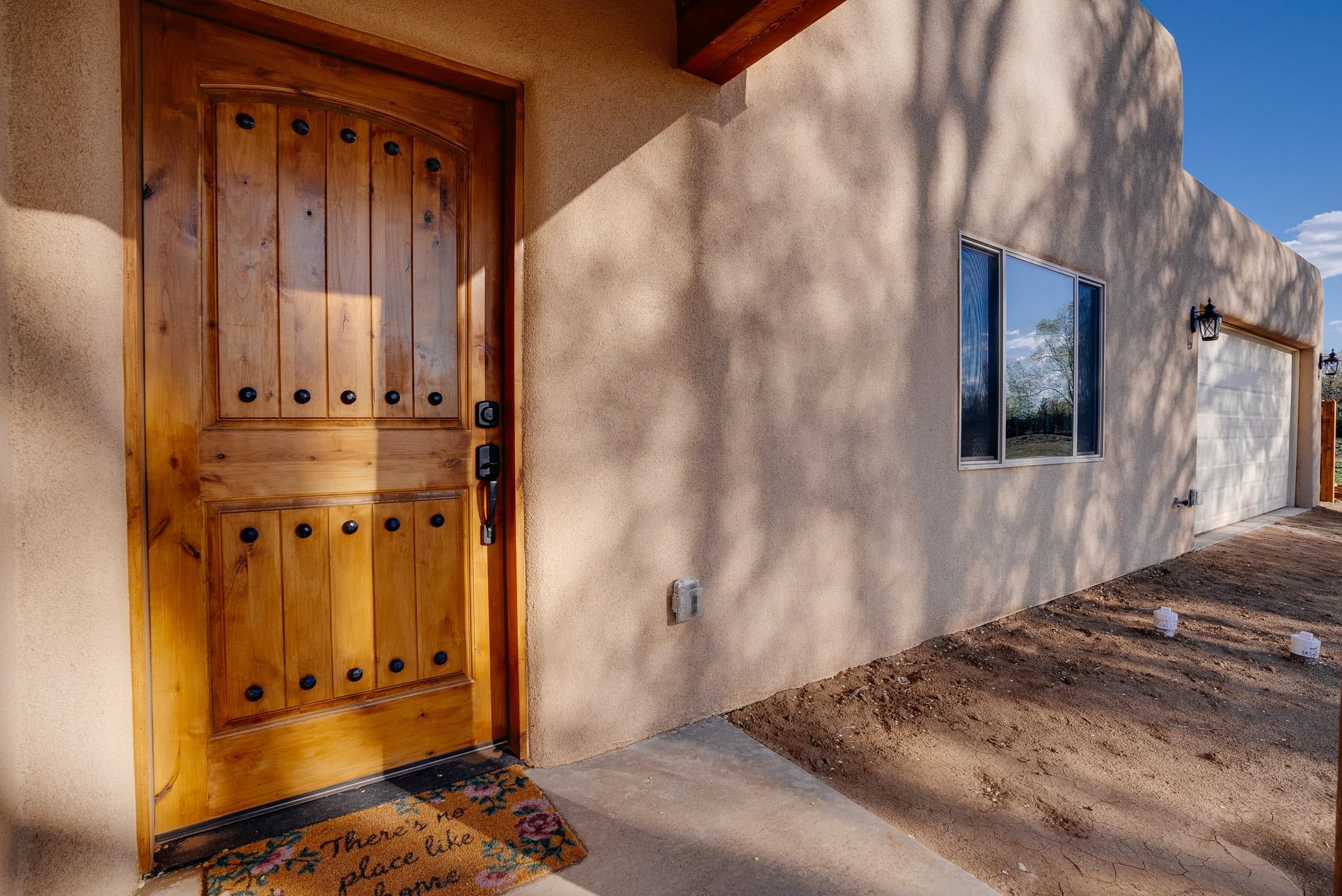 Truly exquisite!!! Newly constructed custom house. This house has outstanding craftsmanship featuring an open floor plan with Great Room and Kitchen. Two bedroom home with the primary bedroom having its own on-suite master bath and a large walk-in closet. The house has stunning vigas and tongue and grove throughout. The floors feature beautiful porcelain tile. The Kitchen is complete with custom made alder wood cabinets and stainless steel appliances. The kitchen and bathrooms feature granite countertops. The house has a Navian tankless water heater for instant hot water. The attached two-car garage is complete with radiant heating. This beauty sits on 0.25 acres and is centrally located; a short distance to grocery stores, shops, galleries, restaurants, schools, and shopping.