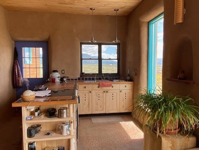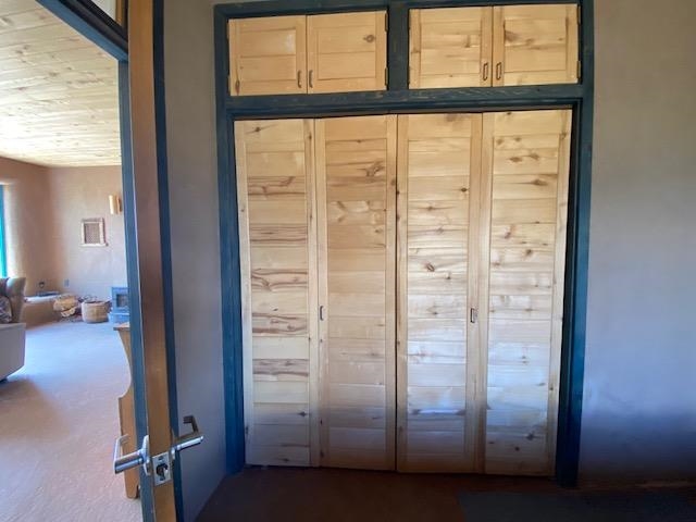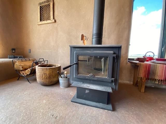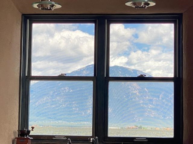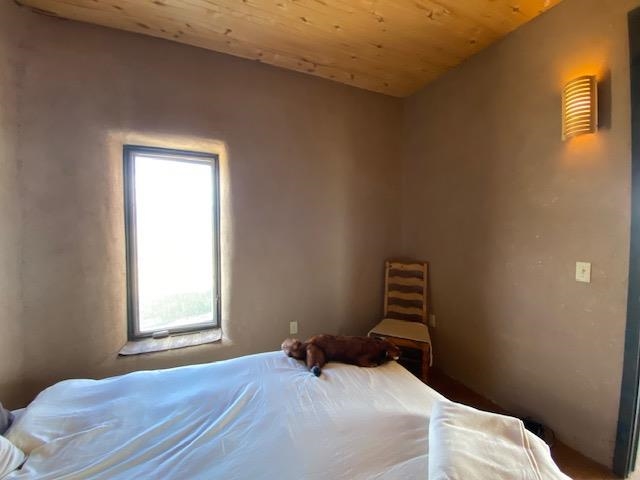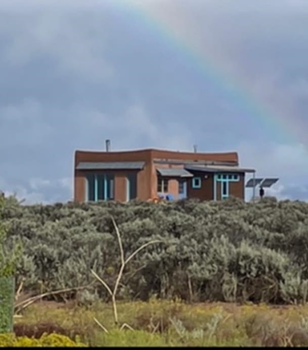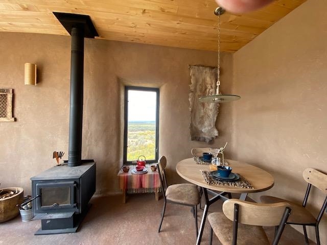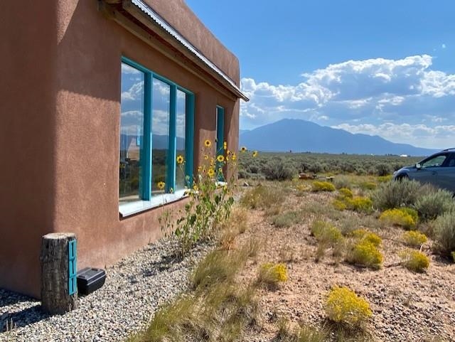 This energy-efficient strawbale house boasts sustainable features like solar panels and a cistern, making it an ideal choice for environmentally conscious buyers. The house, designed by an artist, has a simple design incorporating amazing views everywhere you look. The primary aspects of the house are that it is in accord with environmental principles, is located in a stunningly scenic environment, it has a beautiful totally hand-crafted interior, and it promotes and supports a simple lifestyle. The house also has electricity, and you can easily switch on the electricity if you want. Nestled in a picturesque location in Taos, with lots of privacy, the property offers breathtaking mountain views, 360-degree sunsets, and is conveniently close to Taos, Taos Ski Valley, and the Río Grande del Norte National Monument. The unique construction includes adobe straw plastered mud walls and a cozy woodstove, adding charm and a rustic touch to the home. The well-maintained driveway and concrete floors enhance the practicality and comfort of the living space. The driveway to the house has easy access to the highway and is well maintained and has a great surface to drive easily in and out of the property. The open concept design and cozy living room with a woodstove create a welcoming atmosphere, perfect for comfortable living. The house has been meticulously maintained by one owner, ensuring its excellent condition. Sustainable features include how the water from rain and snow on the roof is collected and channeled into the cistern. The energy efficient straw bale walls stabilize the temperature both in the summer and the winter. The mostly glass south wall provides passive solar heating during the winter. and the flooring material absorbs the solar heat during the day and slowly releases it during the night. The house has overhangs on the outside of the east and south walls, which keep out heat from sunlight during summer. Imagine waking up to stunning mountain views and enjoying cozy winter nights by the woodstove in this beautiful and sustainable home. Come see this absolutely enchanting off the grid property and imagine the possibilities of being the next owner of this unique and special house. This is a great house for a minimalist! There also is wood for the wood stove included!