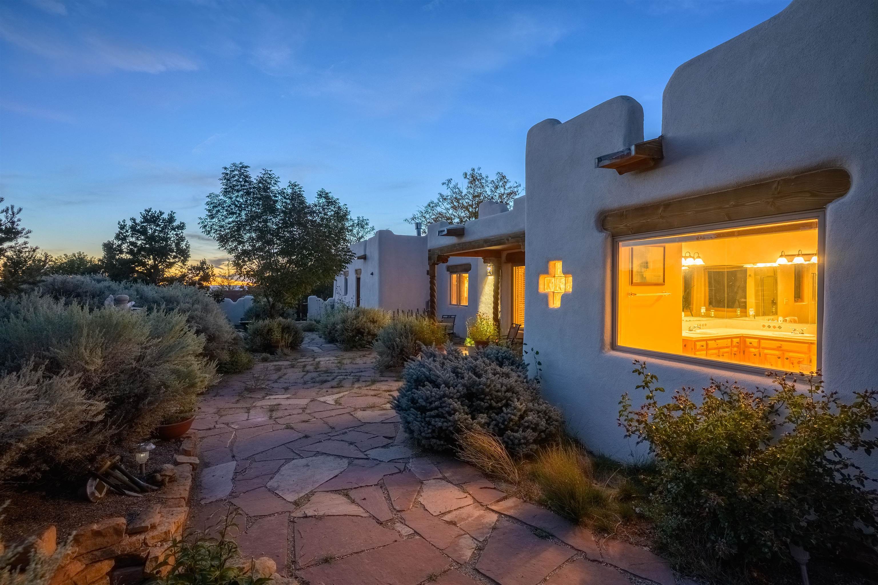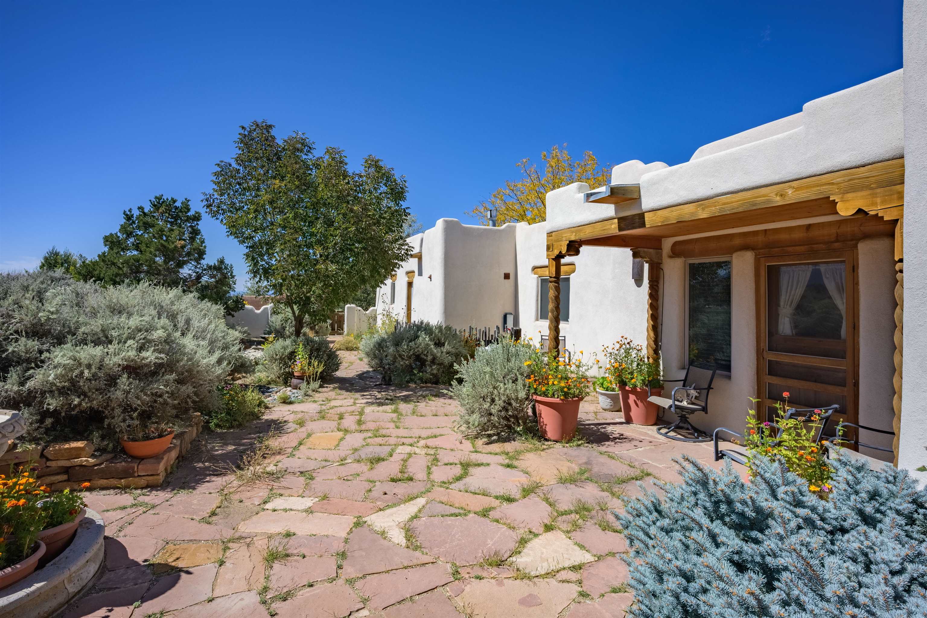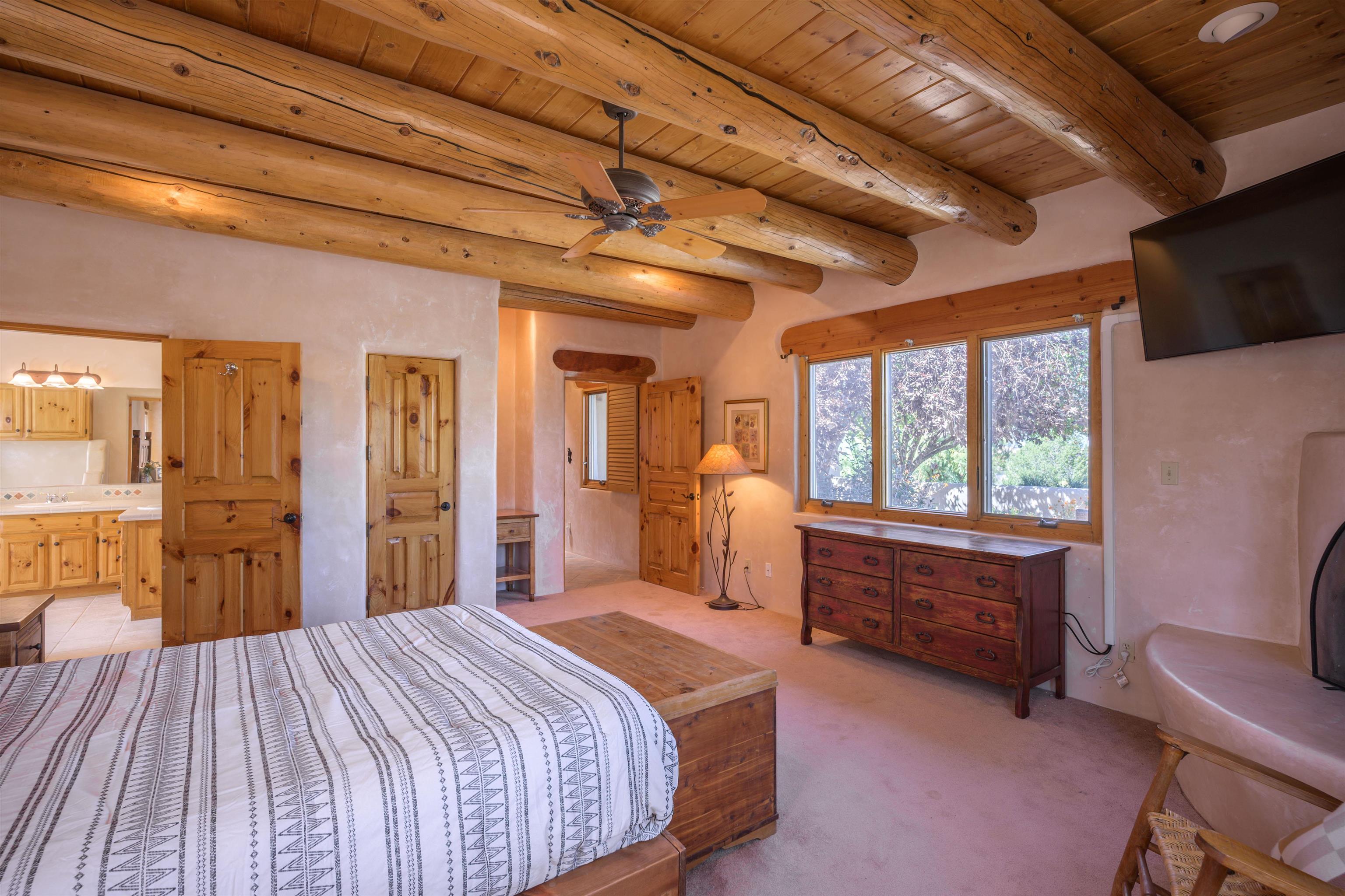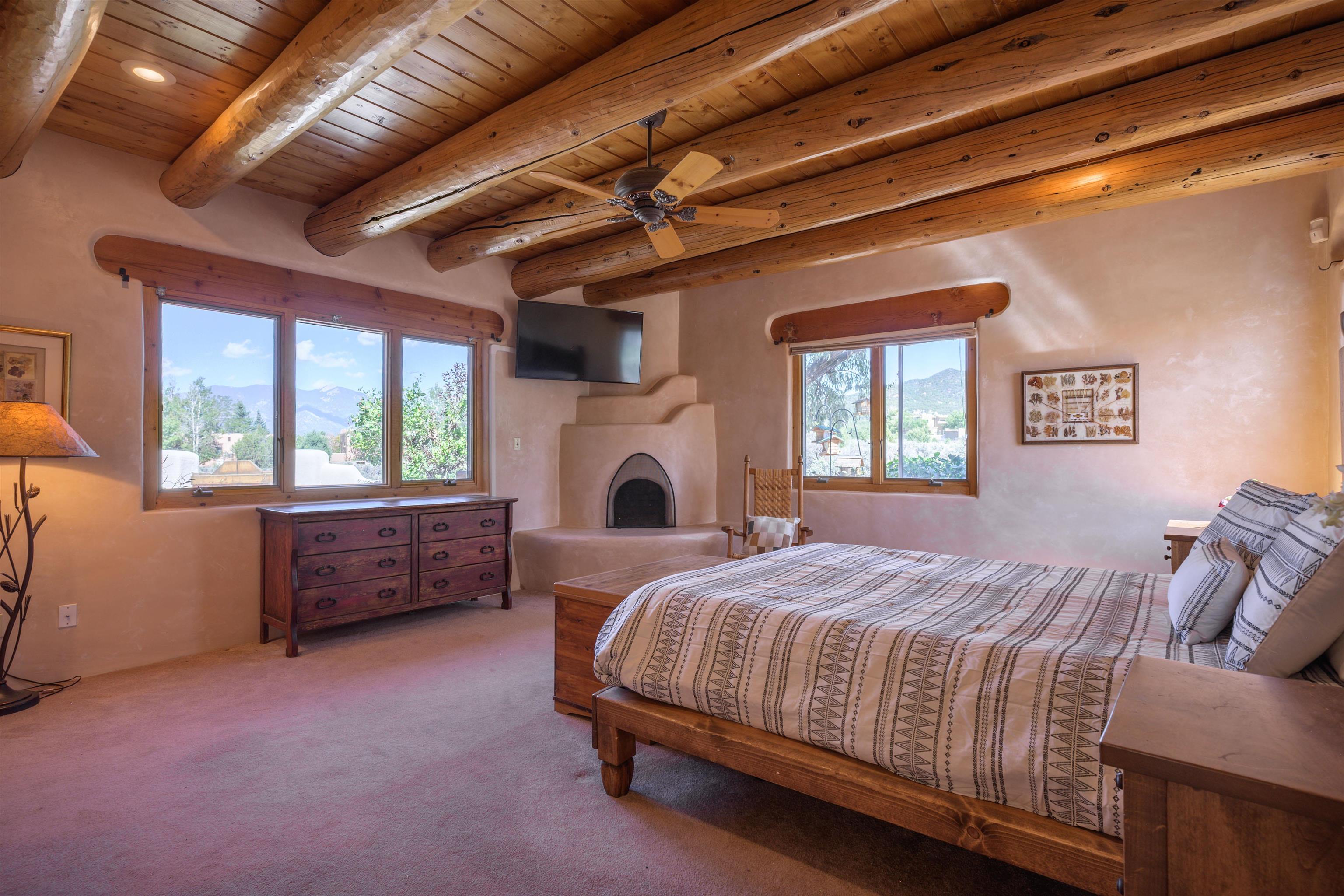 This home has been lovingly cared for by one owner. There is a new boiler for the radiant floor heat, new stucco and a recently coated brai roof. There are wonderful gardens all around the one acre lot and a jacuzzi to enjoy the night sky and sunset. Rooms are spacious with high ceilings, southwest style fireplaces in livingroom and primary bedroom with beautiful vigas and latillas. There is plenty of storage in the 2 car garage for all your activities!