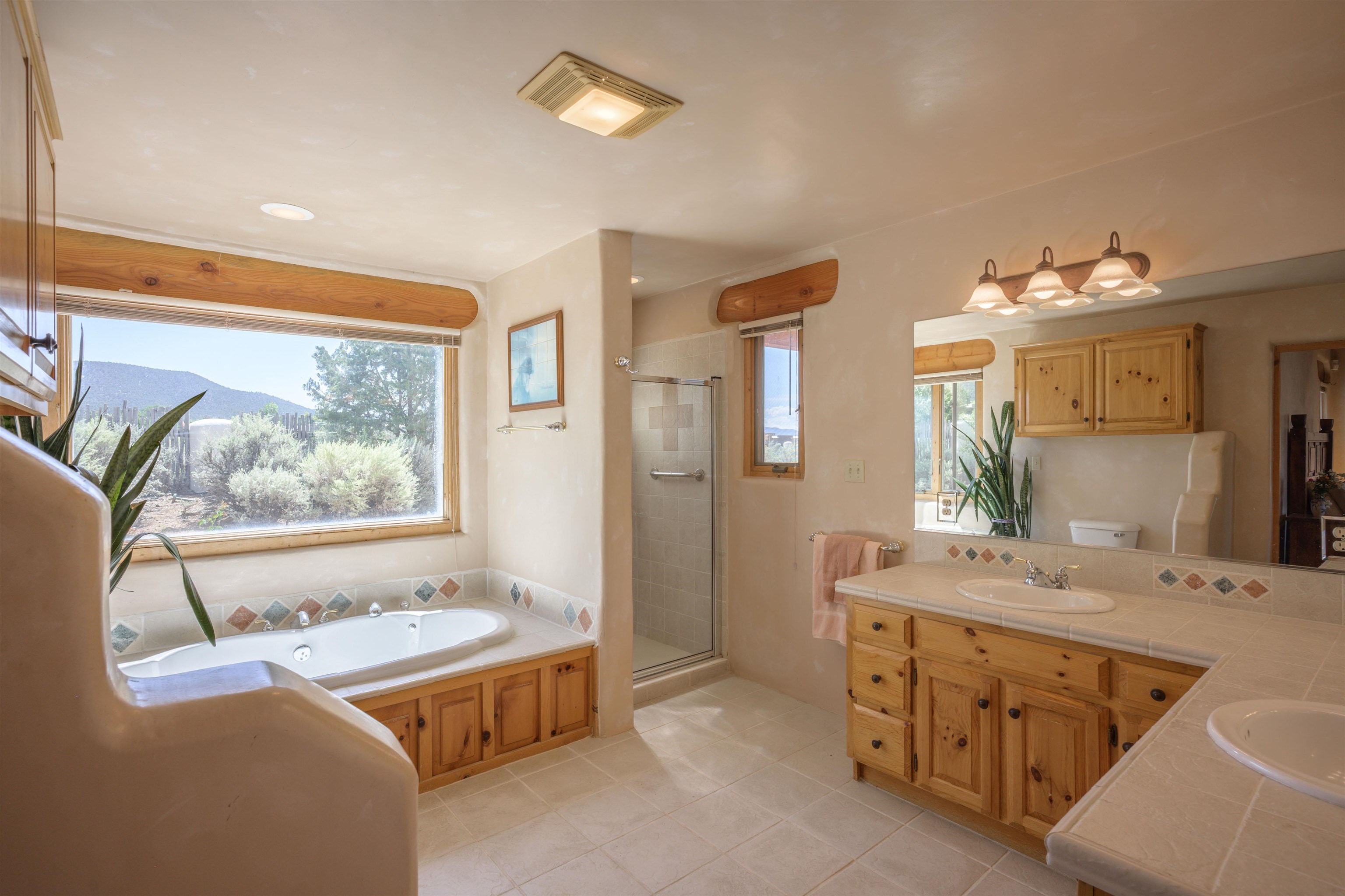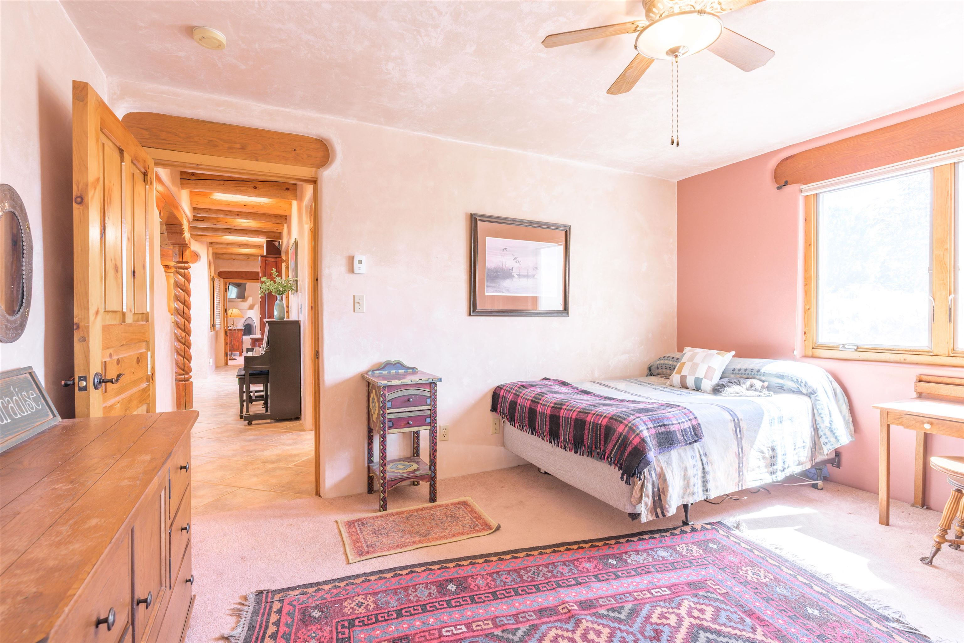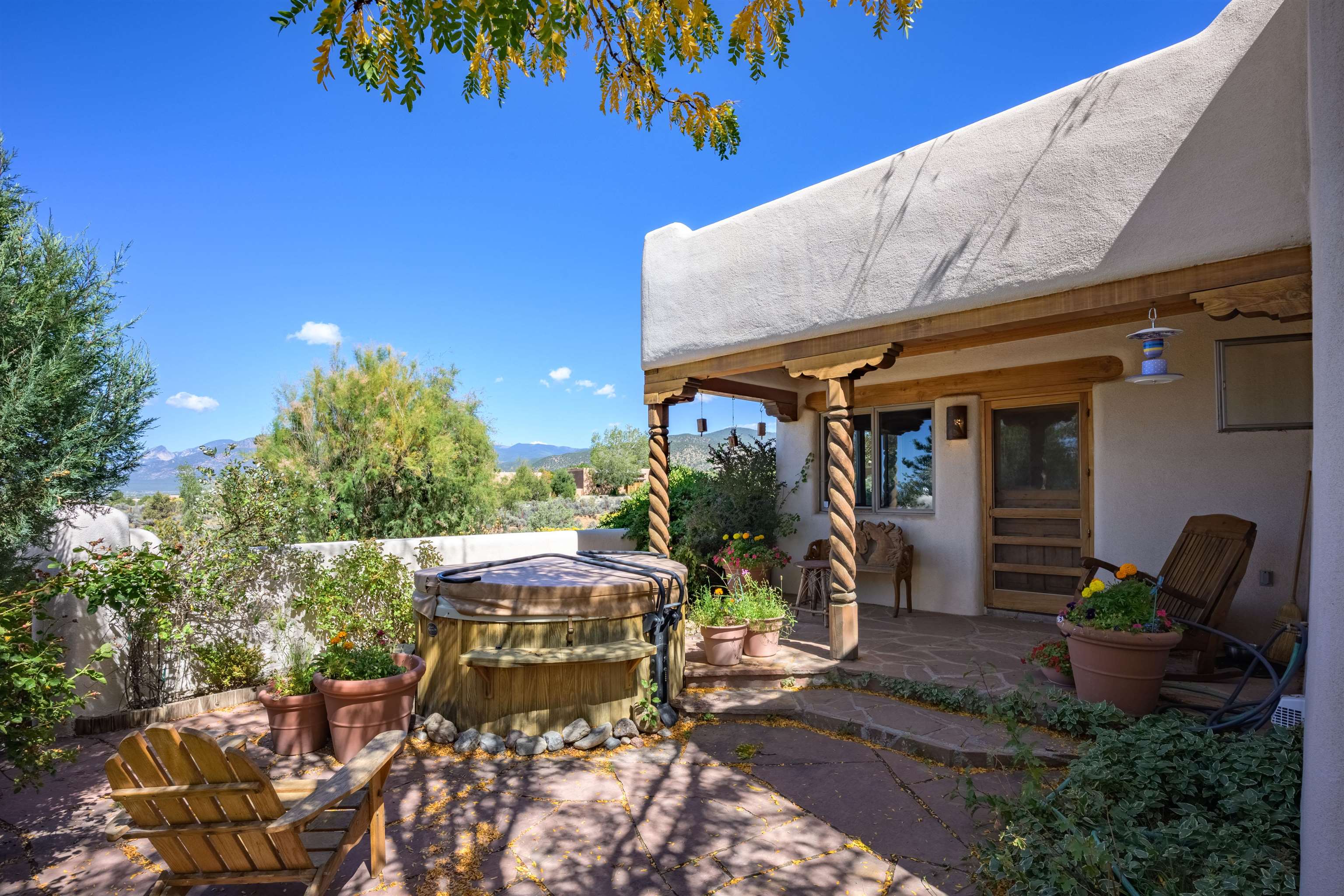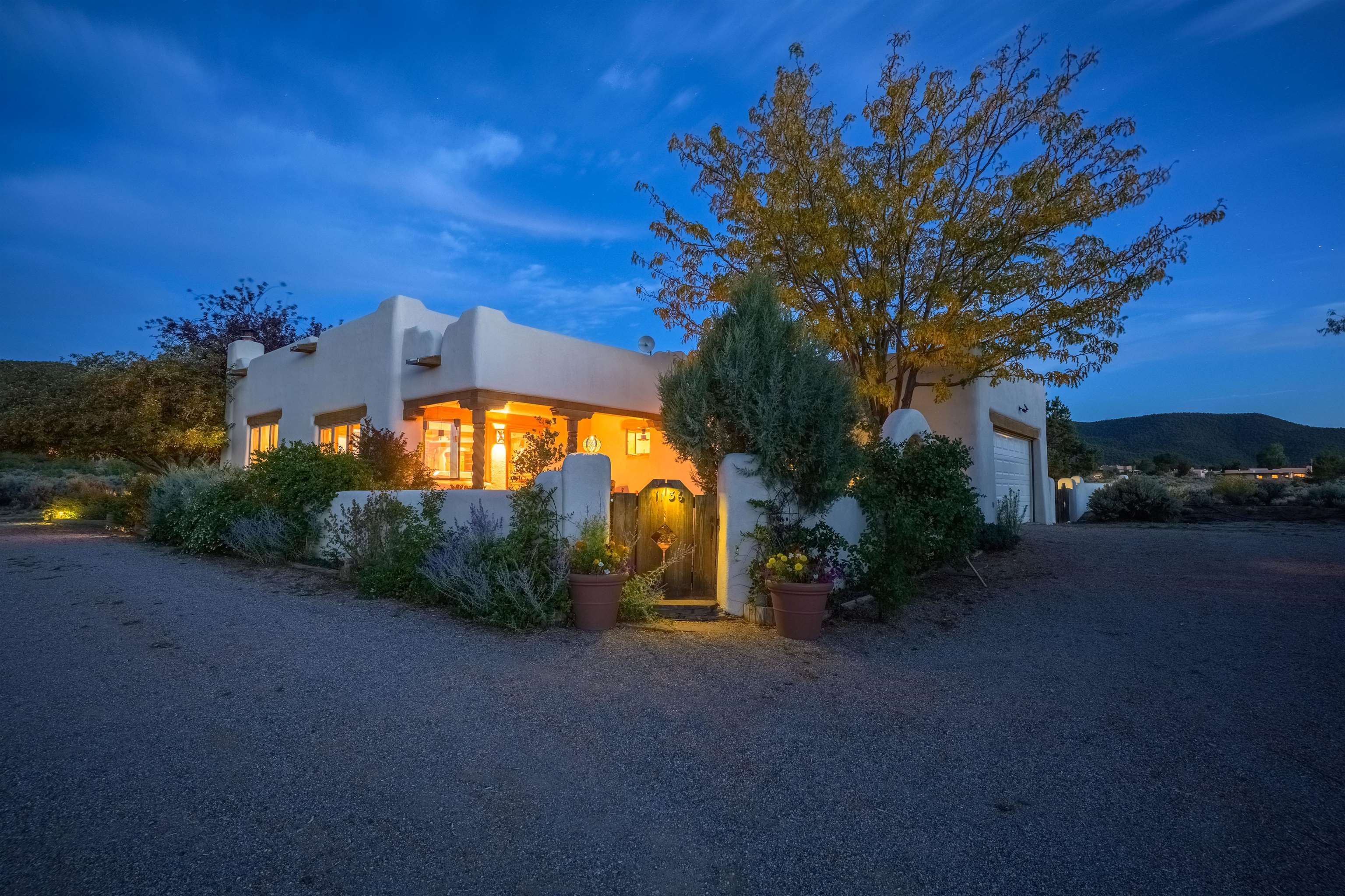 This home has been lovingly cared for by one owner. There is a new boiler for the radiant floor heat, new stucco and a recently coated brai roof. There are wonderful gardens all around the one acre lot and a jacuzzi to enjoy the night sky and sunset. Rooms are spacious with high ceilings, southwest style fireplaces in livingroom and primary bedroom with beautiful vigas and latillas. There is plenty of storage in the 2 car garage for all your activities!