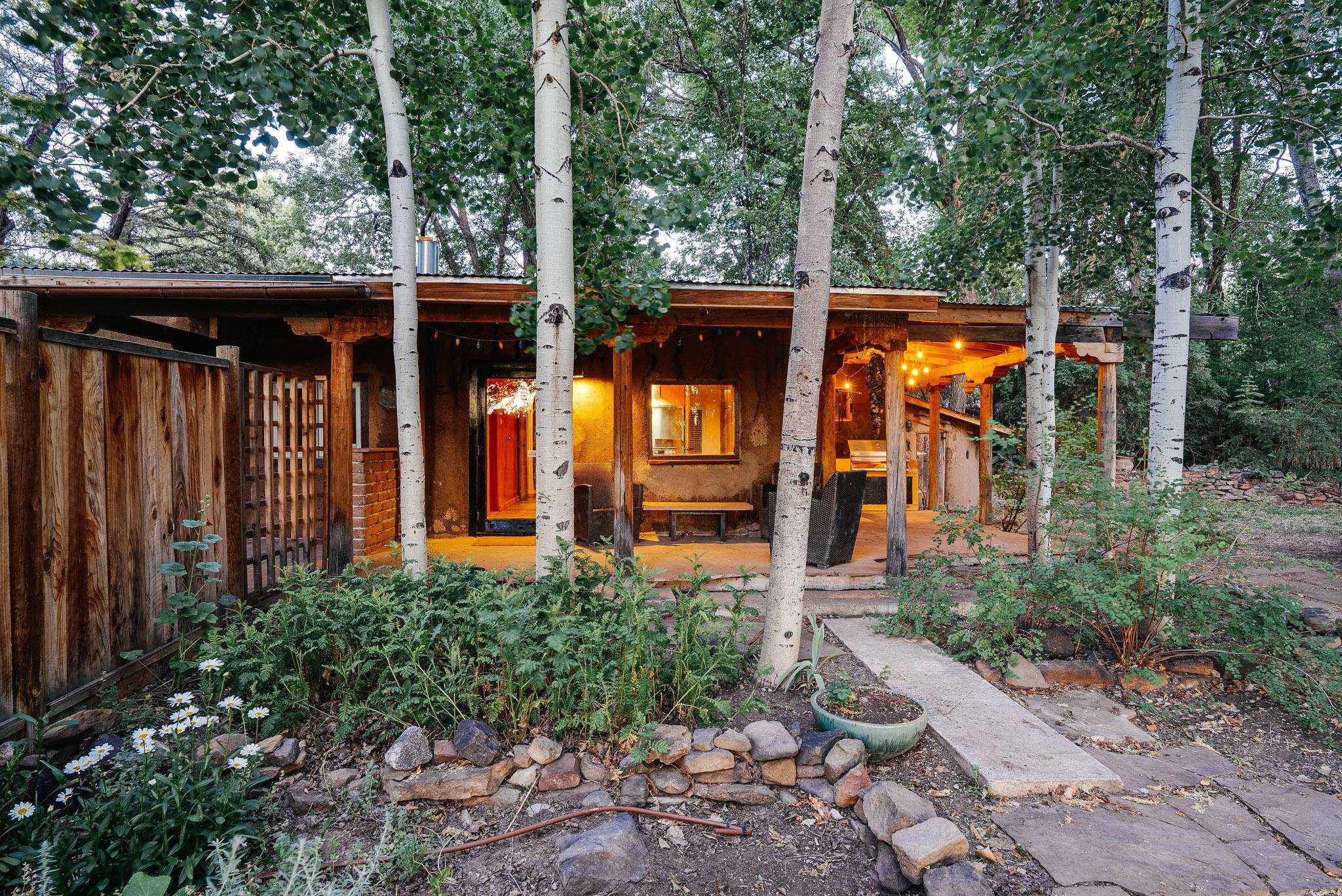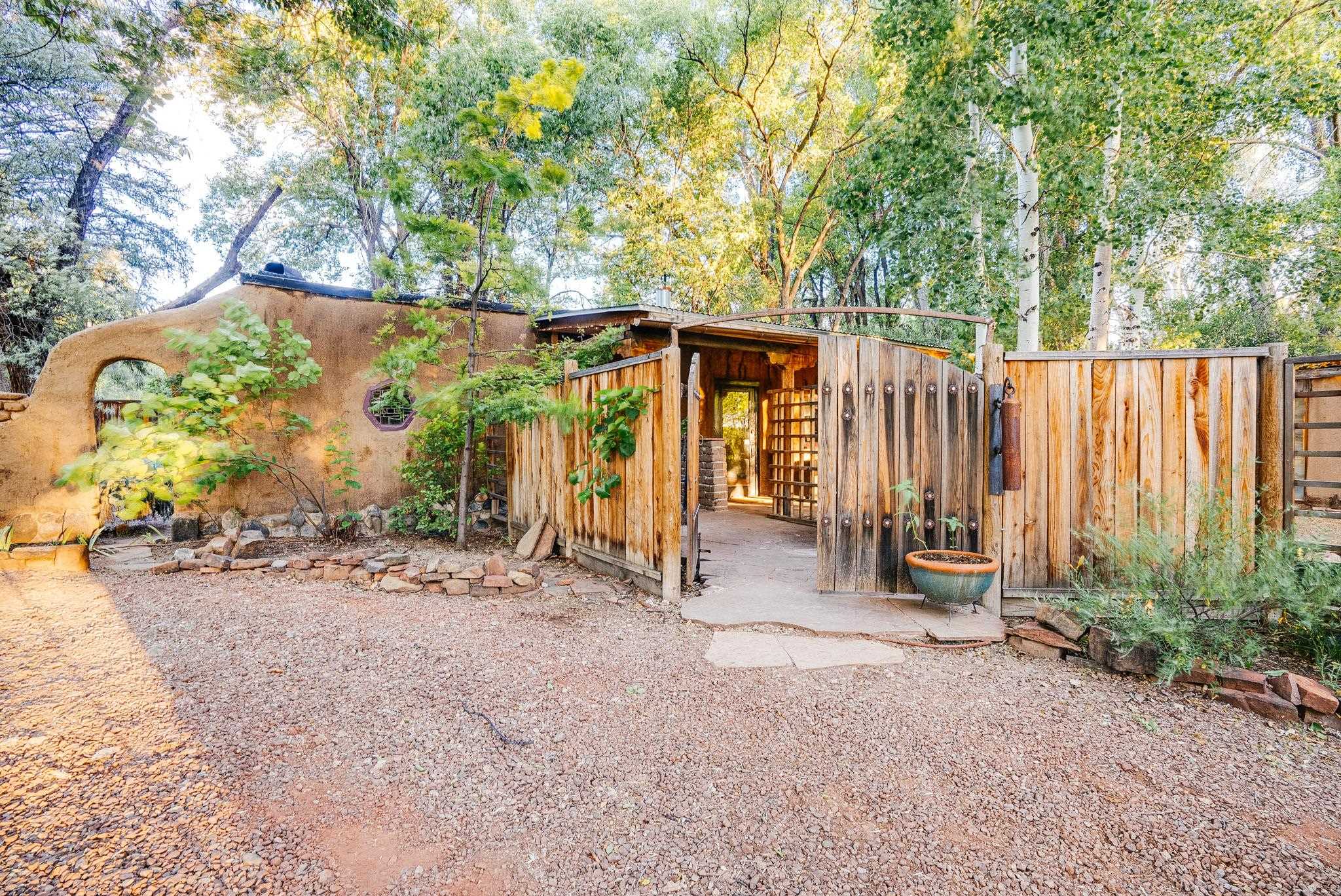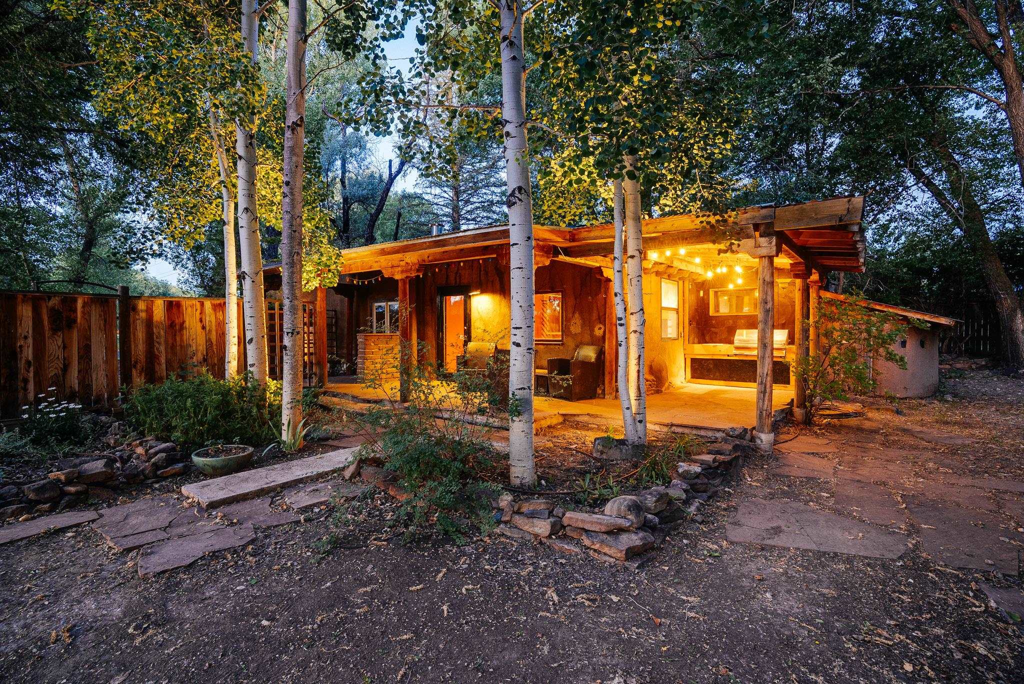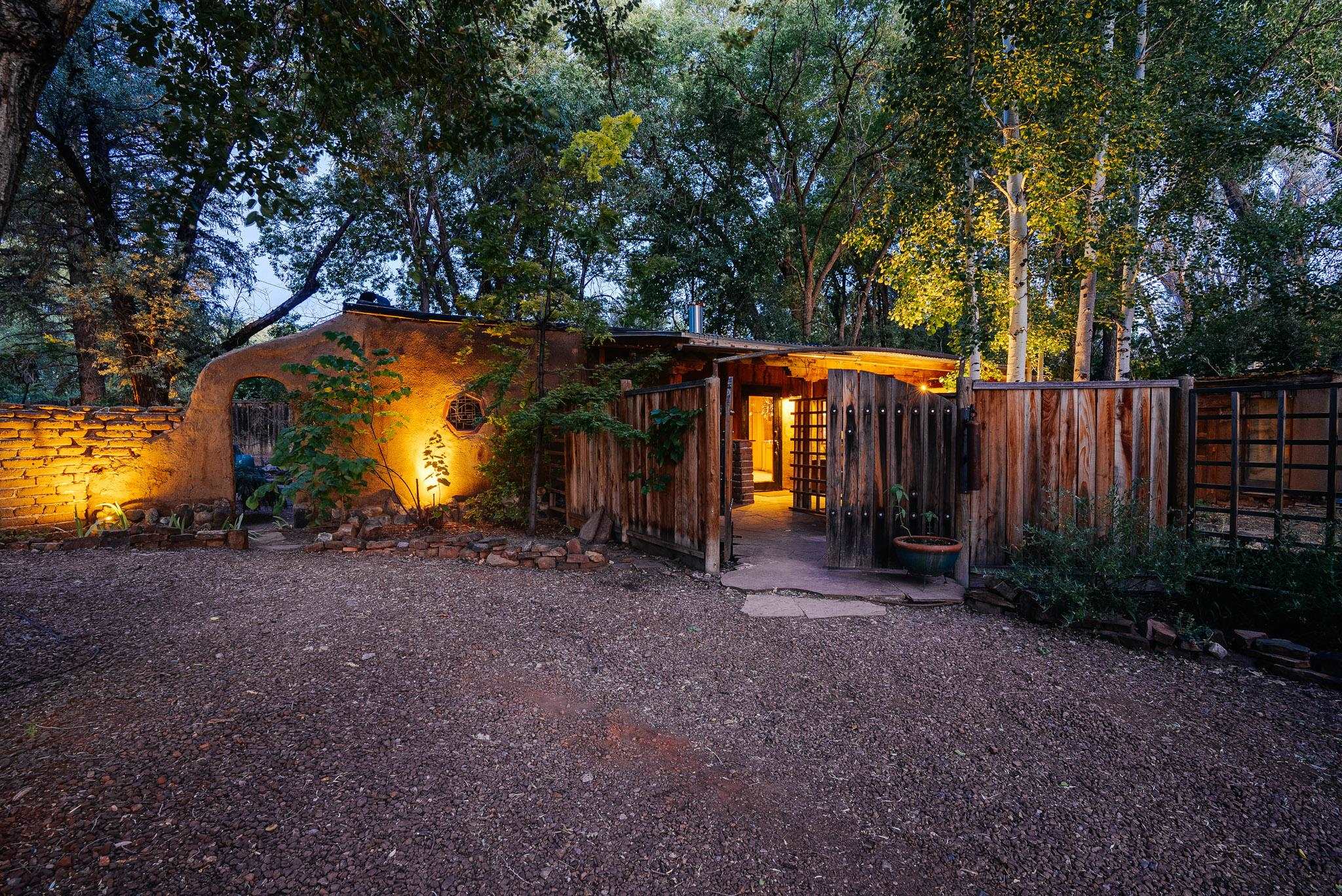 Step into a one-of-a-kind, in-town sanctuary amidst 300 trees where vintage charm meets thoughtful design. Built somewhere between 1900 and 1940's (sometimes it's difficult to know with old adobes), and lovingly restored by an architect and landscape architect, this distinctive property blends historic character with rustic artistry. Alpacas in the distance (on a neighbor's property so you can enjoy them, but you don't have to take care of them) and adjacent green Taos Pueblo land that attracts abundant bird life greet you as you drive through one of two gates into this park-like setting. Nestled in the trees for cool summer days, this property is a unique and special gem. Prepare to be transported into another world, stylishly protected by hand-built lattice privacy screens that shield you in your private oasis, yet in an ideal location allowing you to enjoy all the perks of being close to restaurants, galleries, museums. Listen to the flutter of the leaves playing in the wind from your own personal aspen grove: 96 to call your own and admire from your spacious, flagstone front porch and leave the world behind. Once inside ,discover thick adobe walls, spiral carved posts, a vibrant and tasteful color palette, hand-forged iron details, a gorgeous geometric stained glass window and three skylights that welcome bright sunlight to dance throughout the home, enhancing the connection between indoors and out. A stylish and functional work-horse of a fireplace heats the home and anchors the living room to keep you cozy and warm on cold wintery days, along side an open chef's kitchen that will make entertaining friends and family an absolute joy- and if you want to expand the party, there is also an outdoor kitchen.The bedroom and bathroom feature custom storage, designed and built by the architect for function, style and beauty. A second bedroom also has laundry. In true Taos fashion, there are some very unique aspects to this property: an old sweat lodge dating from the 1960's and and old adobe structure that could be restored (or taken down, your choice-sellers will remove it if that is your wish) and the exterior of the house which is rough, hand-troweled adobe. There is even a spacious and 6x10 shed/workshop with natural light, glass door and window to allow light in and store all your gear or indulge your creativity. For added convenience, the property is on town sewer and its own well. The sellers have design drawings for an additional bedroom/bathroom and studio to inspire you. Book a showing today, this is a property you don't want to miss.