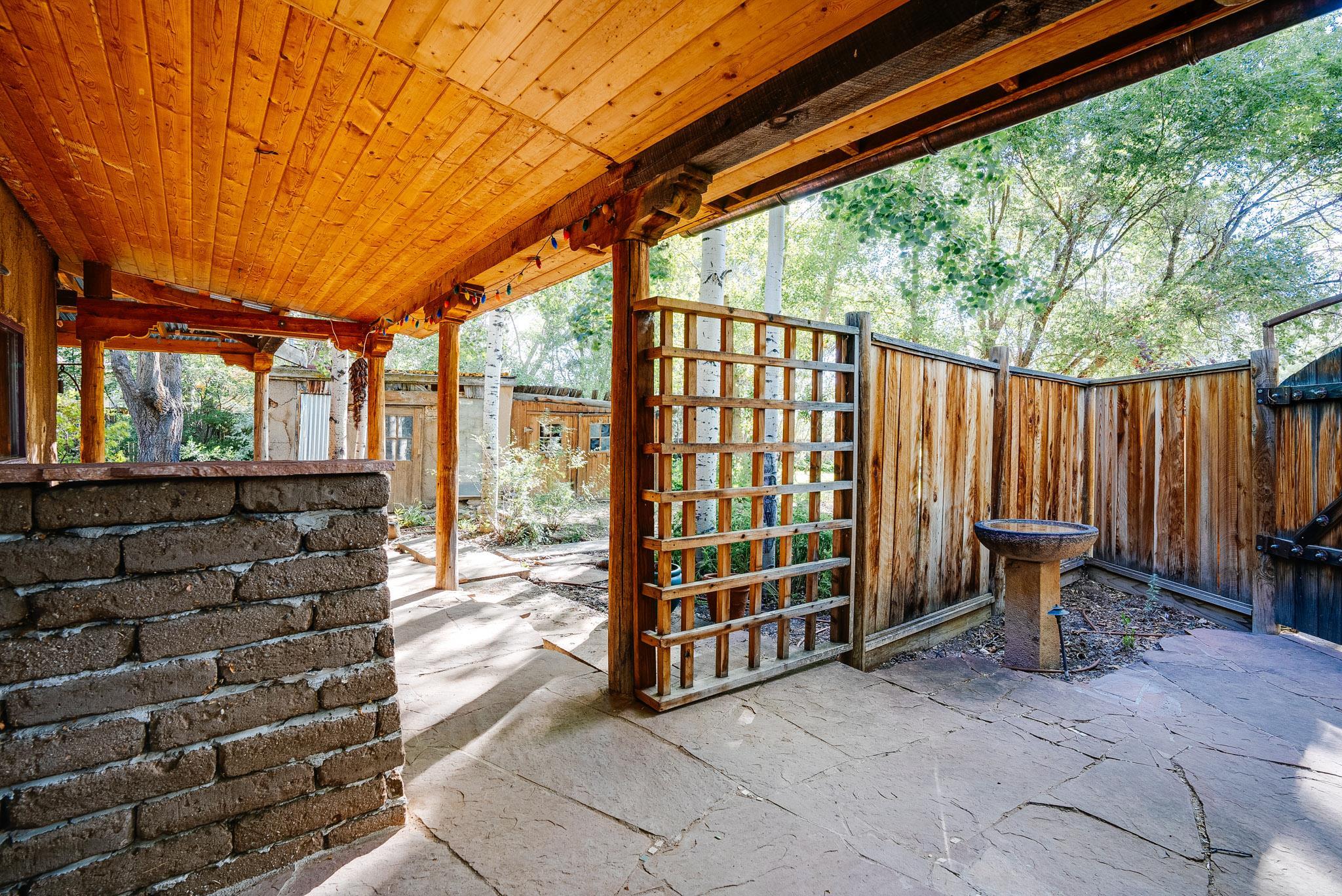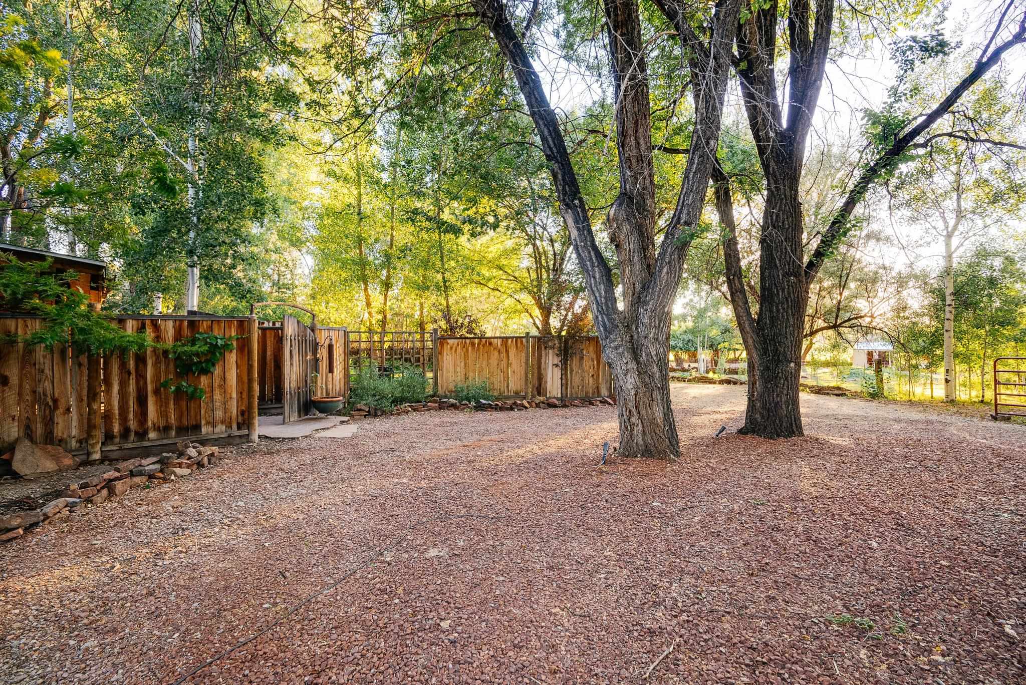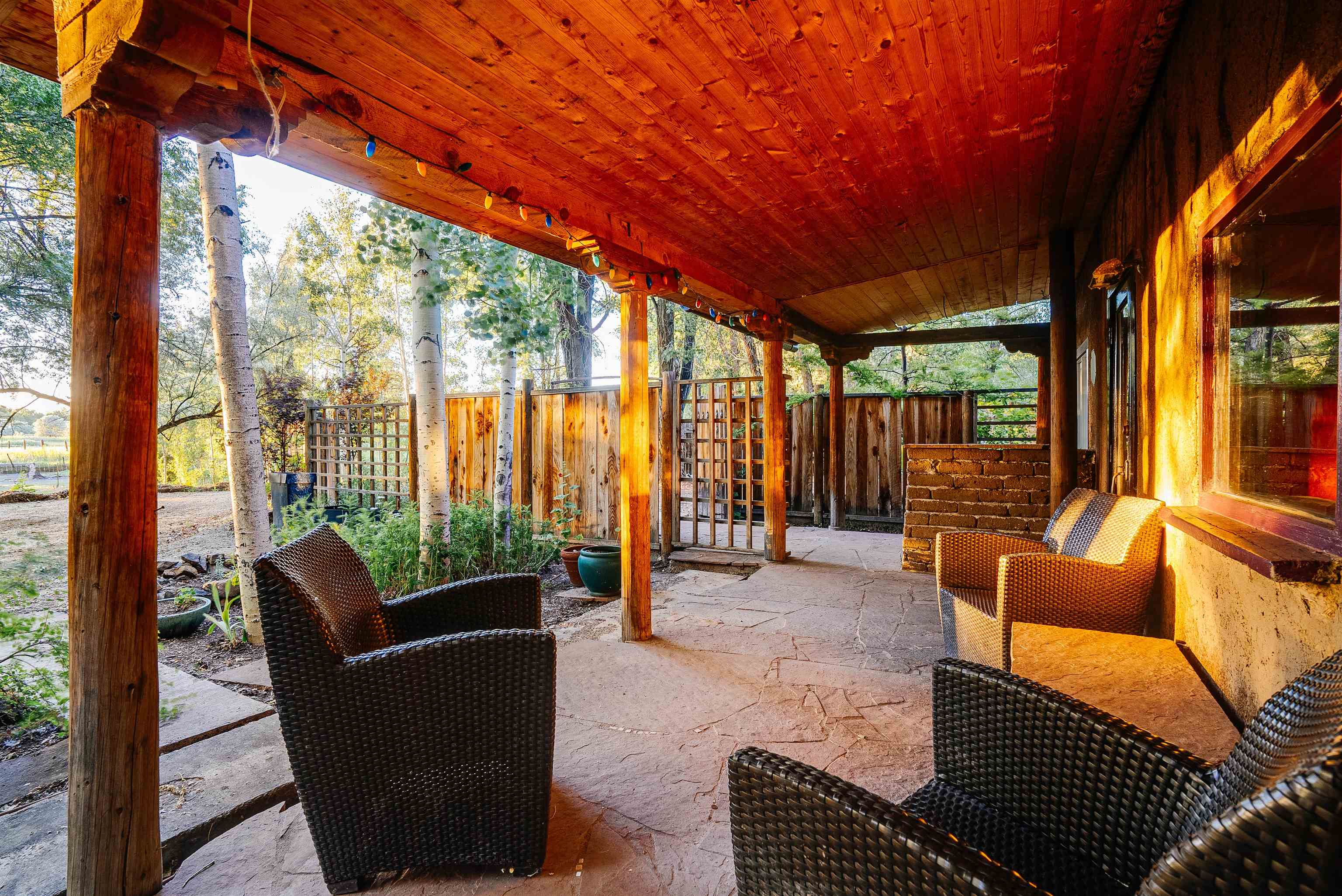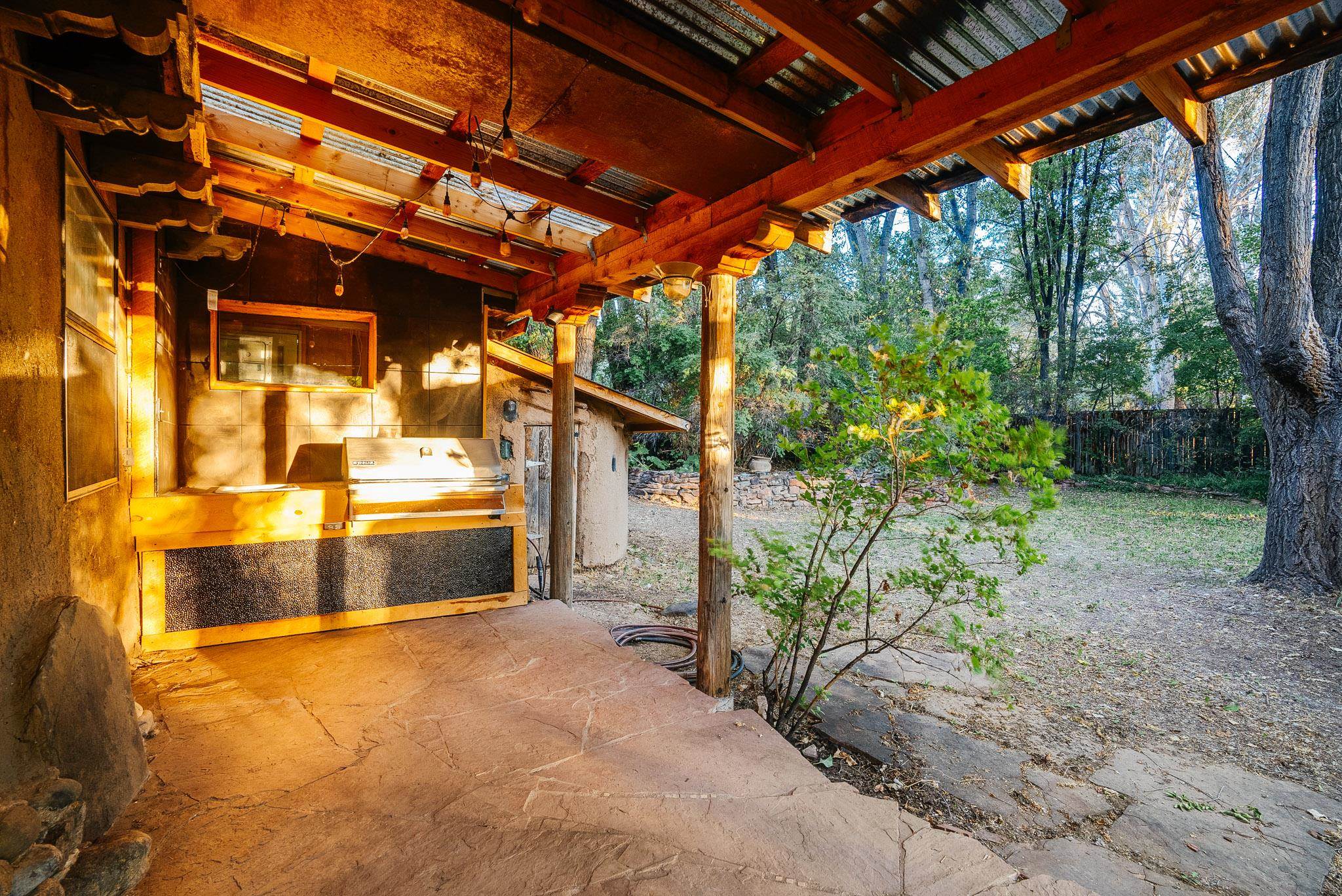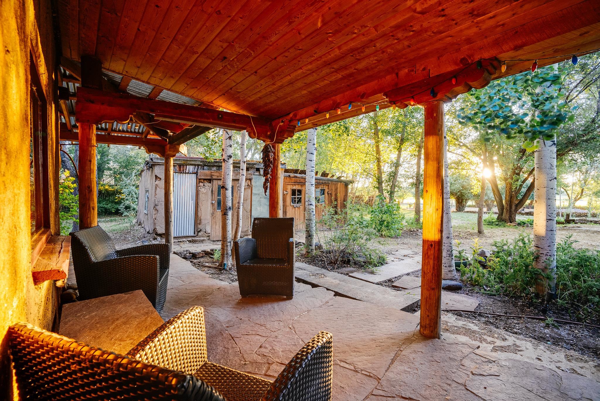 Step into a one-of-a-kind, in-town sanctuary amidst 300 trees where vintage charm meets thoughtful design. Built somewhere between 1900 and 1940's (sometimes it's difficult to know with old adobes), and lovingly restored by an architect and landscape architect, this distinctive property blends historic character with rustic artistry. Alpacas in the distance (on a neighbor's property so you can enjoy them, but you don't have to take care of them) and adjacent green Taos Pueblo land that attracts abundant bird life greet you as you drive through one of two gates into this park-like setting. Nestled in the trees for cool summer days, this property is a unique and special gem. Prepare to be transported into another world, stylishly protected by hand-built lattice privacy screens that shield you in your private oasis, yet in an ideal location allowing you to enjoy all the perks of being close to restaurants, galleries, museums. Listen to the flutter of the leaves playing in the wind from your own personal aspen grove: 96 to call your own and admire from your spacious, flagstone front porch and leave the world behind. Once inside ,discover thick adobe walls, spiral carved posts, a vibrant and tasteful color palette, hand-forged iron details, a gorgeous geometric stained glass window and three skylights that welcome bright sunlight to dance throughout the home, enhancing the connection between indoors and out. A stylish and functional work-horse of a fireplace heats the home and anchors the living room to keep you cozy and warm on cold wintery days, along side an open chef's kitchen that will make entertaining friends and family an absolute joy- and if you want to expand the party, there is also an outdoor kitchen.The bedroom and bathroom feature custom storage, designed and built by the architect for function, style and beauty. A second bedroom also has laundry. In true Taos fashion, there are some very unique aspects to this property: an old sweat lodge dating from the 1960's and and old adobe structure that could be restored (or taken down, your choice-sellers will remove it if that is your wish) and the exterior of the house which is rough, hand-troweled adobe. There is even a spacious and 6x10 shed/workshop with natural light, glass door and window to allow light in and store all your gear or indulge your creativity. For added convenience, the property is on town sewer and its own well. The sellers have design drawings for an additional bedroom/bathroom and studio to inspire you. Book a showing today, this is a property you don't want to miss.