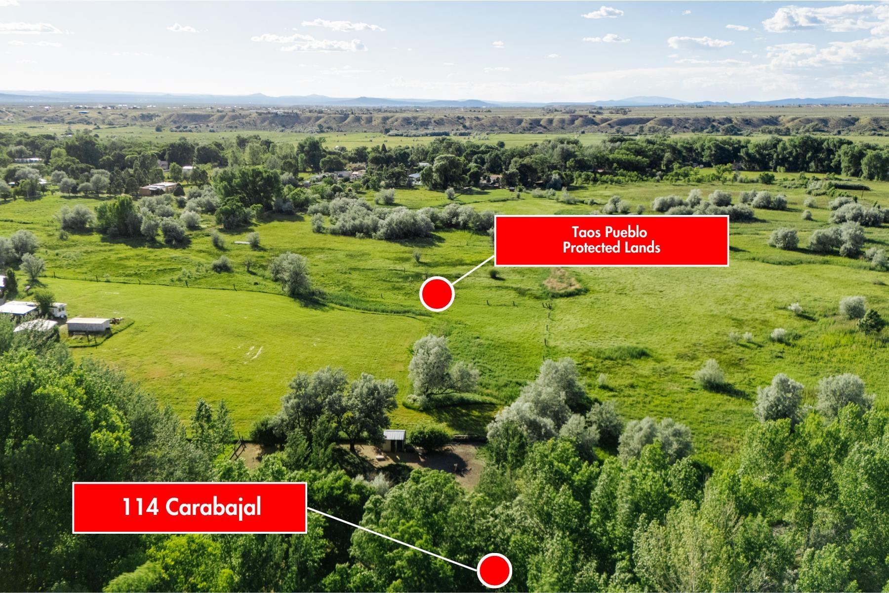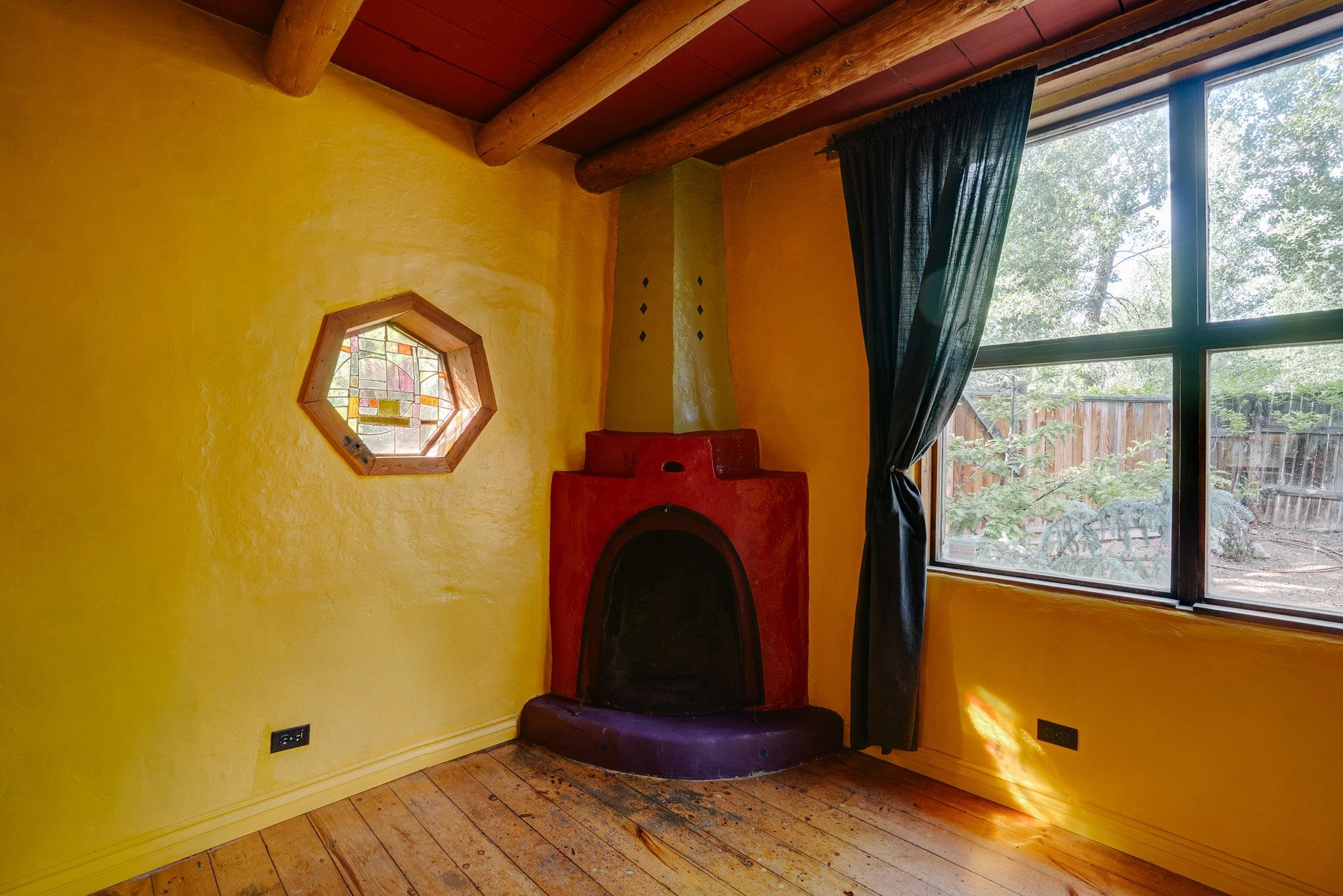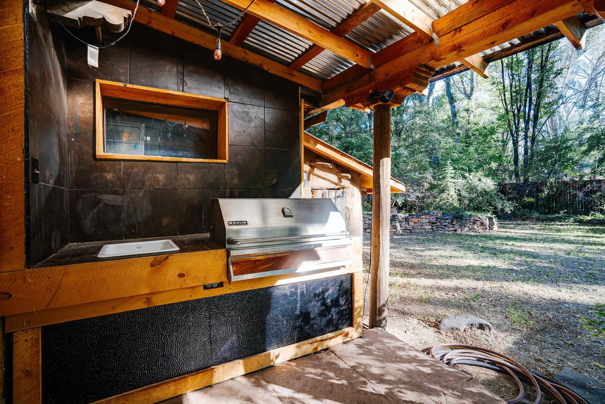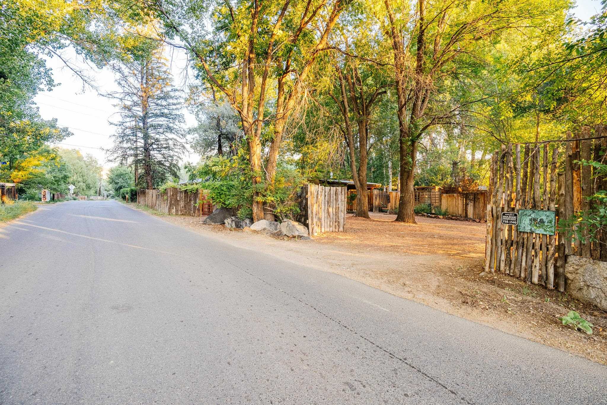 Step into a one-of-a-kind, in-town sanctuary amidst 300 trees where vintage charm meets thoughtful design. Built somewhere between 1900 and 1940's (sometimes it's difficult to know with old adobes), and lovingly restored by an architect and landscape architect, this distinctive property blends historic character with rustic artistry. Alpacas in the distance (on a neighbor's property so you can enjoy them, but you don't have to take care of them) and adjacent green Taos Pueblo land that attracts abundant bird life greet you as you drive through one of two gates into this park-like setting. Nestled in the trees for cool summer days, this property is a unique and special gem. Prepare to be transported into another world, stylishly protected by hand-built lattice privacy screens that shield you in your private oasis, yet in an ideal location allowing you to enjoy all the perks of being close to restaurants, galleries, museums. Listen to the flutter of the leaves playing in the wind from your own personal aspen grove: 96 to call your own and admire from your spacious, flagstone front porch and leave the world behind. Once inside ,discover thick adobe walls, spiral carved posts, a vibrant and tasteful color palette, hand-forged iron details, a gorgeous geometric stained glass window and three skylights that welcome bright sunlight to dance throughout the home, enhancing the connection between indoors and out. A stylish and functional work-horse of a fireplace heats the home and anchors the living room to keep you cozy and warm on cold wintery days, along side an open chef's kitchen that will make entertaining friends and family an absolute joy- and if you want to expand the party, there is also an outdoor kitchen.The bedroom and bathroom feature custom storage, designed and built by the architect for function, style and beauty. A second bedroom also has laundry. In true Taos fashion, there are some very unique aspects to this property: an old sweat lodge dating from the 1960's and and old adobe structure that could be restored (or taken down, your choice-sellers will remove it if that is your wish) and the exterior of the house which is rough, hand-troweled adobe. There is even a spacious and 6x10 shed/workshop with natural light, glass door and window to allow light in and store all your gear or indulge your creativity. For added convenience, the property is on town sewer and its own well. The sellers have design drawings for an additional bedroom/bathroom and studio to inspire you. Book a showing today, this is a property you don't want to miss.