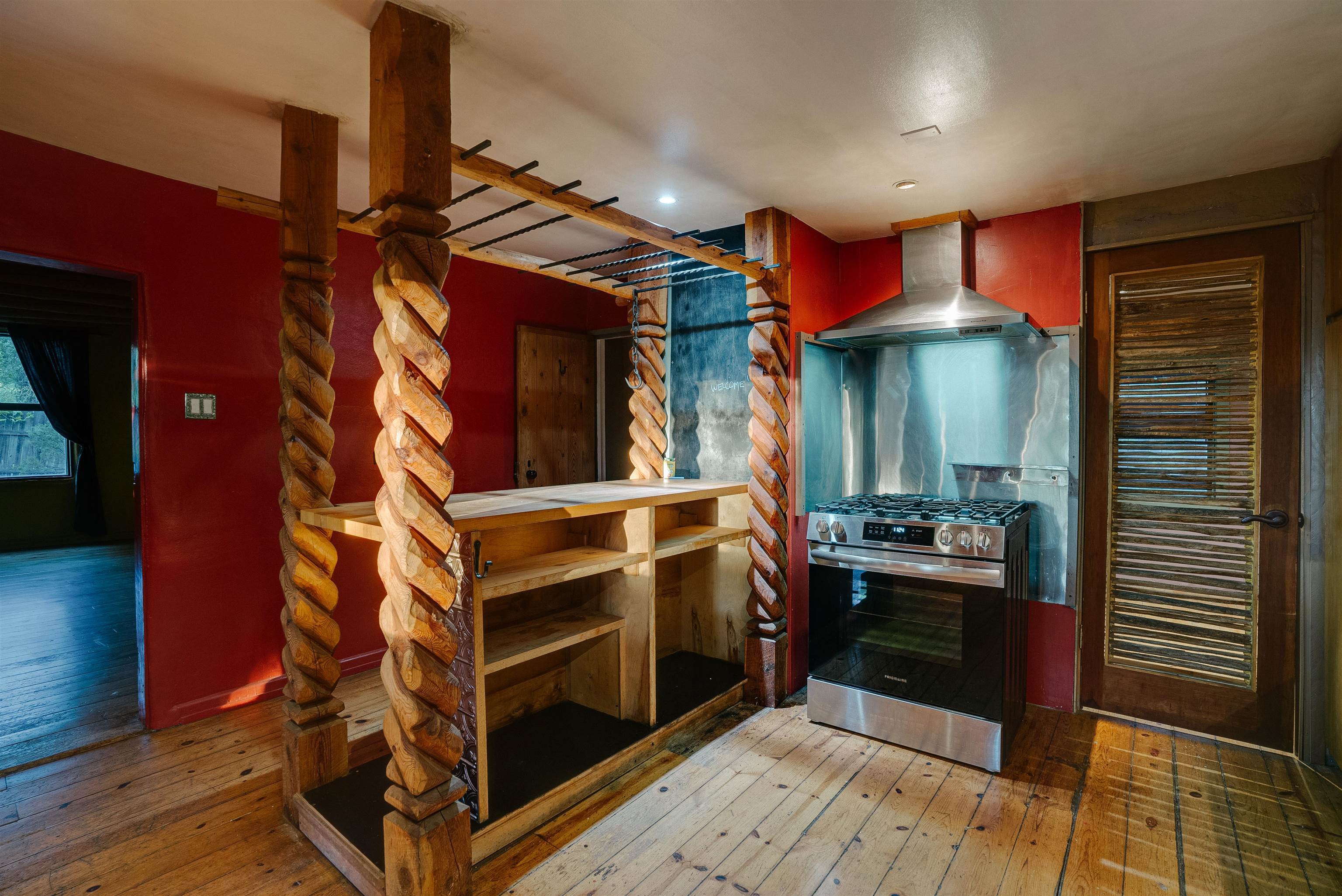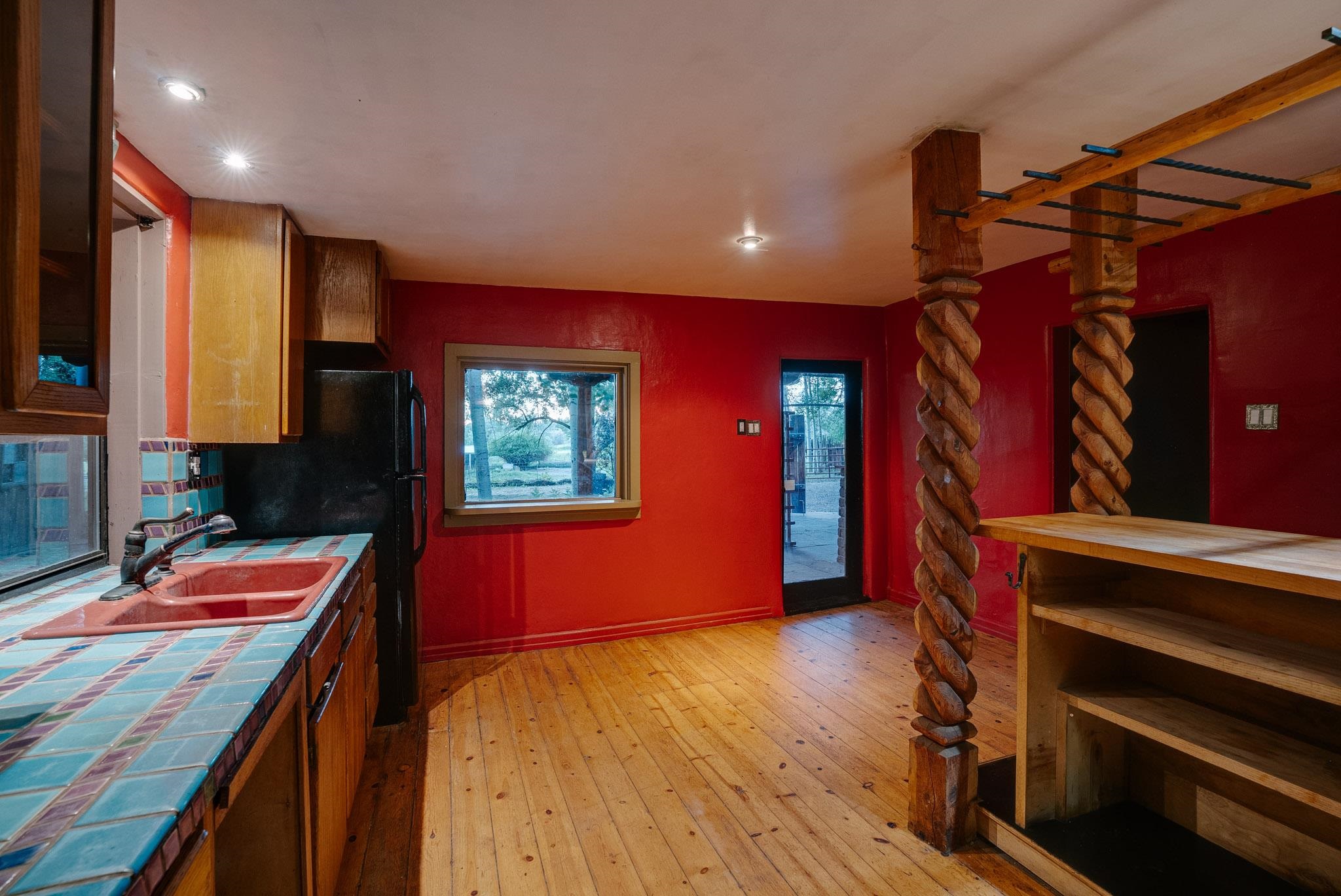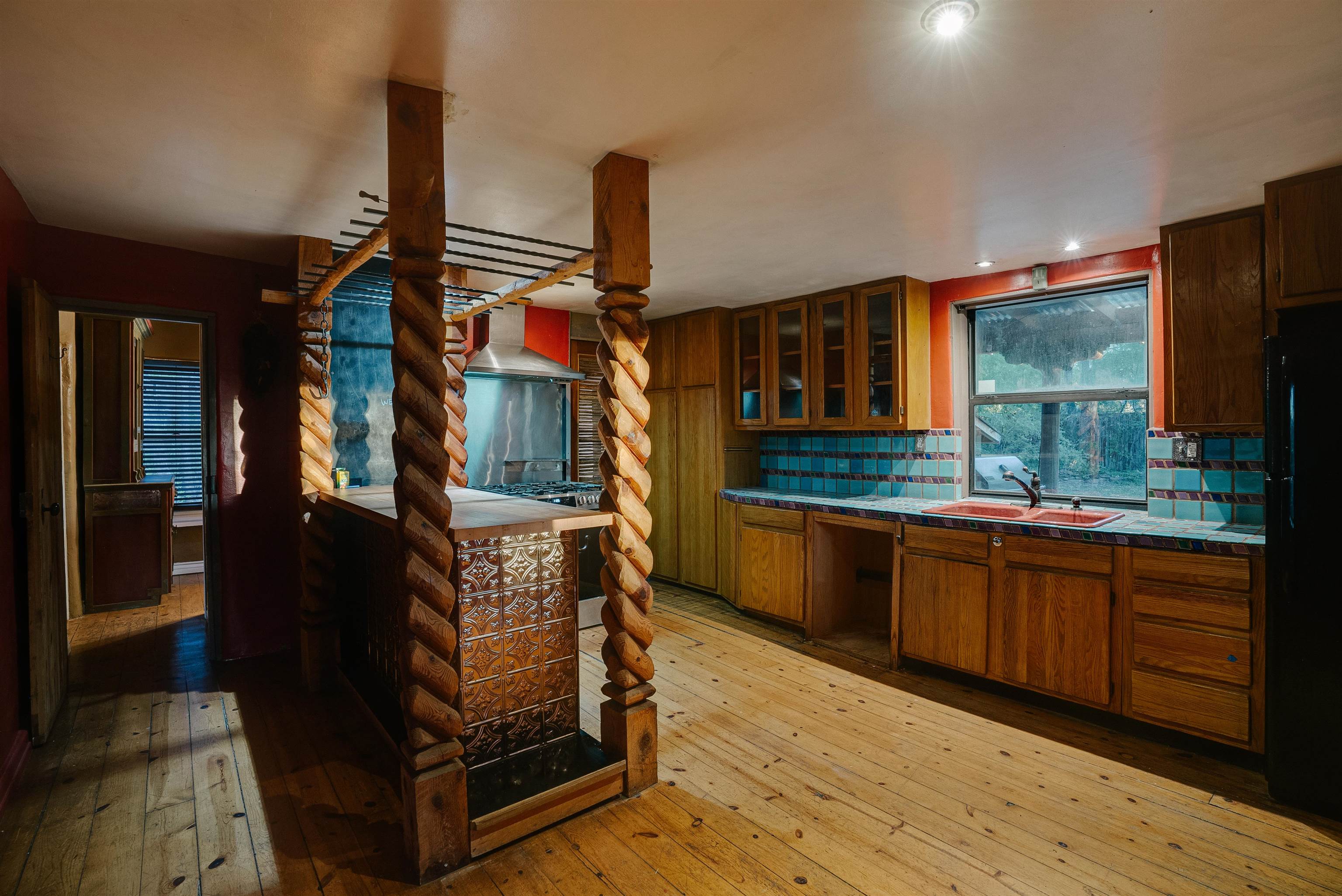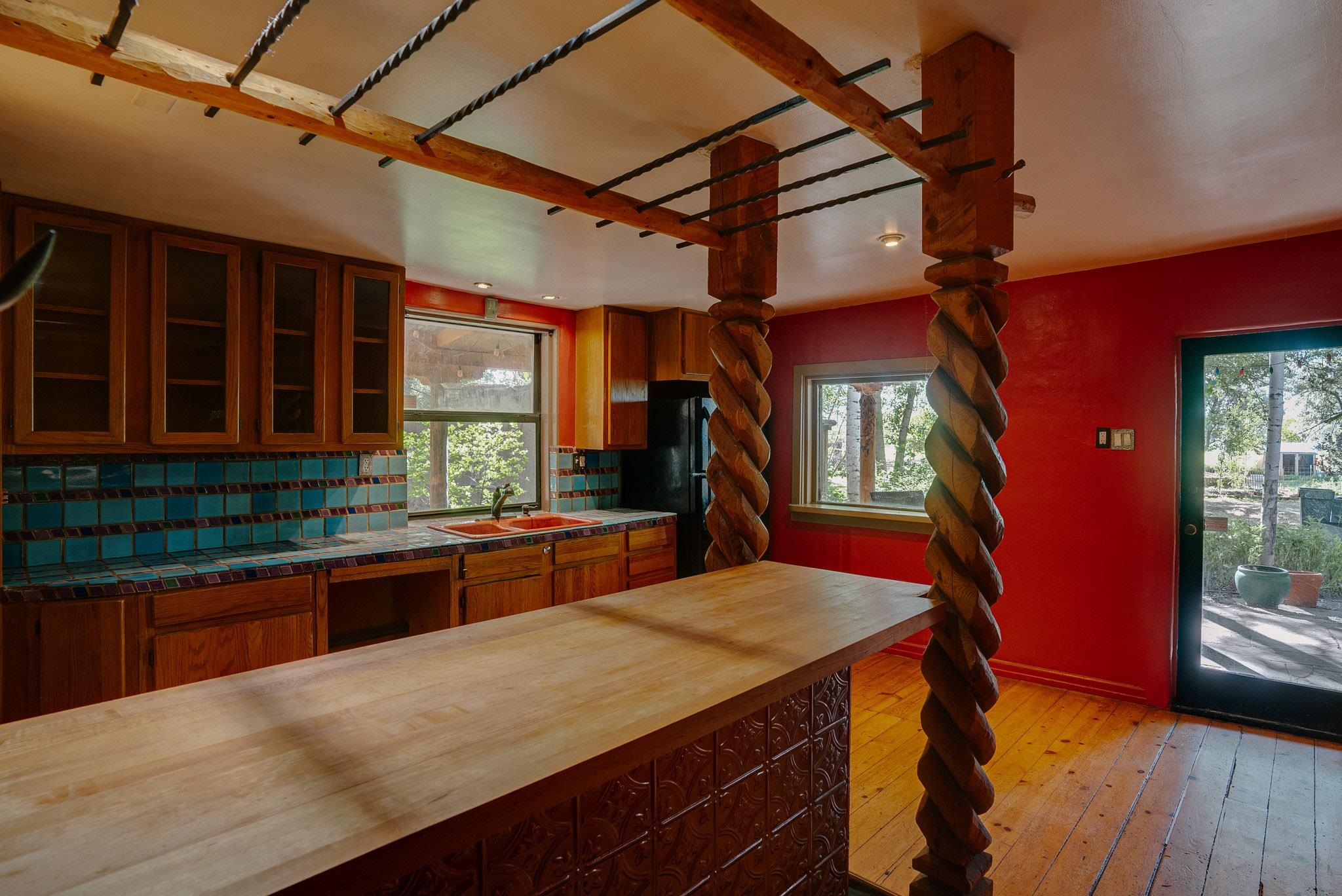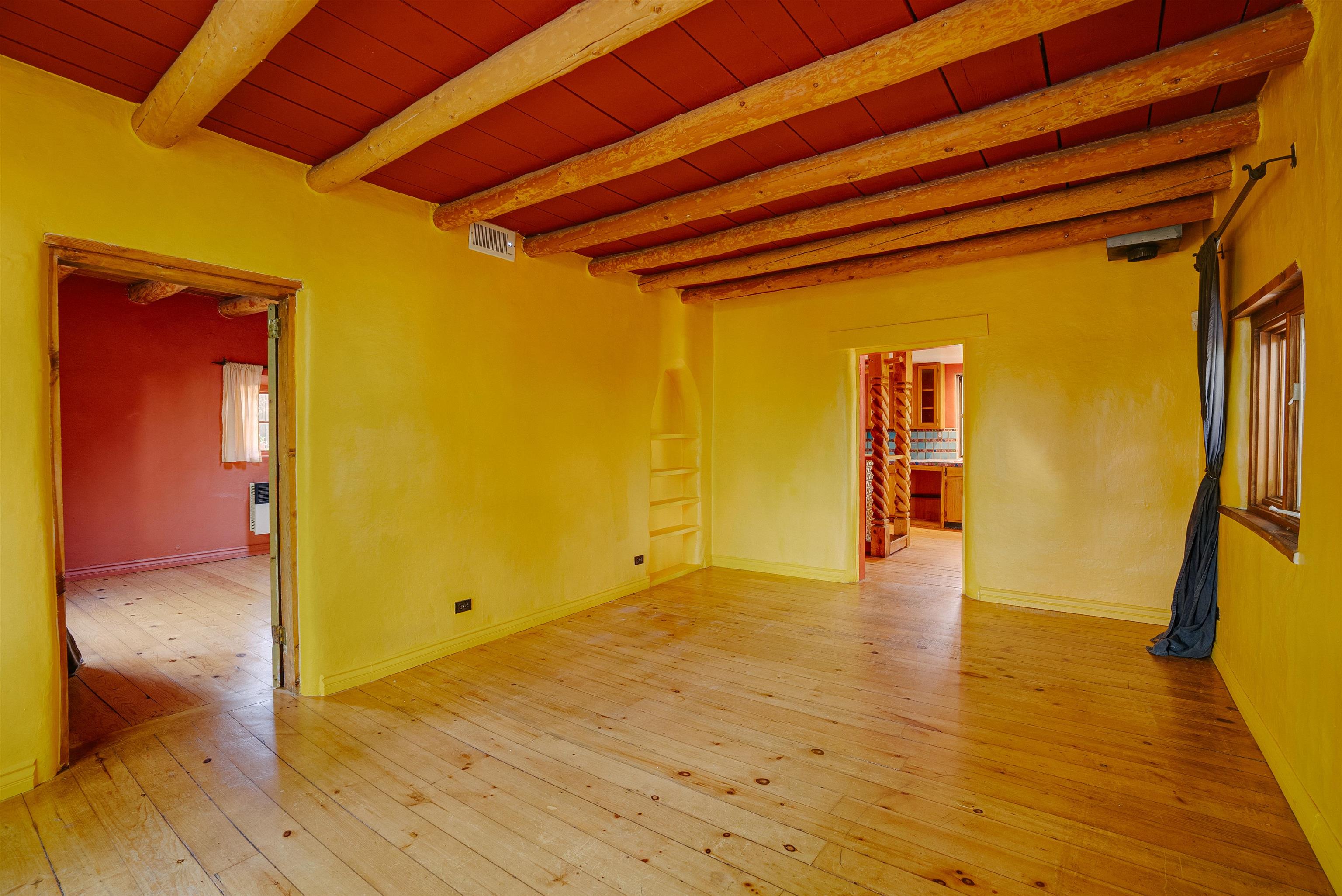 Step into a one-of-a-kind, in-town sanctuary amidst 300 trees where vintage charm meets thoughtful design. Built somewhere between 1900 and 1940's (sometimes it's difficult to know with old adobes), and lovingly restored by an architect and landscape architect, this distinctive property blends historic character with rustic artistry. Alpacas in the distance (on a neighbor's property so you can enjoy them, but you don't have to take care of them) and adjacent green Taos Pueblo land that attracts abundant bird life greet you as you drive through one of two gates into this park-like setting. Nestled in the trees for cool summer days, this property is a unique and special gem. Prepare to be transported into another world, stylishly protected by hand-built lattice privacy screens that shield you in your private oasis, yet in an ideal location allowing you to enjoy all the perks of being close to restaurants, galleries, museums. Listen to the flutter of the leaves playing in the wind from your own personal aspen grove: 96 to call your own and admire from your spacious, flagstone front porch and leave the world behind. Once inside ,discover thick adobe walls, spiral carved posts, a vibrant and tasteful color palette, hand-forged iron details, a gorgeous geometric stained glass window and three skylights that welcome bright sunlight to dance throughout the home, enhancing the connection between indoors and out. A stylish and functional work-horse of a fireplace heats the home and anchors the living room to keep you cozy and warm on cold wintery days, along side an open chef's kitchen that will make entertaining friends and family an absolute joy- and if you want to expand the party, there is also an outdoor kitchen.The bedroom and bathroom feature custom storage, designed and built by the architect for function, style and beauty. A second bedroom also has laundry. In true Taos fashion, there are some very unique aspects to this property: an old sweat lodge dating from the 1960's and and old adobe structure that could be restored (or taken down, your choice-sellers will remove it if that is your wish) and the exterior of the house which is rough, hand-troweled adobe. There is even a spacious and 6x10 shed/workshop with natural light, glass door and window to allow light in and store all your gear or indulge your creativity. For added convenience, the property is on town sewer and its own well. The sellers have design drawings for an additional bedroom/bathroom and studio to inspire you. Book a showing today, this is a property you don't want to miss.