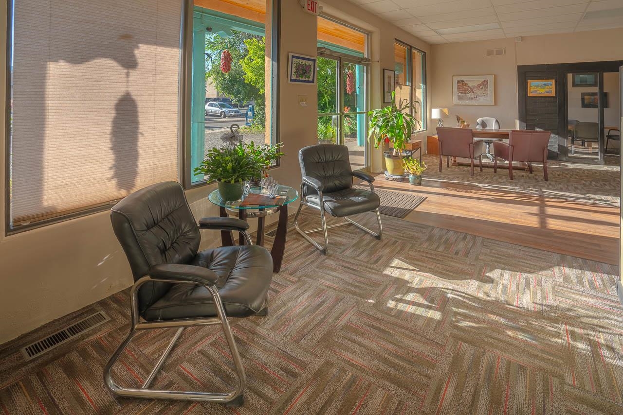 An extremely rare and versatile commercial or residential development opportunity awaits you in an unparalleled location—just 100 yards from the Taos Plaza. This approximately 2,100 square foot blank canvas is ready for your vision. Situated in a high-traffic corridor within the historic and commercial districts of Taos, this property is not only steps from the Plaza, but it also boasts 10 designated parking spots, which is a valuable asset given that there are new parking meters in the area. The eye-catching southwestern-style frontage invites business through its doors, enhanced by a beautiful front covered portal patio ideal for café seating, benches, gardens, and more. Nearly floor-to-ceiling windows flood the space with natural light and offer spectacular views of Taos Mountain and the Sangre de Cristo mountain range. Inside, the property features two large open spaces with high ceilings, adaptable to a wide range of business needs. A smaller 208 square foot room, currently used as a conference room, has large windows and an adjacent half bath. Toward the back, a 163 square foot room includes a kitchenette and opens into a second half bath. The property is equipped with forced heat and central air conditioning, ensuring comfort year-round. This commercial space has a robust rental history spanning over a decade, having previously housed a bike shop, childcare center, and real estate brokerage among other businesses. Currently tenant-occupied, it offers the potential for passive income. Whether you're envisioning a café, restaurant, yoga studio, bookstore, quirky shop, live/work option, or office, this property provides a versatile canvas to bring your ideas to life. Opportunities to own prime commercial or residential real estate in Taos are rare. Contact us today to view this exceptional property and let your dreams take shape.