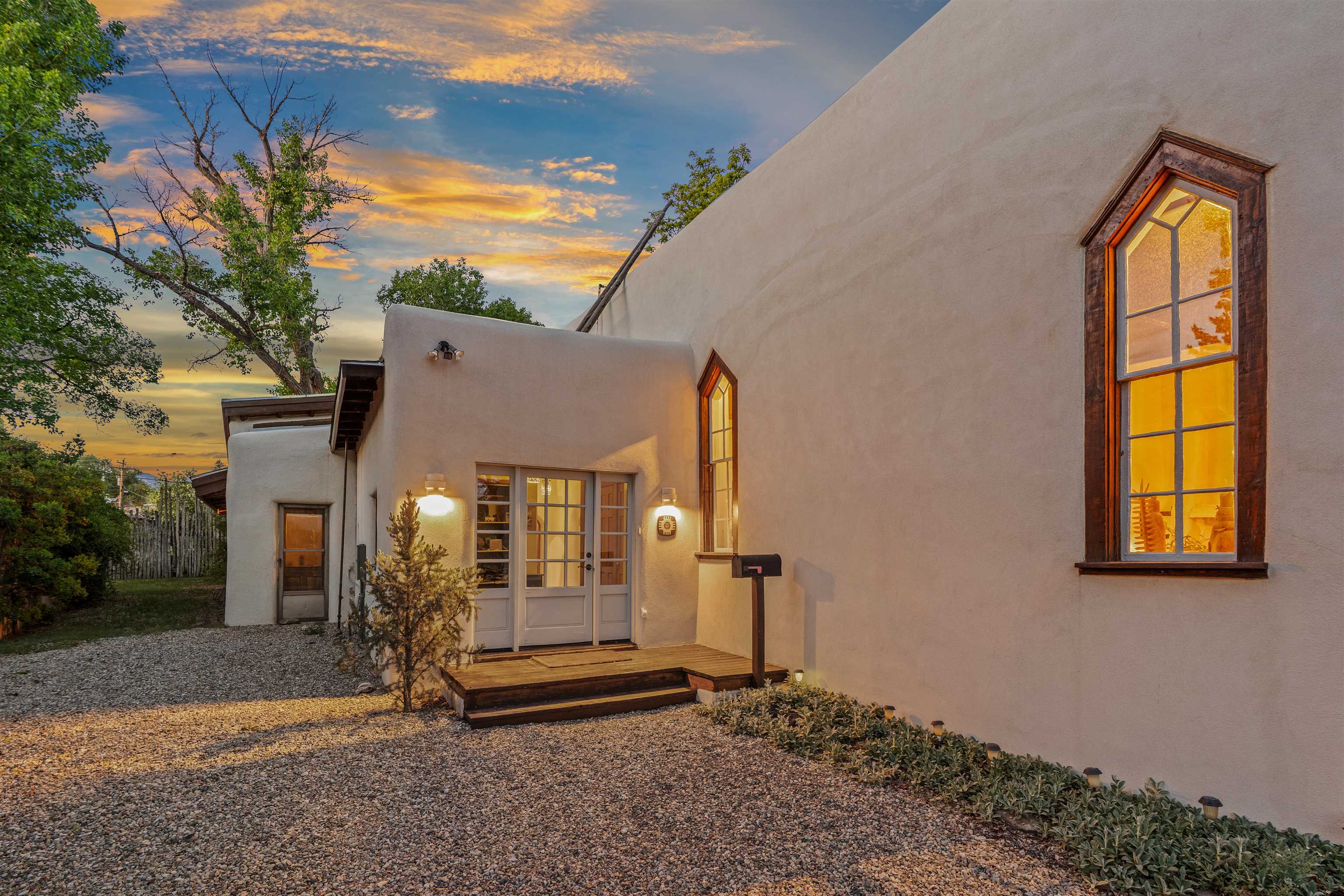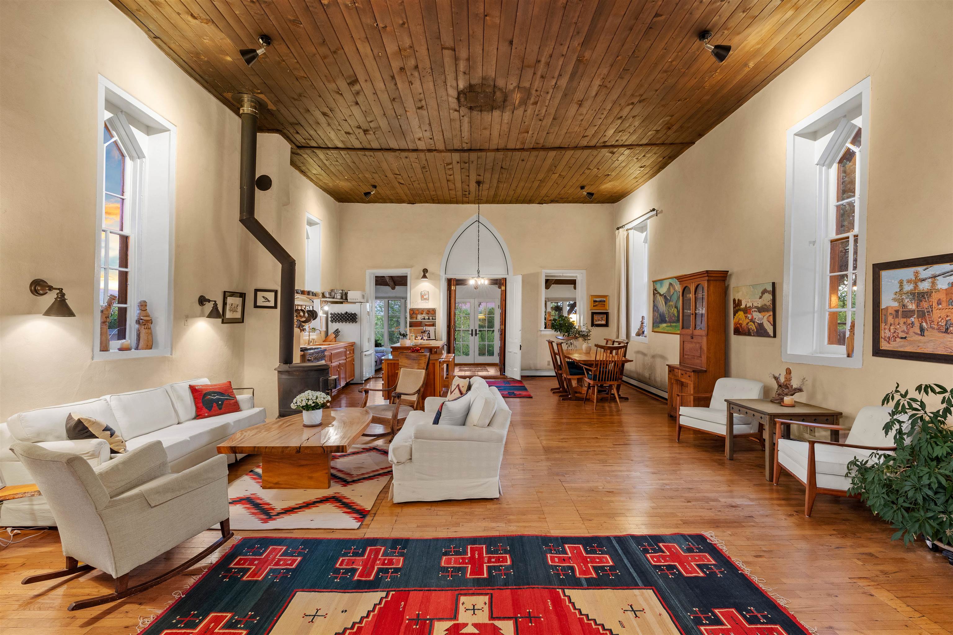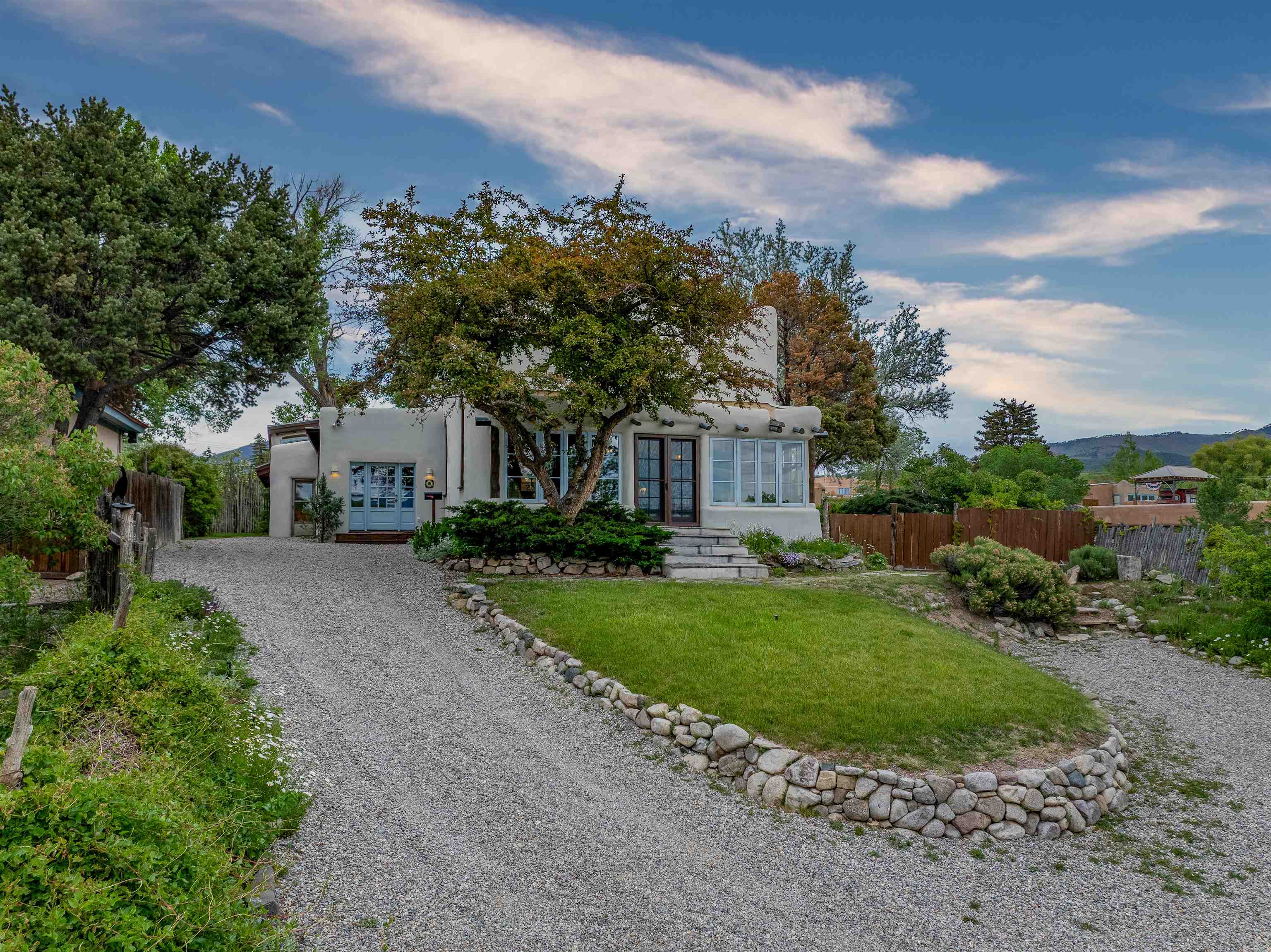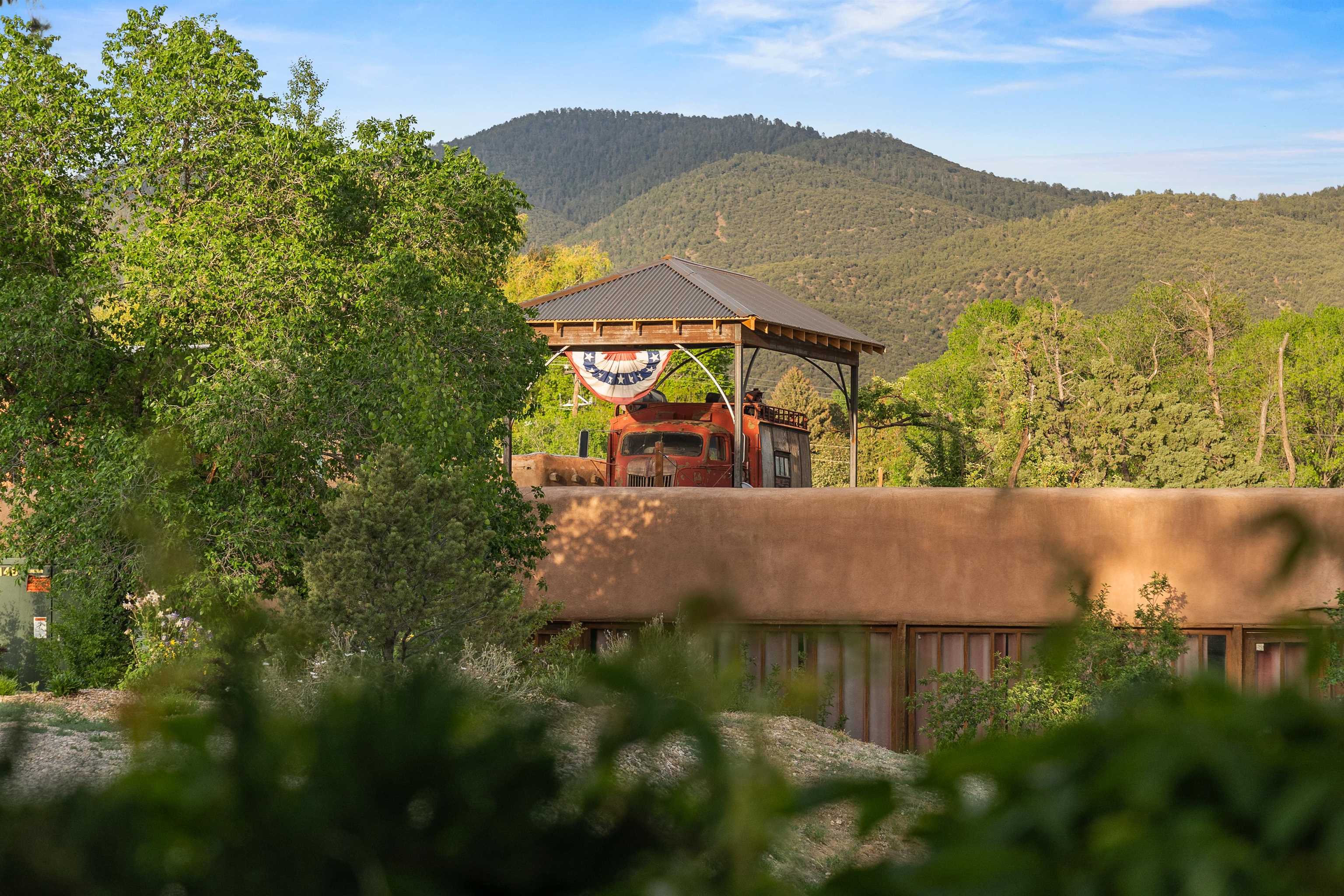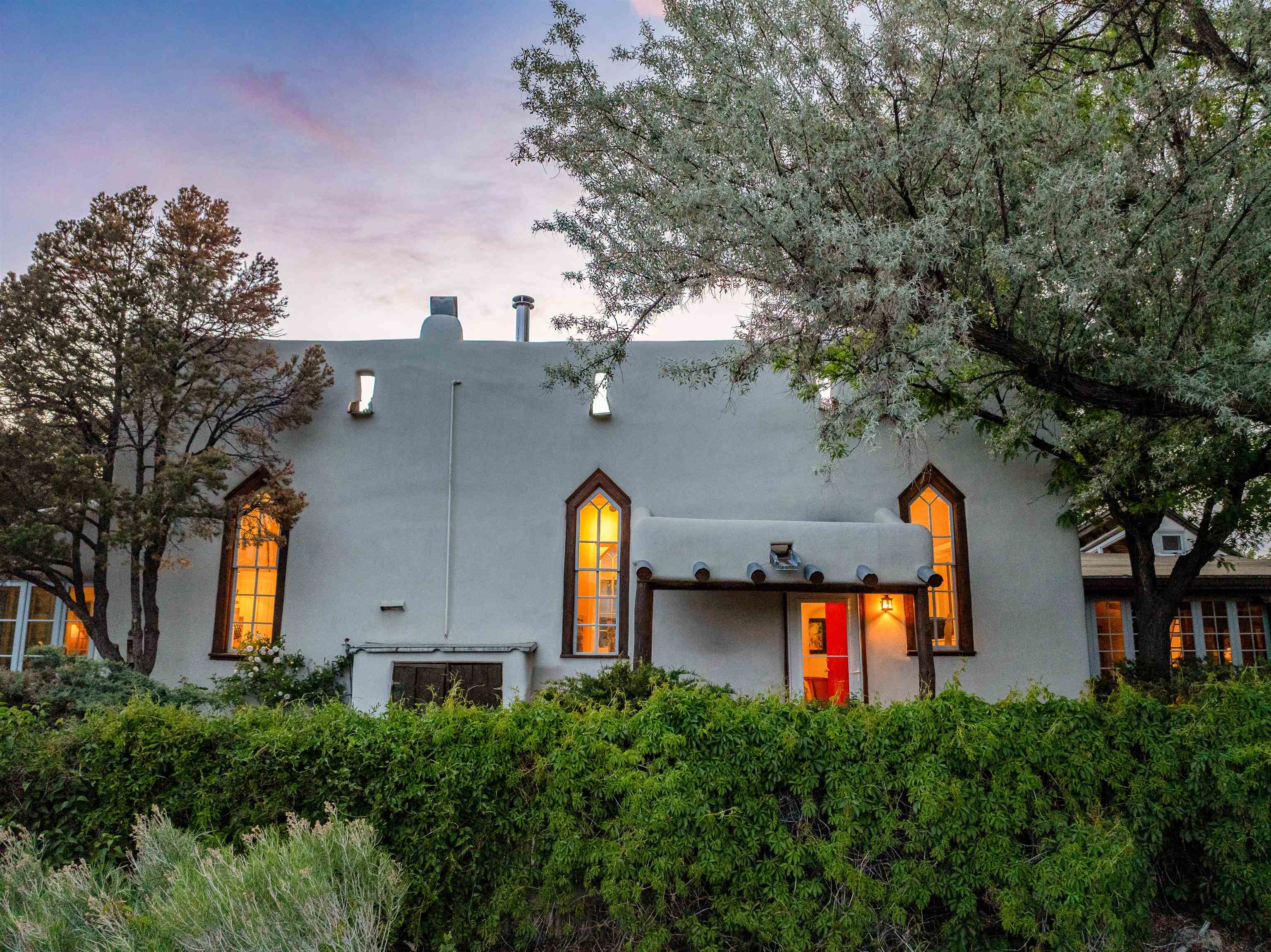 The Little White Church on Quesnel....... A historic home with spectacular views one block from Taos Plaza Once a modest adobe church, now a soulful architectural gem—this historic Taos residence is a rare blend of artistic heritage, thoughtful restoration, and New Mexican charm. Located on quiet Quesnel Lane and adjacent to the Couse-Sharp Historic Site, the property offers a peaceful retreat in the heart of town with roots in Taos’ creative and cultural legacy. The building itself dates back to the 1880s and was the Spanish Methodist church before being thoughtfully adapted into a private residence in the 1970s. Ask your Realtor for the “Church on Quesnel” history document, available in associated documents, to learn more about the home’s cultural lineage and transformation. The surrounding area is listed on the National Register of Historic Places and is part of a federally recognized Historic District, helping preserve the integrity and architectural fabric of this remarkable neighborhood. The light-filled entry/sunroom welcomes you with Saltillo tile, exposed vigas, and wraparound windows framing mountain views across the Couse meadow to the Truchas peaks. The former sanctuary now serves as an expansive open-concept living space with towering Gothic windows, multiple seating areas, a kiva fireplace, a wood-burning stove, and a warm plaster finish that invites comfort and conversation. The kitchen is a charming blend of style and function with gas range, custom cabinetry, open shelving, and a central island. Through an arched opening, a hallway leads to the first of three and a half bathrooms, featuring Talavera tile accents, built-in storage, and an art-glass window. Beyond this, the enclosed greenhouse breezeway—lined with windows and showcasing a red brick floor, herringbone latilla and viga ceilings, and hand-carved posts—guides you to four bedrooms, two with French doors, vaulted ceilings, creative loft nooks, and rustic textures that balance charm with comfort. At the end of the breezeway, the third bedroom (or media room, office, or art studio) offers versatility with built-in bookshelves, a large walk-in closet, and a private ¾ bath. The primary suite lies beyond a final arched doorway, offering Saltillo floors, a custom wood sunburst ceiling, and a sliding window wall that opens to the courtyard and an expansive view of the Truchas peaks, blurring indoor and outdoor living. The en-suite ¾ bath includes a walk-in shower and colorful tile details, and a spacious walk-in closet offers ample storage. The private courtyard is a highlight of the property, with a red brick patio and walkways, a grassy lawn, garden beds, mature trees, and a secluded hot tub with a view of the moonrise and distant mountains. Multiple outdoor seating areas enjoy sun or shade at any time of day. A side yard with lush greenery offers another peaceful outdoor space with its own door to the main living area. This property features classic adobe construction, single-level living, preservation of original historic elements, and an unbeatable location just one block from the Taos Plaza and surrounded by key landmarks. A truly one-of-a-kind opportunity to own a piece of Taos history—artful, inviting, and deeply rooted in place. This is the first time the house has been on the market in 47 years. Contact Cyndi to schedule your private showing. MATTERPORT VIDEO LINK: https://my.matterport.com/show/?m=2UQ6vUFRMEr