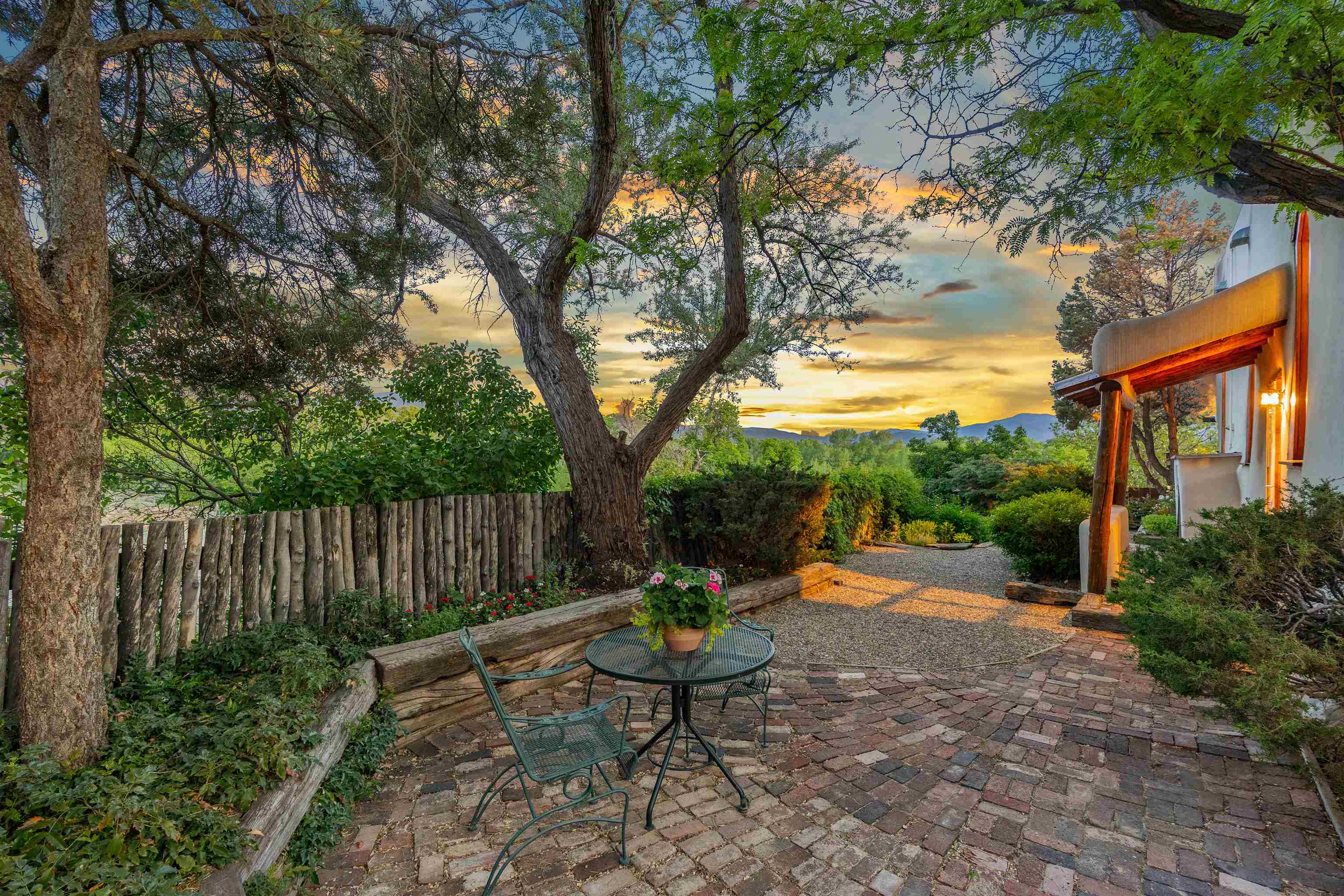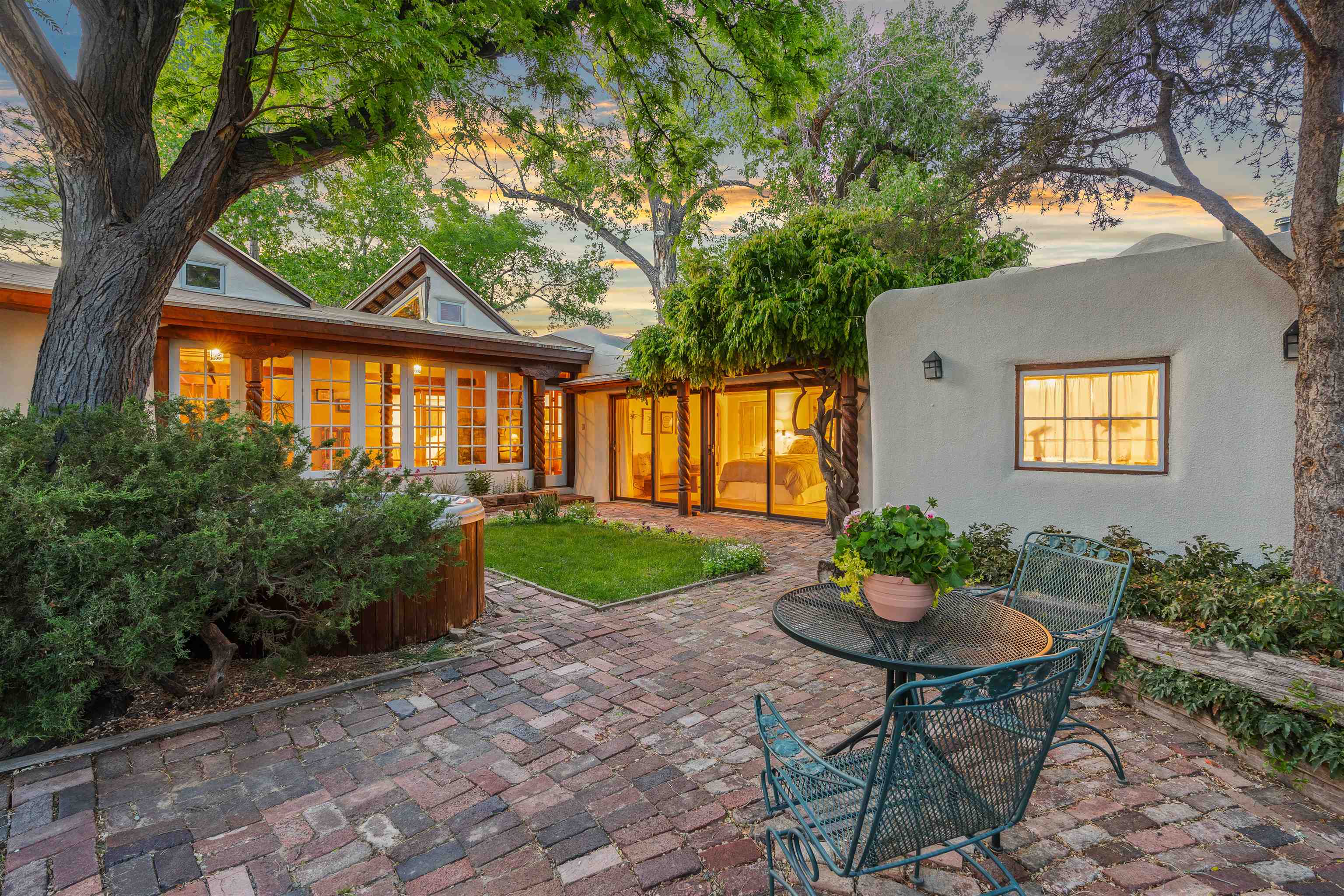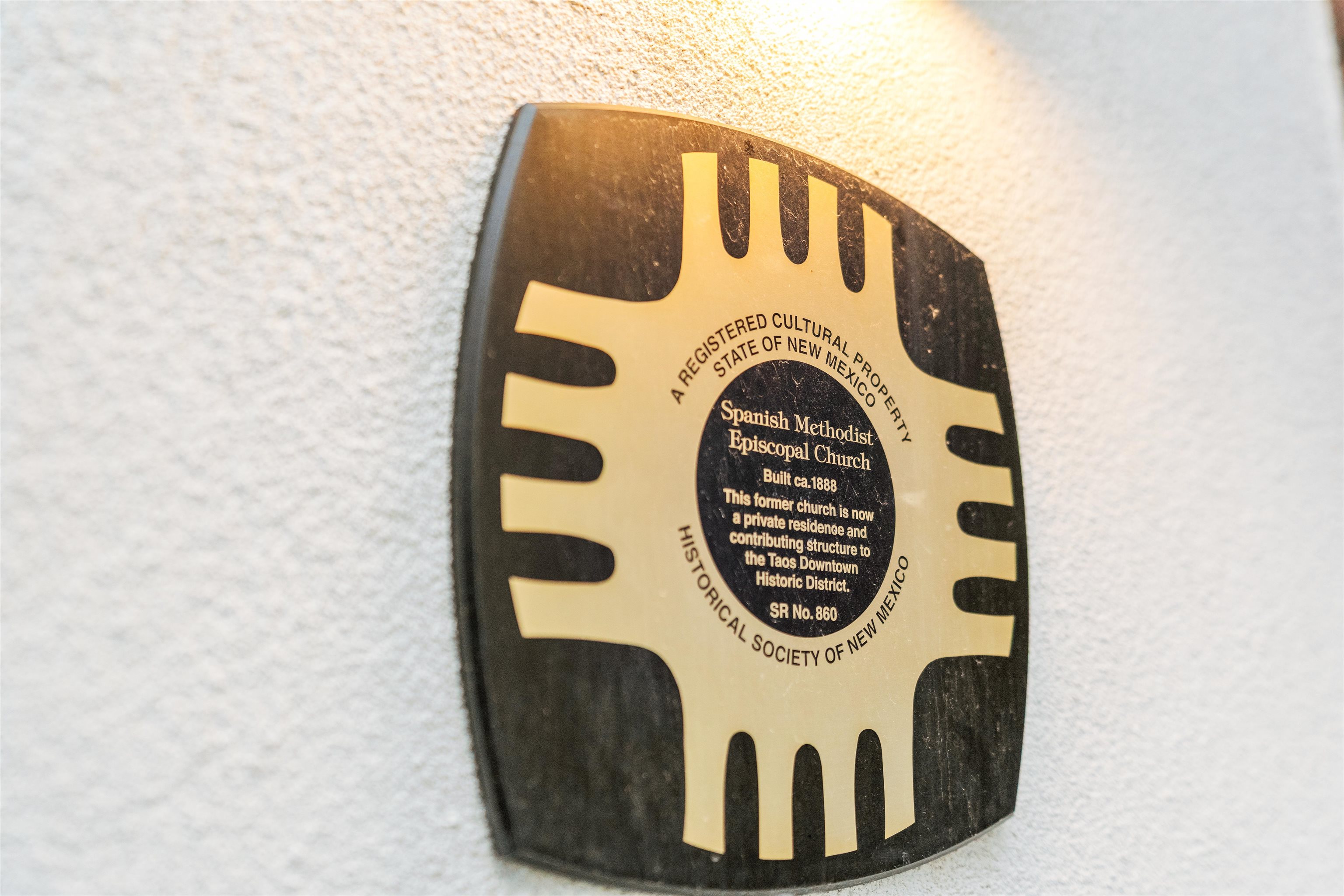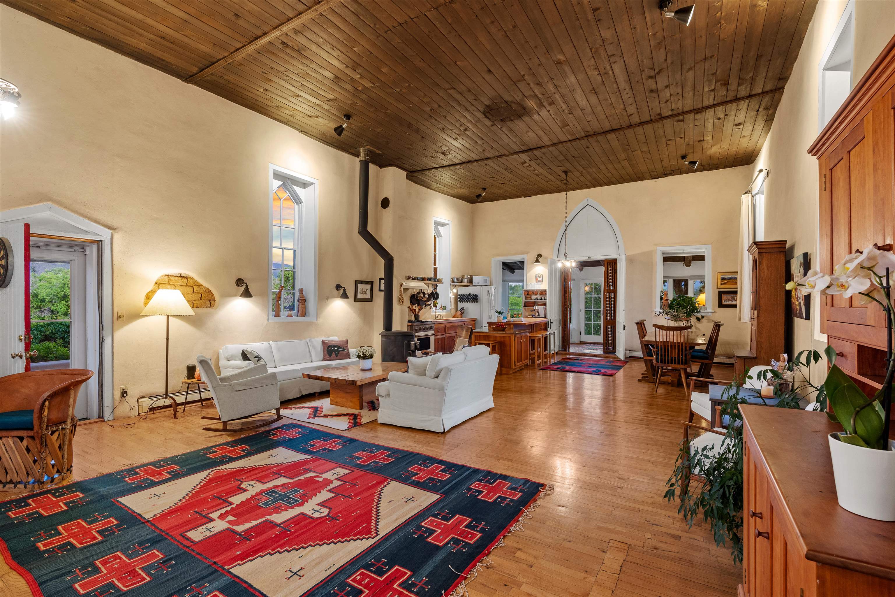 The Little White Church on Quesnel....... A historic home with spectacular views one block from Taos Plaza Once a modest adobe church, now a soulful architectural gem—this historic Taos residence is a rare blend of artistic heritage, thoughtful restoration, and New Mexican charm. Located on quiet Quesnel Lane and adjacent to the Couse-Sharp Historic Site, the property offers a peaceful retreat in the heart of town with roots in Taos’ creative and cultural legacy. The building itself dates back to the 1880s and was the Spanish Methodist church before being thoughtfully adapted into a private residence in the 1970s. Ask your Realtor for the “Church on Quesnel” history document, available in associated documents, to learn more about the home’s cultural lineage and transformation. The surrounding area is listed on the National Register of Historic Places and is part of a federally recognized Historic District, helping preserve the integrity and architectural fabric of this remarkable neighborhood. The light-filled entry/sunroom welcomes you with Saltillo tile, exposed vigas, and wraparound windows framing mountain views across the Couse meadow to the Truchas peaks. The former sanctuary now serves as an expansive open-concept living space with towering Gothic windows, multiple seating areas, a kiva fireplace, a wood-burning stove, and a warm plaster finish that invites comfort and conversation. The kitchen is a charming blend of style and function with gas range, custom cabinetry, open shelving, and a central island. Through an arched opening, a hallway leads to the first of three and a half bathrooms, featuring Talavera tile accents, built-in storage, and an art-glass window. Beyond this, the enclosed greenhouse breezeway—lined with windows and showcasing a red brick floor, herringbone latilla and viga ceilings, and hand-carved posts—guides you to four bedrooms, two with French doors, vaulted ceilings, creative loft nooks, and rustic textures that balance charm with comfort. At the end of the breezeway, the third bedroom (or media room, office, or art studio) offers versatility with built-in bookshelves, a large walk-in closet, and a private ¾ bath. The primary suite lies beyond a final arched doorway, offering Saltillo floors, a custom wood sunburst ceiling, and a sliding window wall that opens to the courtyard and an expansive view of the Truchas peaks, blurring indoor and outdoor living. The en-suite ¾ bath includes a walk-in shower and colorful tile details, and a spacious walk-in closet offers ample storage. The private courtyard is a highlight of the property, with a red brick patio and walkways, a grassy lawn, garden beds, mature trees, and a secluded hot tub with a view of the moonrise and distant mountains. Multiple outdoor seating areas enjoy sun or shade at any time of day. A side yard with lush greenery offers another peaceful outdoor space with its own door to the main living area. This property features classic adobe construction, single-level living, preservation of original historic elements, and an unbeatable location just one block from the Taos Plaza and surrounded by key landmarks. A truly one-of-a-kind opportunity to own a piece of Taos history—artful, inviting, and deeply rooted in place. This is the first time the house has been on the market in 47 years. Contact Cyndi to schedule your private showing. MATTERPORT VIDEO LINK: https://my.matterport.com/show/?m=2UQ6vUFRMEr