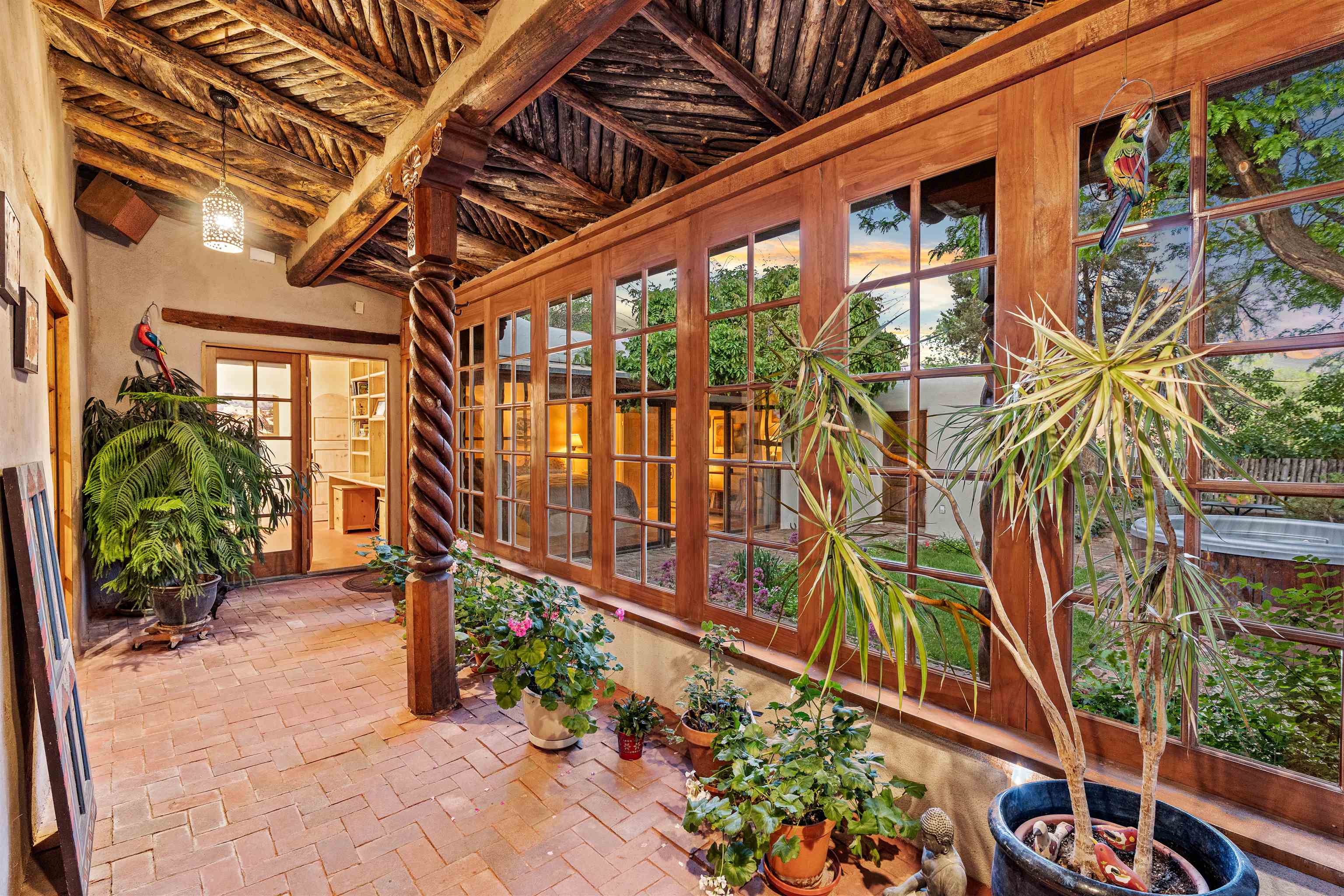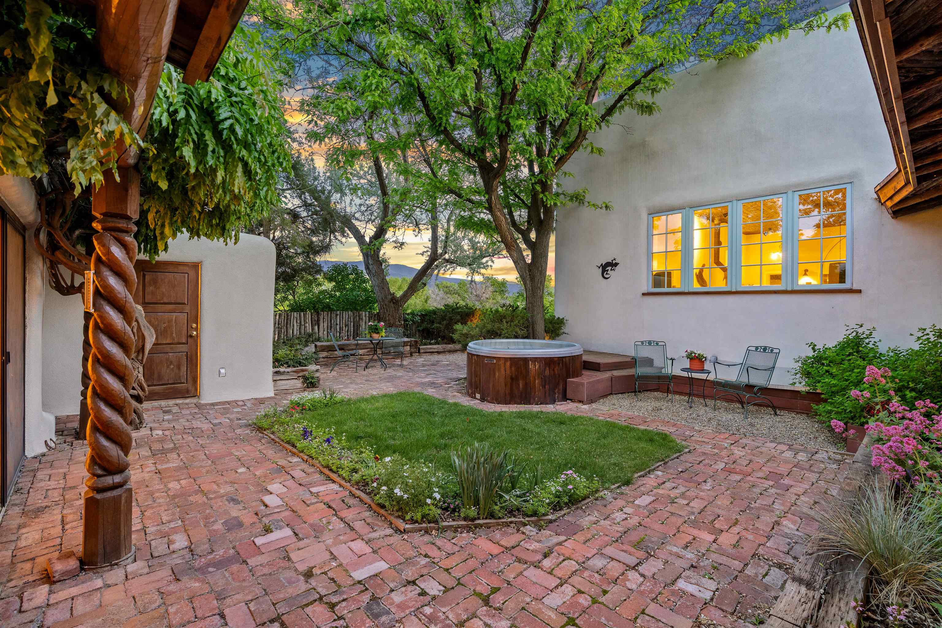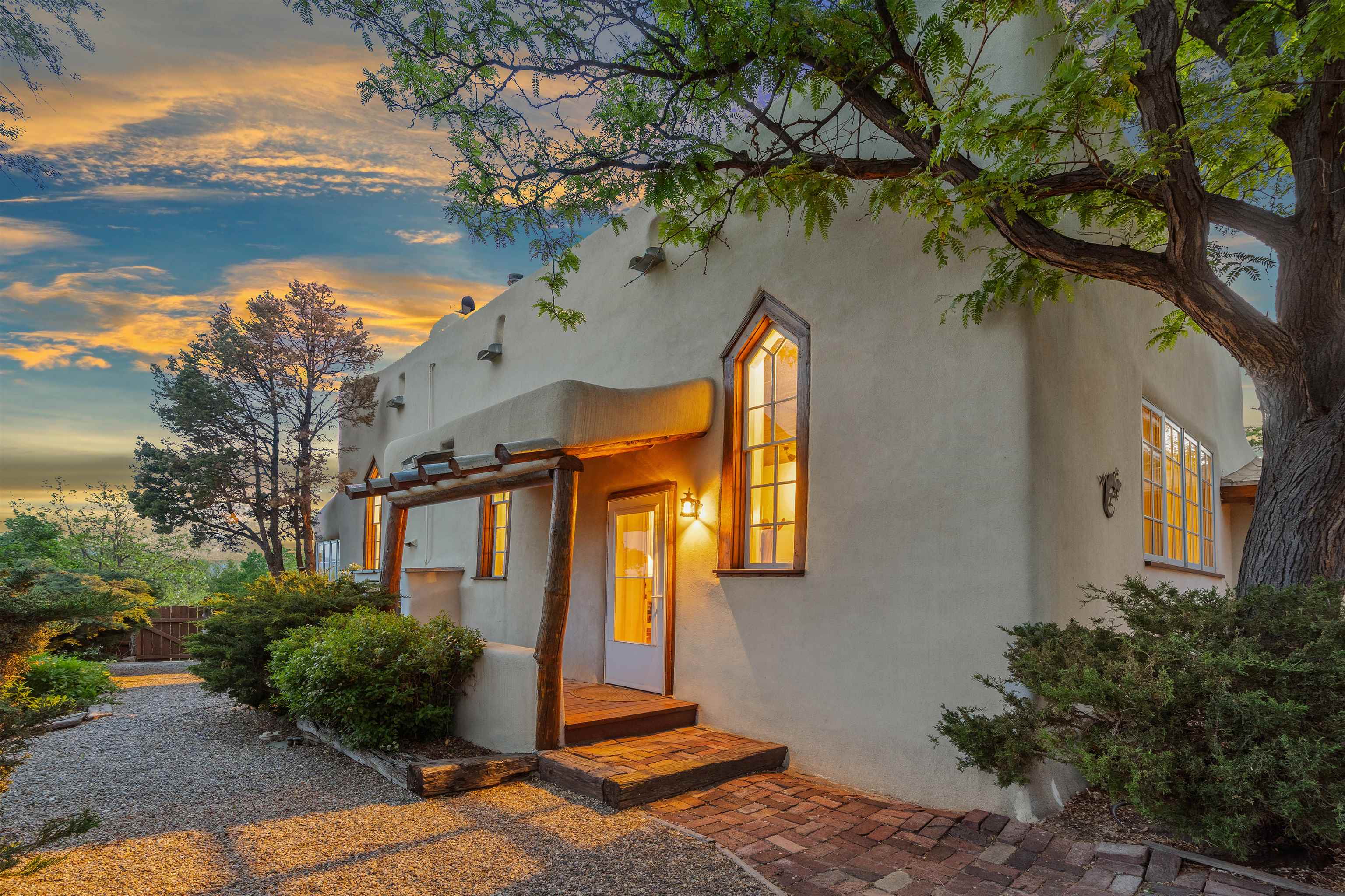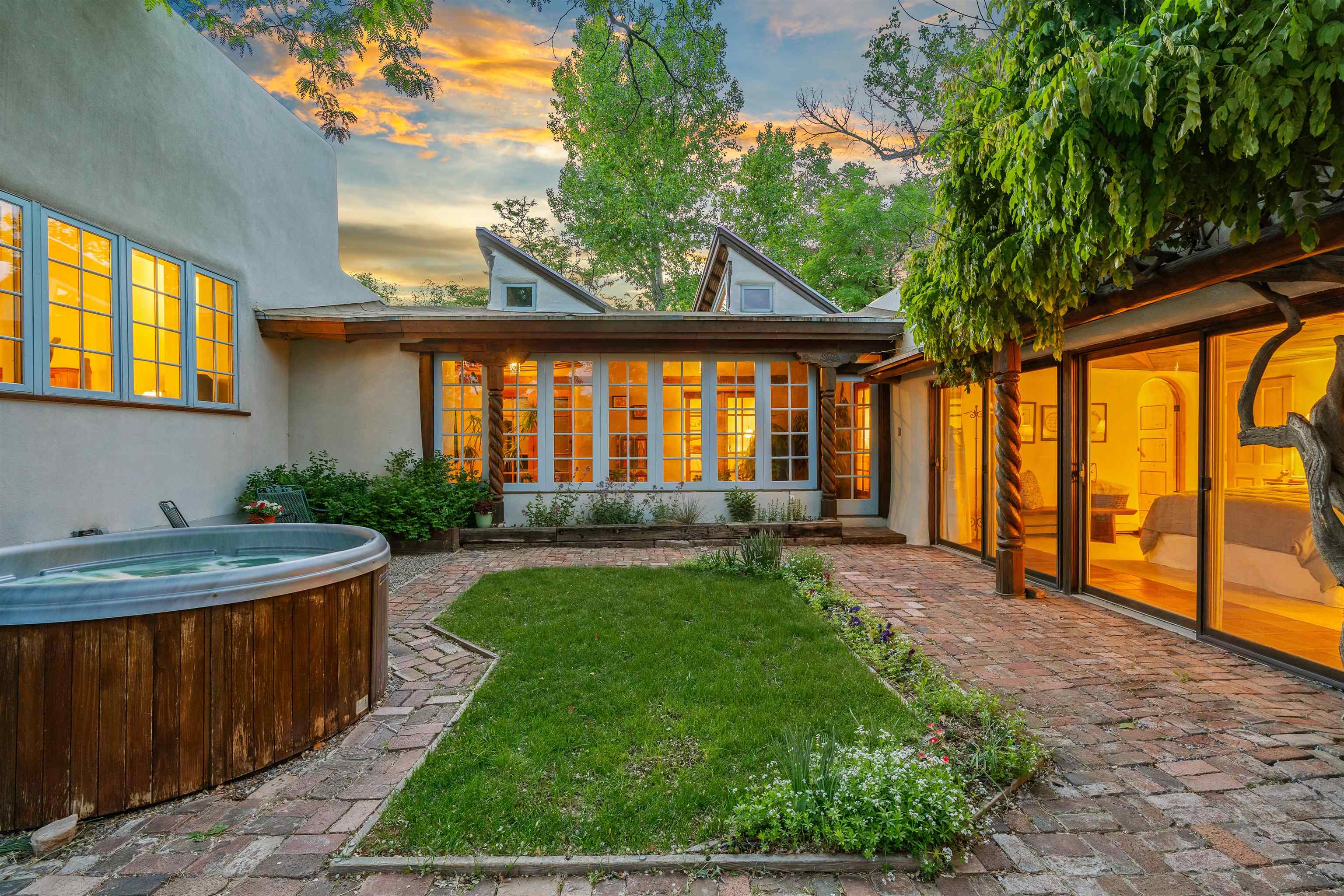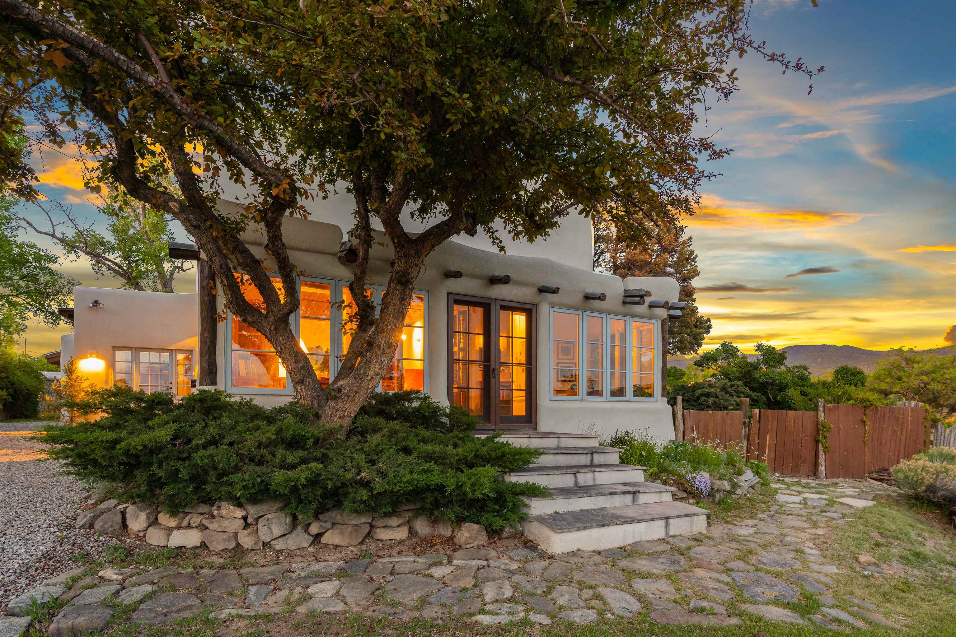 The Little White Church on Quesnel....... A historic home with spectacular views one block from Taos Plaza Once a modest adobe church, now a soulful architectural gem—this historic Taos residence is a rare blend of artistic heritage, thoughtful restoration, and New Mexican charm. Located on quiet Quesnel Lane and adjacent to the Couse-Sharp Historic Site, the property offers a peaceful retreat in the heart of town with roots in Taos’ creative and cultural legacy. The building itself dates back to the 1880s and was the Spanish Methodist church before being thoughtfully adapted into a private residence in the 1970s. Ask your Realtor for the “Church on Quesnel” history document, available in associated documents, to learn more about the home’s cultural lineage and transformation. The surrounding area is listed on the National Register of Historic Places and is part of a federally recognized Historic District, helping preserve the integrity and architectural fabric of this remarkable neighborhood. The light-filled entry/sunroom welcomes you with Saltillo tile, exposed vigas, and wraparound windows framing mountain views across the Couse meadow to the Truchas peaks. The former sanctuary now serves as an expansive open-concept living space with towering Gothic windows, multiple seating areas, a kiva fireplace, a wood-burning stove, and a warm plaster finish that invites comfort and conversation. The kitchen is a charming blend of style and function with gas range, custom cabinetry, open shelving, and a central island. Through an arched opening, a hallway leads to the first of three and a half bathrooms, featuring Talavera tile accents, built-in storage, and an art-glass window. Beyond this, the enclosed greenhouse breezeway—lined with windows and showcasing a red brick floor, herringbone latilla and viga ceilings, and hand-carved posts—guides you to four bedrooms, two with French doors, vaulted ceilings, creative loft nooks, and rustic textures that balance charm with comfort. At the end of the breezeway, the third bedroom (or media room, office, or art studio) offers versatility with built-in bookshelves, a large walk-in closet, and a private ¾ bath. The primary suite lies beyond a final arched doorway, offering Saltillo floors, a custom wood sunburst ceiling, and a sliding window wall that opens to the courtyard and an expansive view of the Truchas peaks, blurring indoor and outdoor living. The en-suite ¾ bath includes a walk-in shower and colorful tile details, and a spacious walk-in closet offers ample storage. The private courtyard is a highlight of the property, with a red brick patio and walkways, a grassy lawn, garden beds, mature trees, and a secluded hot tub with a view of the moonrise and distant mountains. Multiple outdoor seating areas enjoy sun or shade at any time of day. A side yard with lush greenery offers another peaceful outdoor space with its own door to the main living area. This property features classic adobe construction, single-level living, preservation of original historic elements, and an unbeatable location just one block from the Taos Plaza and surrounded by key landmarks. A truly one-of-a-kind opportunity to own a piece of Taos history—artful, inviting, and deeply rooted in place. This is the first time the house has been on the market in 47 years. Contact Cyndi to schedule your private showing. MATTERPORT VIDEO LINK: https://my.matterport.com/show/?m=2UQ6vUFRMEr