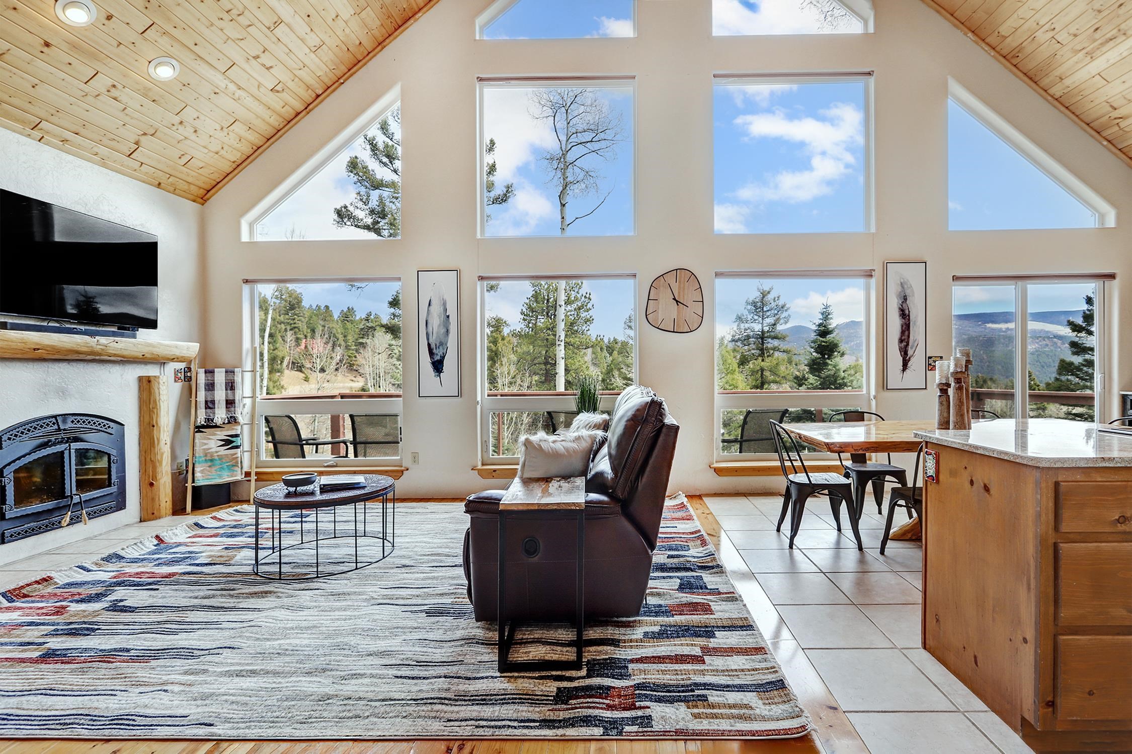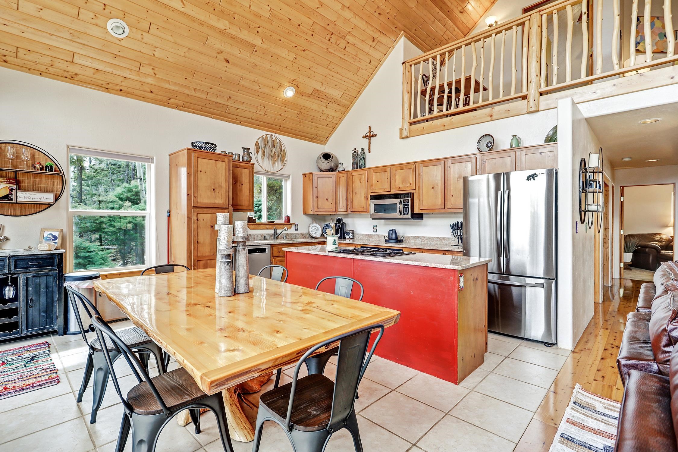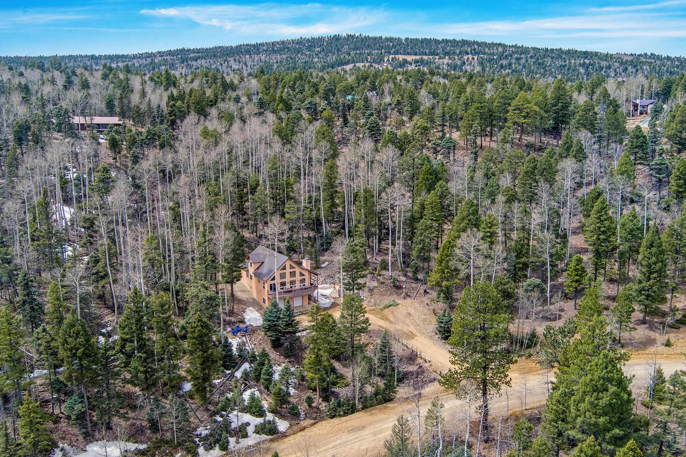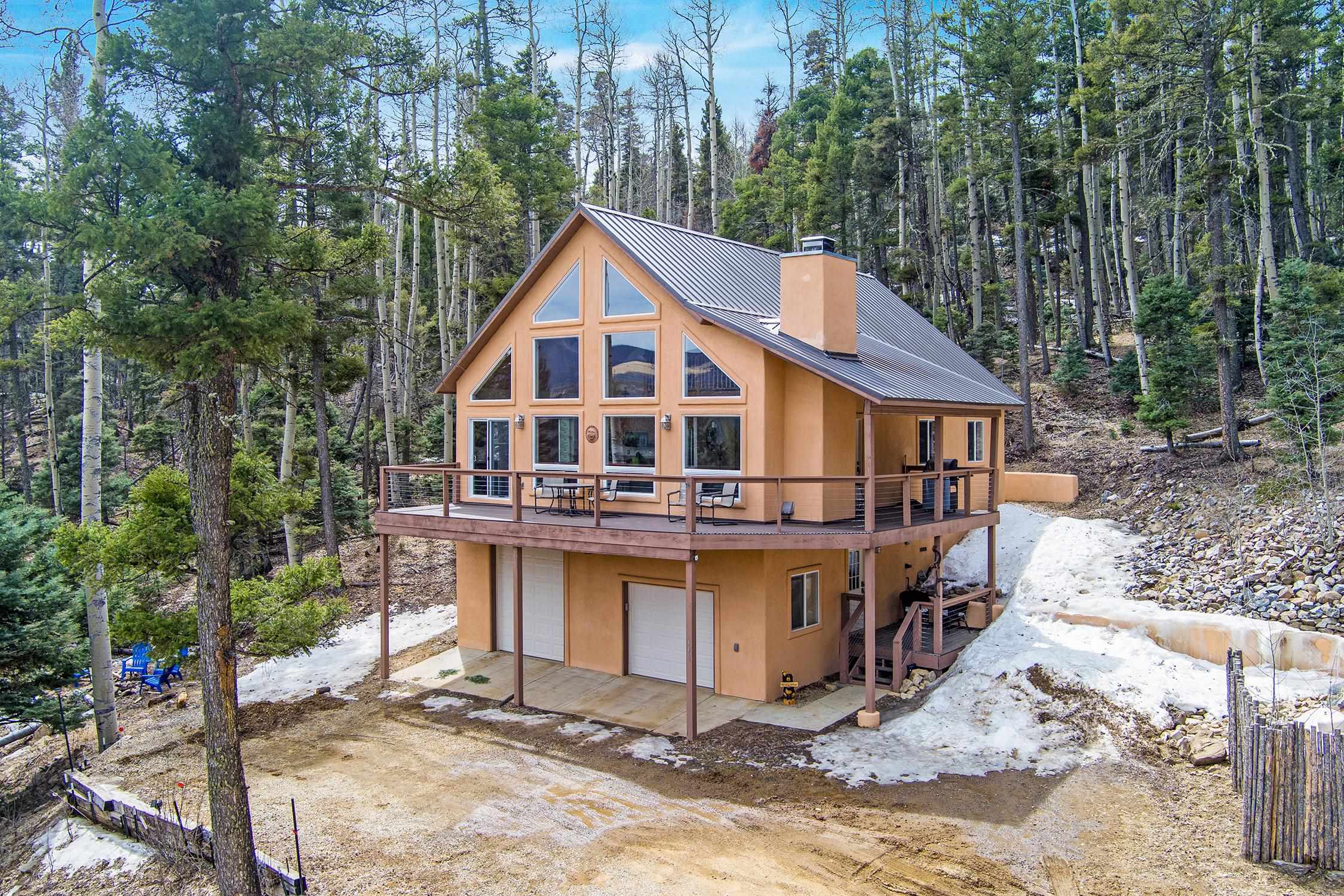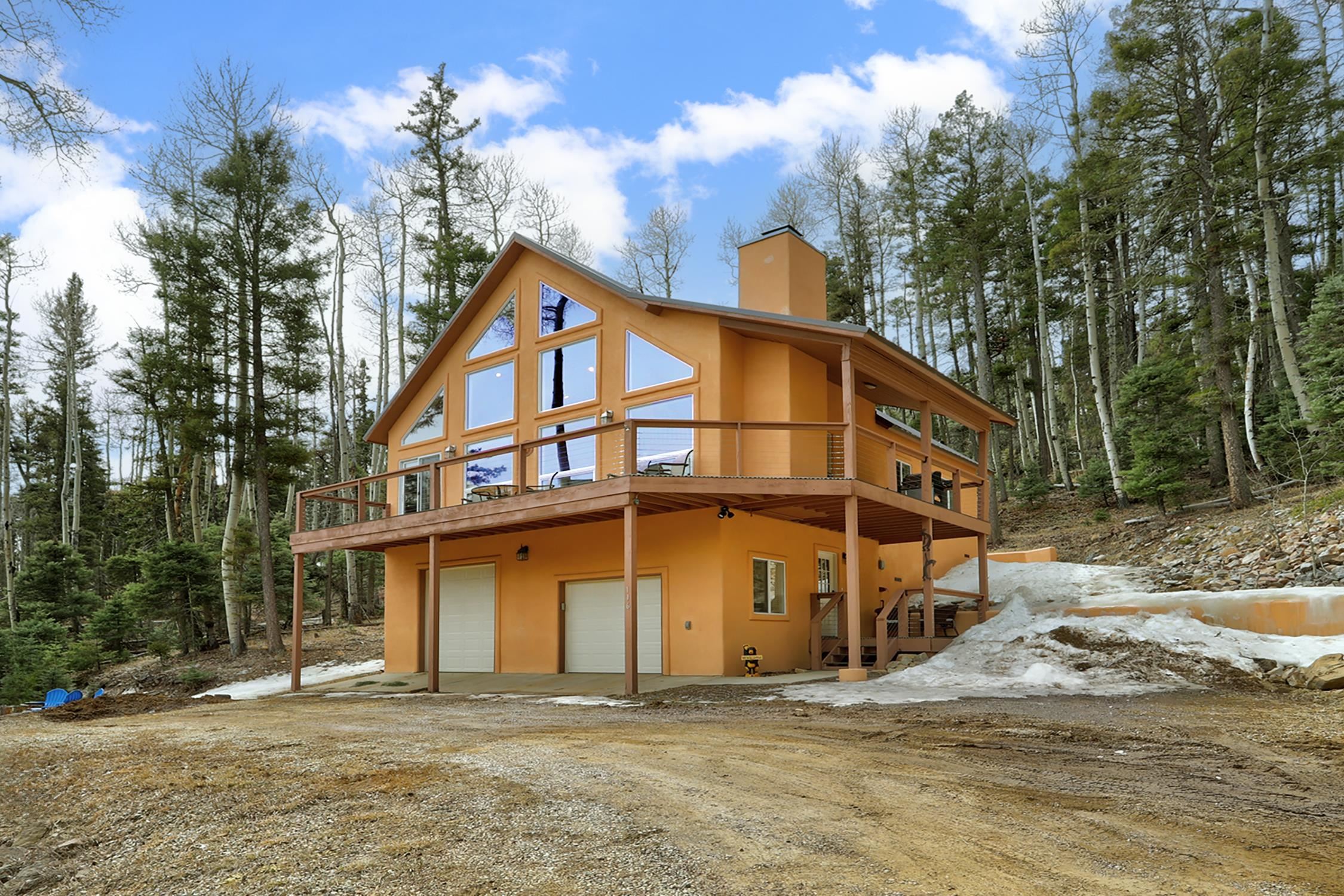 Perched in the trees of Angel Fire, NM, this 4-bedroom, 3-bathroom home is comfortable and inviting. As you step inside, you'll be greeted by a cozy living room, complete with a wood-burning stove, perfect for those chilly mountain evenings. The open-concept design seamlessly connects the living area to a kitchen featuring solid surface countertops, and a dining area with a wine bar, providing both style and functionality for all your gatherings. This home features not one, but two master suites, offering privacy and convenience. The additional loft space serves as a versatile area for extra sleeping with a sleeper sofa or an extra hangout spot. Step outside onto the expansive deck and take in the breathtaking mountain views that Angel Fire is renowned for. The large 1.64-acre lot provides ample space for outdoor activities and future landscaping dreams. The property is move-in ready, with a proven rental history, making it a home as well as an investment opportunity. For those with a passion for vehicles or outdoor gear, the 2-car garage includes an extra tall bay, accommodating larger vehicles or additional storage needs. Don’t delay, this stylish home is sure to get lots of attention!