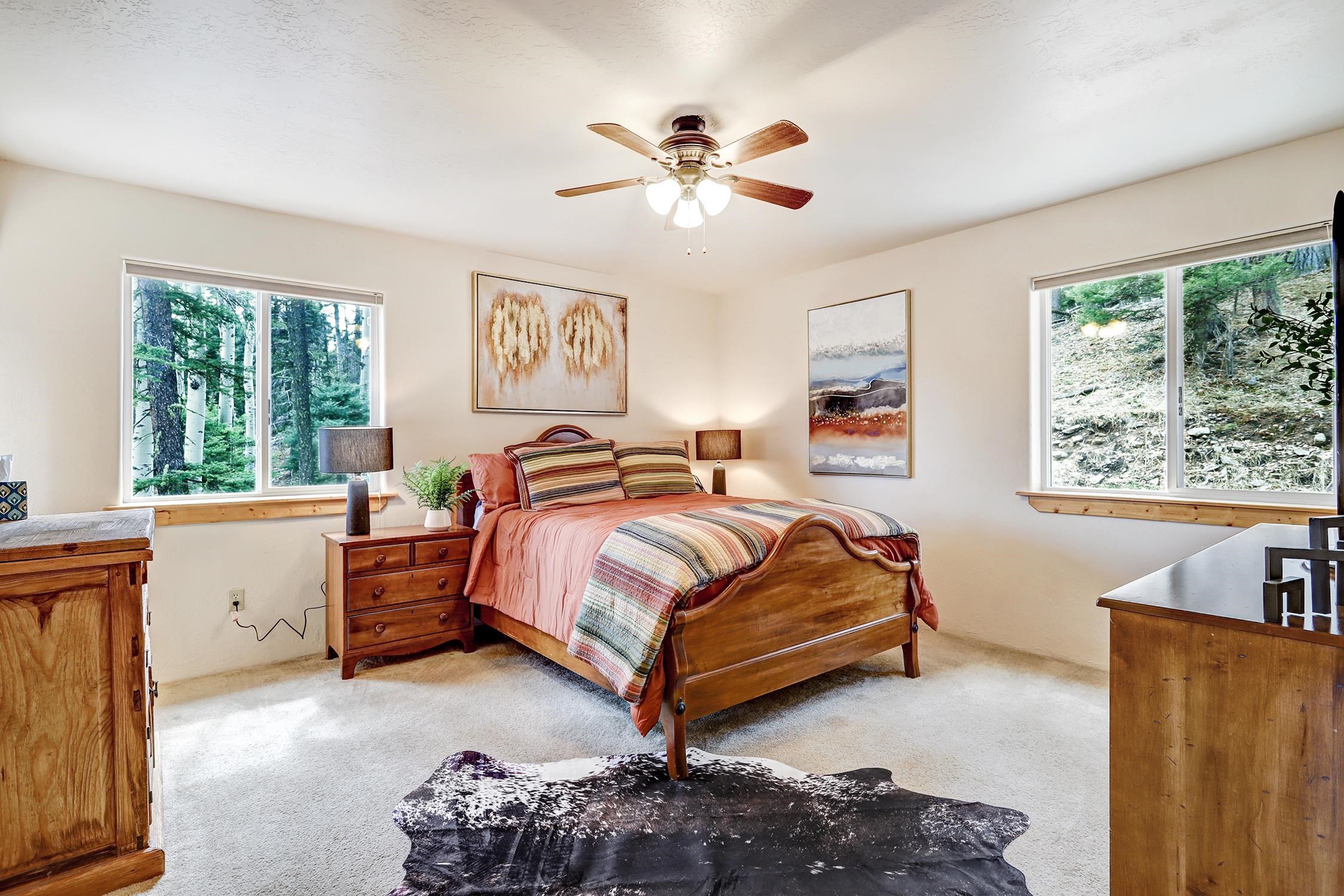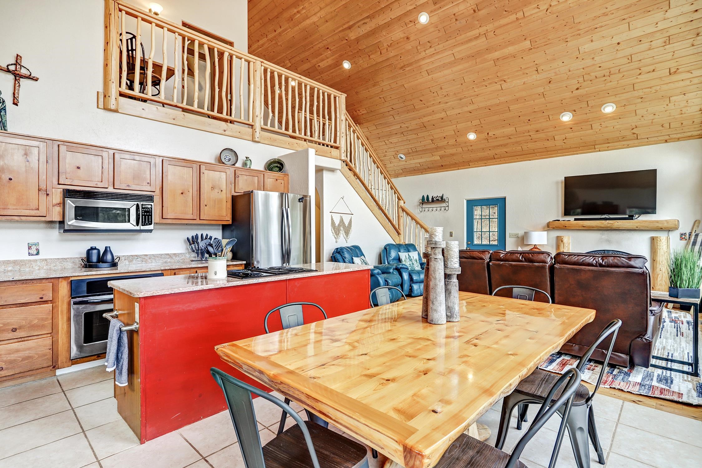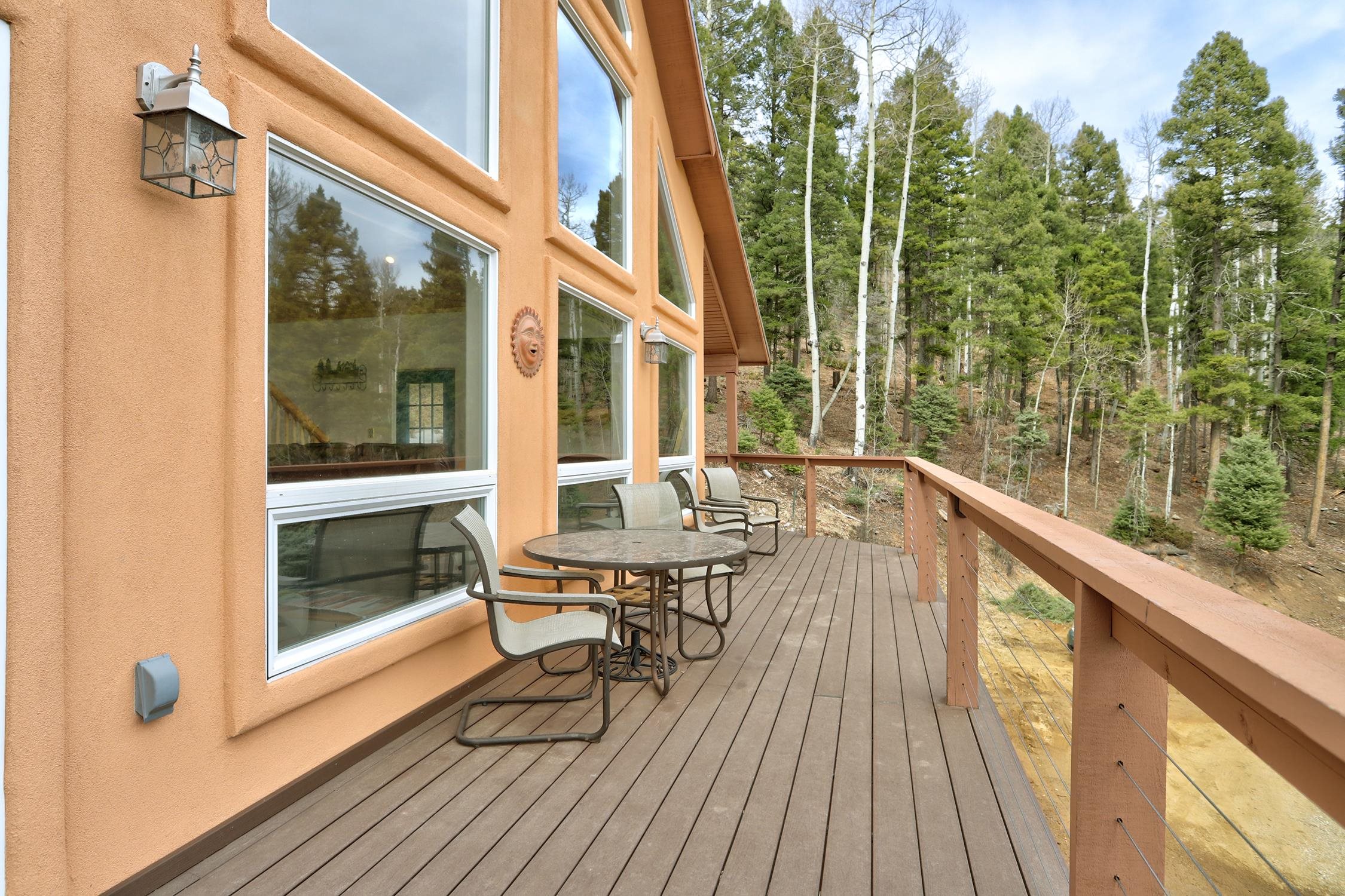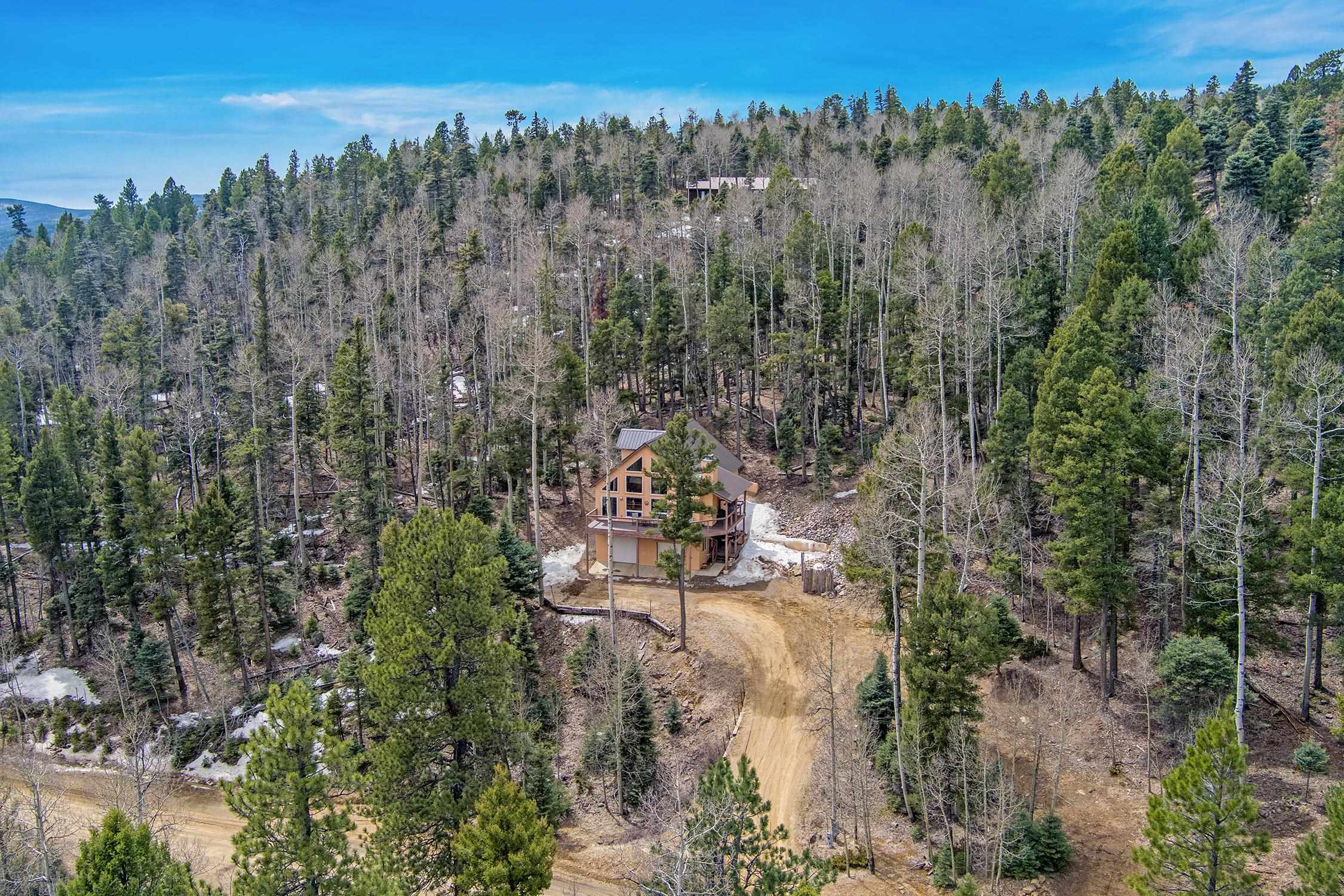 Perched in the trees of Angel Fire, NM, this 4-bedroom, 3-bathroom home is comfortable and inviting. As you step inside, you'll be greeted by a cozy living room, complete with a wood-burning stove, perfect for those chilly mountain evenings. The open-concept design seamlessly connects the living area to a kitchen featuring solid surface countertops, and a dining area with a wine bar, providing both style and functionality for all your gatherings. This home features not one, but two master suites, offering privacy and convenience. The additional loft space serves as a versatile area for extra sleeping with a sleeper sofa or an extra hangout spot. Step outside onto the expansive deck and take in the breathtaking mountain views that Angel Fire is renowned for. The large 1.64-acre lot provides ample space for outdoor activities and future landscaping dreams. The property is move-in ready, with a proven rental history, making it a home as well as an investment opportunity. For those with a passion for vehicles or outdoor gear, the 2-car garage includes an extra tall bay, accommodating larger vehicles or additional storage needs. Don’t delay, this stylish home is sure to get lots of attention!
