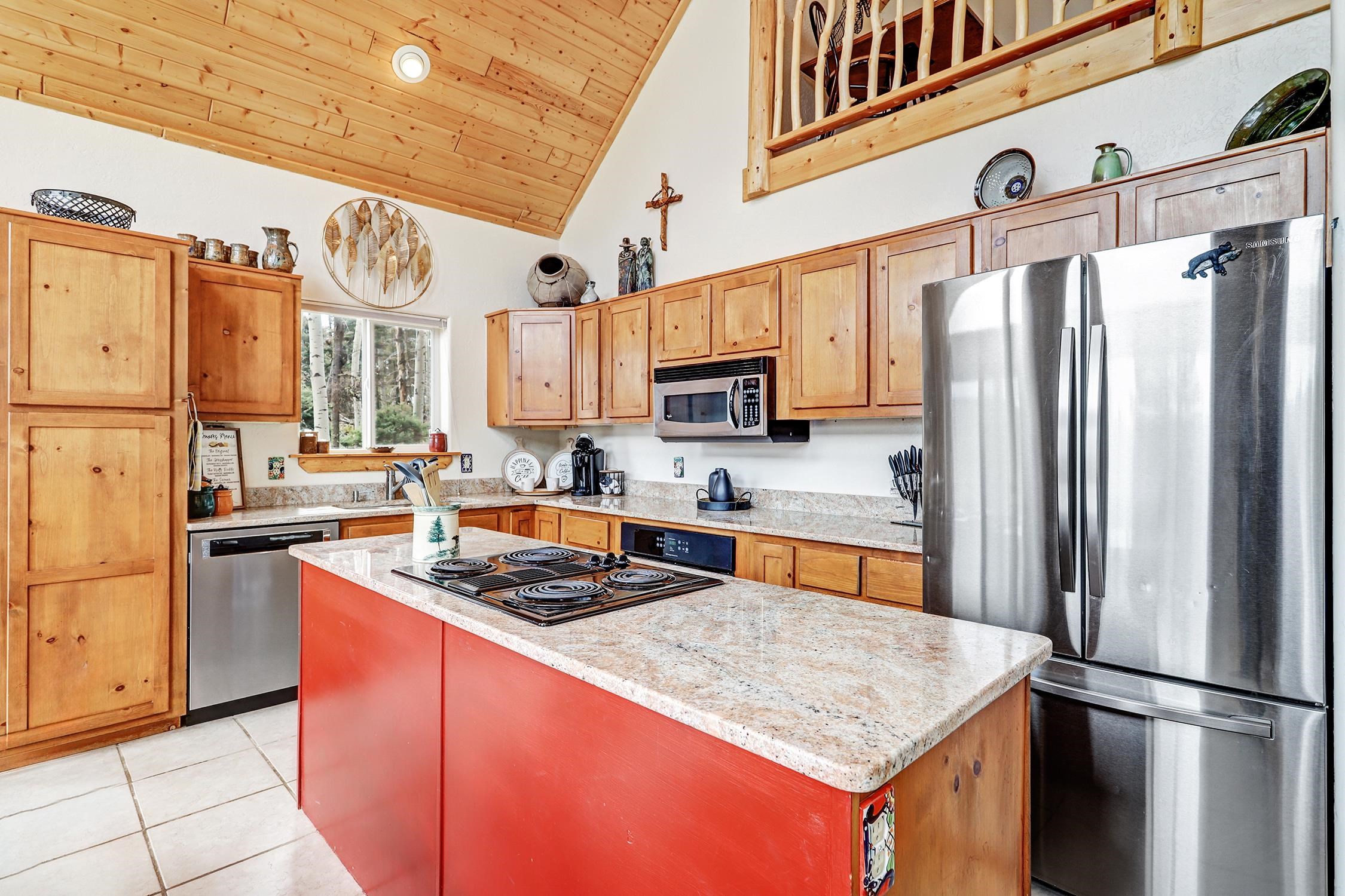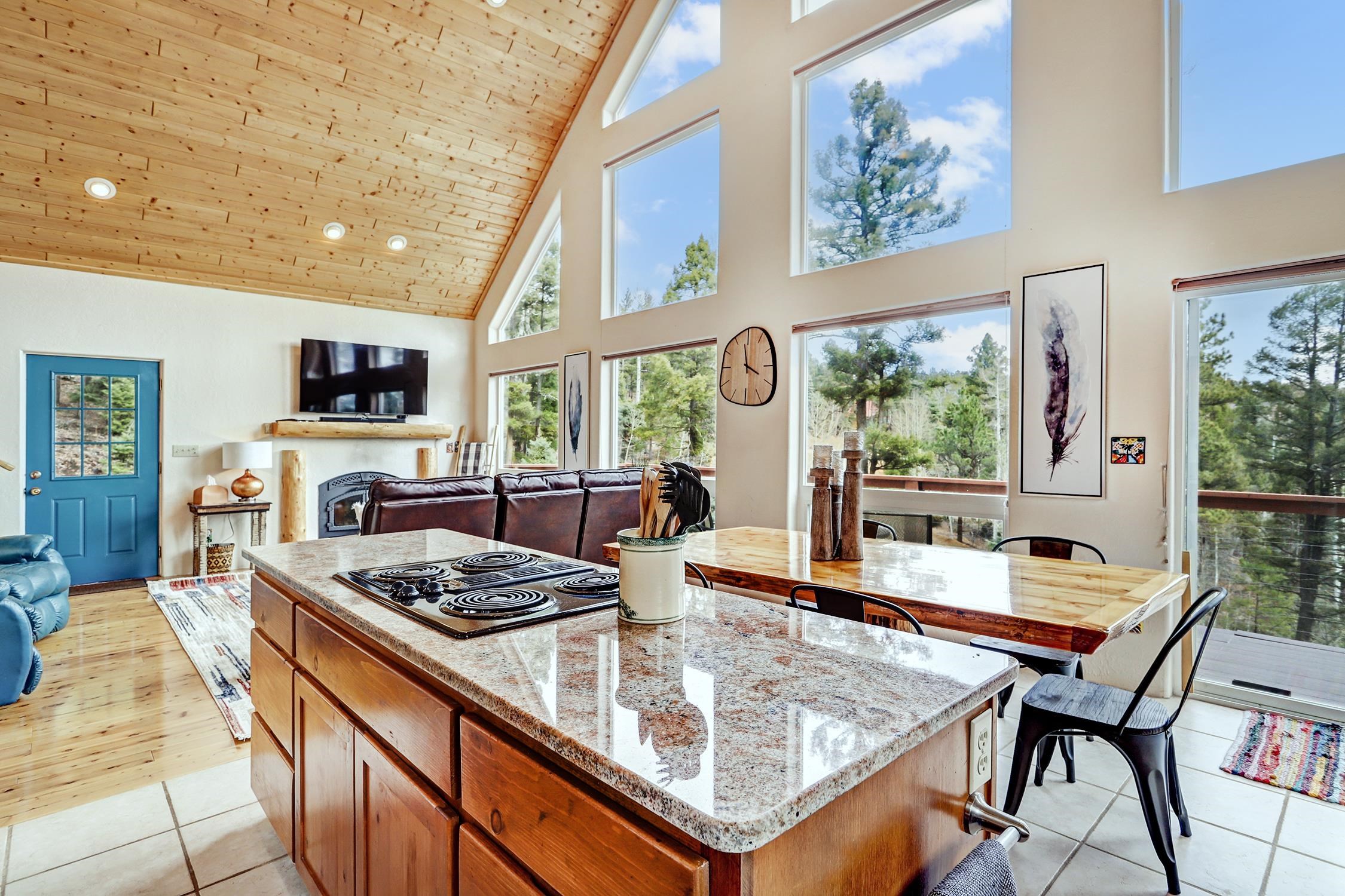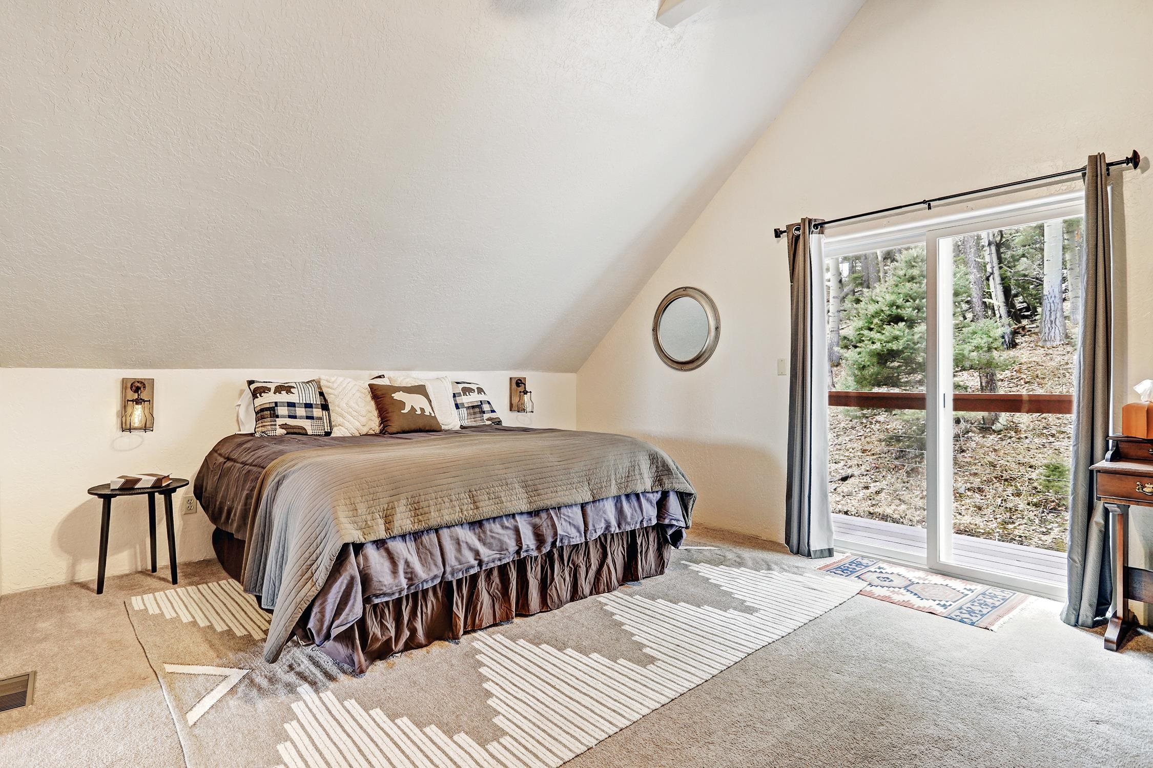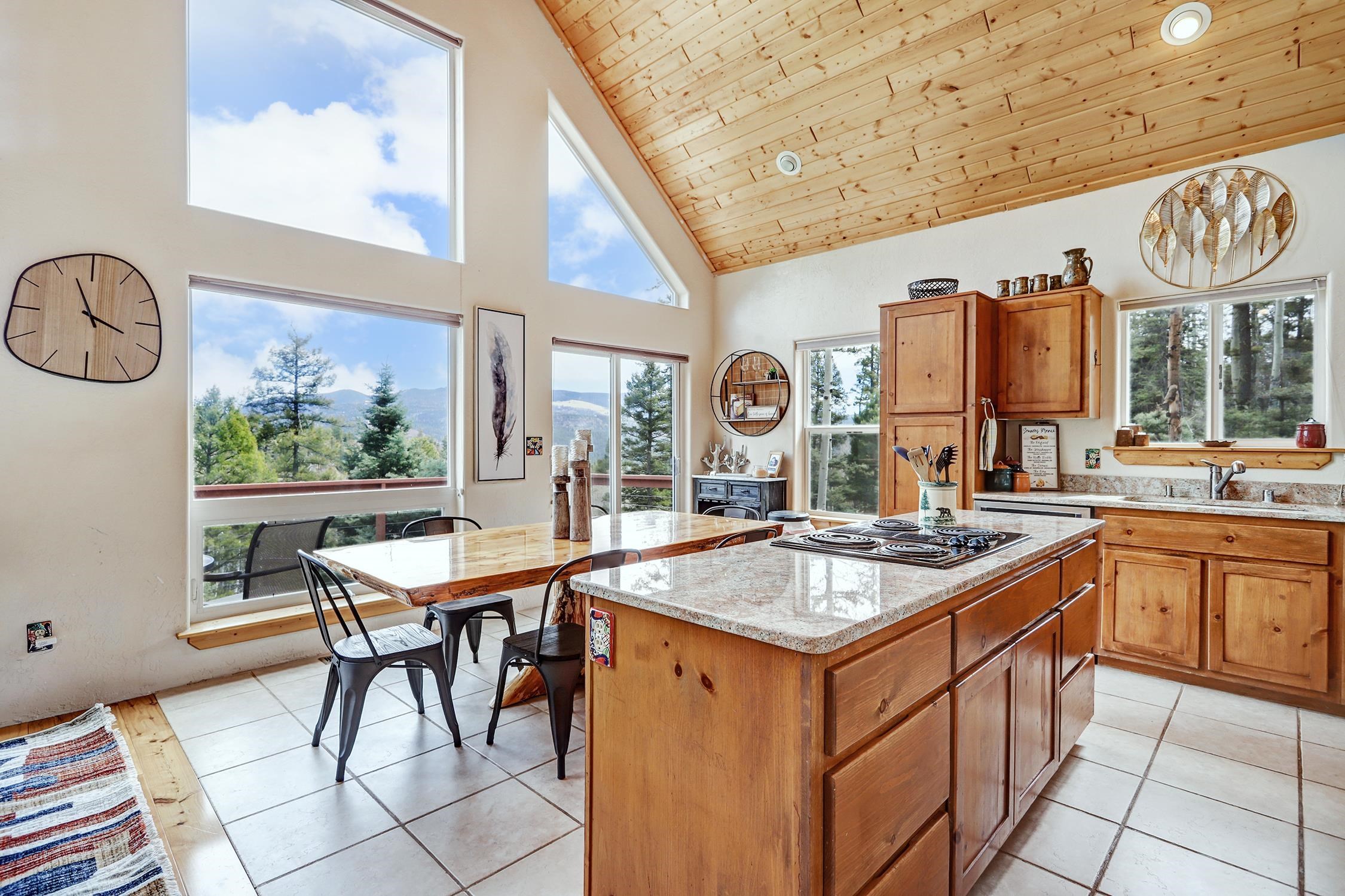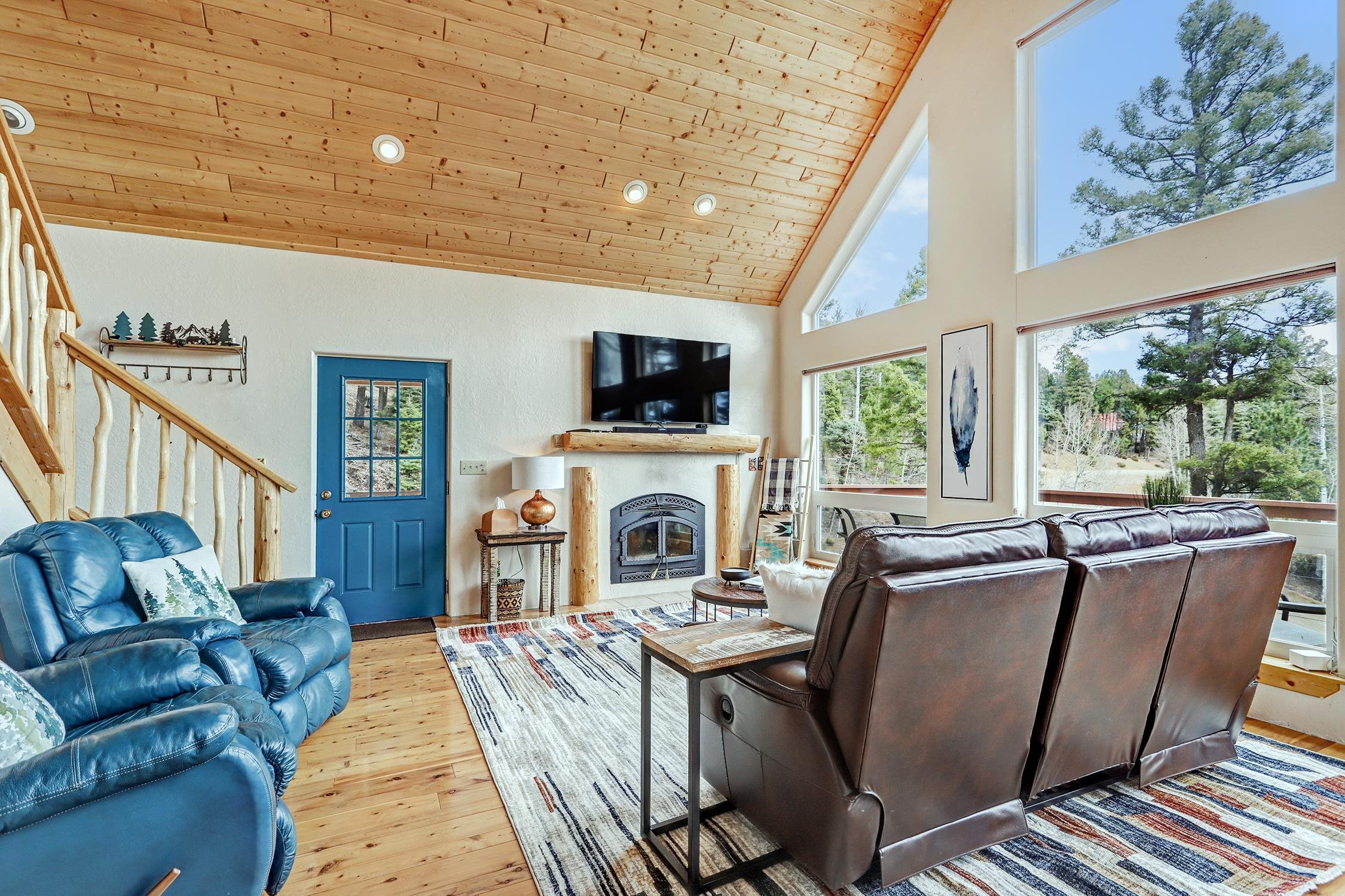 Perched in the trees of Angel Fire, NM, this 4-bedroom, 3-bathroom home is comfortable and inviting. As you step inside, you'll be greeted by a cozy living room, complete with a wood-burning stove, perfect for those chilly mountain evenings. The open-concept design seamlessly connects the living area to a kitchen featuring solid surface countertops, and a dining area with a wine bar, providing both style and functionality for all your gatherings. This home features not one, but two master suites, offering privacy and convenience. The additional loft space serves as a versatile area for extra sleeping with a sleeper sofa or an extra hangout spot. Step outside onto the expansive deck and take in the breathtaking mountain views that Angel Fire is renowned for. The large 1.64-acre lot provides ample space for outdoor activities and future landscaping dreams. The property is move-in ready, with a proven rental history, making it a home as well as an investment opportunity. For those with a passion for vehicles or outdoor gear, the 2-car garage includes an extra tall bay, accommodating larger vehicles or additional storage needs. Don’t delay, this stylish home is sure to get lots of attention!