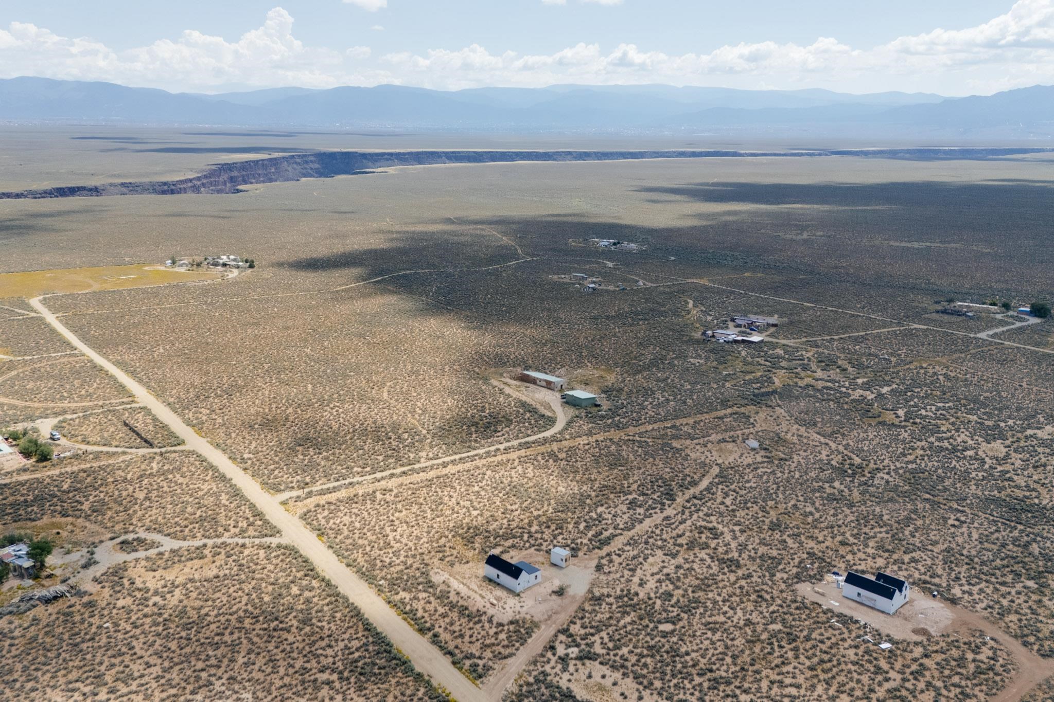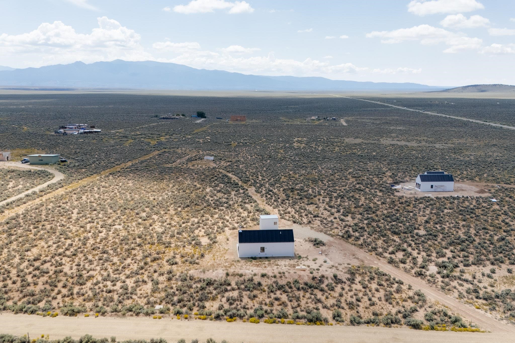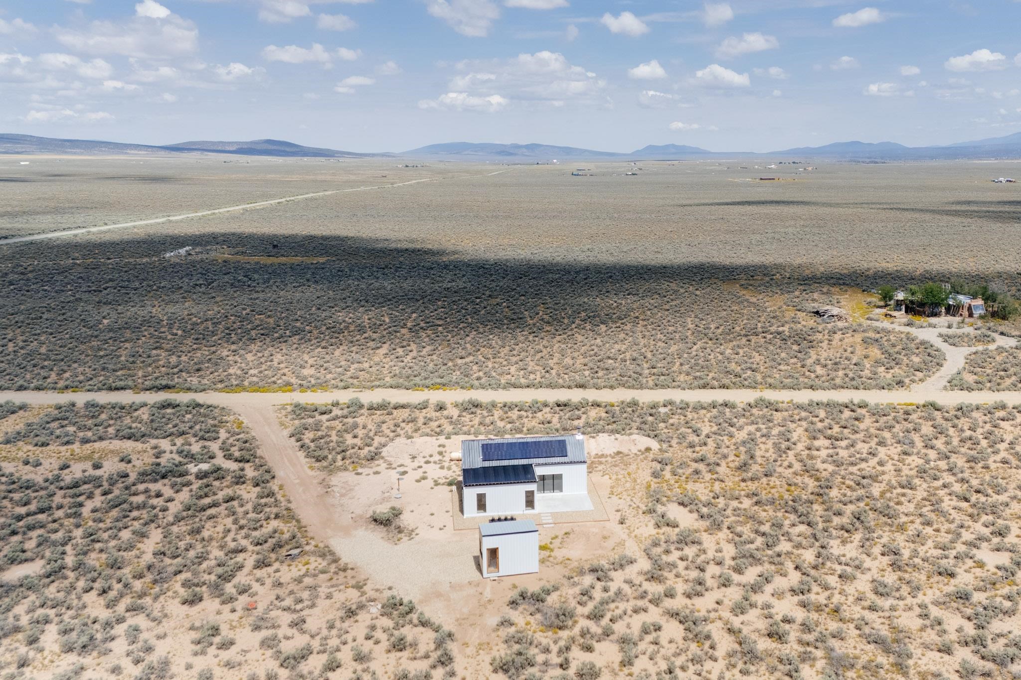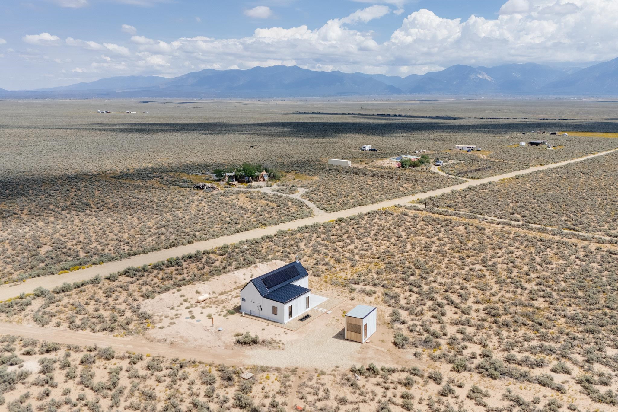 NEW CONSTRUCTION site-built house, the least expensive one in Taos County! 2-bed, 1-bath ~800 square foot single-family home just past the Gorge Bridge in a peaceful, quiet, friendly and easy-to-get-to neighborhood. Open kitchen, dining and living area with vaulted tongue-and-groove ceiling, large island for quick bites or to casually gather with friends and family, dining area for more formal meals, living room with beautiful wood-burning stove. Endless views of the Sangre de Cristos to the east and south, and a relaxing 20-minute walk to the West Rim Trail and National Monument for post-meal strolls, meditation or an intense run or bike, all with the splendor of the Gorge right beside you. The house is close to everything in the Taos area! 4 minutes to the Gorge Bridge. 15 down to the river and Taos Junction bridge, a fraction of the time it takes from the town of Taos, to relax or paddle all year long, or to swim on hot summer days. Under 20 to Cid’s and a smidge more to Taos Plaza. 35 to the Ski Valley. 25 to Ojo Caliente Spa. The exact same distance to Santa Fe as from town, down the “back way” on 285 instead of through Taos Canyon. House is 100% off-grid. Easy and sustainable living with brand-new systems in place. Windows flanking the east and south walls maximize solar gain, keeping heating costs low even during the coldest winters. Rinnai propane heater for cold winter nights. On-demand heater for lightning-fast hot water. 2.4kW solar system with battery storage for overnight usage and to provide multiple days of electricity those few times of year when the Taos area is socked in. TaosNet high-speed wireless Internet relay station is practically next door, providing reliable internet to the neighborhood and beyond. Water catchment with gutters that direct monsoonal rains and winter snow into a 2500-gallon cistern, ample water storage to get you through dry spells; new UV and sediment filters purify the water as it comes inside. Every square inch of the house is brand-new: metal roof and siding that should last 40-50 years. High quality double-paned windows, insulated slab flooring, deep 2x6 walls with R-21 insulation, and R-49 in the roof to keep it warmer in the winter and cooler in summer. Brand-new solar system, kitchen appliances, propane heater, hot water heater and septic. Brand-new wood stove should keep your propane costs low in winter. Laundry hook ups for full-size stackable washer and dryer. Storage attic with ladder to stash your seldom-used things. Large, insulated, light-filled all-season shed, built on-site for construction, included with the house. Use it for overflow storage, as an office or craft room, or wherever your bliss takes you. 3 total acres of sagebrush, all yours, awaiting your green thumb to add shade trees or other exterior landscaping. Local Taos builder with decades of experience building and living in off-grid homes, including his own primary residence and other properties in the immediate West Rim area and throughout Taos County. It may be the least expensive new construction in the area, but it was built with the same quality materials and expert tradespeople as homes many times the price. Come over and take a look! Find yourself at home!