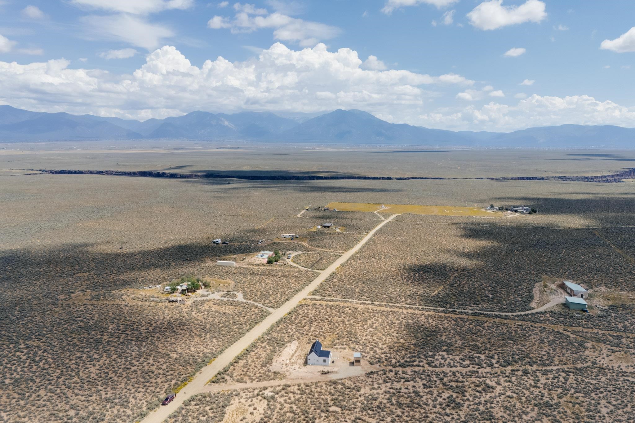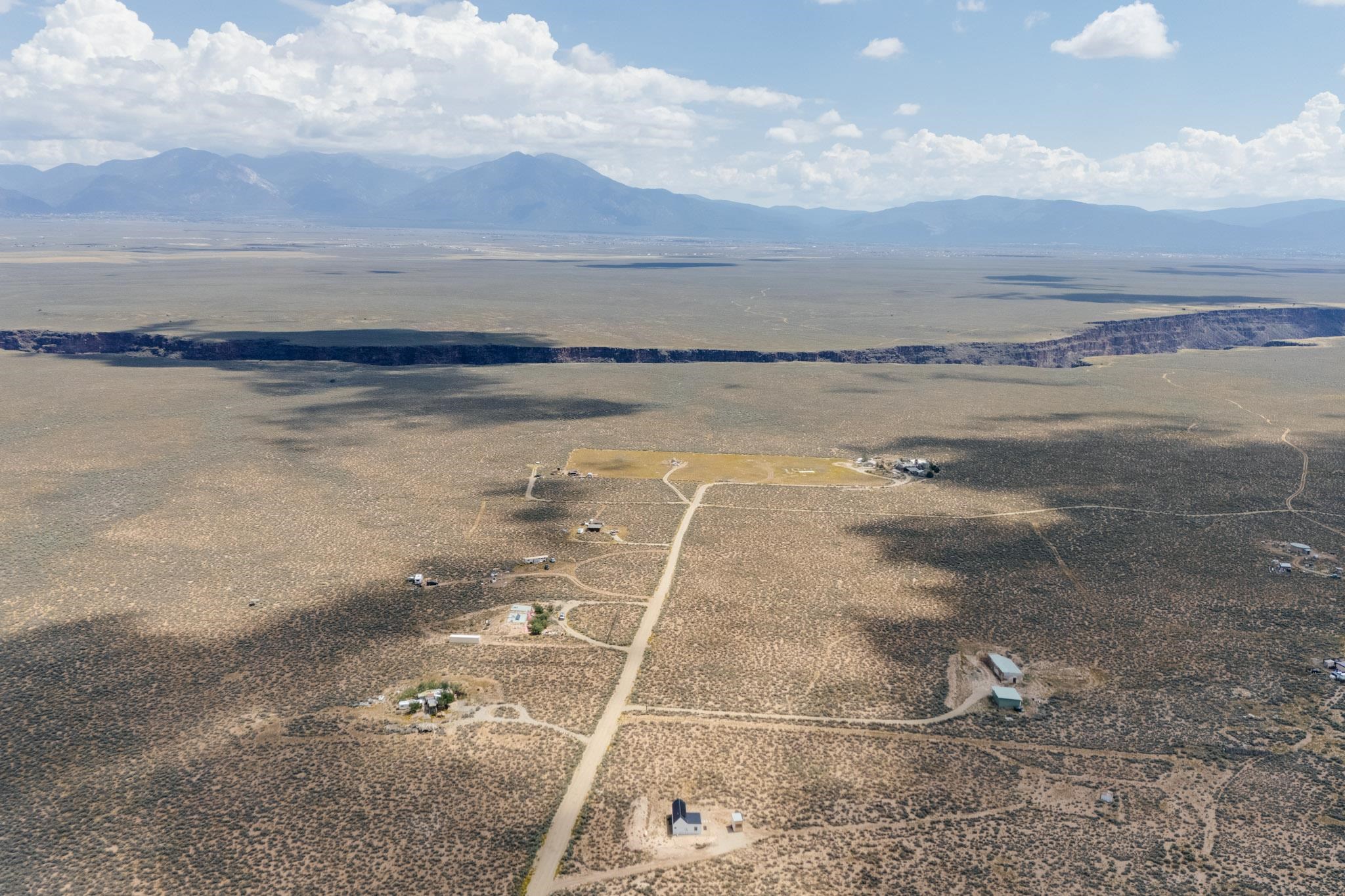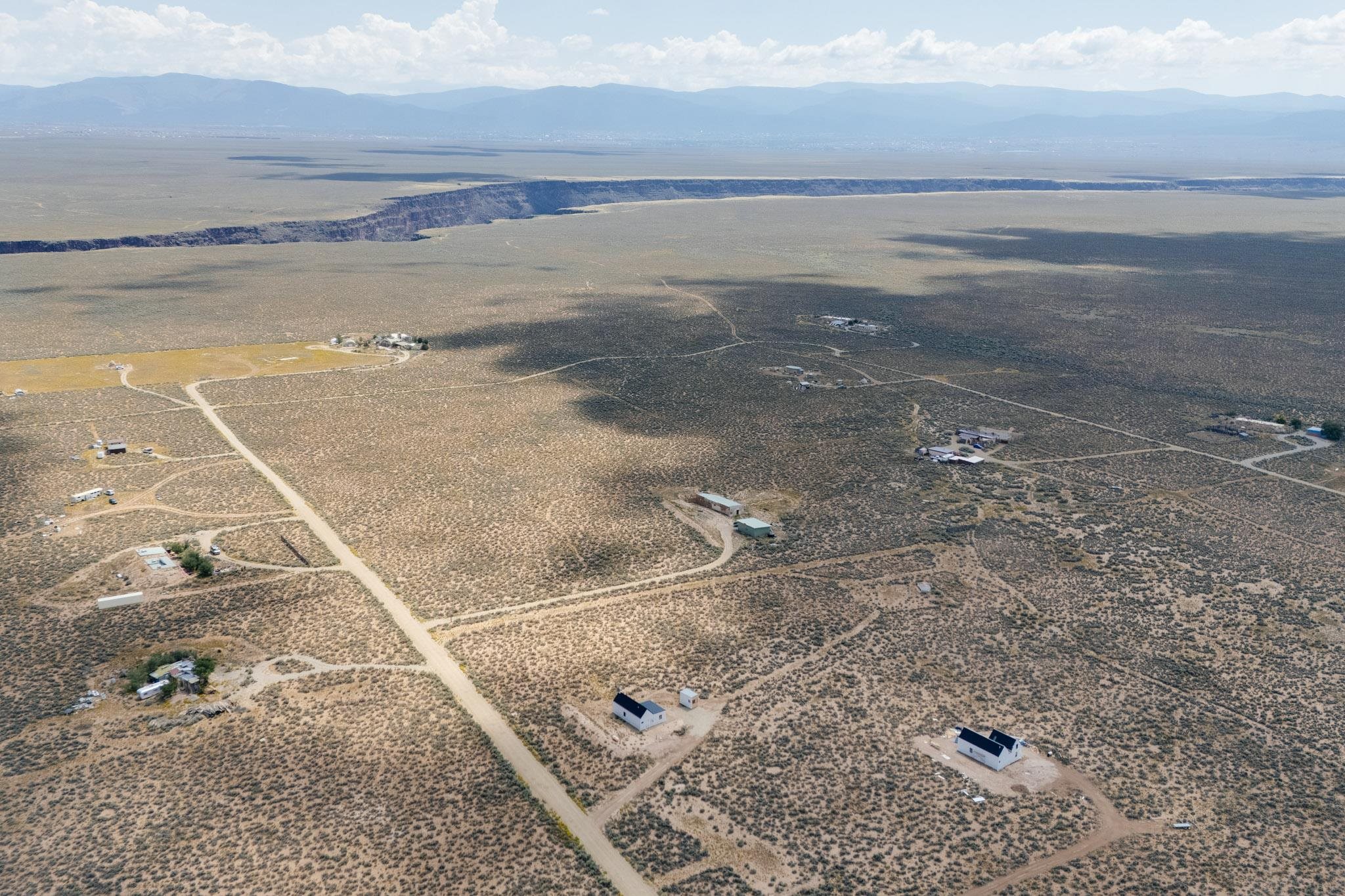 NEW CONSTRUCTION site-built house, the least expensive one in Taos County! 2-bed, 1-bath ~800 square foot single-family home just past the Gorge Bridge in a peaceful, quiet, friendly and easy-to-get-to neighborhood. Open kitchen, dining and living area with vaulted tongue-and-groove ceiling, large island for quick bites or to casually gather with friends and family, dining area for more formal meals, living room with beautiful wood-burning stove. Endless views of the Sangre de Cristos to the east and south, and a relaxing 20-minute walk to the West Rim Trail and National Monument for post-meal strolls, meditation or an intense run or bike, all with the splendor of the Gorge right beside you. The house is close to everything in the Taos area! 4 minutes to the Gorge Bridge. 15 down to the river and Taos Junction bridge, a fraction of the time it takes from the town of Taos, to relax or paddle all year long, or to swim on hot summer days. Under 20 to Cid’s and a smidge more to Taos Plaza. 35 to the Ski Valley. 25 to Ojo Caliente Spa. The exact same distance to Santa Fe as from town, down the “back way” on 285 instead of through Taos Canyon. House is 100% off-grid. Easy and sustainable living with brand-new systems in place. Windows flanking the east and south walls maximize solar gain, keeping heating costs low even during the coldest winters. Rinnai propane heater for cold winter nights. On-demand heater for lightning-fast hot water. 2.4kW solar system with battery storage for overnight usage and to provide multiple days of electricity those few times of year when the Taos area is socked in. TaosNet high-speed wireless Internet relay station is practically next door, providing reliable internet to the neighborhood and beyond. Water catchment with gutters that direct monsoonal rains and winter snow into a 2500-gallon cistern, ample water storage to get you through dry spells; new UV and sediment filters purify the water as it comes inside. Every square inch of the house is brand-new: metal roof and siding that should last 40-50 years. High quality double-paned windows, insulated slab flooring, deep 2x6 walls with R-21 insulation, and R-49 in the roof to keep it warmer in the winter and cooler in summer. Brand-new solar system, kitchen appliances, propane heater, hot water heater and septic. Brand-new wood stove should keep your propane costs low in winter. Laundry hook ups for full-size stackable washer and dryer. Storage attic with ladder to stash your seldom-used things. Large, insulated, light-filled all-season shed, built on-site for construction, included with the house. Use it for overflow storage, as an office or craft room, or wherever your bliss takes you. 3 total acres of sagebrush, all yours, awaiting your green thumb to add shade trees or other exterior landscaping. Local Taos builder with decades of experience building and living in off-grid homes, including his own primary residence and other properties in the immediate West Rim area and throughout Taos County. It may be the least expensive new construction in the area, but it was built with the same quality materials and expert tradespeople as homes many times the price. Come over and take a look! Find yourself at home!