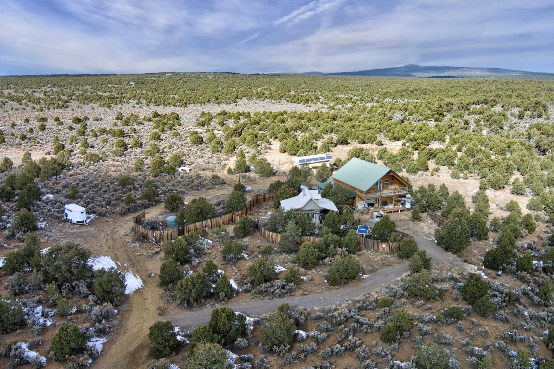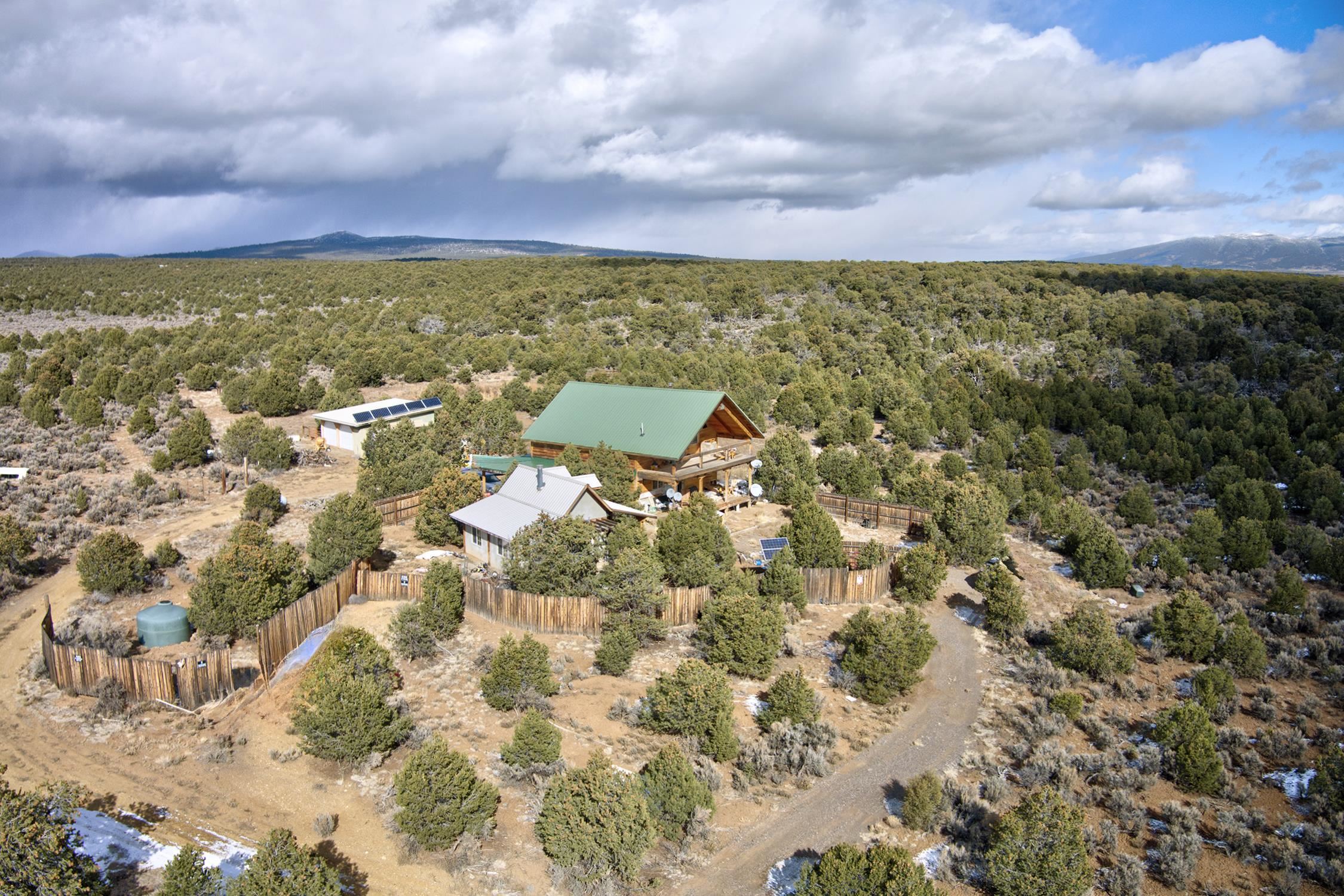 Welcome to Flying F Ranch, a rare 288.59-acre property where Southwestern charm meets sustainable living. With unobstructed views stretching 35 miles, this one-of-a-kind ranch is a rugged sanctuary awaiting your creative vision. Two primary residences provide plenty of space for everyone. Enjoy unmatched views from the second-floor primary suite and spacious covered balcony of the 2-bedroom, 1.5bath chalet. The classic adobe home features a sunken living room 2 Carmen Velarde fireplaces, a wood stove, and a galley kitchen with custom tile countertops and backsplash and brick flooring. Outbuildings include a 2-room cabin, your own turn of the century adobe chapel, two hay barns, a workshop, garage and more. Plenty of space to roam, raise, or ride. We'll provide the bones and bling, you bring your imagination. Whether you're seeking a retreat, a working ranch, or an inspiring canvas for your dreams, Flying F Ranch is an offering unlike any other. A place of wild, panoramic freedom, where sunrises and starlit skies become daily rituals.