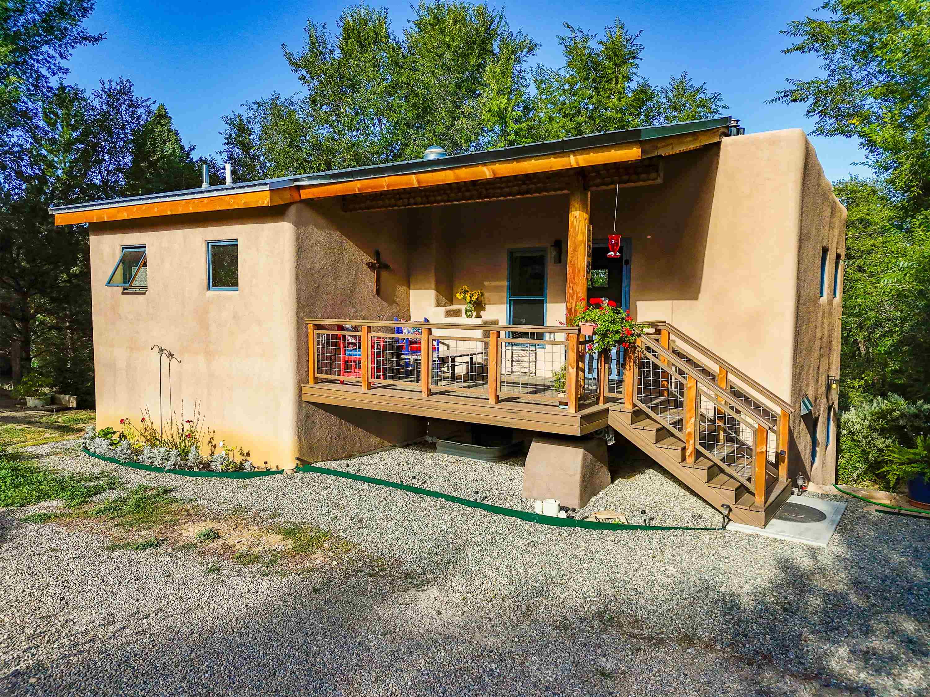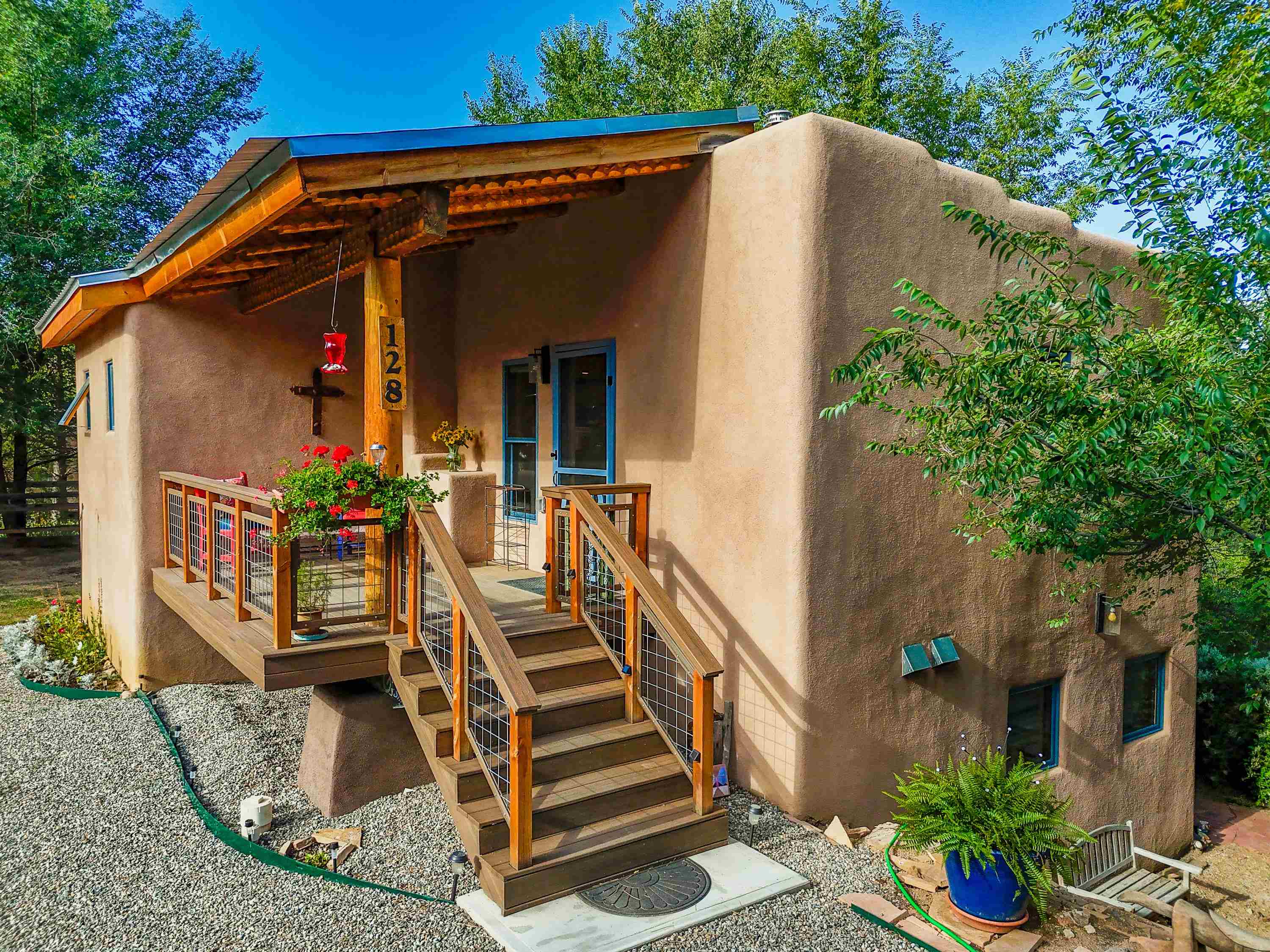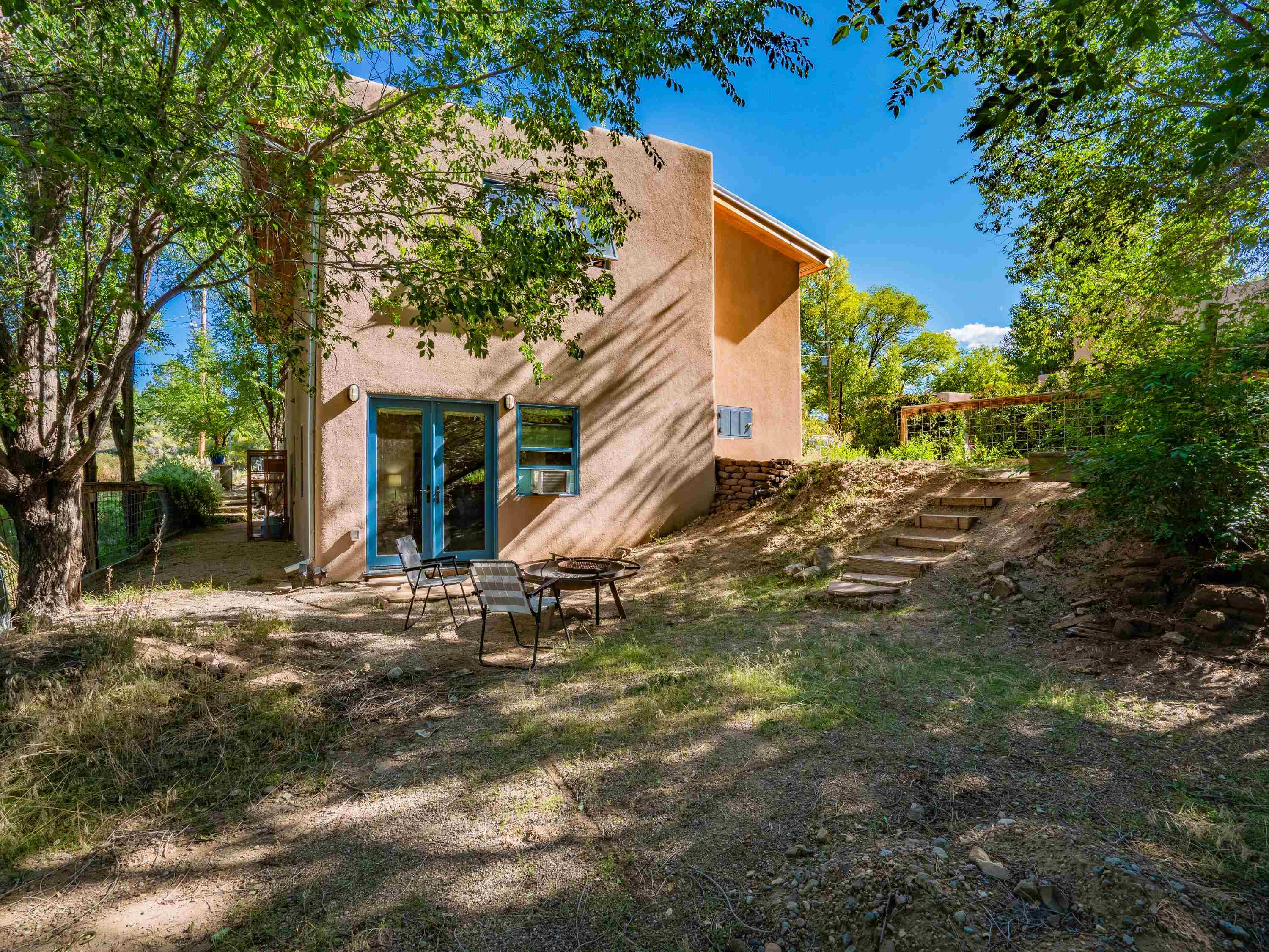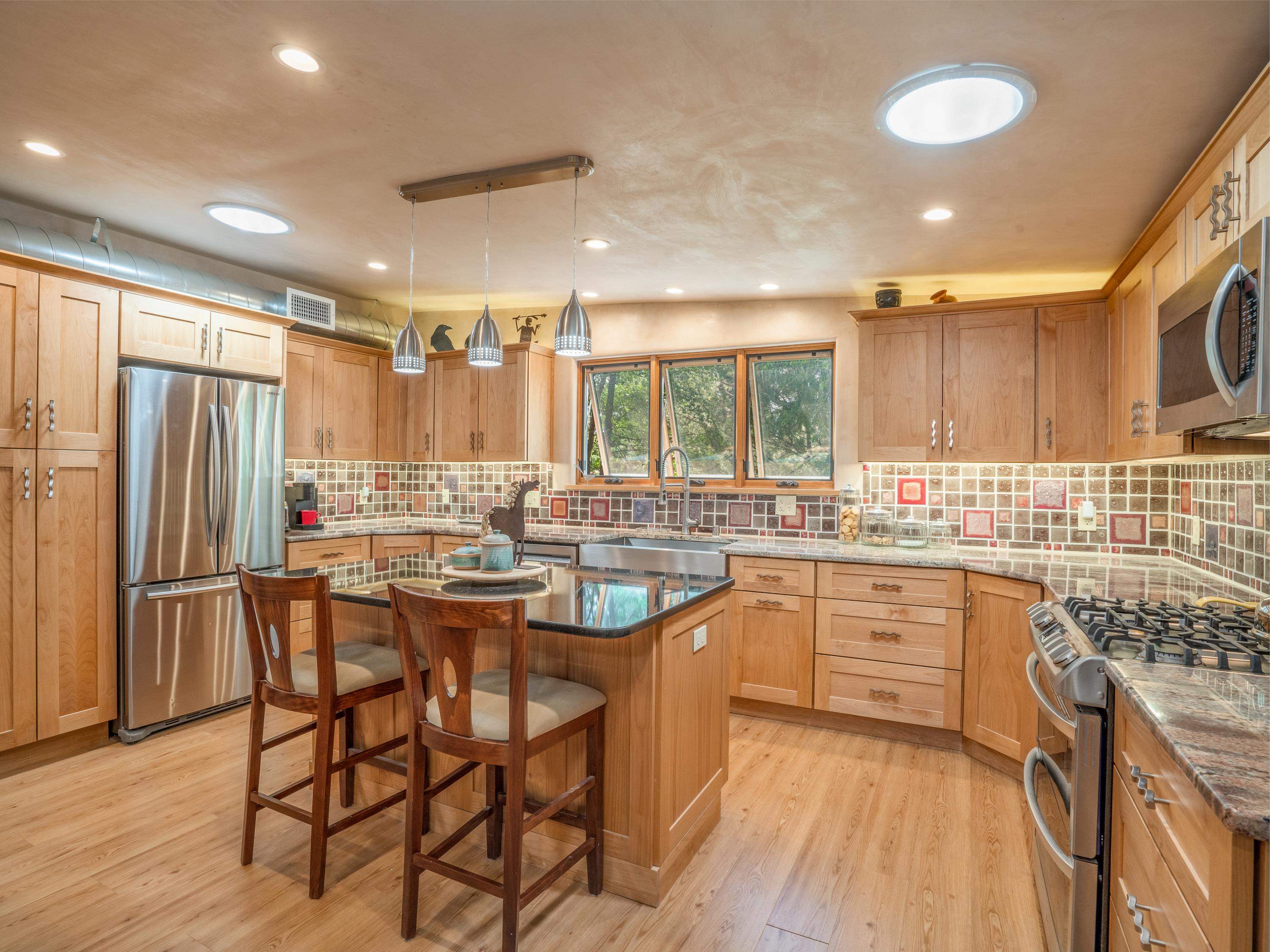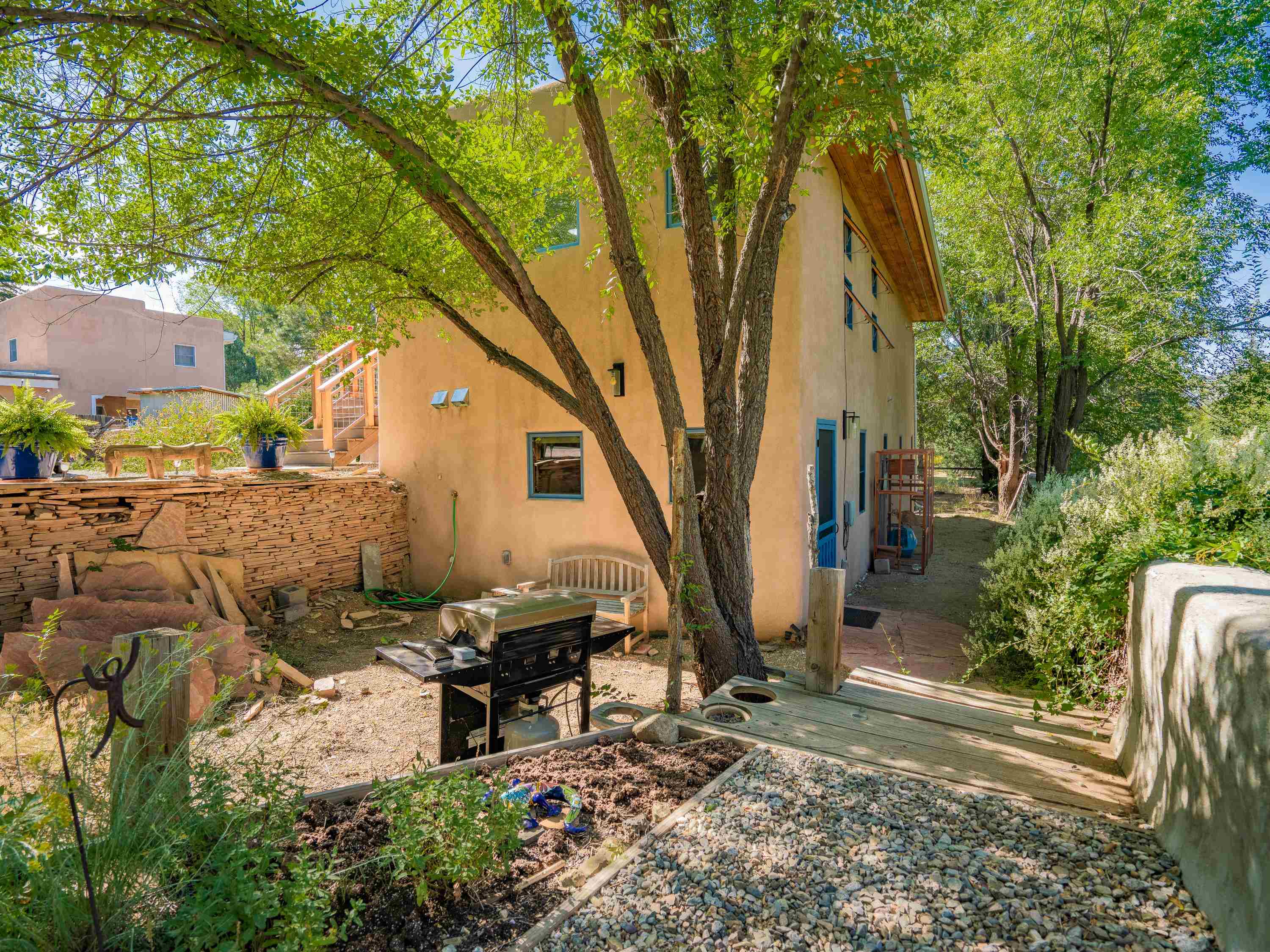 This completely renovated home in the heart of Taos is not to be missed! It is perfectly located within walking distance to Taos Plaza and shops, yet nestled peacefully in the trees. Las Cruces Road is tucked into a sweet, quiet neighborhood, just off Kit Carson Road. A generous front deck greets you upon arrival to this home. Beautiful, carved beams and adobe accents grace the exterior. Inside, you’ll find thoughtful contemporary stylings throughout. This two bedroom, two full bathroom home was entirely, recently renovated. It features all new plumbing and electrical, high end stainless steel appliances, and custom, artful tile work throughout the home. A large, open concept living area expands into a spacious kitchen. Granite countertops, a large center island, double oven, and sophisticated lighting make this kitchen a chef’s dream. One of a kind tile work is featured on the backsplash, a truly artistic cooking environment. Large windows and skylights let plenty of light in, offering views of the treetops. On the same level is a laundry room with plenty of storage, and a full bathroom. The exquisite tile work echos through the shower and tub, as well as the vanity and mirror. A beautiful staircase leading downstairs features stainless steel railings and more artful tile risers. There are two bedrooms and one full bathroom downstairs. The bathroom features a gorgeous glass and tile shower. The large master bedroom boasts a large walk in closet, and French doors that open into a tree filled backyard and a private patio. The spacious yard, set on .25 acres, homes gorgeous shade trees. Listen to the wind and birds as the rest of the world melts away. Stone paver walkways around the home, gardens, a stone wall, and a partially fenced yard enhance the outdoor space. There is an additional 96 square foot storage shed for your tools and toys. This is a beautifully renovated home, in an incredible location. Reach out to set up a private viewing today.