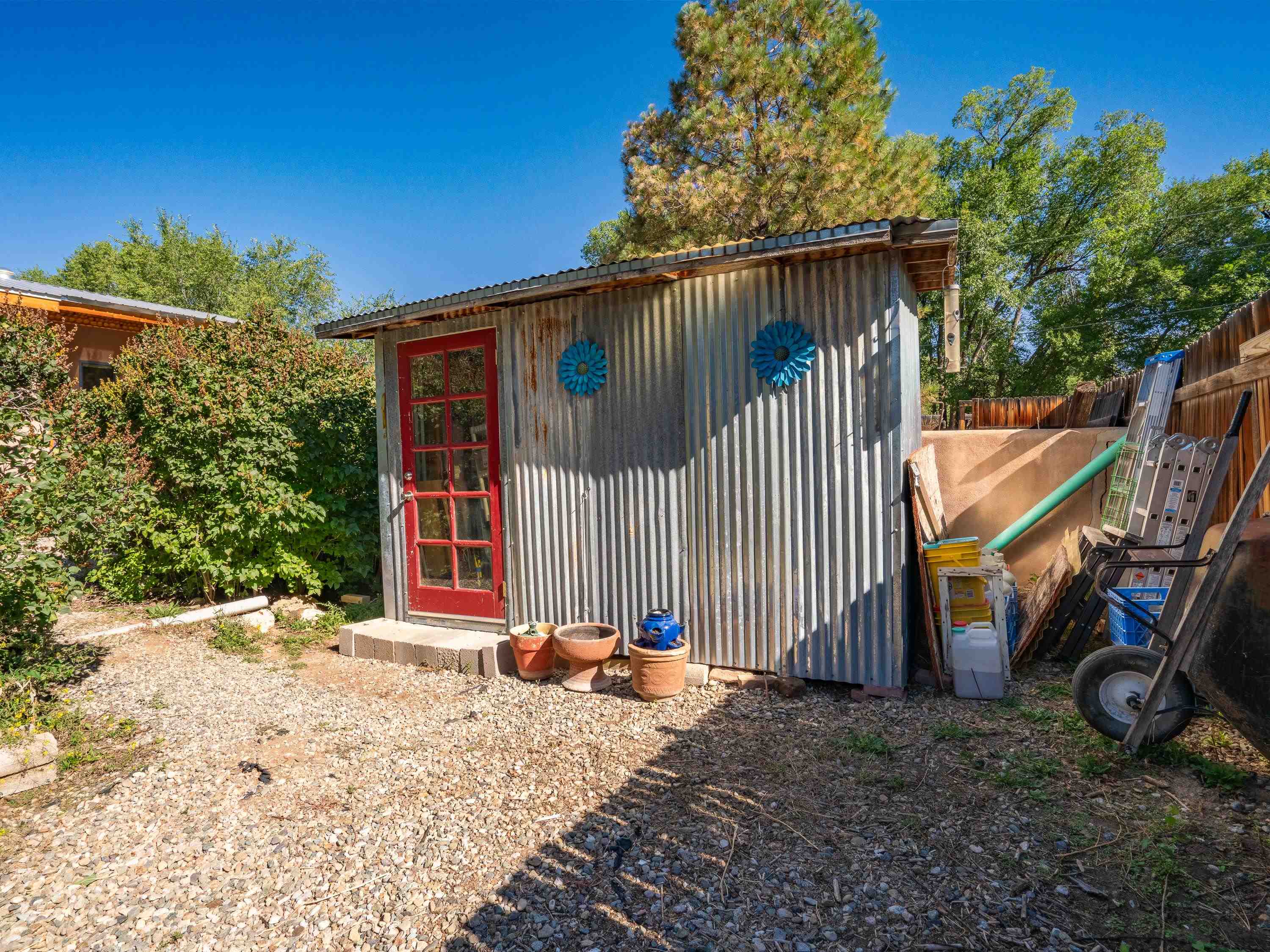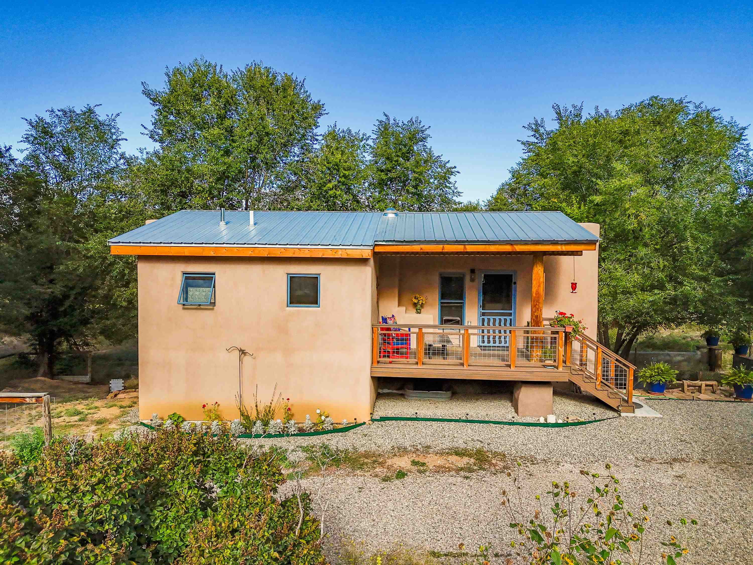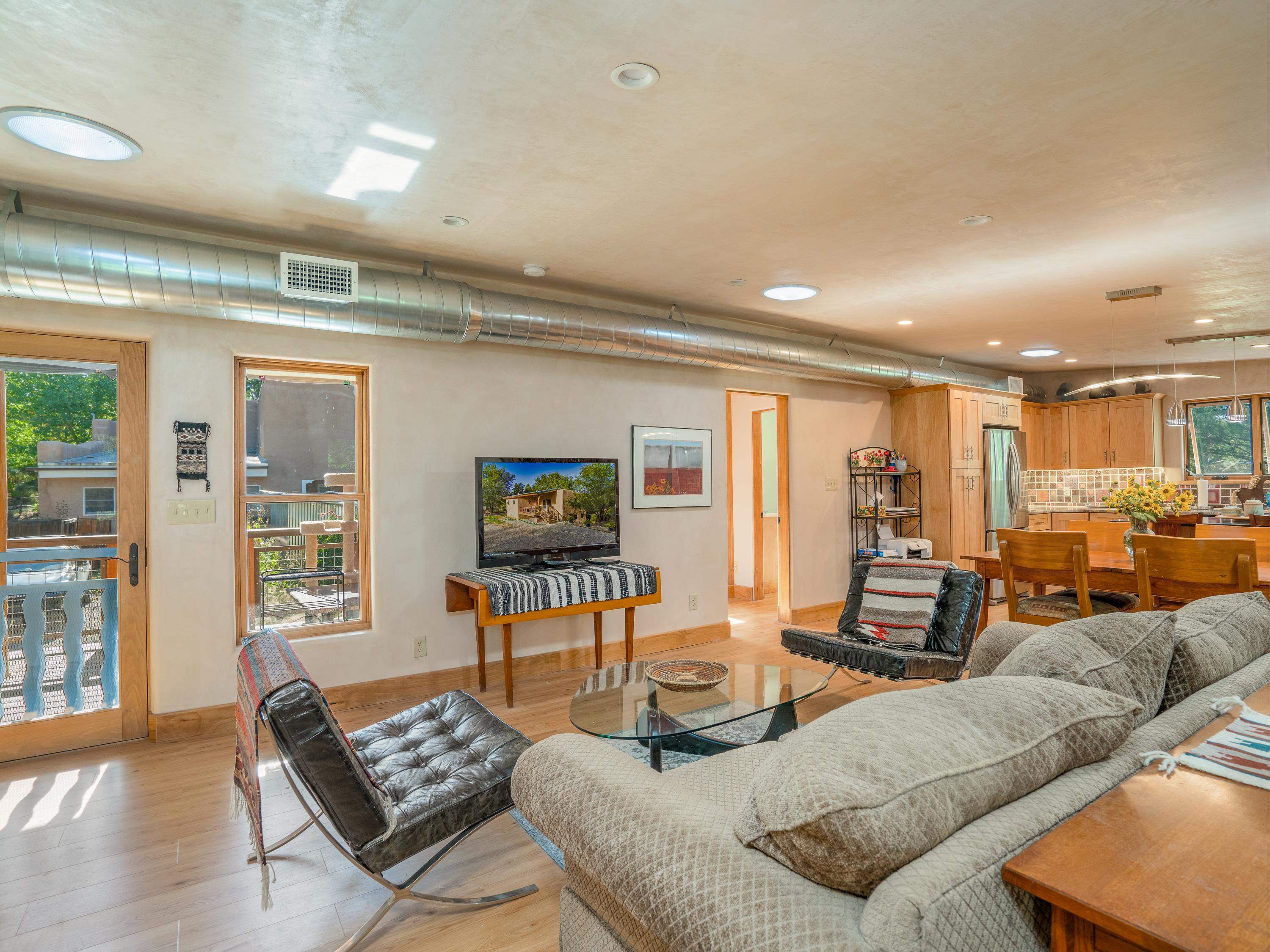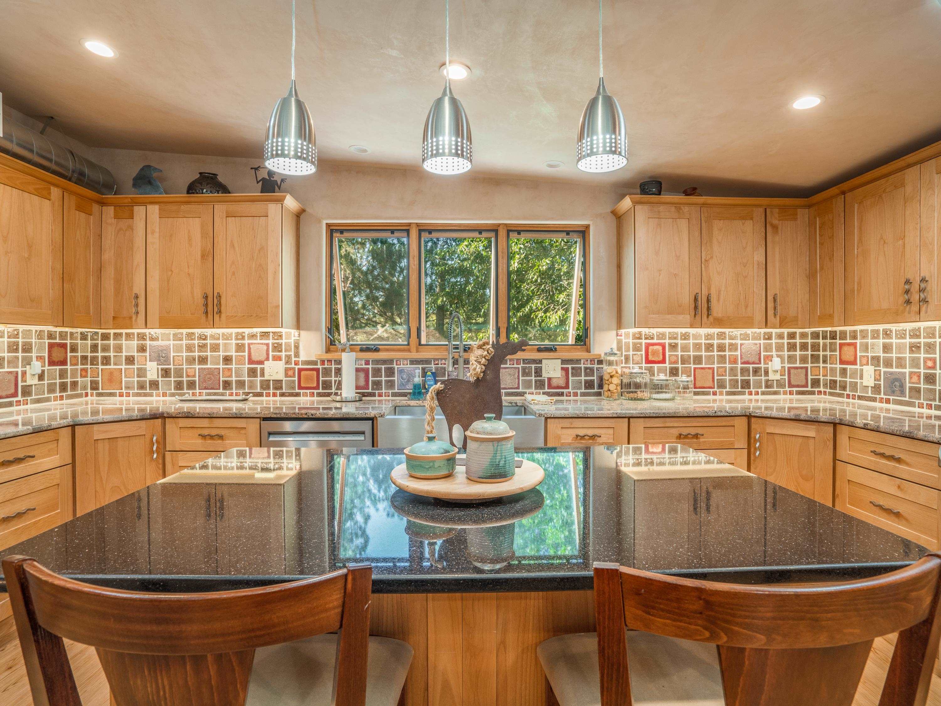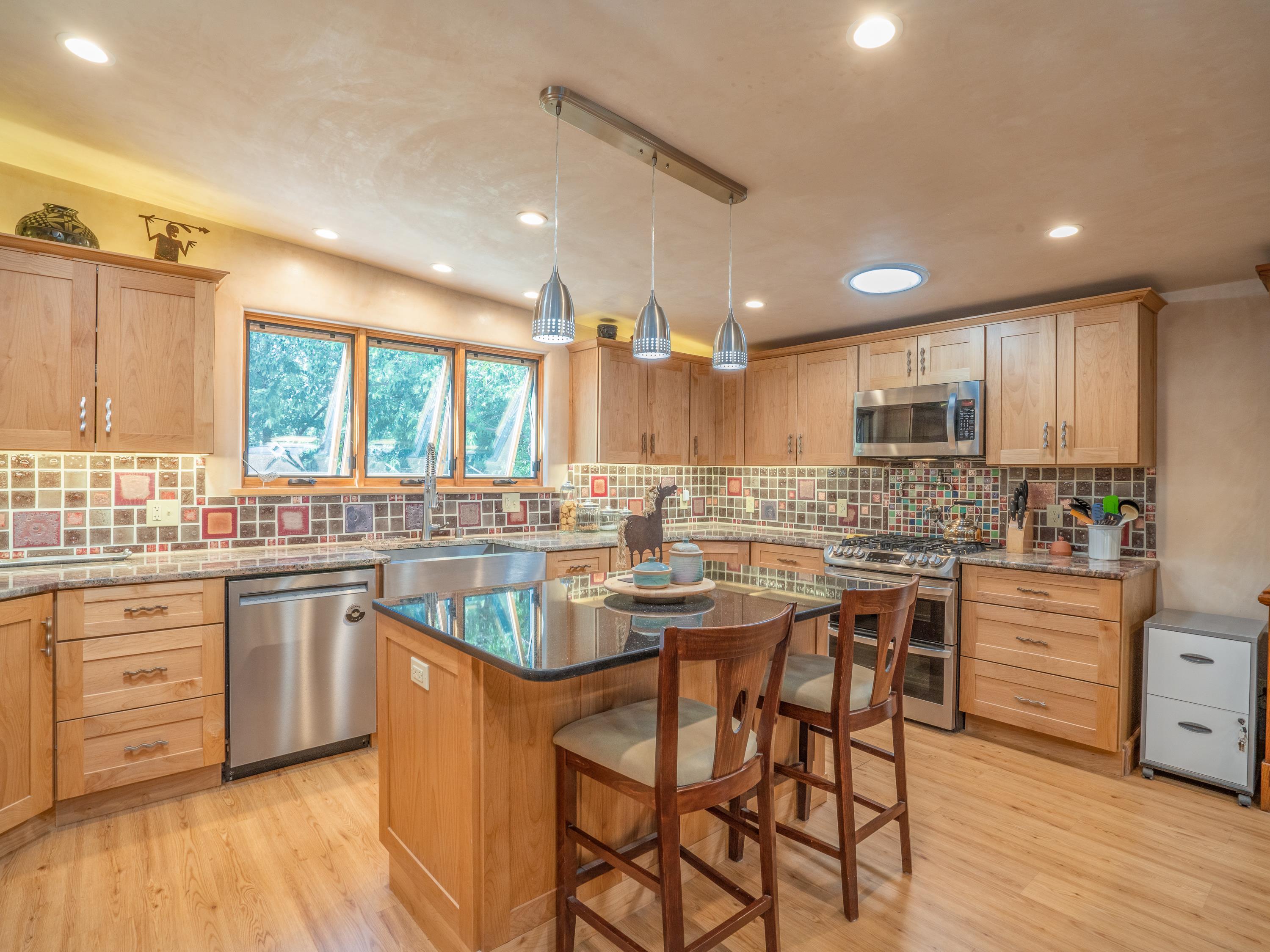 This completely renovated home in the heart of Taos is not to be missed! It is perfectly located within walking distance to Taos Plaza and shops, yet nestled peacefully in the trees. Las Cruces Road is tucked into a sweet, quiet neighborhood, just off Kit Carson Road. A generous front deck greets you upon arrival to this home. Beautiful, carved beams and adobe accents grace the exterior. Inside, you’ll find thoughtful contemporary stylings throughout. This two bedroom, two full bathroom home was entirely, recently renovated. It features all new plumbing and electrical, high end stainless steel appliances, and custom, artful tile work throughout the home. A large, open concept living area expands into a spacious kitchen. Granite countertops, a large center island, double oven, and sophisticated lighting make this kitchen a chef’s dream. One of a kind tile work is featured on the backsplash, a truly artistic cooking environment. Large windows and skylights let plenty of light in, offering views of the treetops. On the same level is a laundry room with plenty of storage, and a full bathroom. The exquisite tile work echos through the shower and tub, as well as the vanity and mirror. A beautiful staircase leading downstairs features stainless steel railings and more artful tile risers. There are two bedrooms and one full bathroom downstairs. The bathroom features a gorgeous glass and tile shower. The large master bedroom boasts a large walk in closet, and French doors that open into a tree filled backyard and a private patio. The spacious yard, set on .25 acres, homes gorgeous shade trees. Listen to the wind and birds as the rest of the world melts away. Stone paver walkways around the home, gardens, a stone wall, and a partially fenced yard enhance the outdoor space. There is an additional 96 square foot storage shed for your tools and toys. This is a beautifully renovated home, in an incredible location. Reach out to set up a private viewing today.