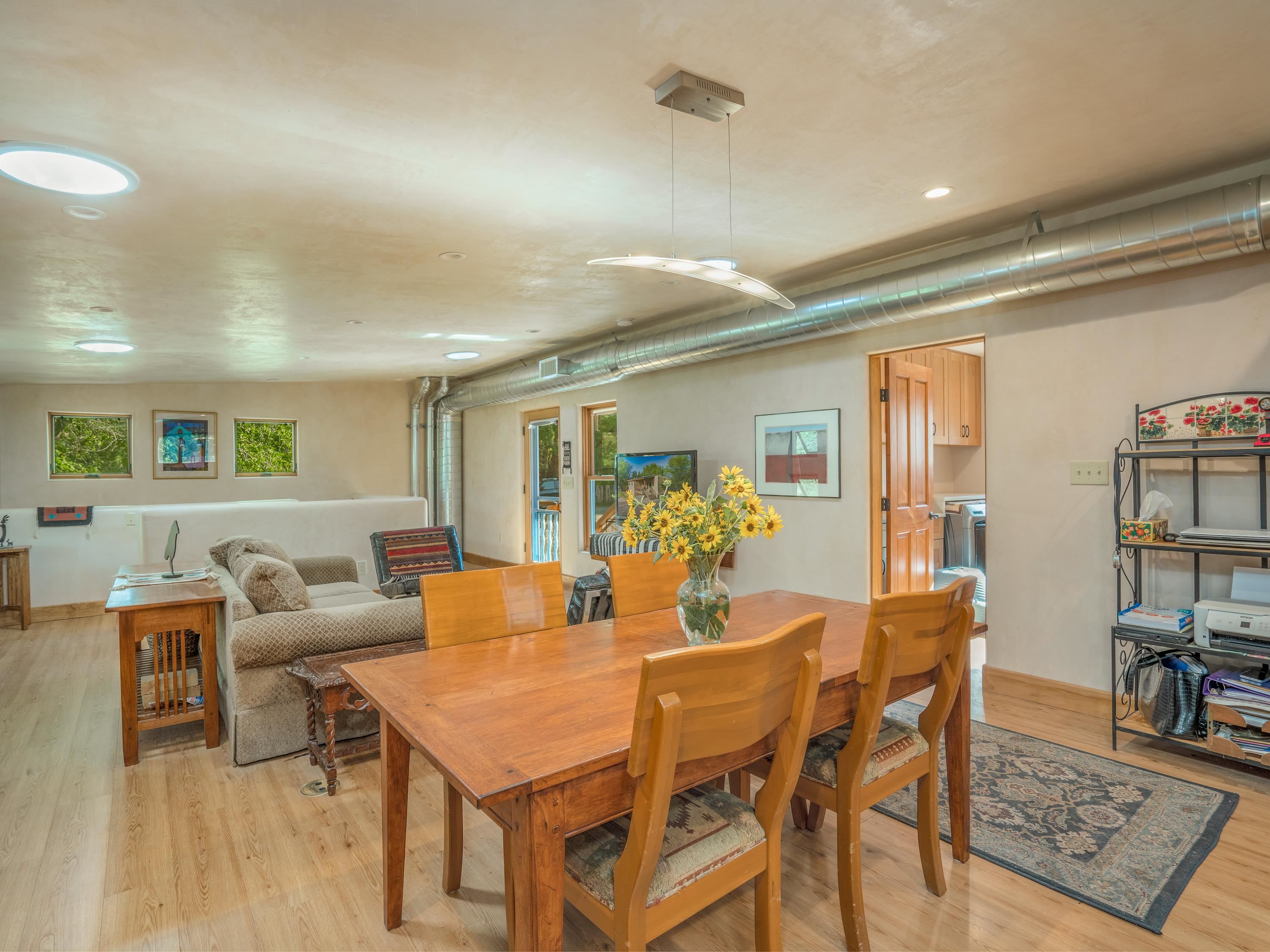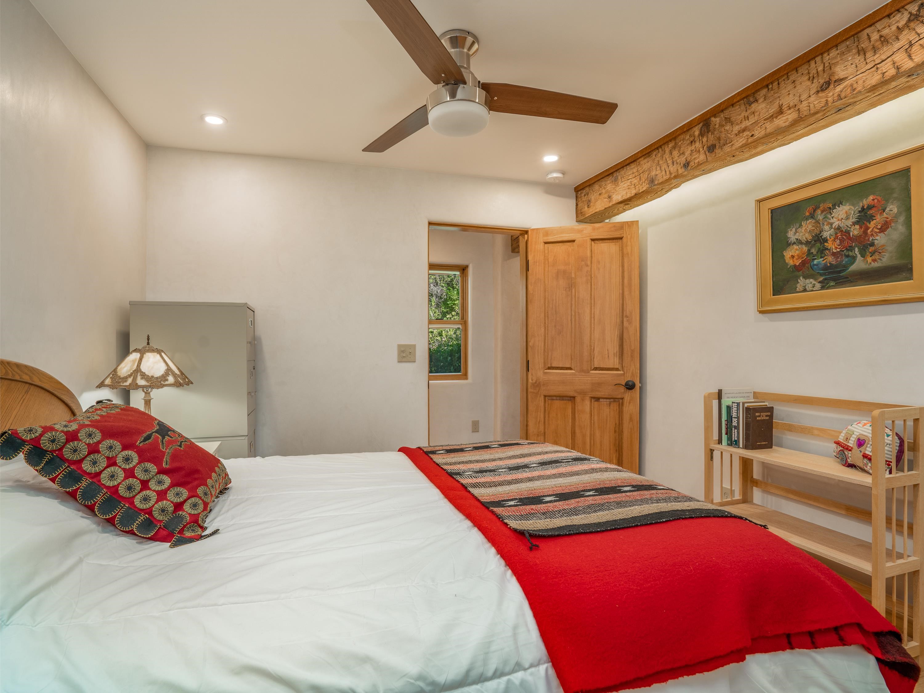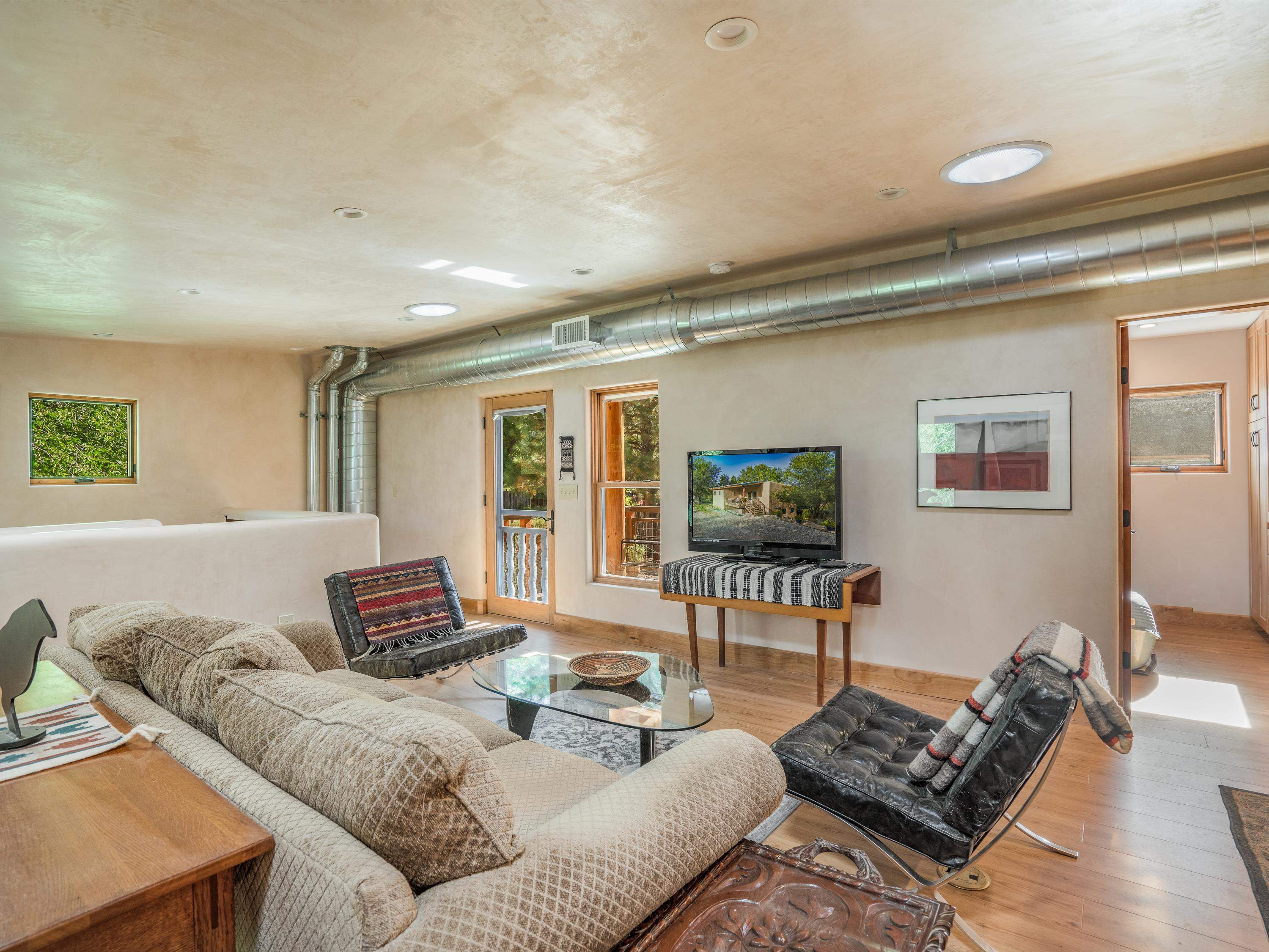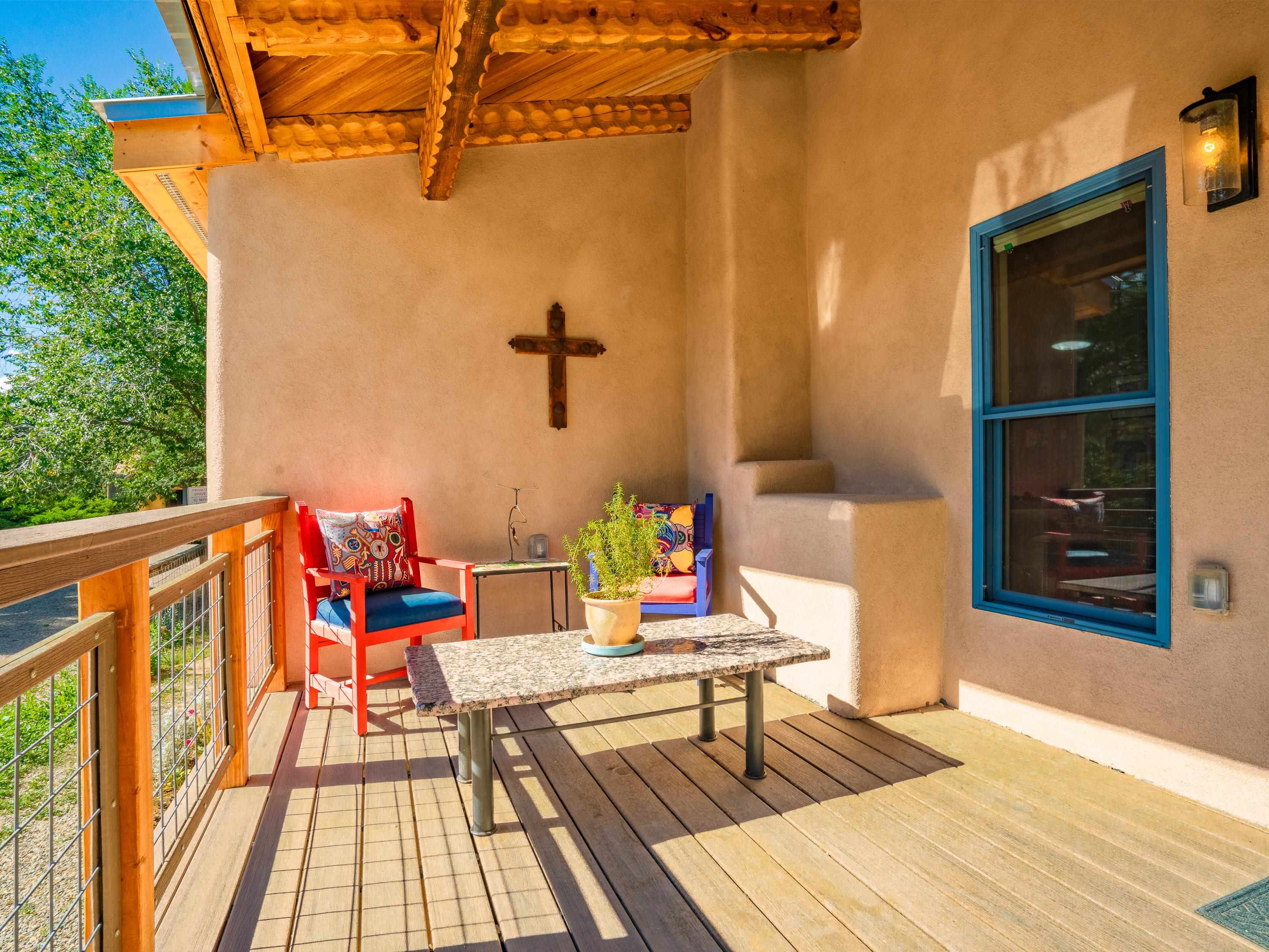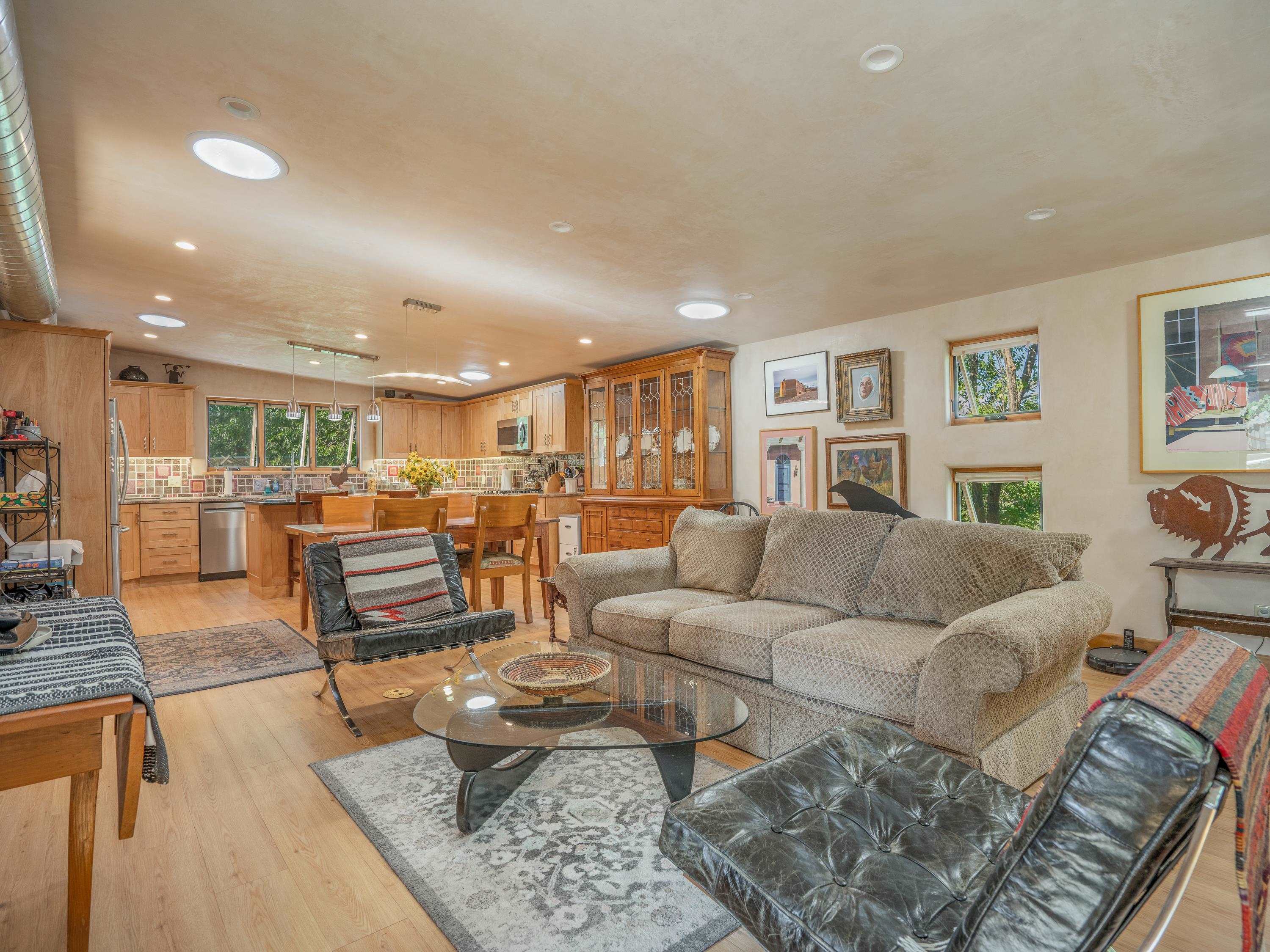 This completely renovated home in the heart of Taos is not to be missed! It is perfectly located within walking distance to Taos Plaza and shops, yet nestled peacefully in the trees. Las Cruces Road is tucked into a sweet, quiet neighborhood, just off Kit Carson Road. A generous front deck greets you upon arrival to this home. Beautiful, carved beams and adobe accents grace the exterior. Inside, you’ll find thoughtful contemporary stylings throughout. This two bedroom, two full bathroom home was entirely, recently renovated. It features all new plumbing and electrical, high end stainless steel appliances, and custom, artful tile work throughout the home. A large, open concept living area expands into a spacious kitchen. Granite countertops, a large center island, double oven, and sophisticated lighting make this kitchen a chef’s dream. One of a kind tile work is featured on the backsplash, a truly artistic cooking environment. Large windows and skylights let plenty of light in, offering views of the treetops. On the same level is a laundry room with plenty of storage, and a full bathroom. The exquisite tile work echos through the shower and tub, as well as the vanity and mirror. A beautiful staircase leading downstairs features stainless steel railings and more artful tile risers. There are two bedrooms and one full bathroom downstairs. The bathroom features a gorgeous glass and tile shower. The large master bedroom boasts a large walk in closet, and French doors that open into a tree filled backyard and a private patio. The spacious yard, set on .25 acres, homes gorgeous shade trees. Listen to the wind and birds as the rest of the world melts away. Stone paver walkways around the home, gardens, a stone wall, and a partially fenced yard enhance the outdoor space. There is an additional 96 square foot storage shed for your tools and toys. This is a beautifully renovated home, in an incredible location. Reach out to set up a private viewing today.