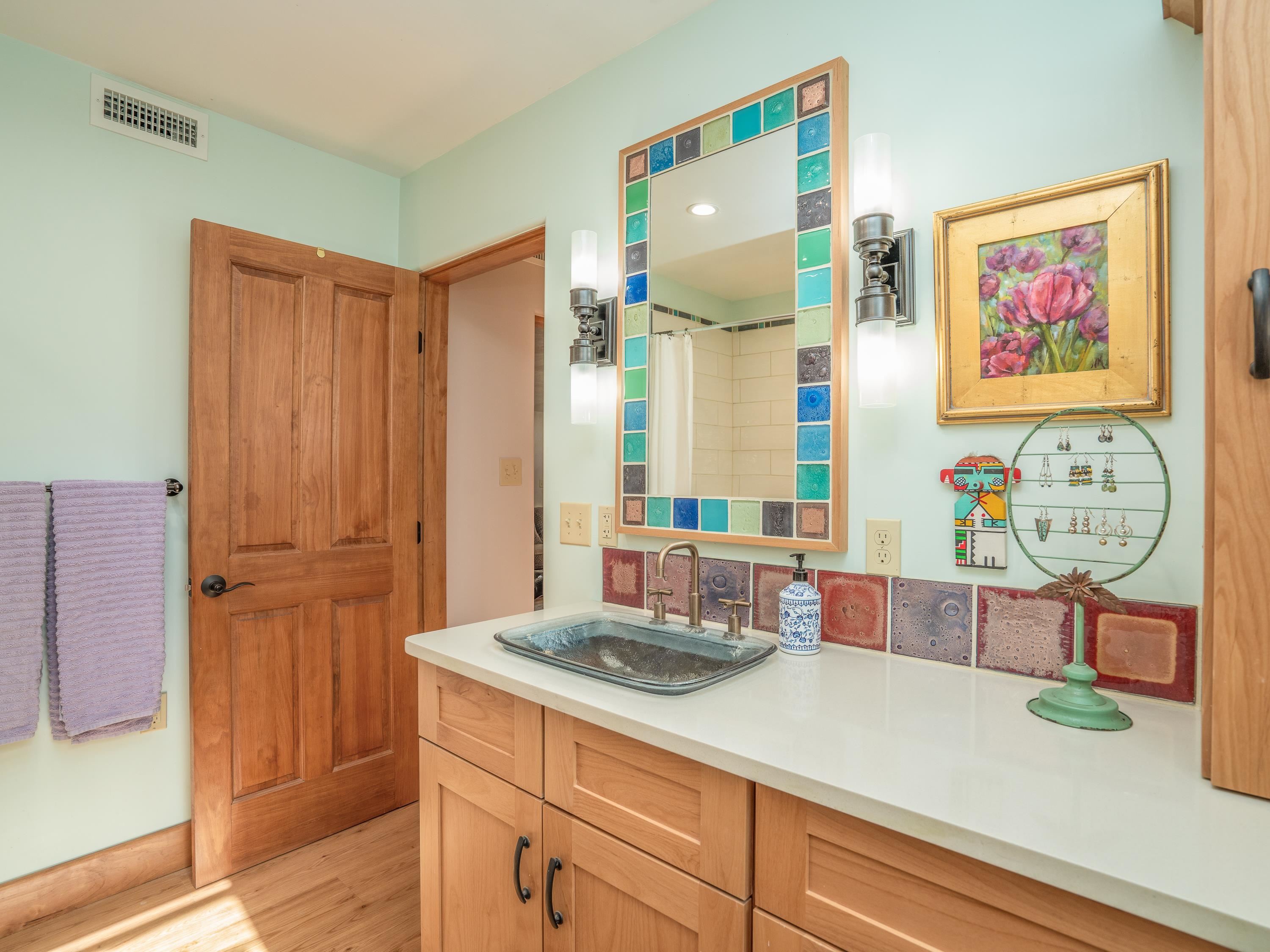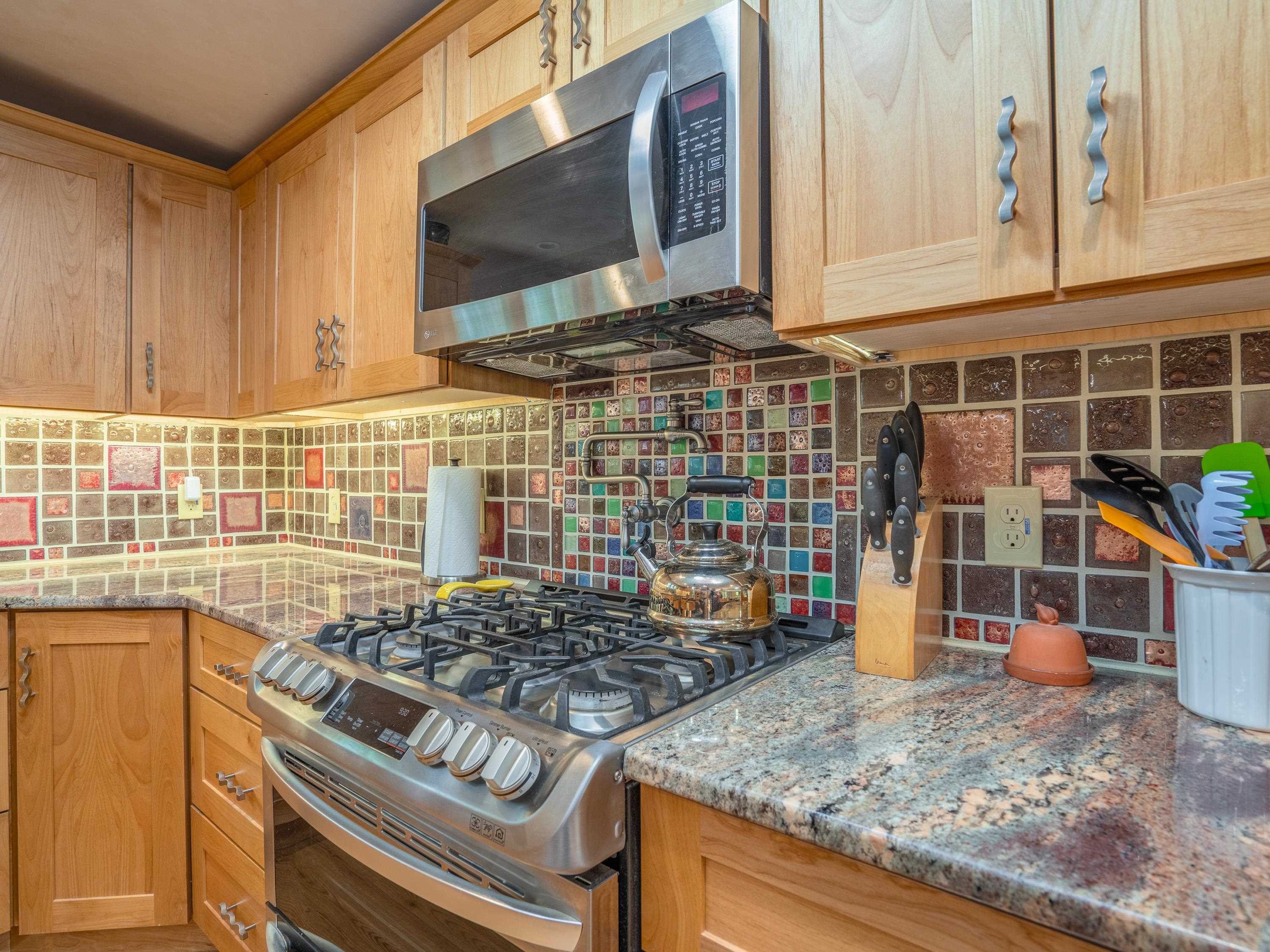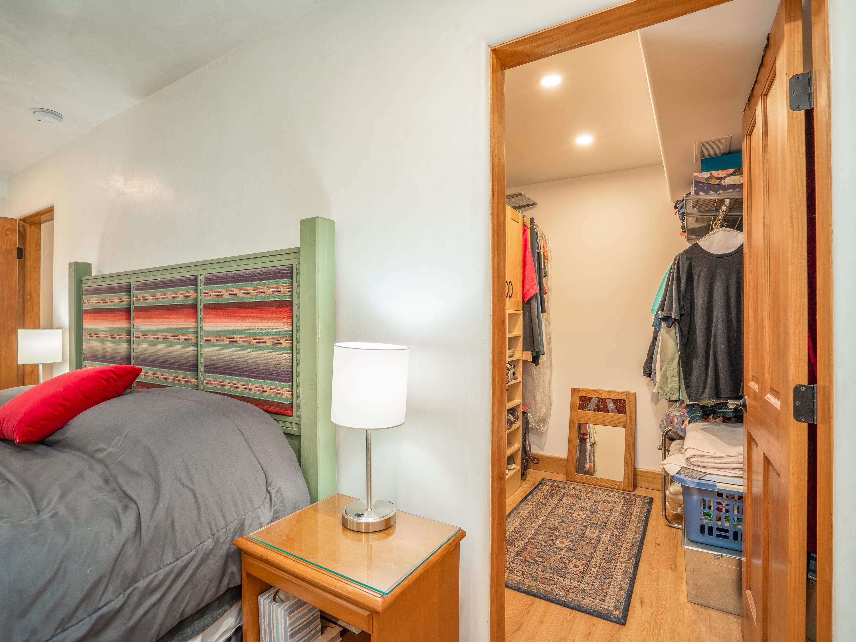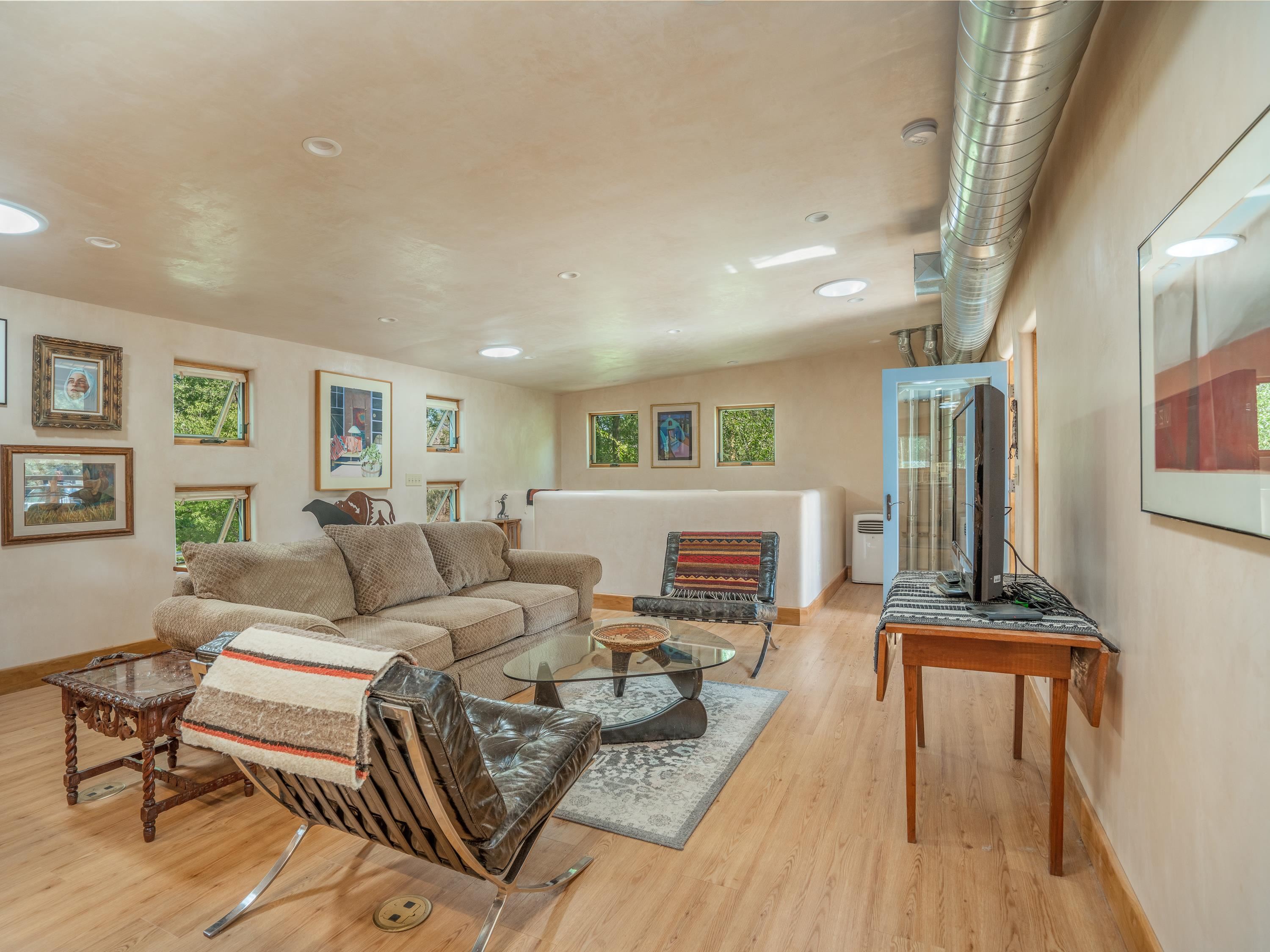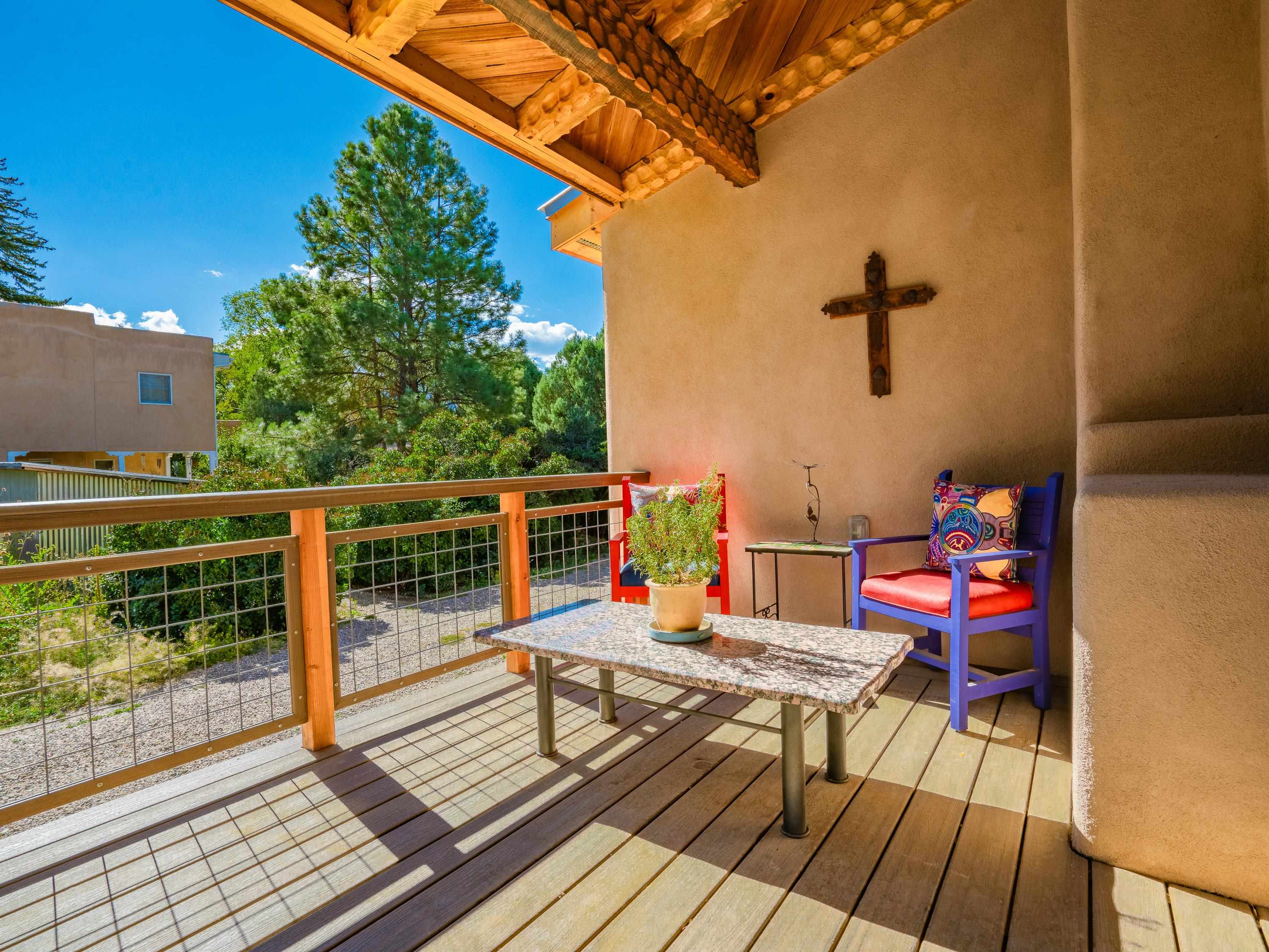 This completely renovated home in the heart of Taos is not to be missed! It is perfectly located within walking distance to Taos Plaza and shops, yet nestled peacefully in the trees. Las Cruces Road is tucked into a sweet, quiet neighborhood, just off Kit Carson Road. A generous front deck greets you upon arrival to this home. Beautiful, carved beams and adobe accents grace the exterior. Inside, you’ll find thoughtful contemporary stylings throughout. This two bedroom, two full bathroom home was entirely, recently renovated. It features all new plumbing and electrical, high end stainless steel appliances, and custom, artful tile work throughout the home. A large, open concept living area expands into a spacious kitchen. Granite countertops, a large center island, double oven, and sophisticated lighting make this kitchen a chef’s dream. One of a kind tile work is featured on the backsplash, a truly artistic cooking environment. Large windows and skylights let plenty of light in, offering views of the treetops. On the same level is a laundry room with plenty of storage, and a full bathroom. The exquisite tile work echos through the shower and tub, as well as the vanity and mirror. A beautiful staircase leading downstairs features stainless steel railings and more artful tile risers. There are two bedrooms and one full bathroom downstairs. The bathroom features a gorgeous glass and tile shower. The large master bedroom boasts a large walk in closet, and French doors that open into a tree filled backyard and a private patio. The spacious yard, set on .25 acres, homes gorgeous shade trees. Listen to the wind and birds as the rest of the world melts away. Stone paver walkways around the home, gardens, a stone wall, and a partially fenced yard enhance the outdoor space. There is an additional 96 square foot storage shed for your tools and toys. This is a beautifully renovated home, in an incredible location. Reach out to set up a private viewing today.