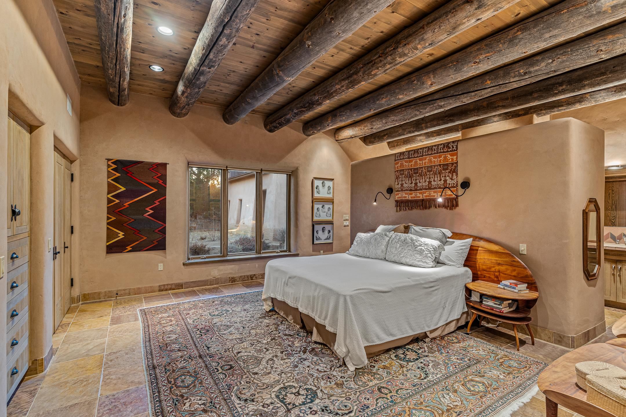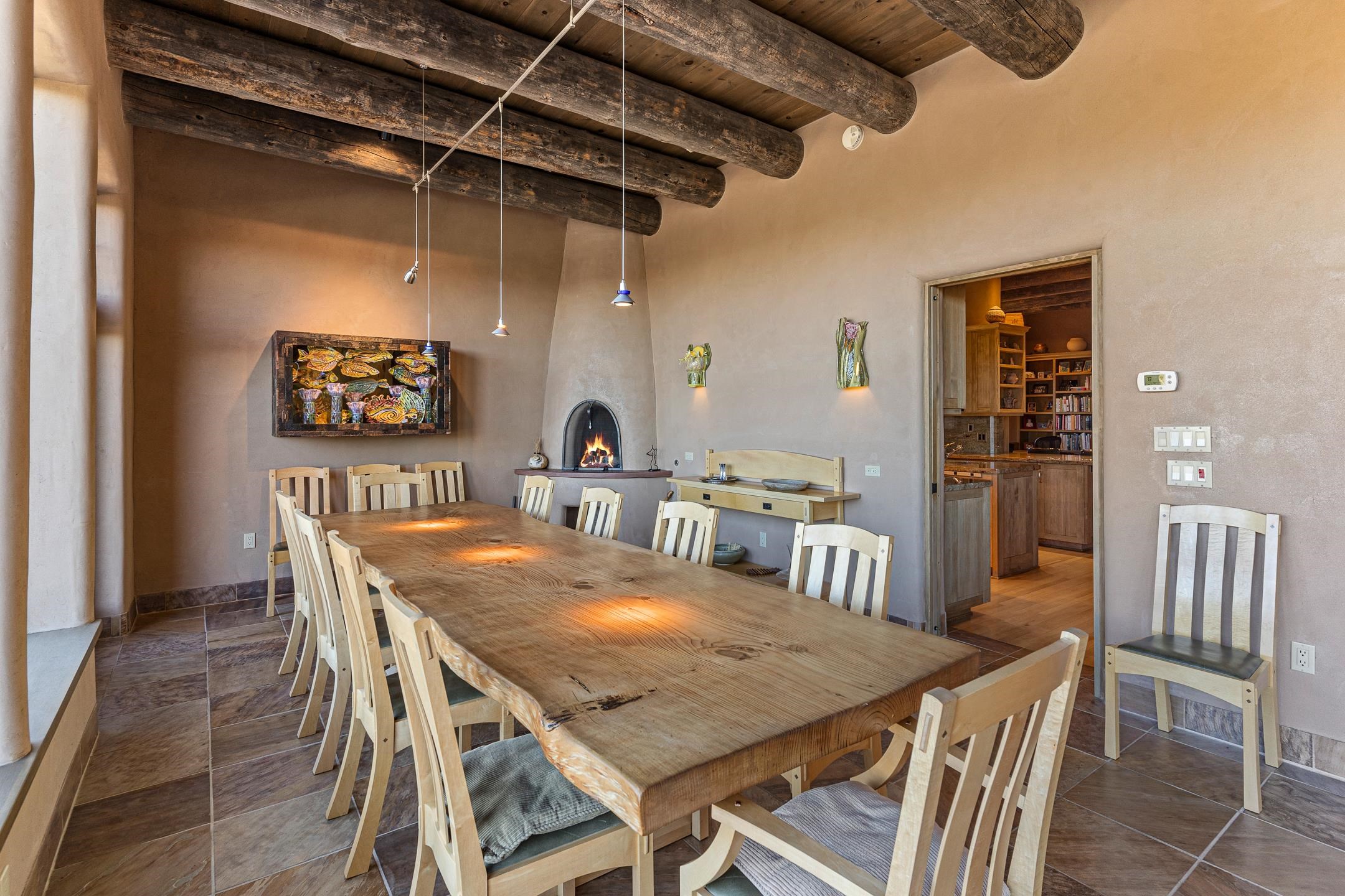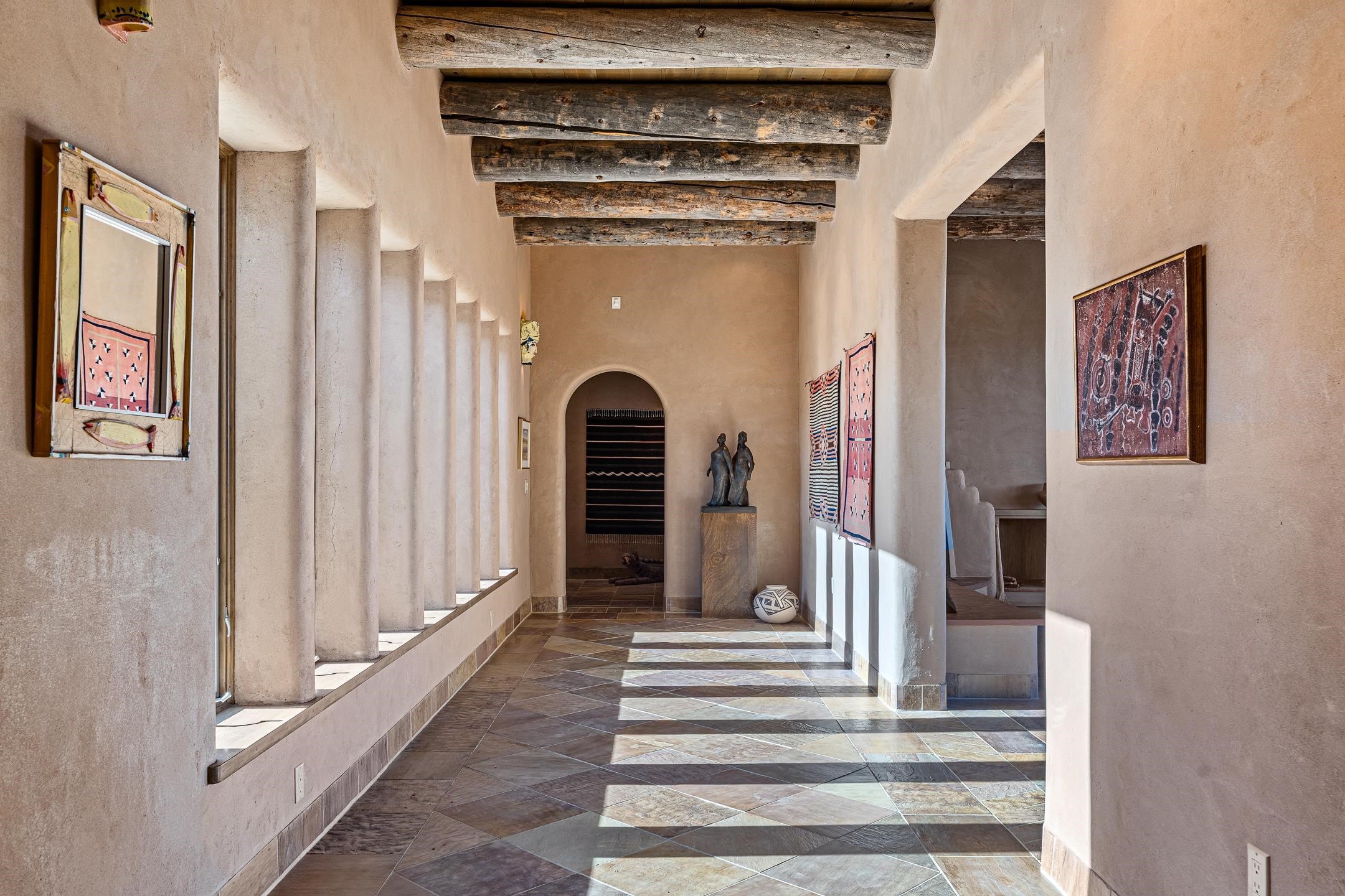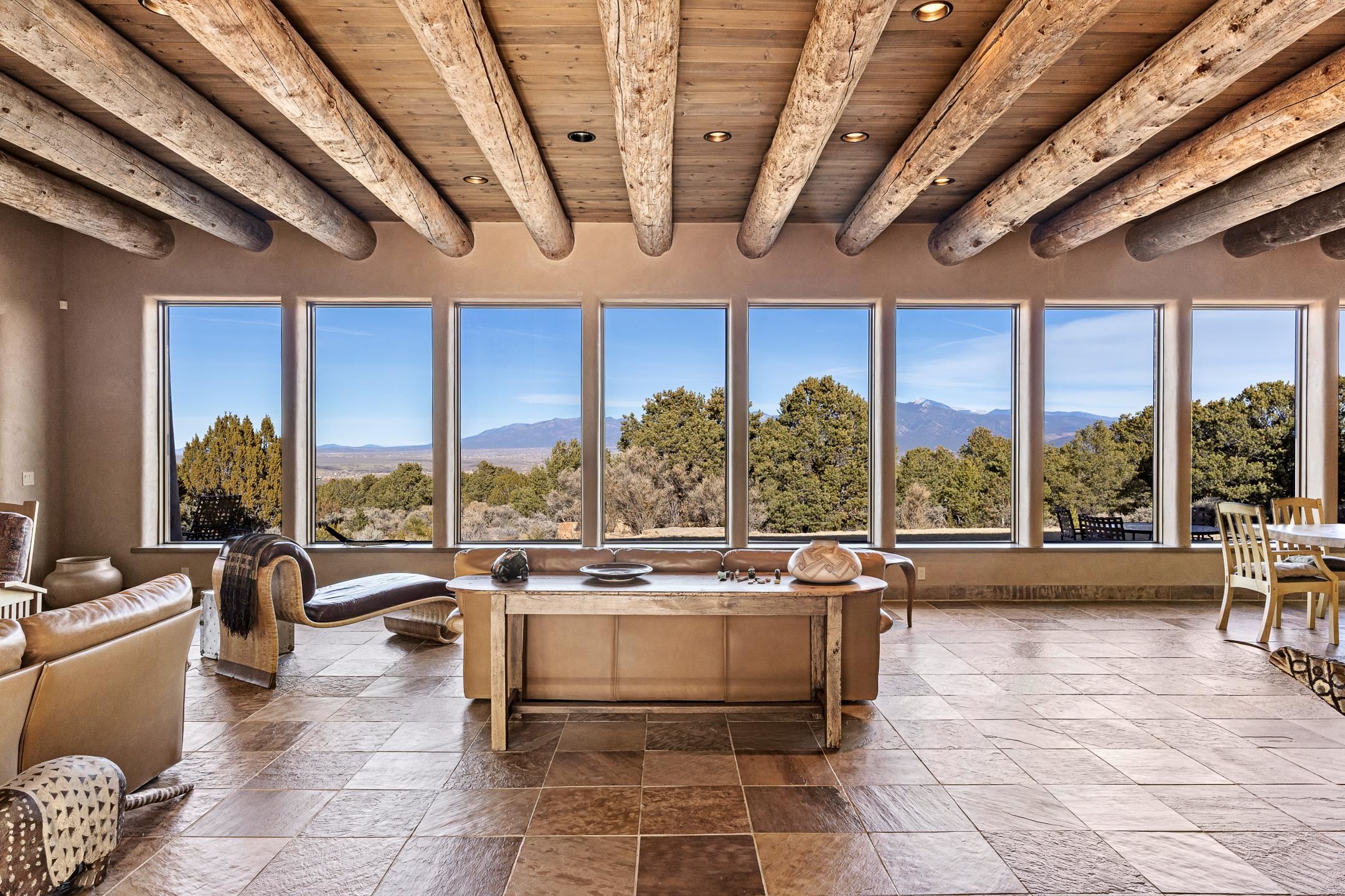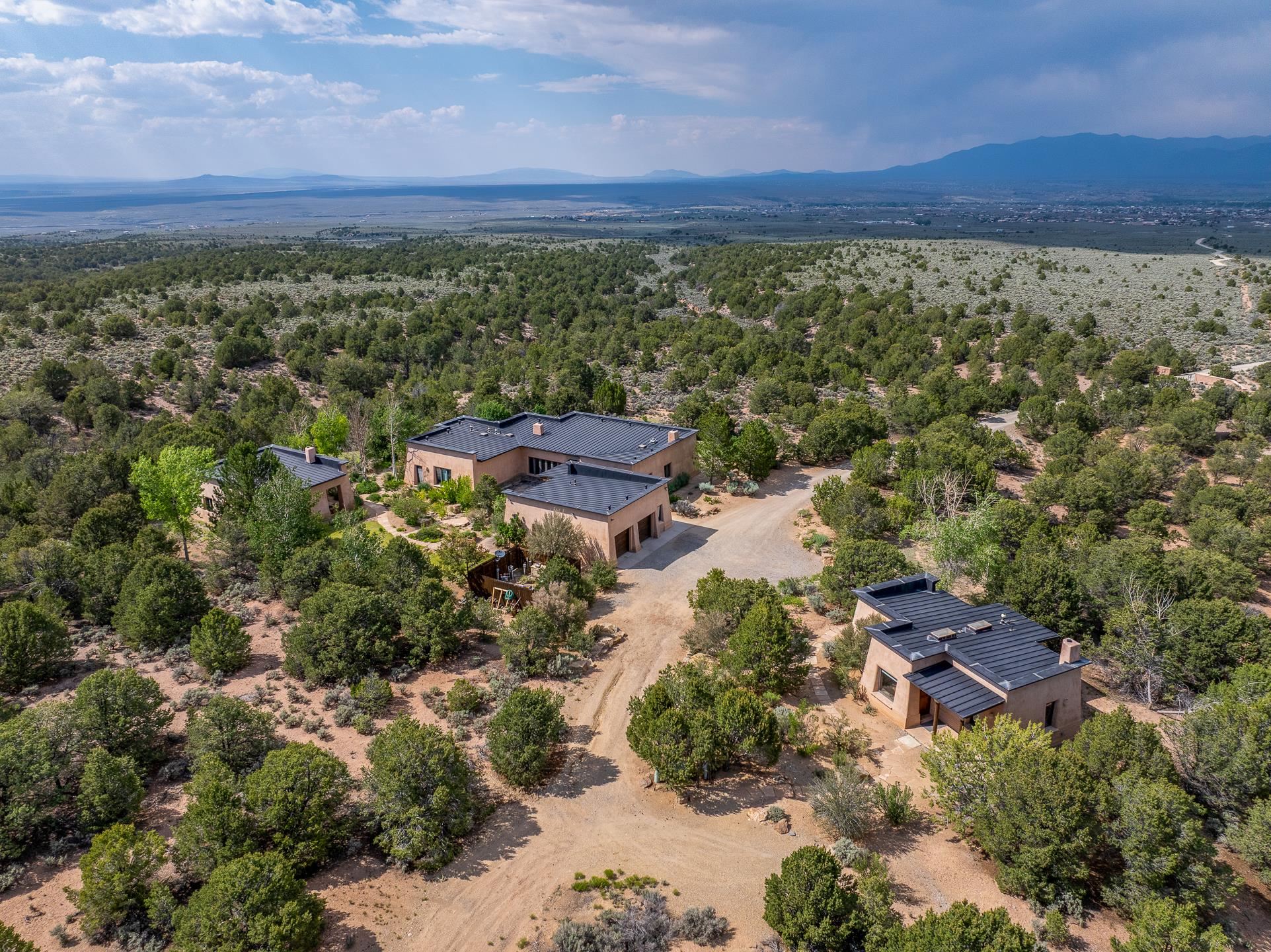 Experience the ultimate fusion of beauty, balance, and nature at this exclusive estate, tucked away on over 26 acres of pristine land. With sweeping views stretching from the Rio Grande Gorge to Taos Mountain, Abiquiu, and all the way to Colorado’s Mt. Blanca, this exceptional property offers unrivaled vistas. The compound consists of a magnificent main residence, two spacious guesthouses (6 bedrooms, 4.5 bathrooms total), and a attached garage with laundry facilities, a fitness room, mechanical spaces, and a climate-controlled wine cellar. Designed by renowned Santa Fe architect John Barton and contractor Ken Wolosin, the estate combines contemporary luxury with the timeless charm of ancient Pueblo adobe architecture. The buildings are crafted using modern adobe construction, featuring gently tapered walls, stacked flagstone foundations, and elegant standing seam copper roofs. The main house is a true sanctuary, offering a sumptuous master suite, a gourmet kitchen, an elegant dining area, a spacious living room with two kiva fireplaces, and a guest suite. An inviting entry gallery leads into the expansive living area, where a wall of custom windows perfectly frames the awe-inspiring panoramic views of the valley and surrounding mountains. The guesthouses are equally well-appointed, each offering two bedrooms, a large bathroom, and an open kitchen-dining space. Throughout the compound, no detail has been overlooked, with kiva fireplaces, ample storage, custom tiles, stone floors, and granite countertops enriching every room. Perfectly attuned to its natural surroundings, the estate is designed to harmonize with the land. Thoughtfully crafted gardens and landscaping blend seamlessly with the wild beauty of the terrain, creating a tranquil balance between architecture and nature. This unique estate offers a serene retreat, where refined elegance meets the untouched splendor of the surrounding landscape.