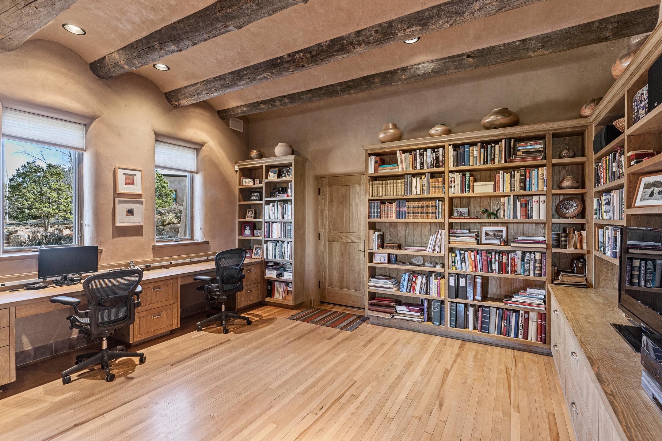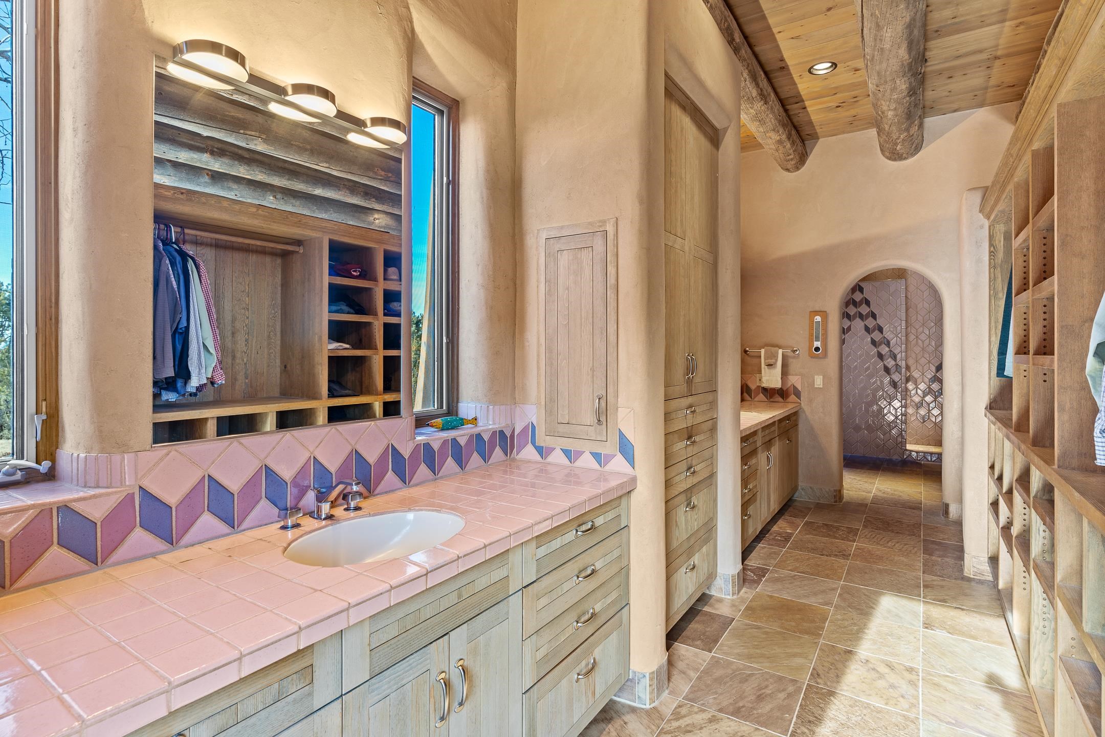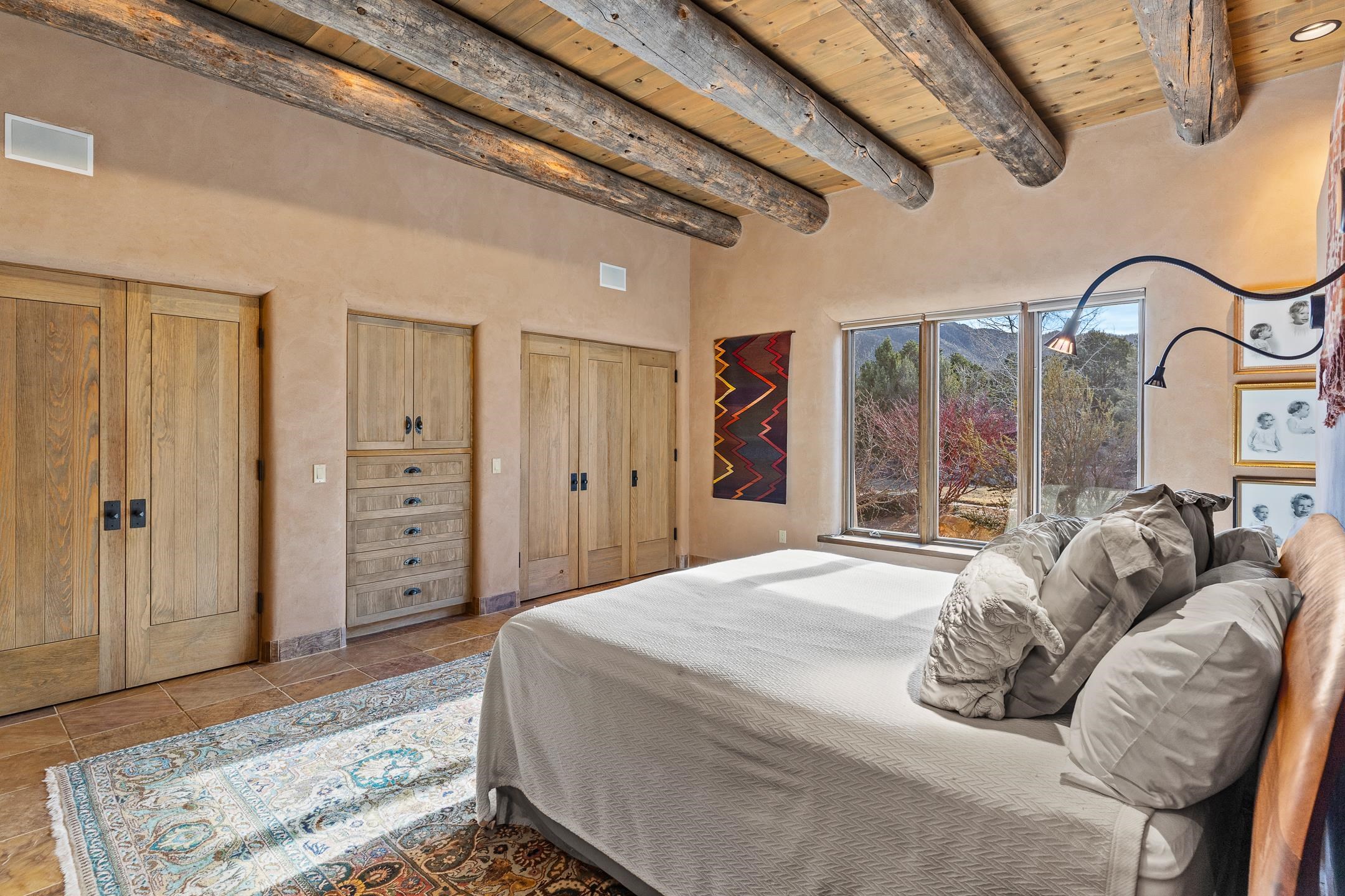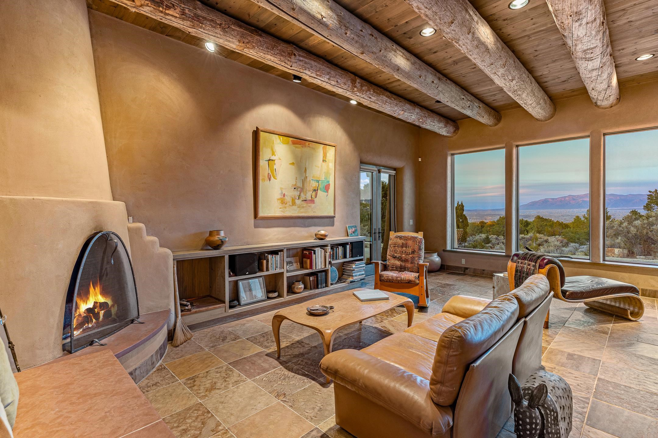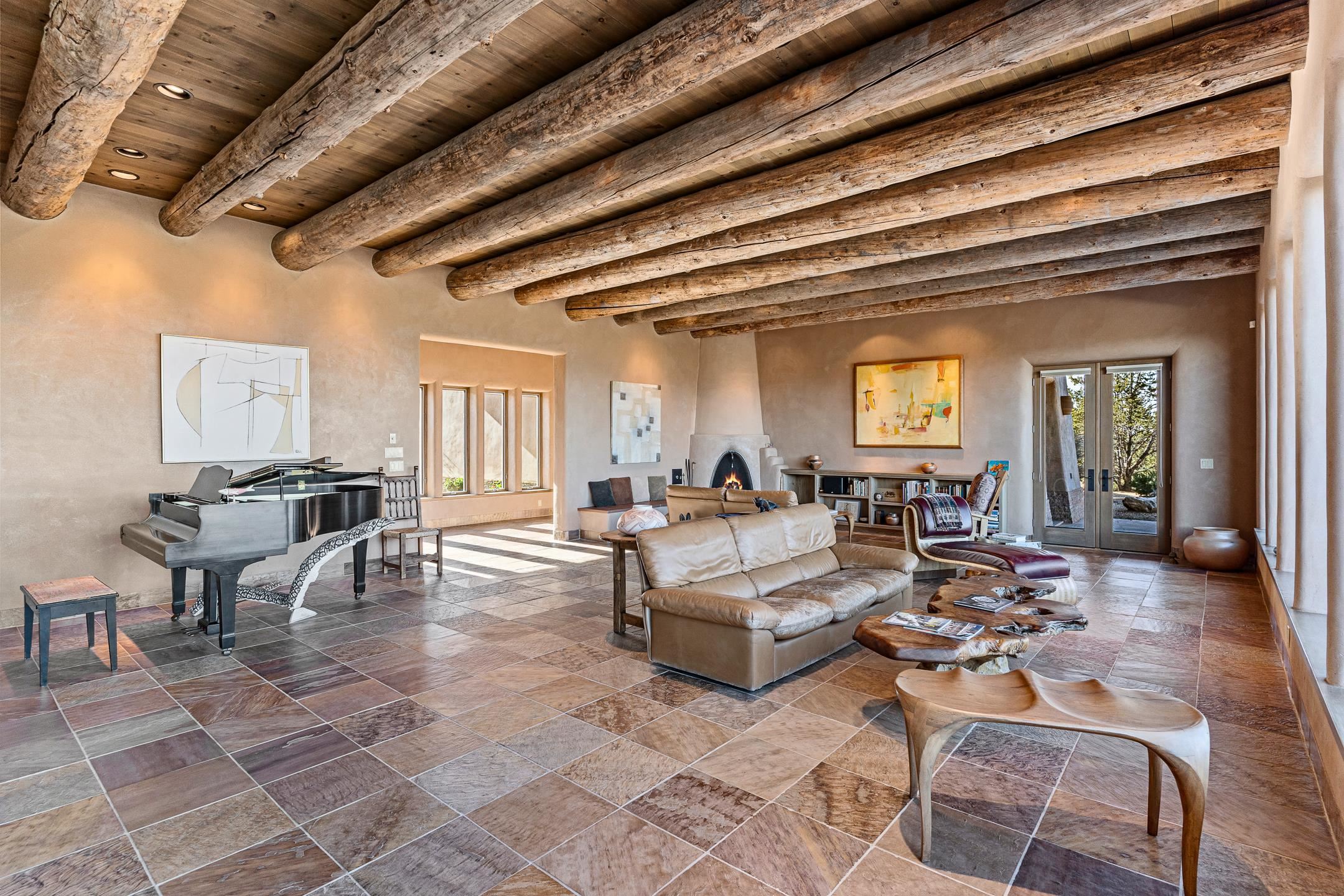 Experience the ultimate fusion of beauty, balance, and nature at this exclusive estate, tucked away on over 26 acres of pristine land. With sweeping views stretching from the Rio Grande Gorge to Taos Mountain, Abiquiu, and all the way to Colorado’s Mt. Blanca, this exceptional property offers unrivaled vistas. The compound consists of a magnificent main residence, two spacious guesthouses (6 bedrooms, 4.5 bathrooms total), and a attached garage with laundry facilities, a fitness room, mechanical spaces, and a climate-controlled wine cellar. Designed by renowned Santa Fe architect John Barton and contractor Ken Wolosin, the estate combines contemporary luxury with the timeless charm of ancient Pueblo adobe architecture. The buildings are crafted using modern adobe construction, featuring gently tapered walls, stacked flagstone foundations, and elegant standing seam copper roofs. The main house is a true sanctuary, offering a sumptuous master suite, a gourmet kitchen, an elegant dining area, a spacious living room with two kiva fireplaces, and a guest suite. An inviting entry gallery leads into the expansive living area, where a wall of custom windows perfectly frames the awe-inspiring panoramic views of the valley and surrounding mountains. The guesthouses are equally well-appointed, each offering two bedrooms, a large bathroom, and an open kitchen-dining space. Throughout the compound, no detail has been overlooked, with kiva fireplaces, ample storage, custom tiles, stone floors, and granite countertops enriching every room. Perfectly attuned to its natural surroundings, the estate is designed to harmonize with the land. Thoughtfully crafted gardens and landscaping blend seamlessly with the wild beauty of the terrain, creating a tranquil balance between architecture and nature. This unique estate offers a serene retreat, where refined elegance meets the untouched splendor of the surrounding landscape.