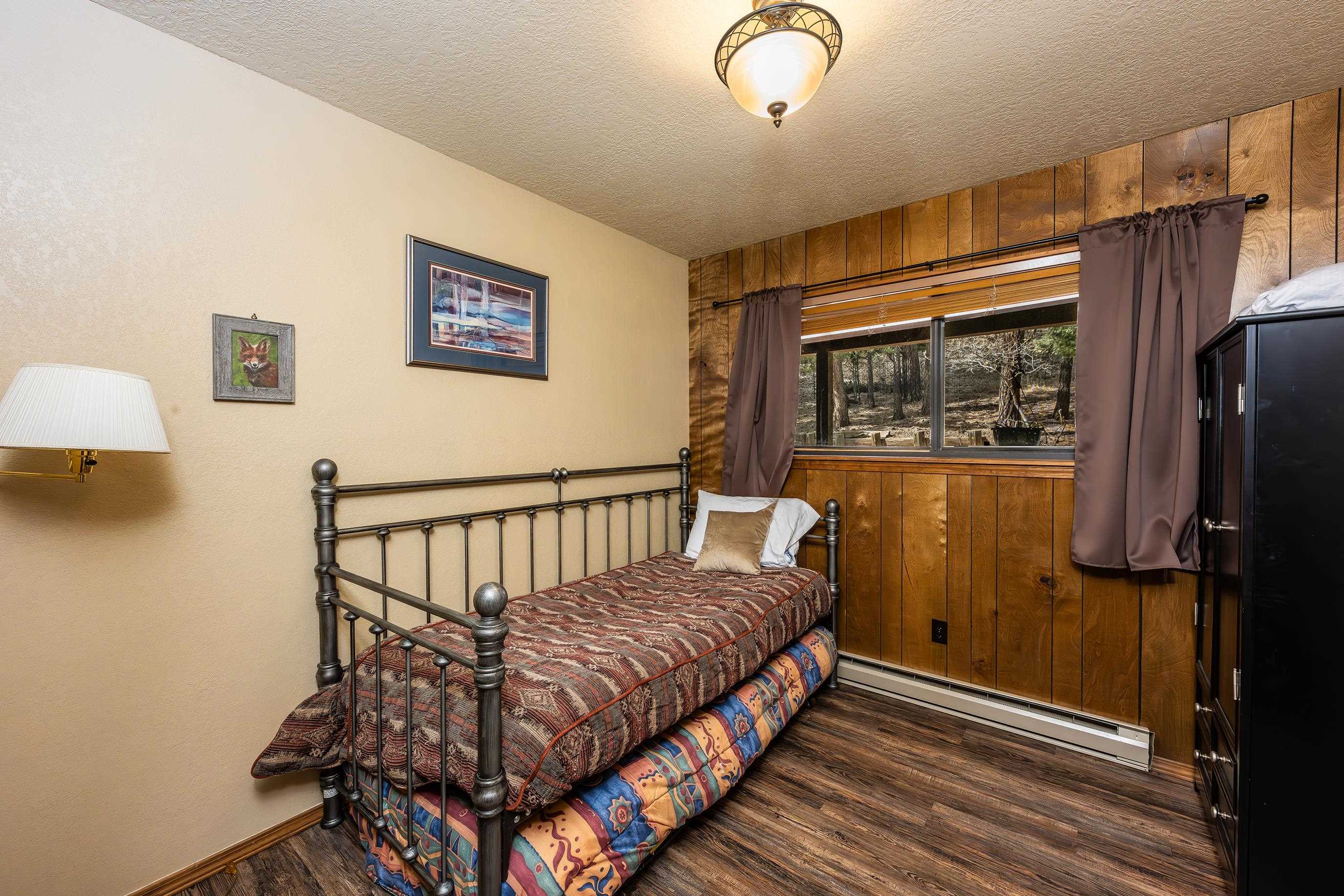 Tucked beneath a canopy of pines, this inviting single-level 3-bedroom, 2-bathroom cabin is the perfect blend of peaceful seclusion and mountain adventure. Just minutes from ski and bike trails and close to the heart of town, you’ll enjoy the best of both worlds—easy access to all-season activities with the comfort of your own quiet hideaway in the woods. Step inside to a warm, welcoming space that comes fully furnished and ready to enjoy. The open living area features a wood-burning fireplace—perfect for curling up with a blanket after a day on the slopes. Large windows let in soft natural light and views of the surrounding forest, creating a relaxing atmosphere throughout. Outdoors, a private deck offers a perfect spot for morning coffee, evening stargazing, or simply listening to the sounds of nature. Surrounded by tall trees and fresh mountain air, it’s a peaceful place to unwind any time of year. Whether you're spending snowy winters by the fire, summer days on nearby trails, or weekends away from the hustle of everyday life, this cozy cabin offers a true escape into the mountains. Check out the virtual walk through! New photos uploaded!